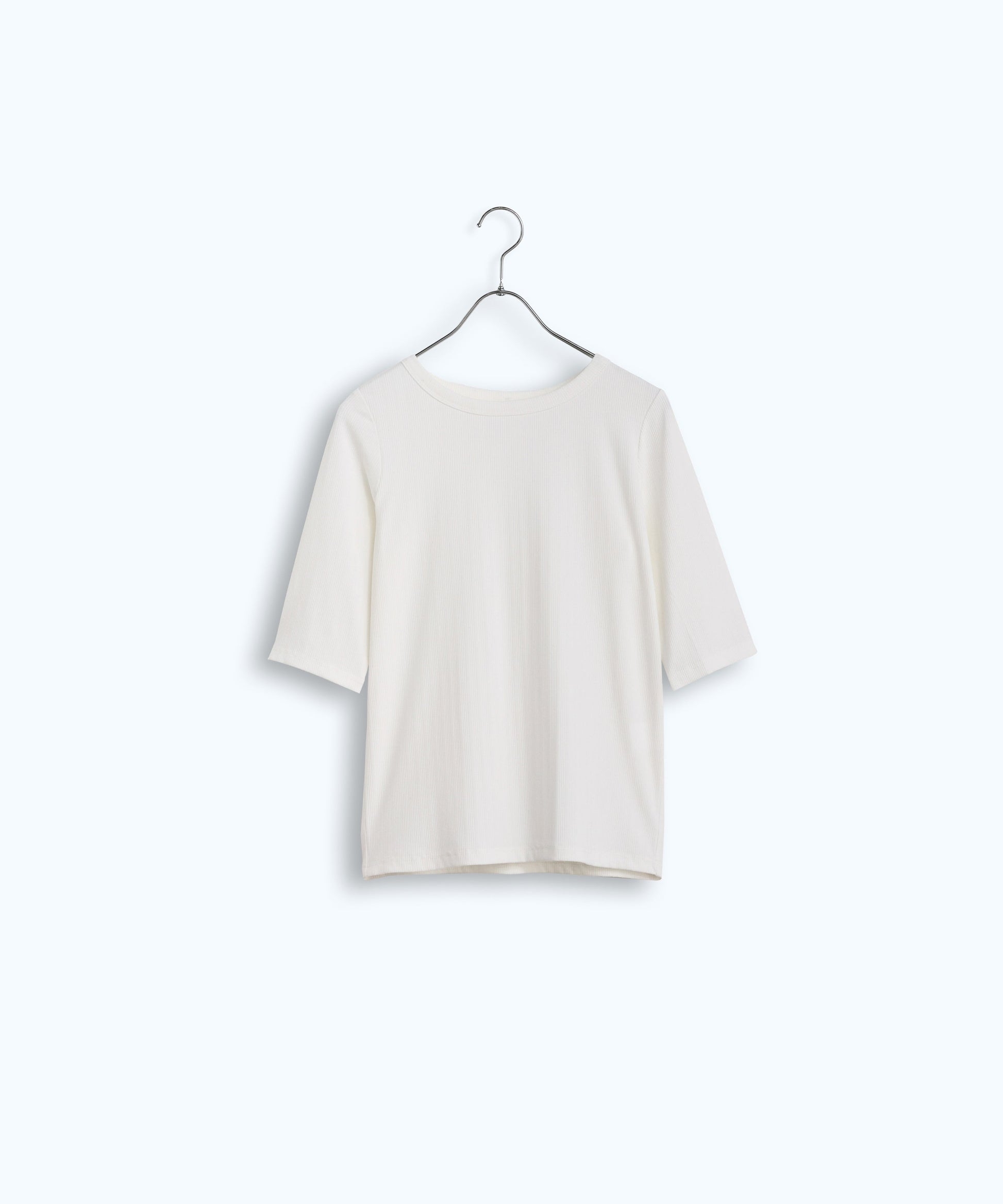 程よいボートネックラインが上品な印象で、二の腕を隠すハーフスリーブは安心感があるポイント。
