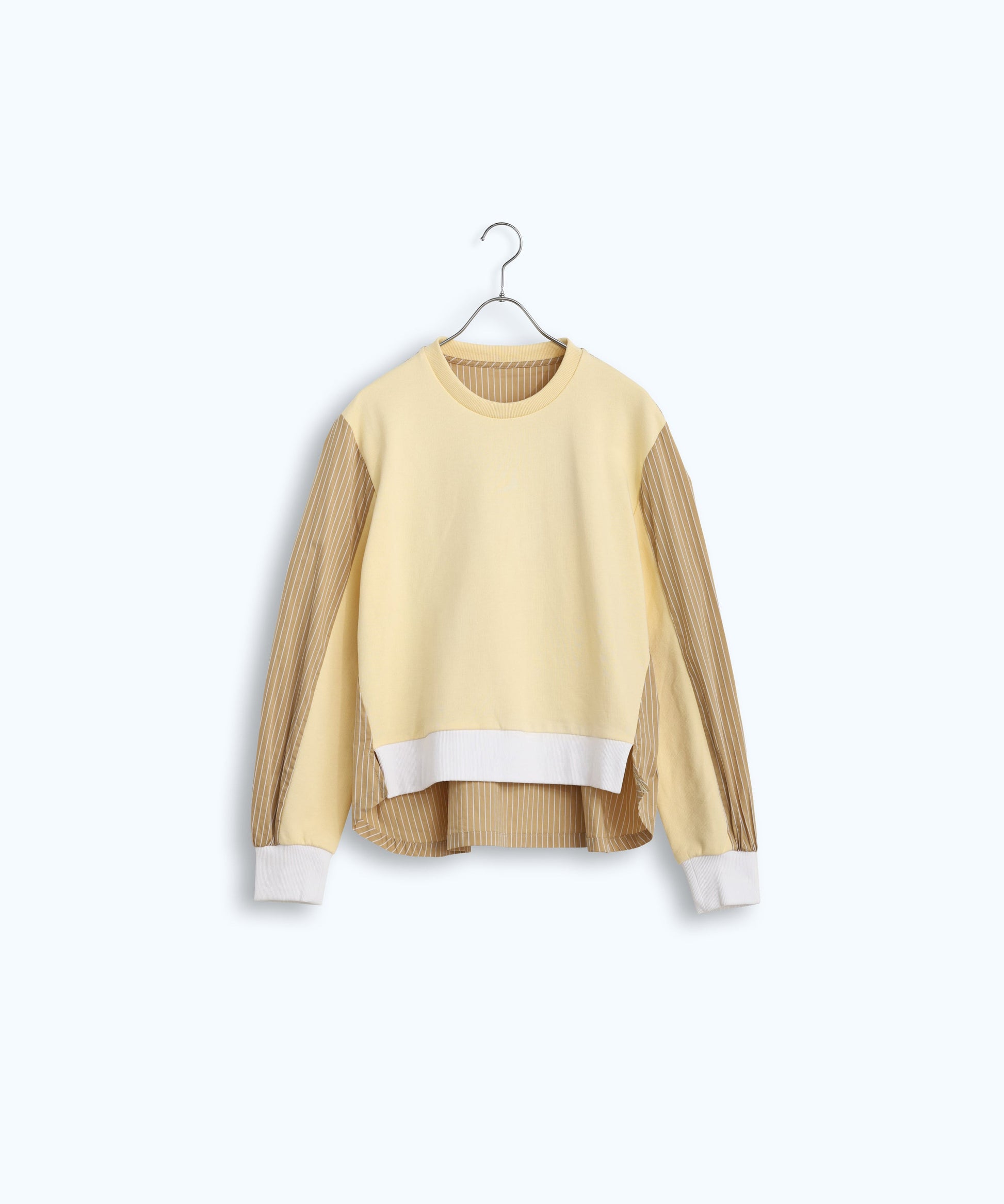 前身頃はミニ裏毛素材を使用し、袖と背中はストライプのシャツ素材をコンビにデザイン。