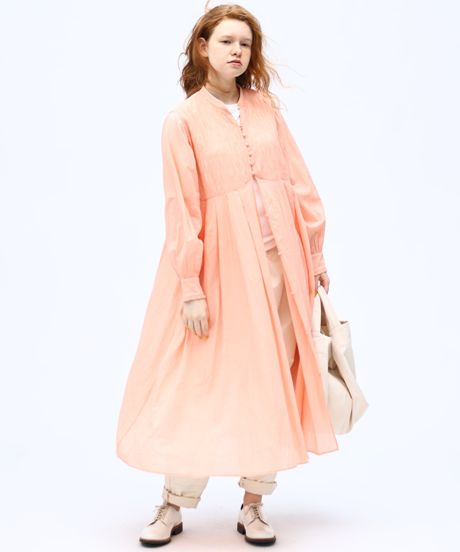胸元に細かく寄せたギャザーをステッチで叩いたパーツをつけたワンピース。