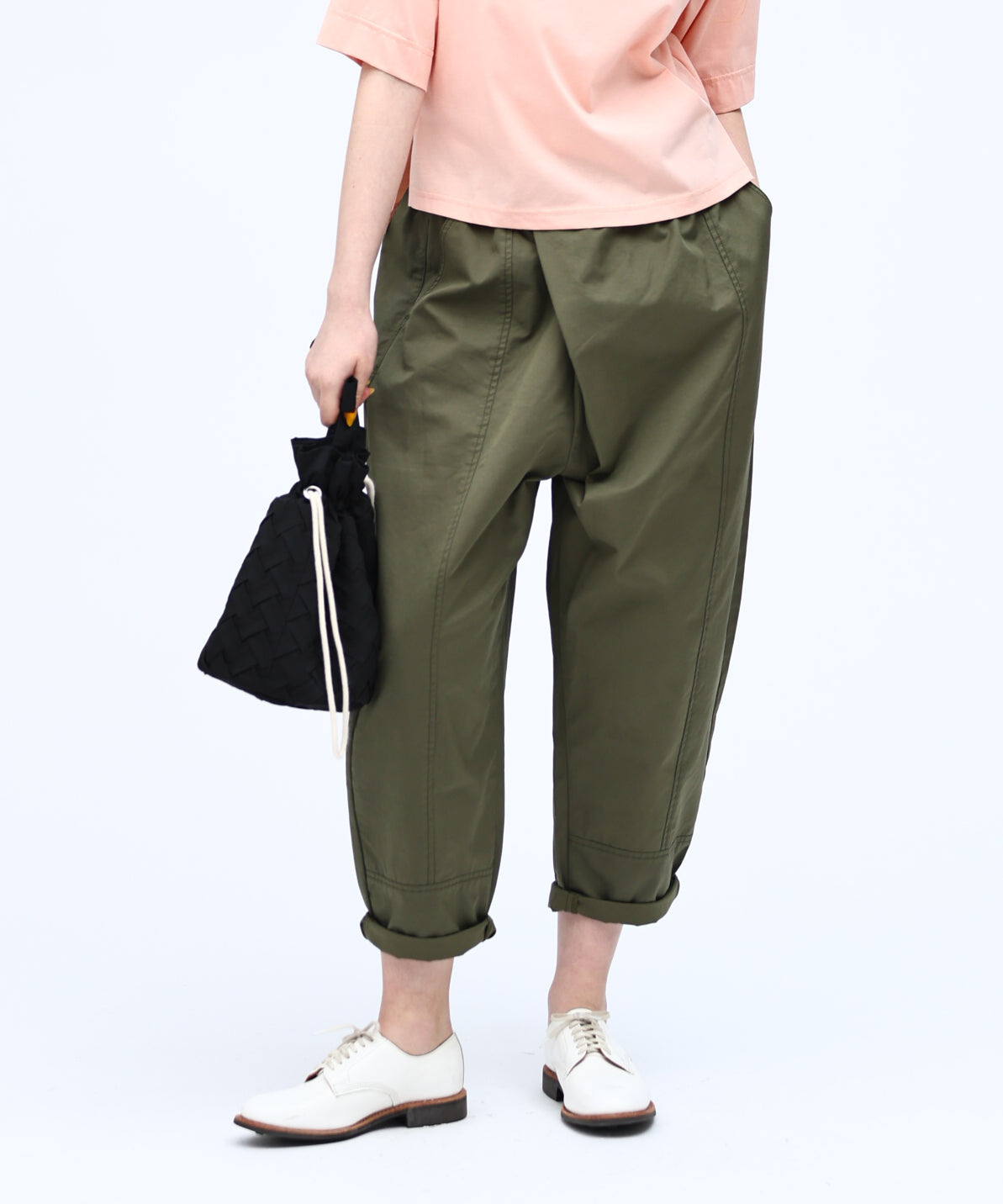 アシンメトリーに股上を隠すラップデザインをシンプルなテーパードシルエットで垢抜けた印象に。