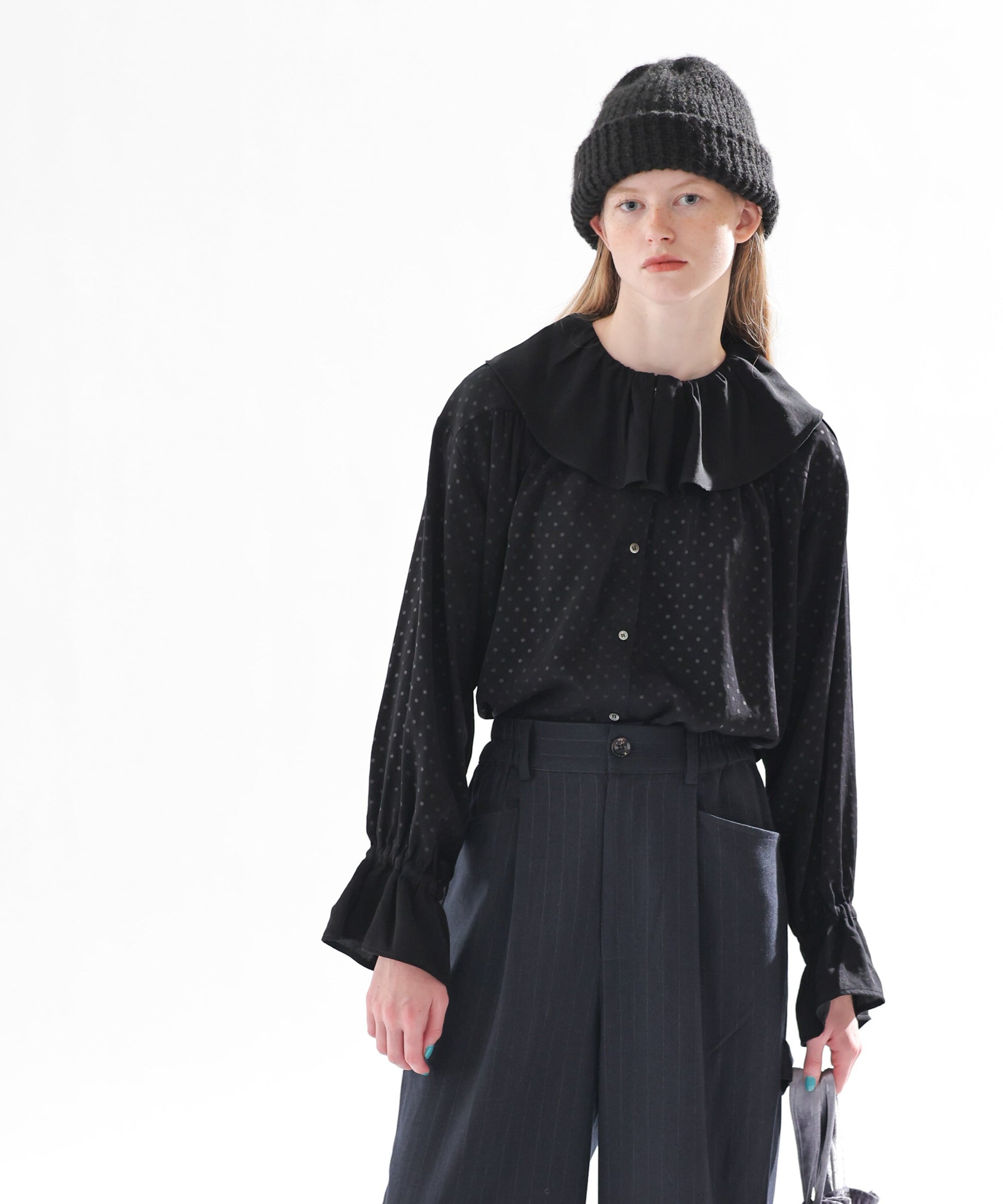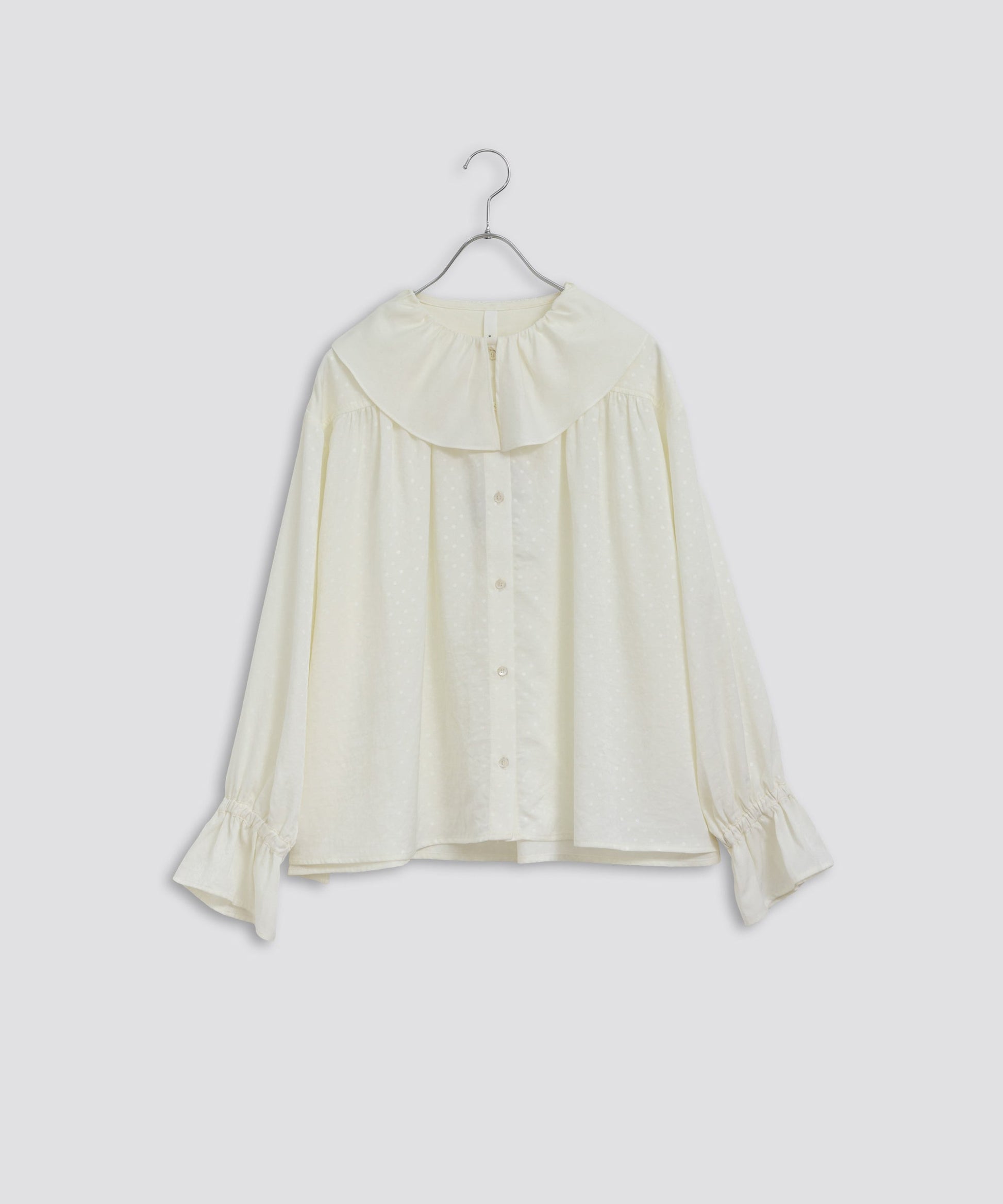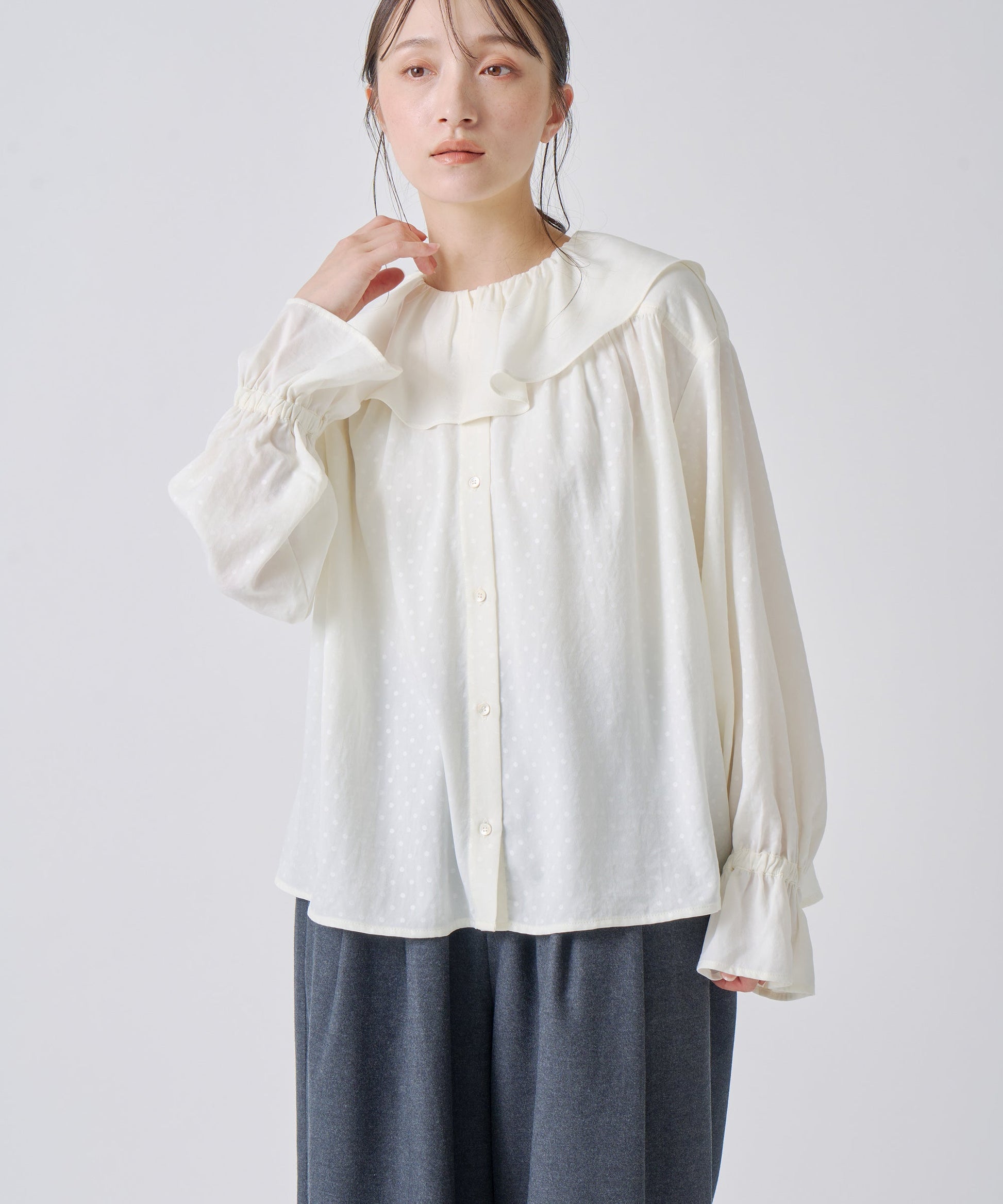 顔周りを華やかにするフリル衿と、手首をキュッと絞ったキャンディースリーブ型で