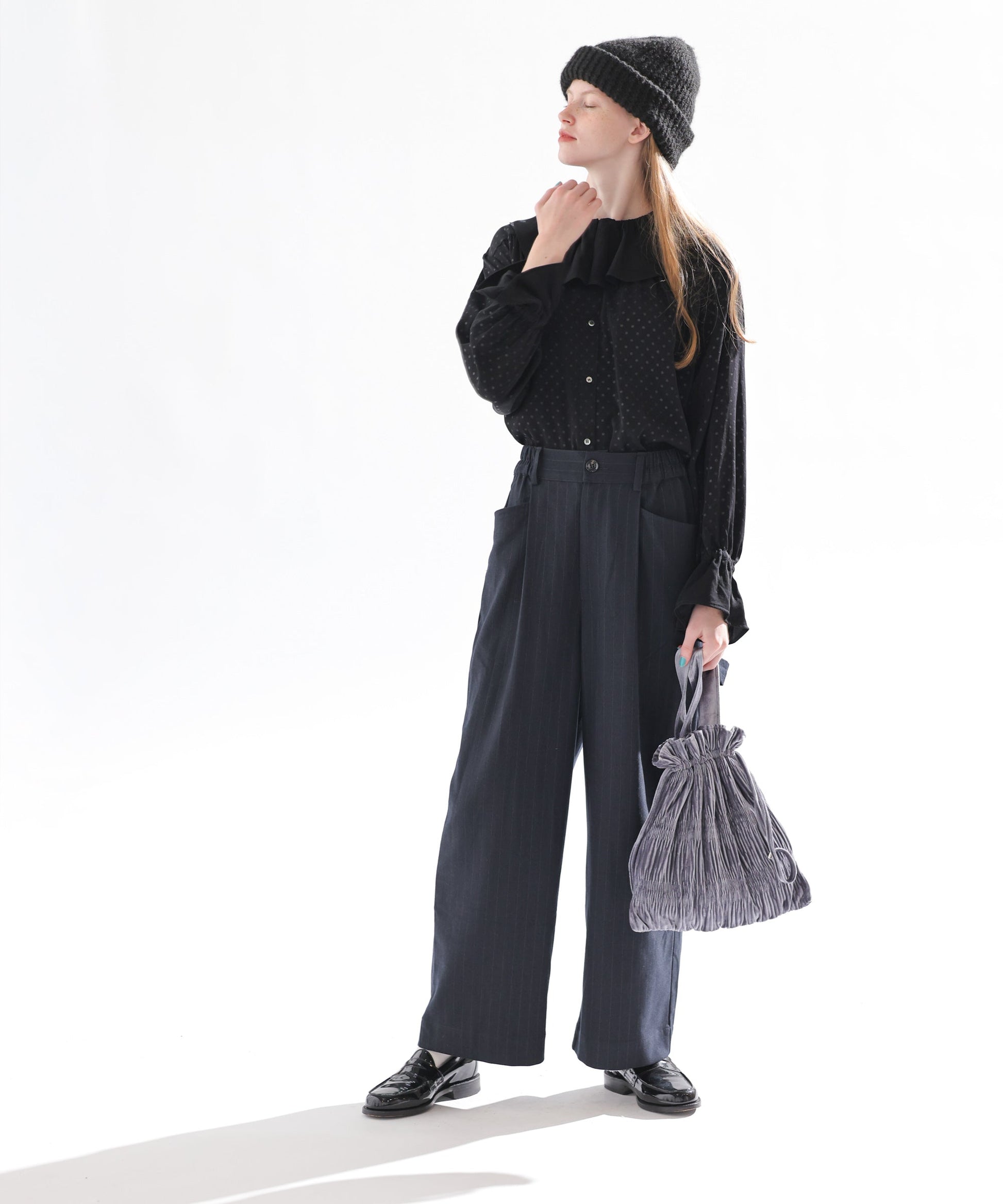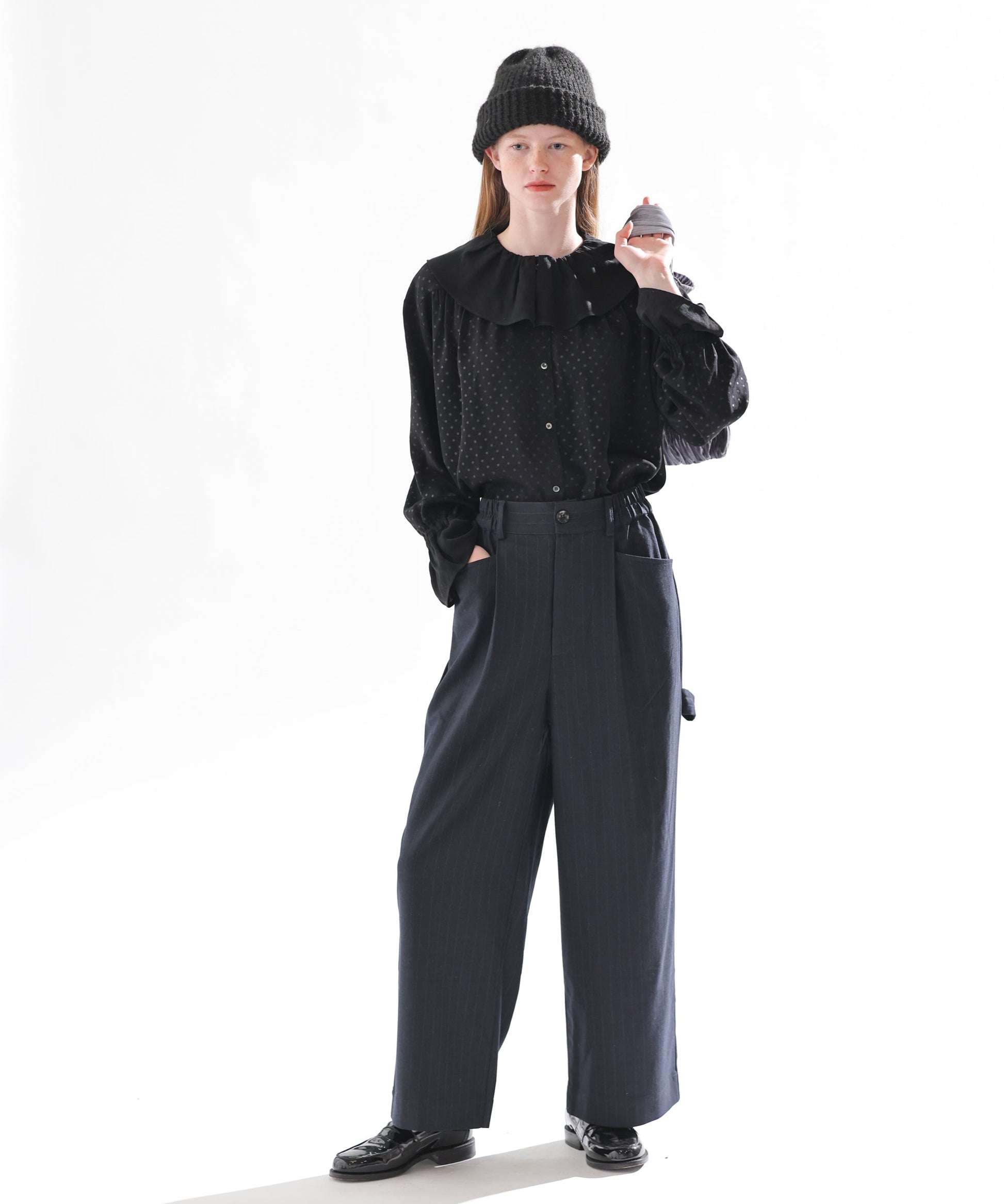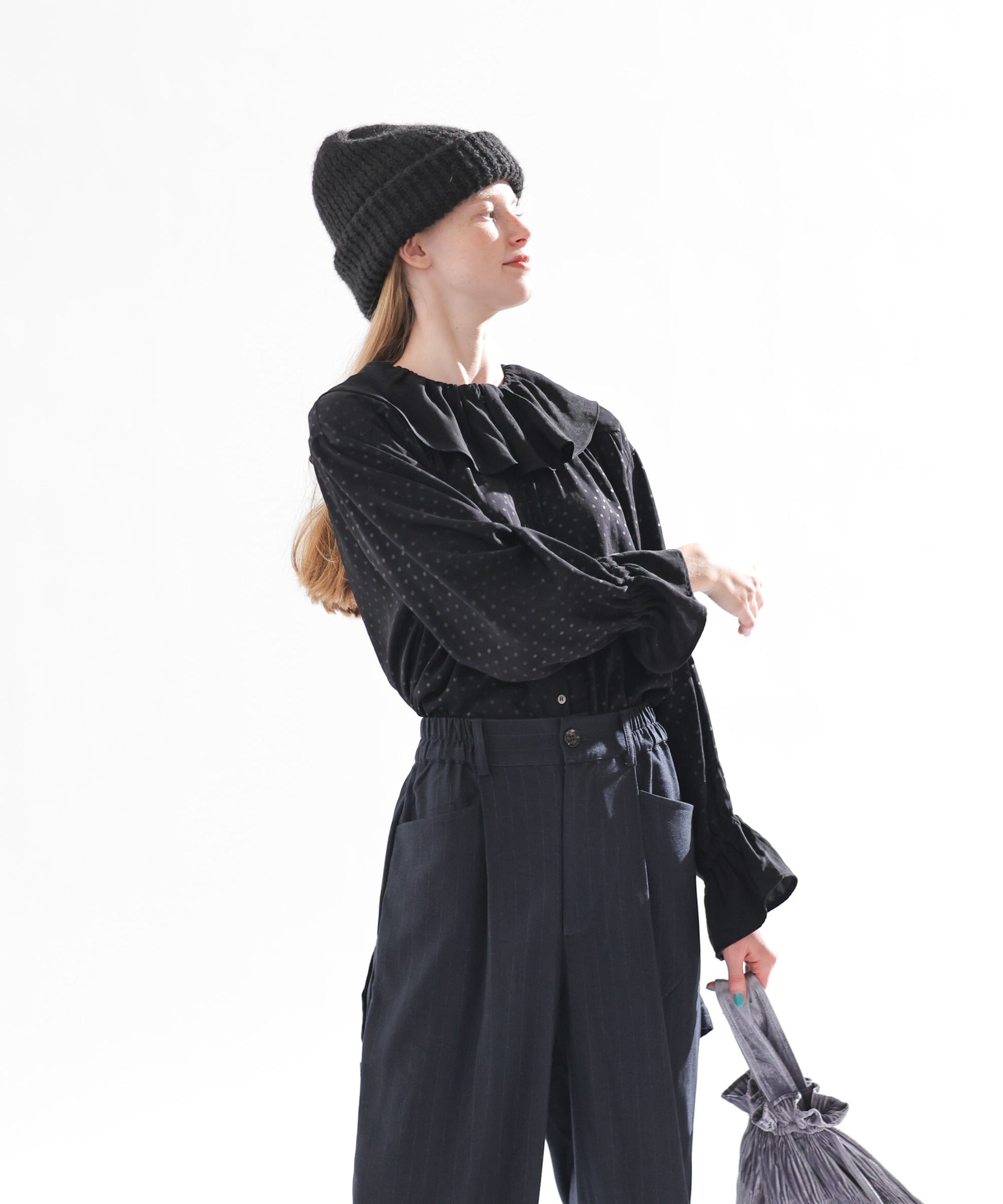 顔周りを華やかにするフリル衿と、手首をキュッと絞ったキャンディースリーブ型で