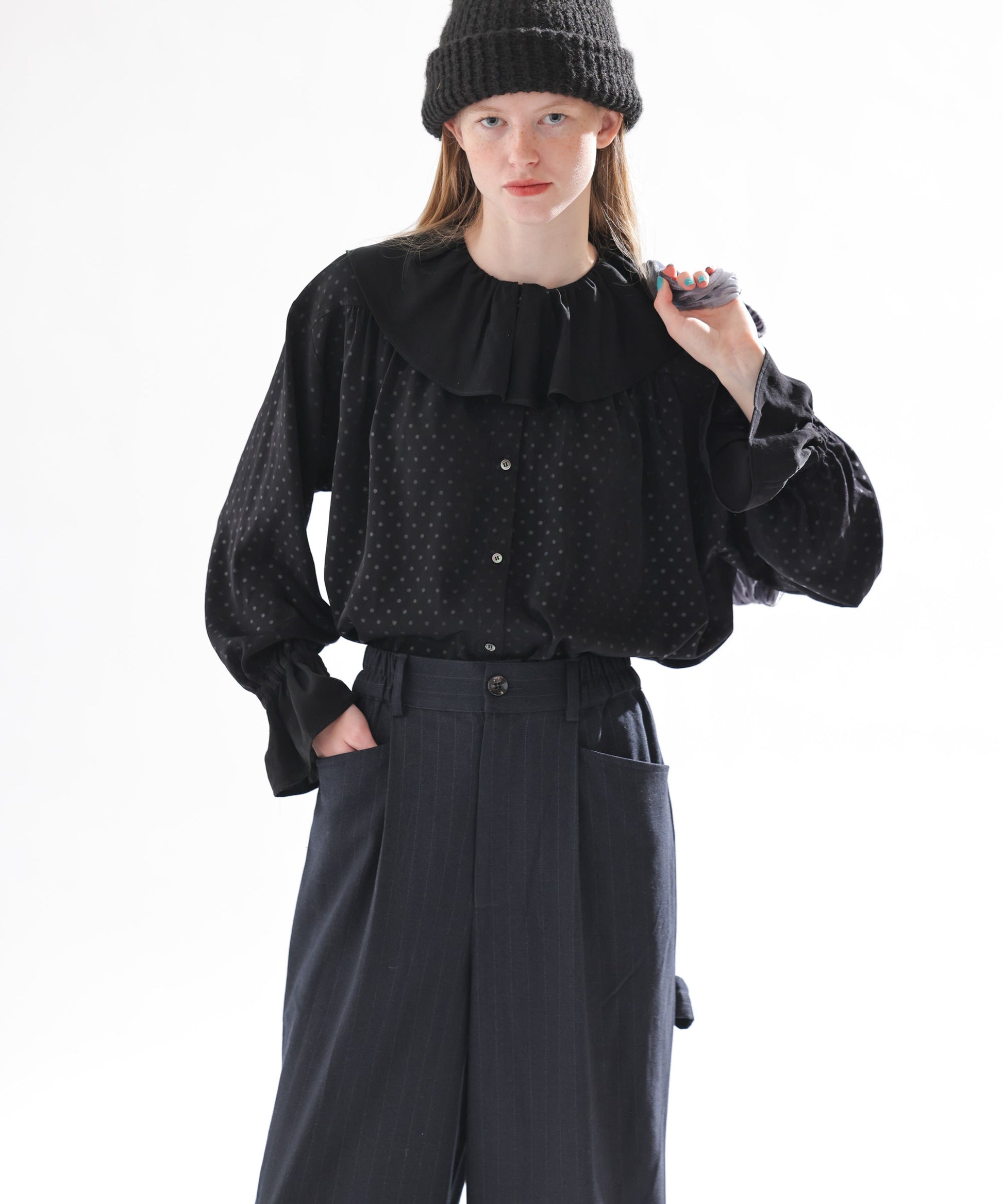 衿と袖先のフリルには無地生地を使用したデザインブラウス。