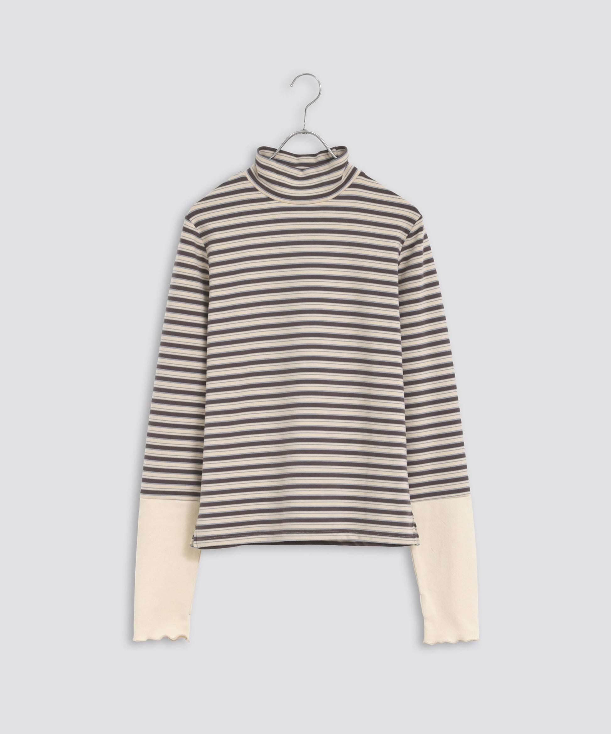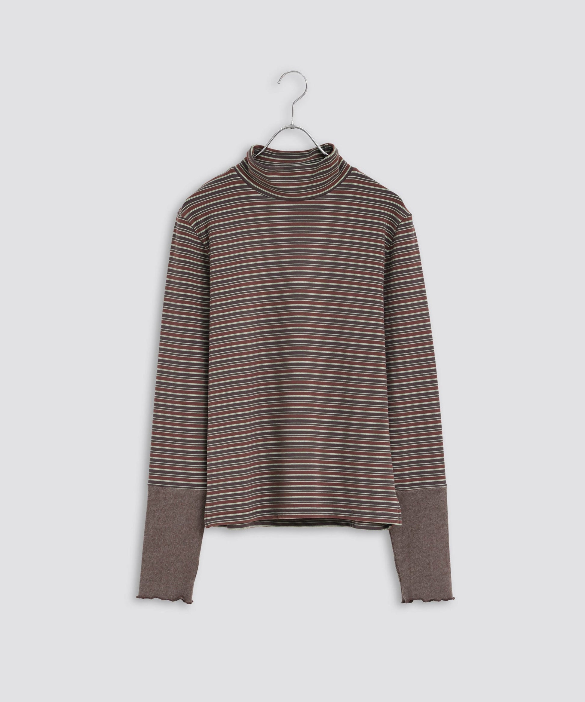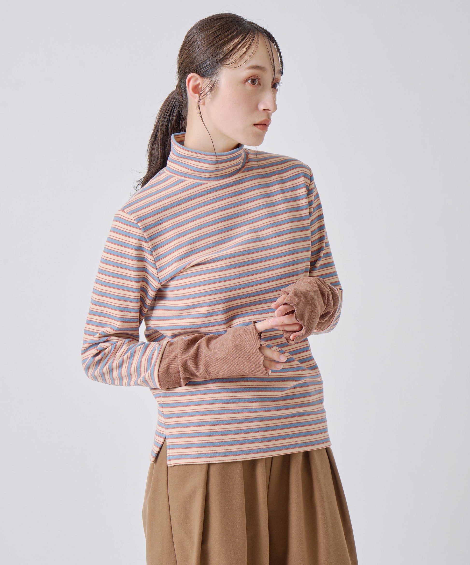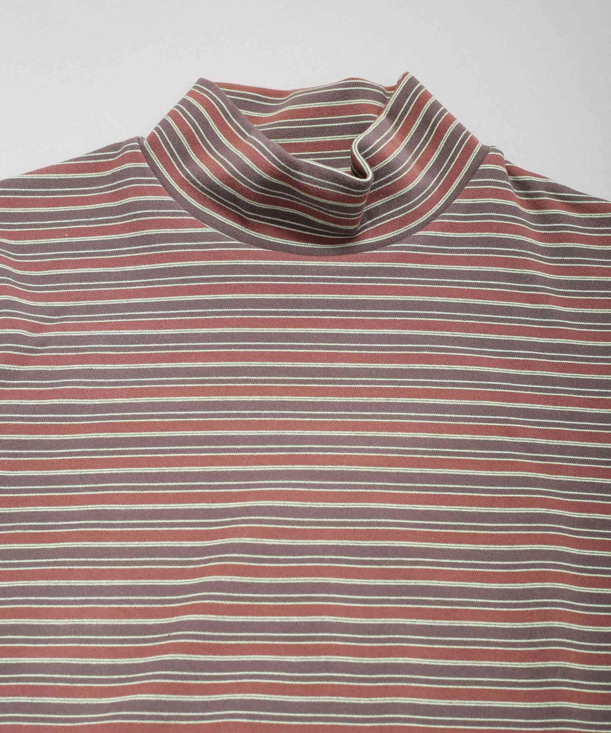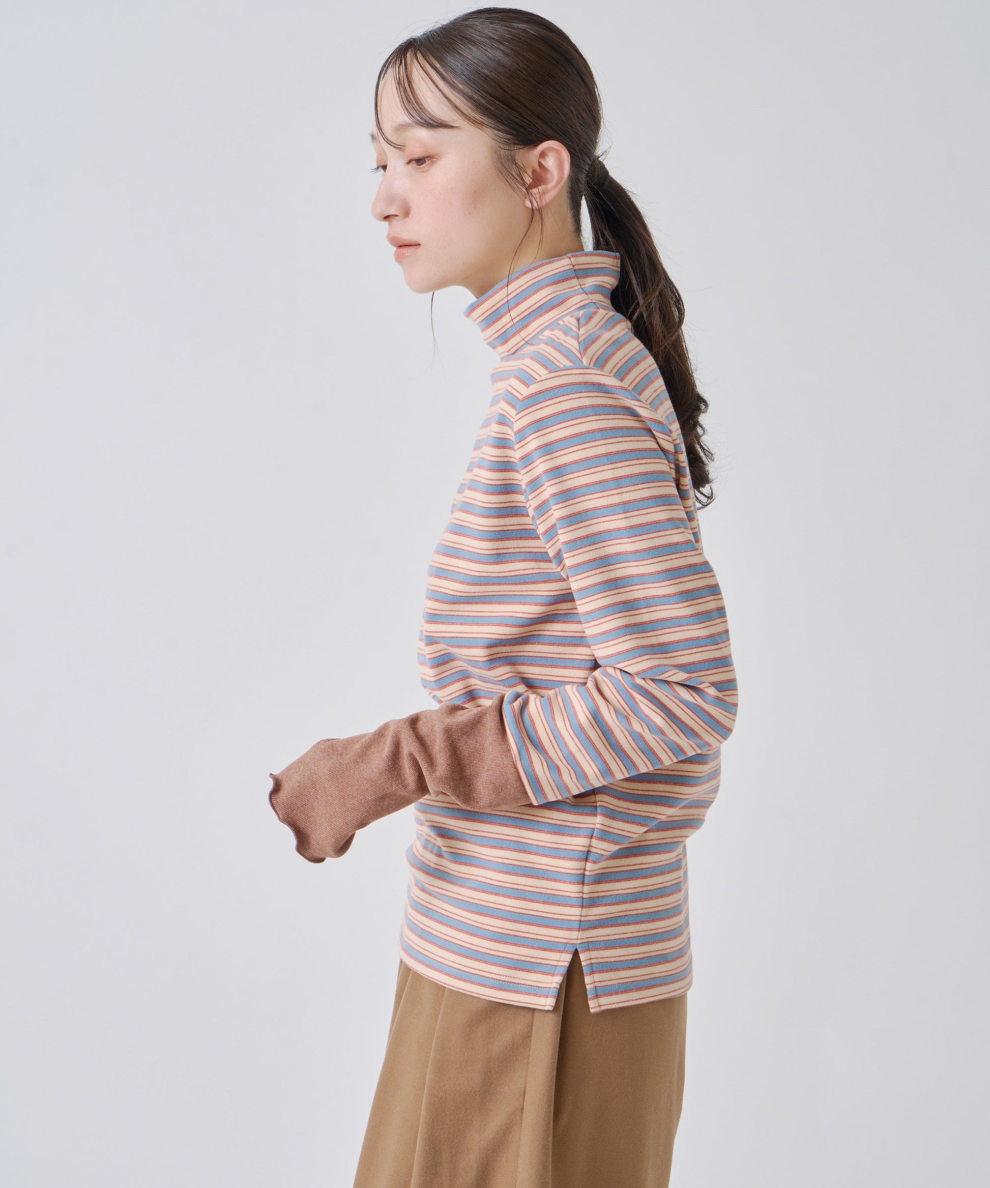 マルチカラーのボーダーカットソー素材を使用したハイネックトップスです。