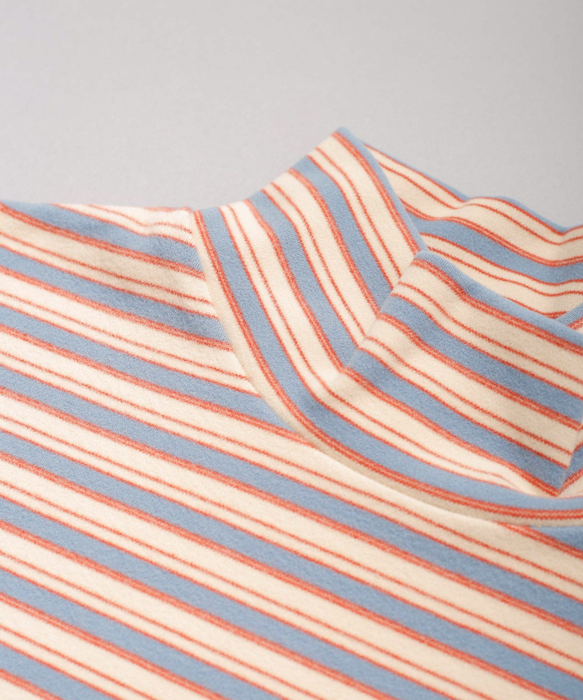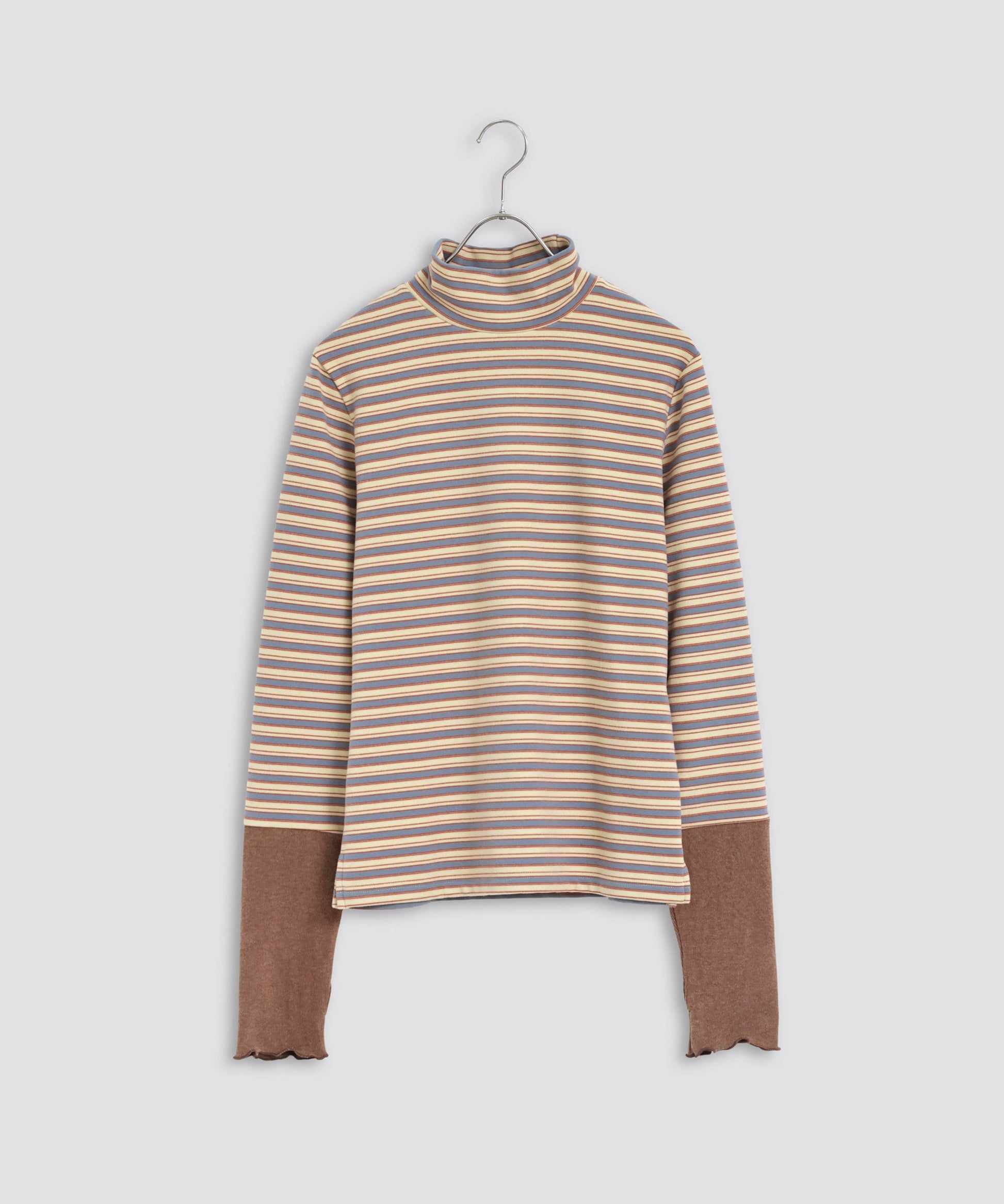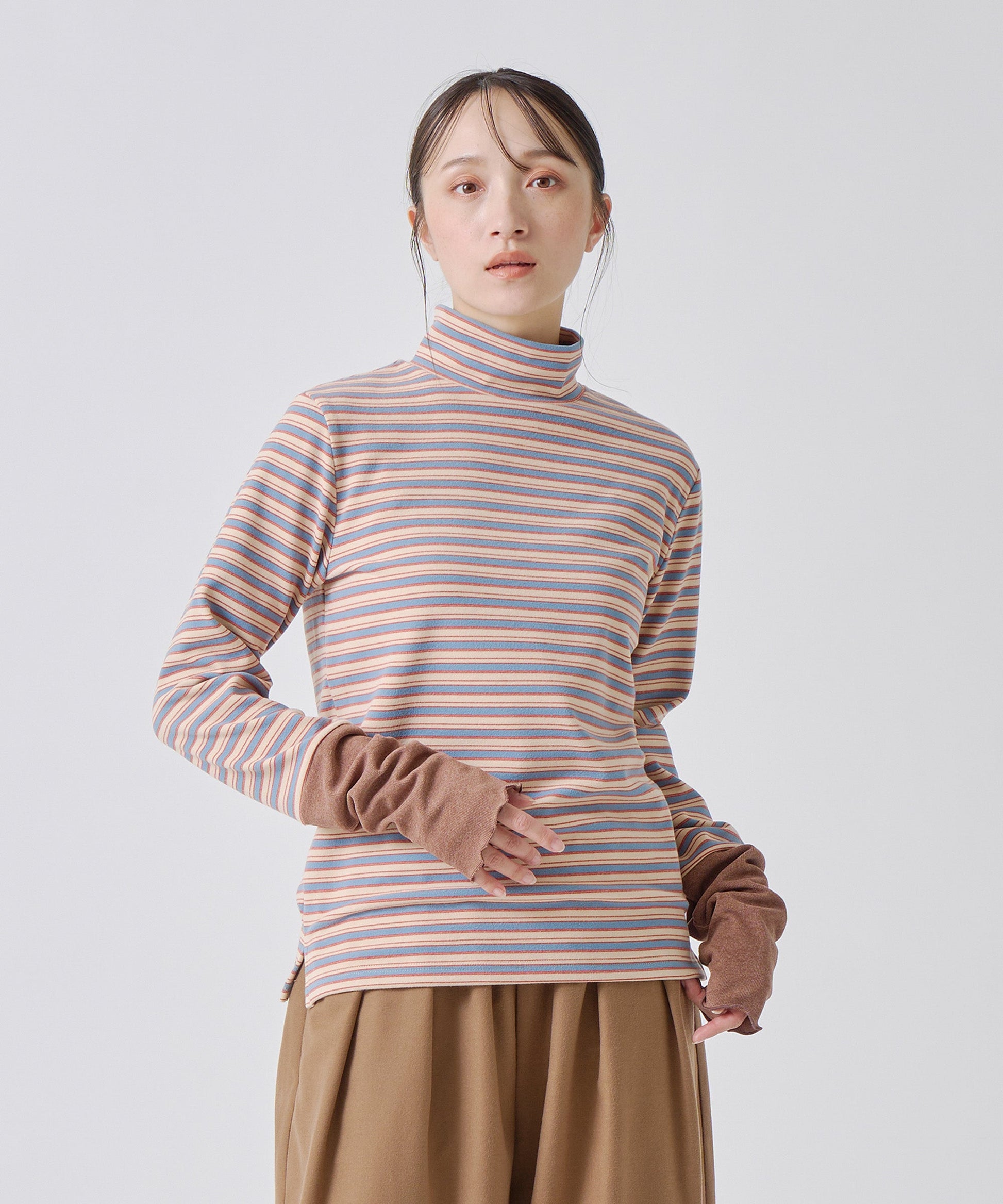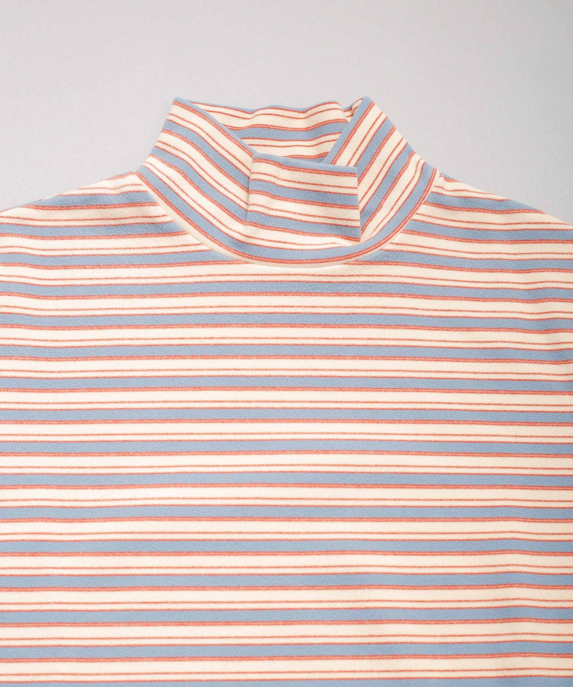 マルチカラーのボーダーカットソー素材を使用したハイネックトップスです。