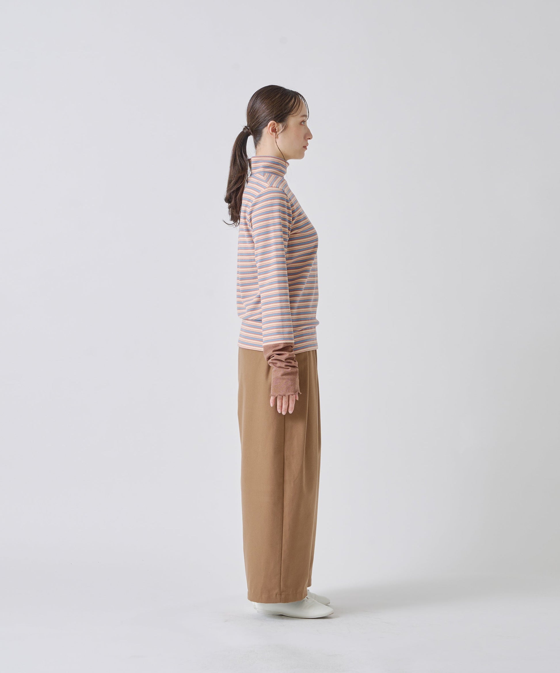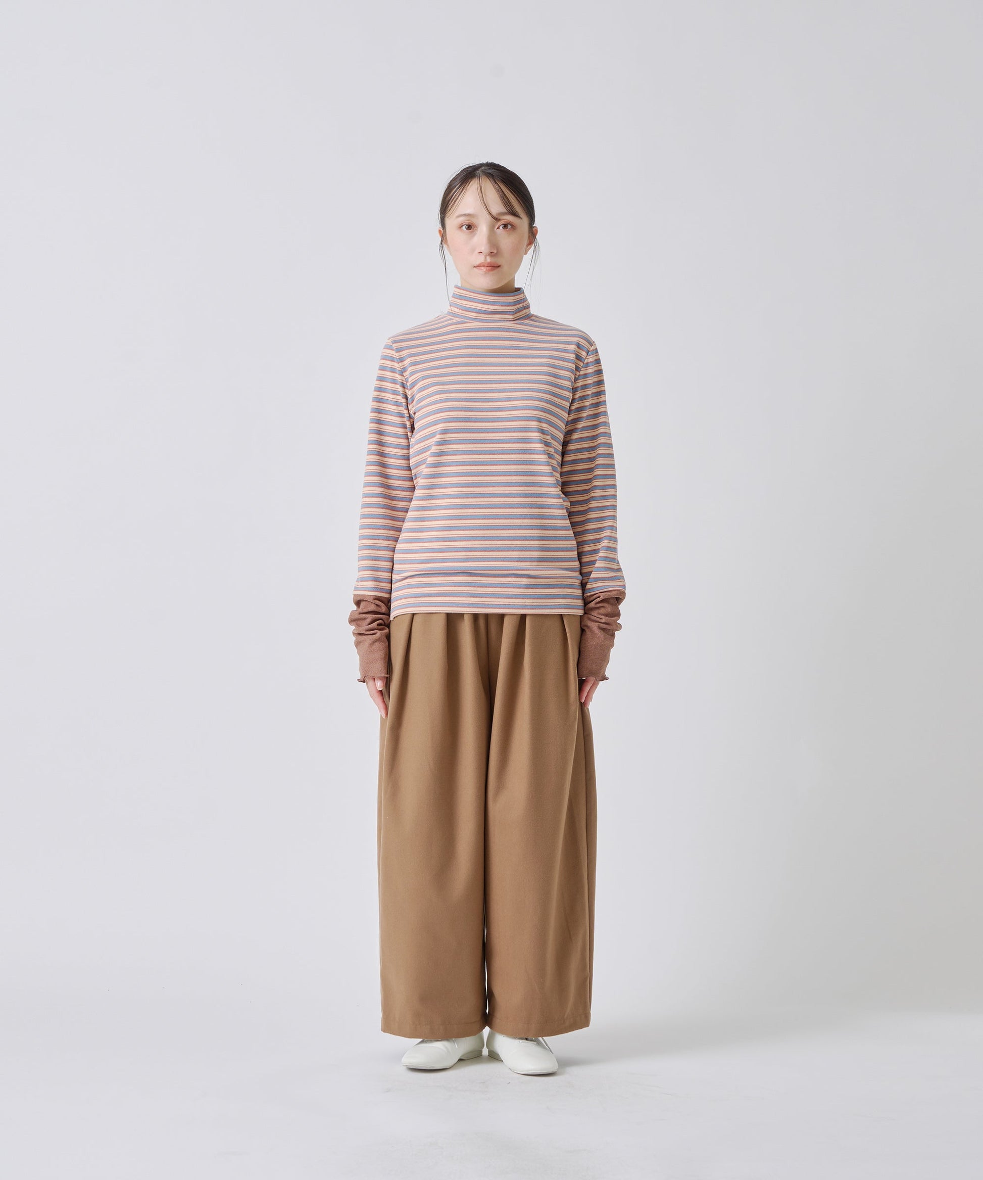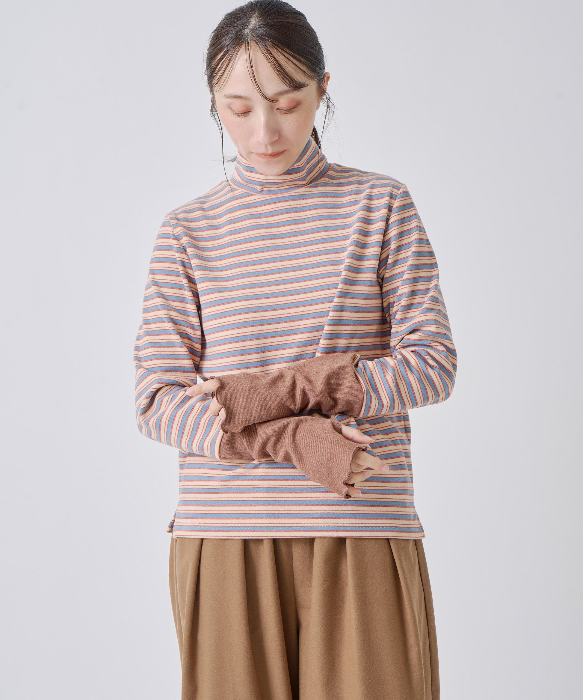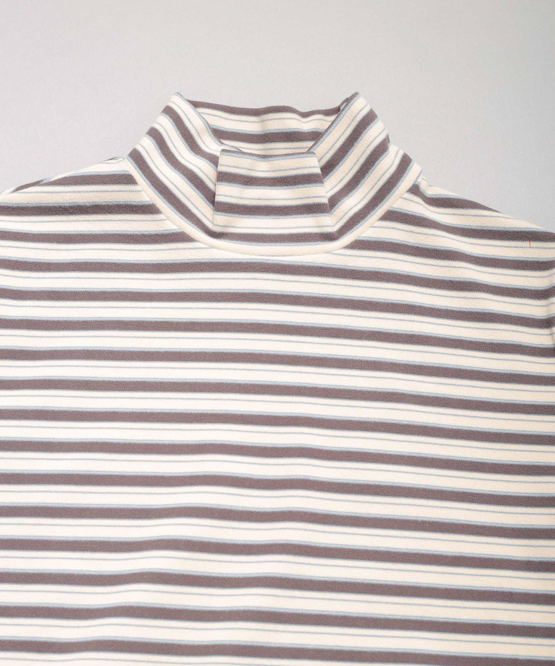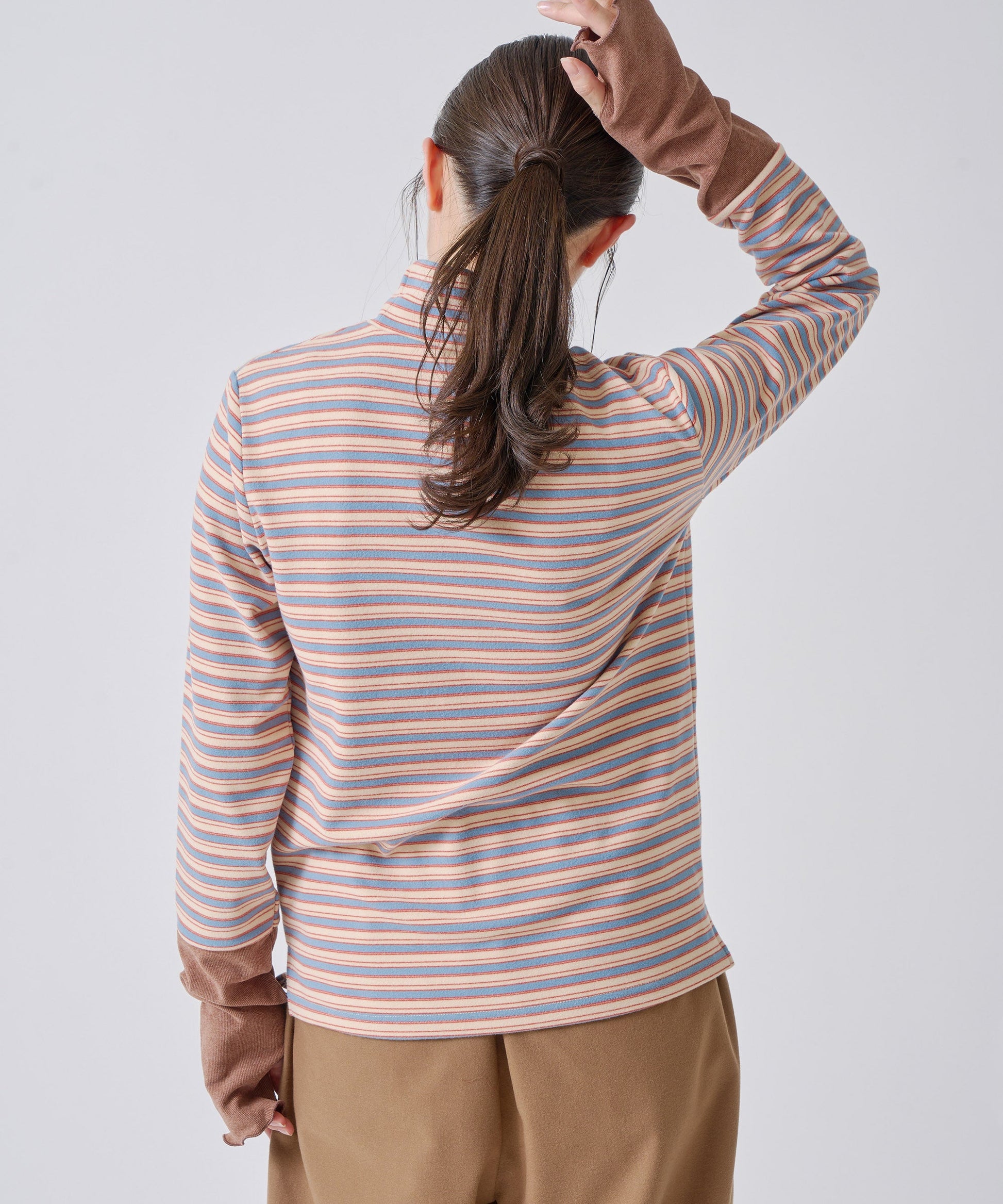 マルチカラーのボーダーカットソー素材を使用したハイネックトップスです。