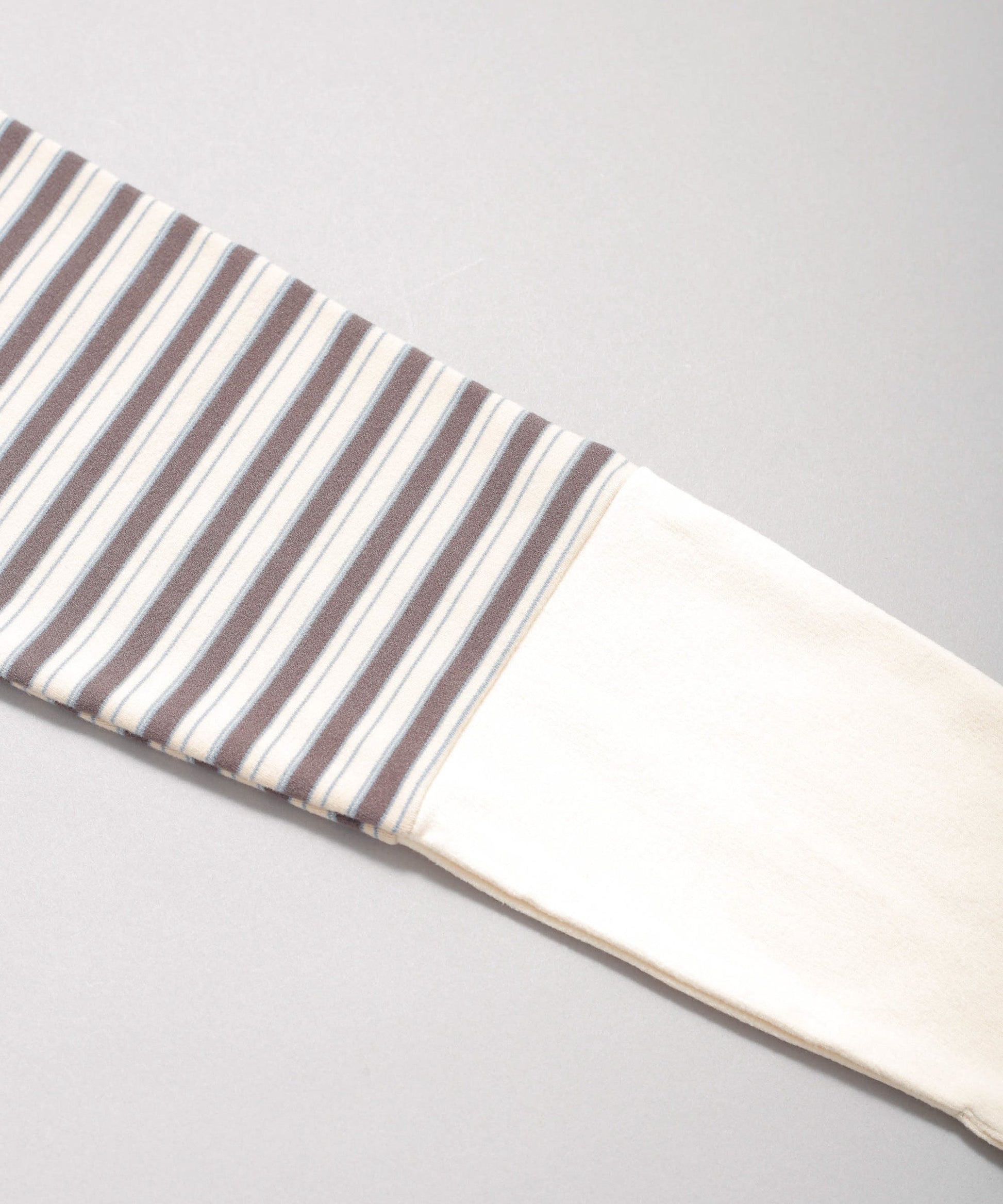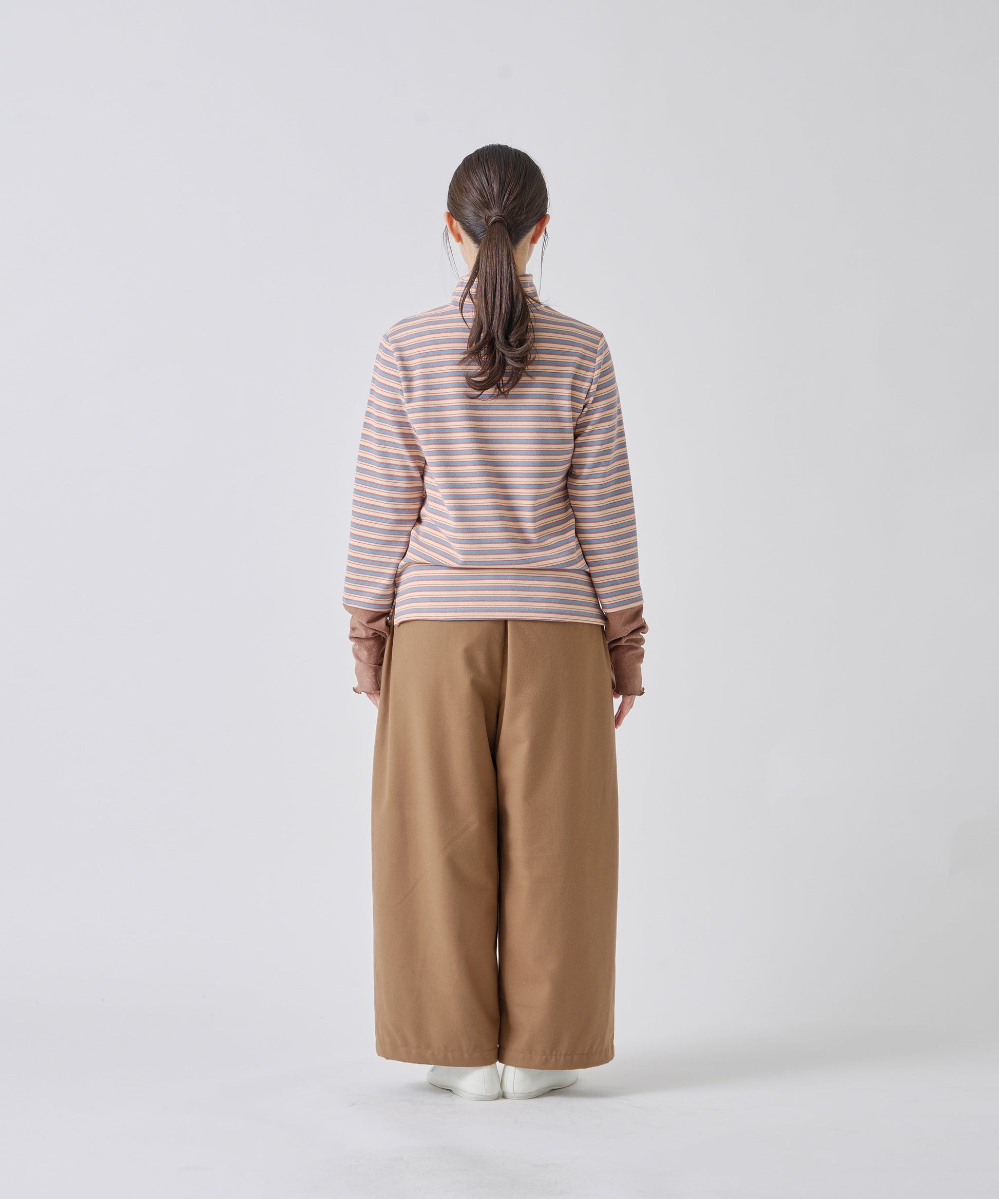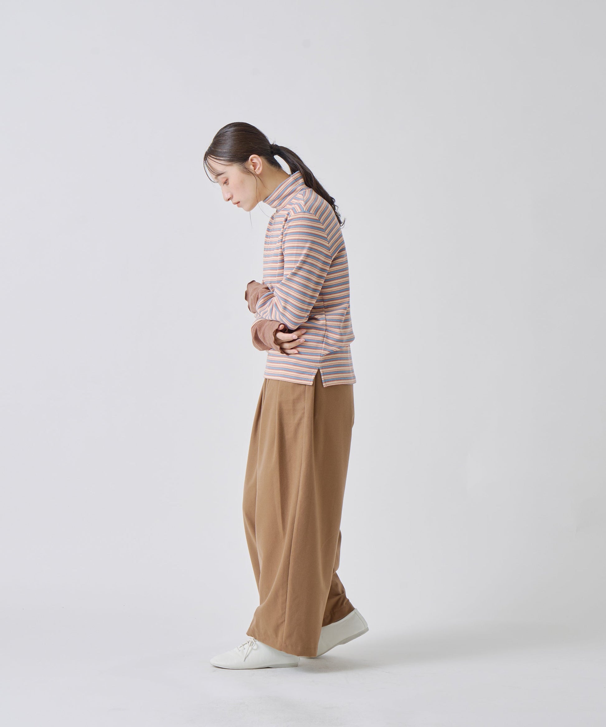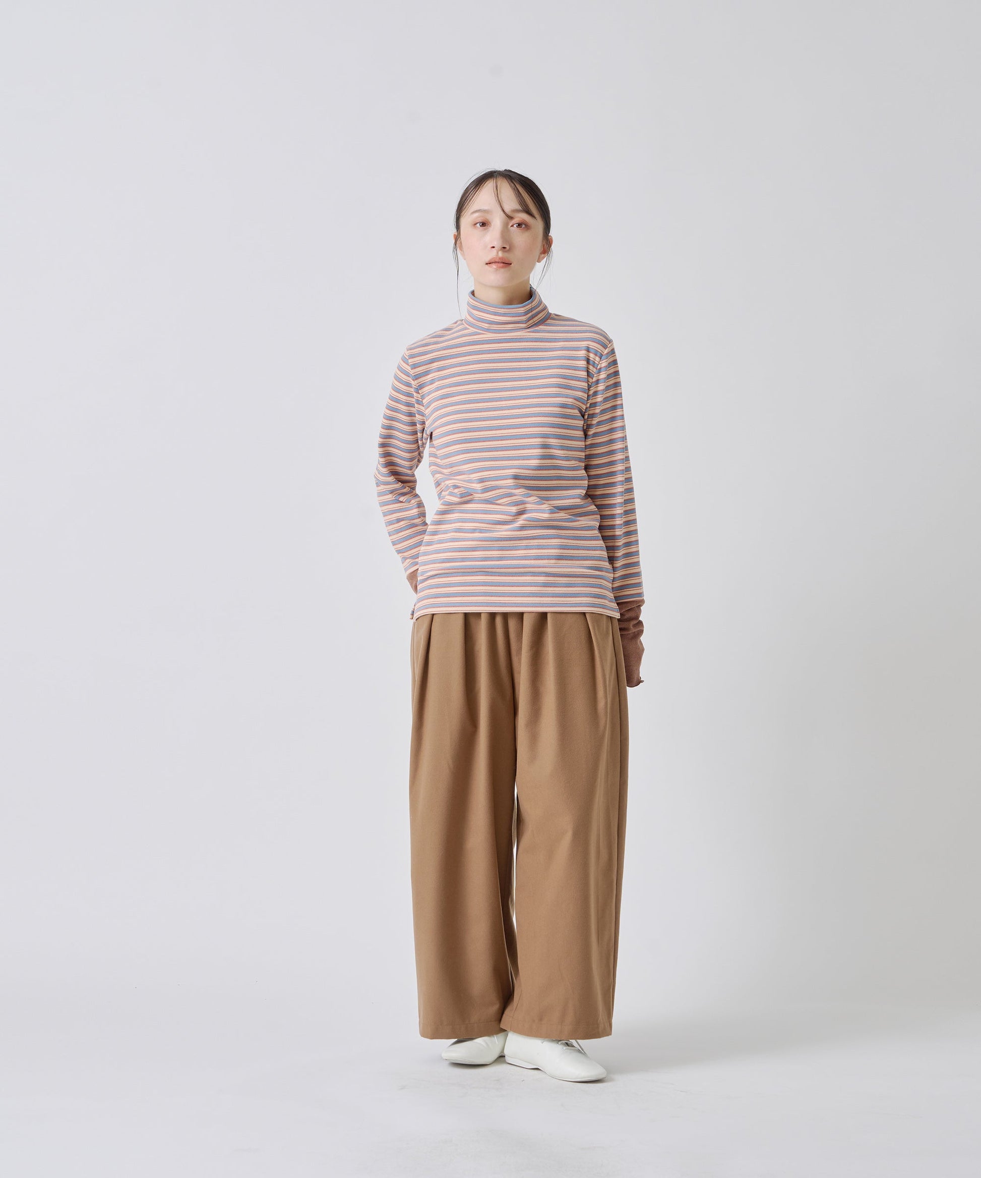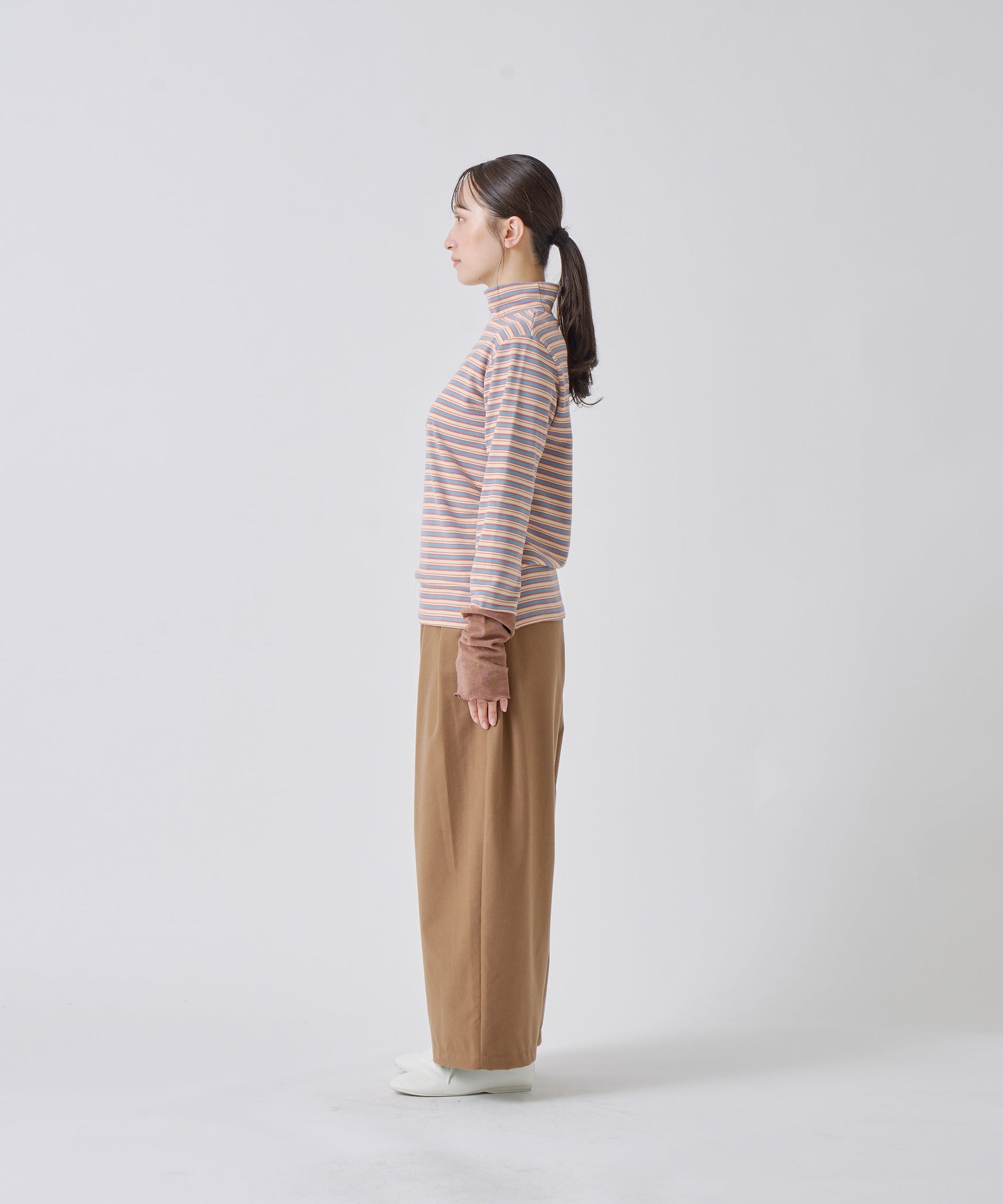 マルチカラーのボーダーカットソー素材を使用したハイネックトップスです。
