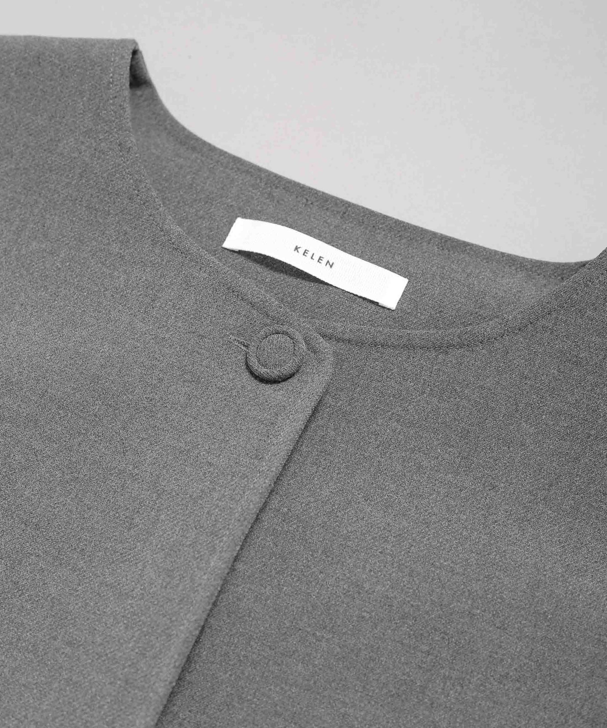 フロントに施した第一ボタンは。共生地の包みボタンがアクセントとなり、それ以下はスナップボタンで着脱が簡単。