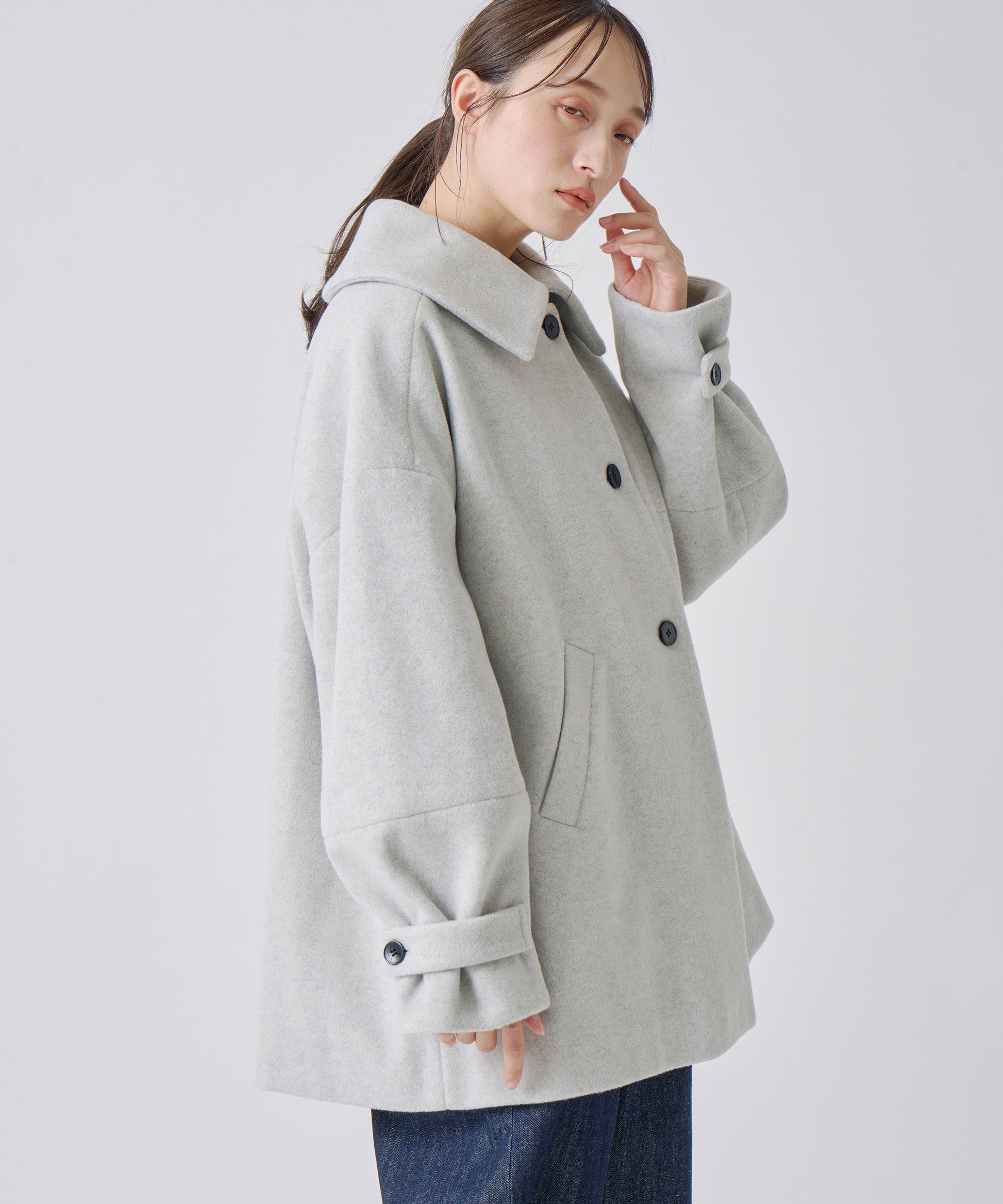 存在感のある大きめの襟が特徴的なAラインシルエットのコートです。