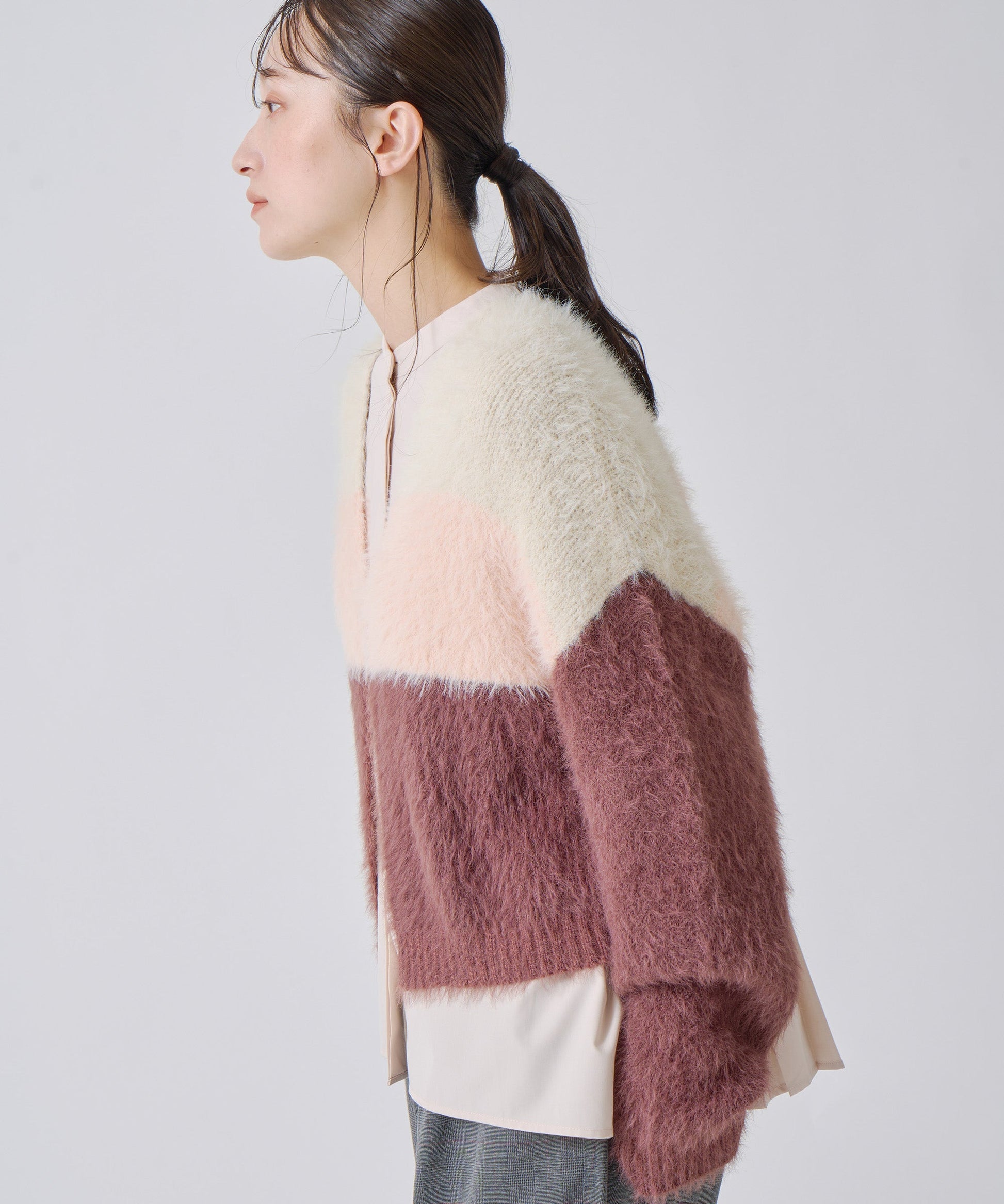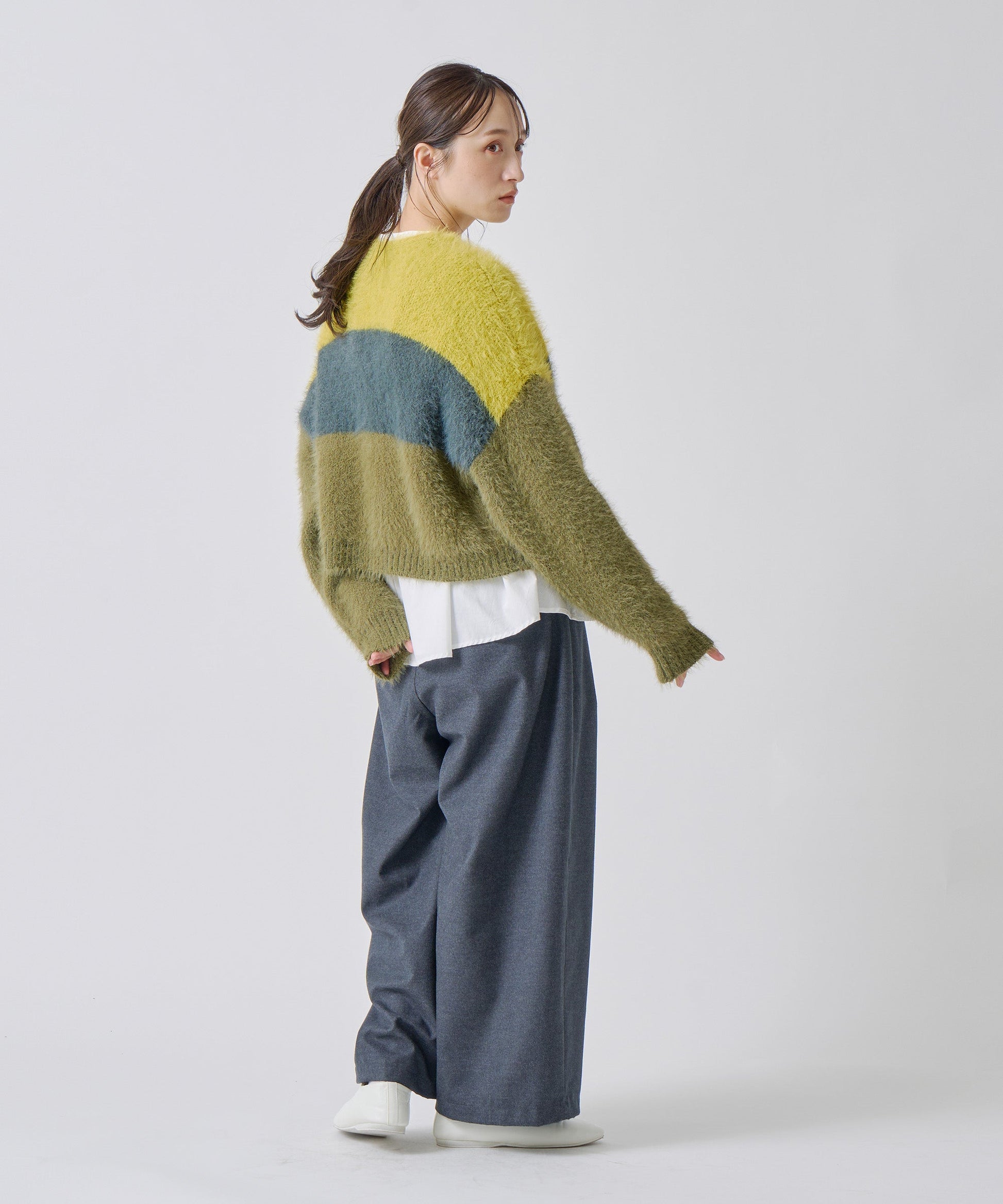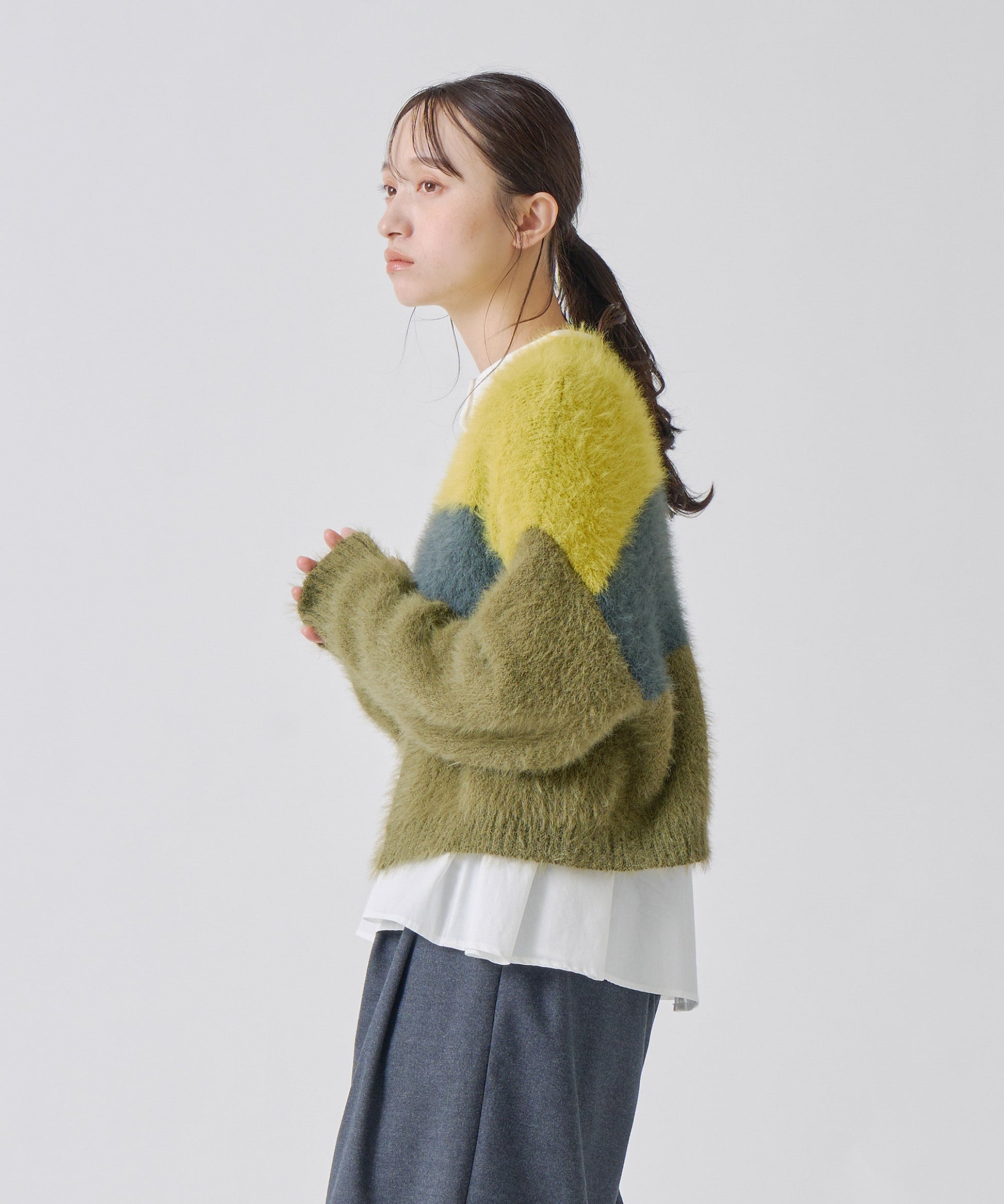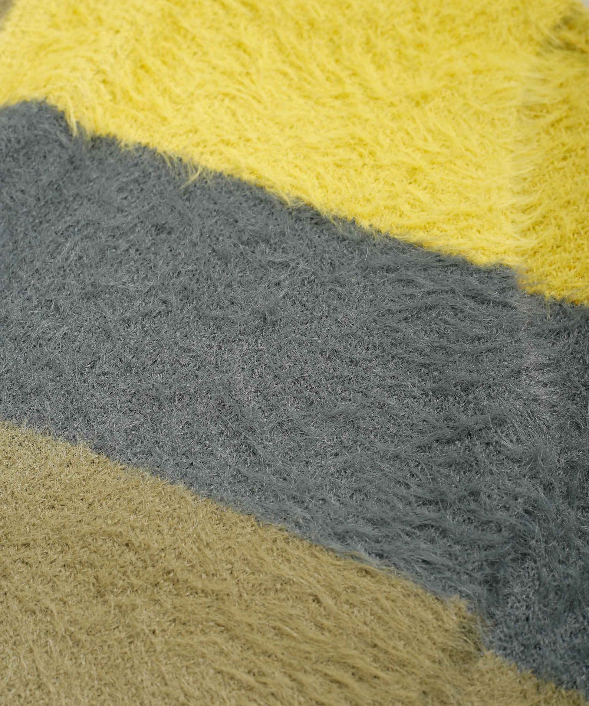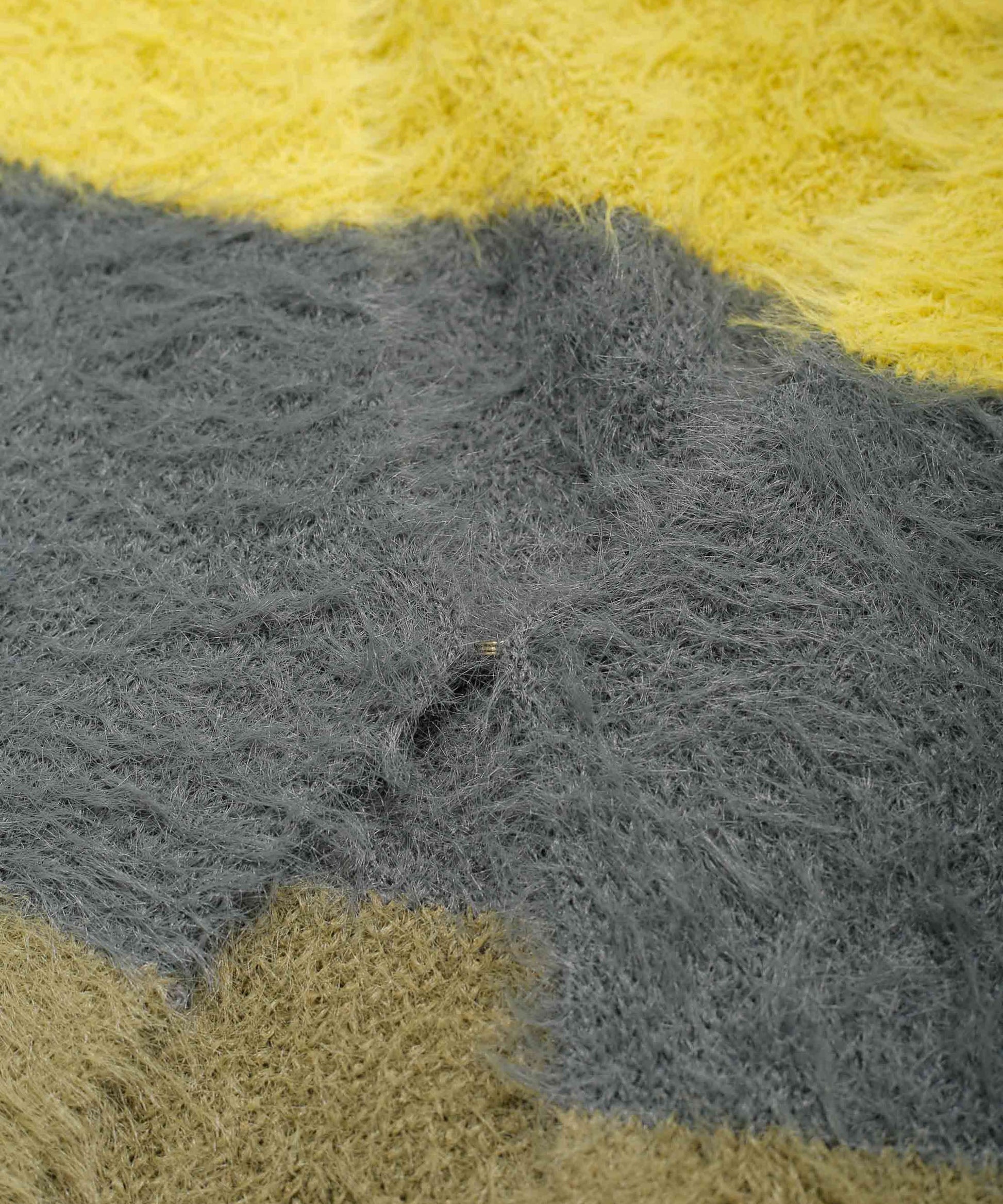 他に見ないカラーブロックは個性的でいながらスタイリングに取り入れやすいようシャギーでカラーの境界を馴染ませグラデーションのようにしたのがポイント。