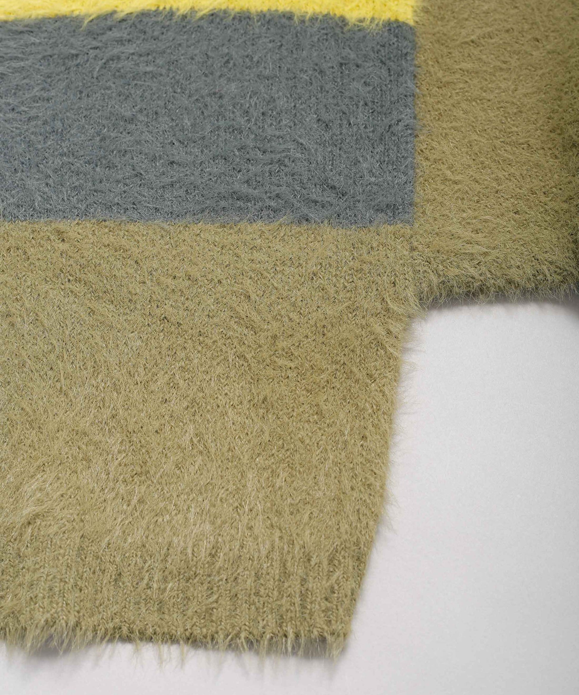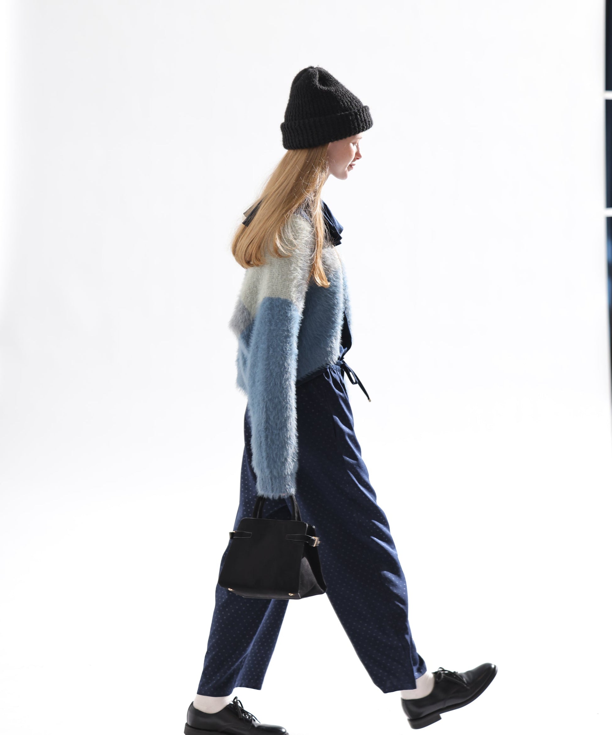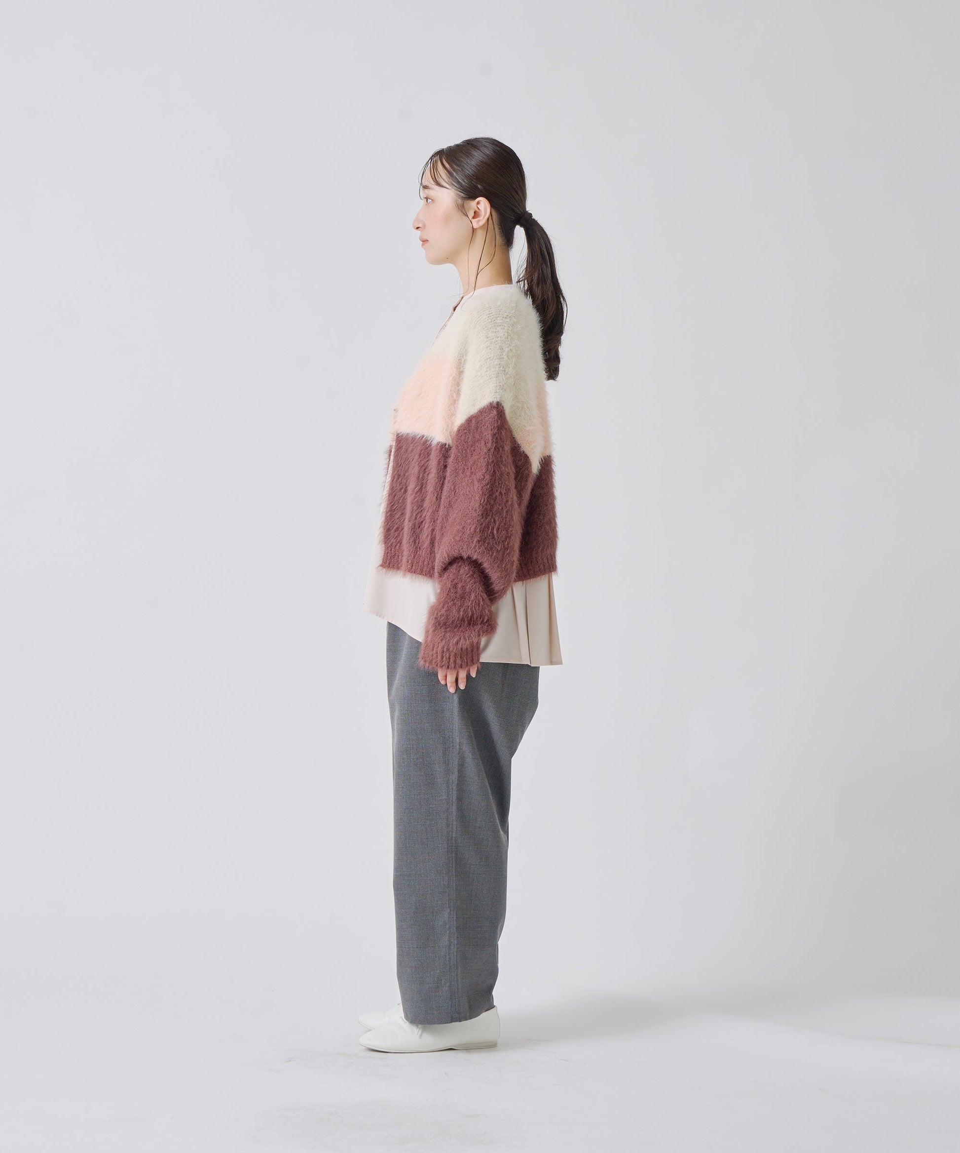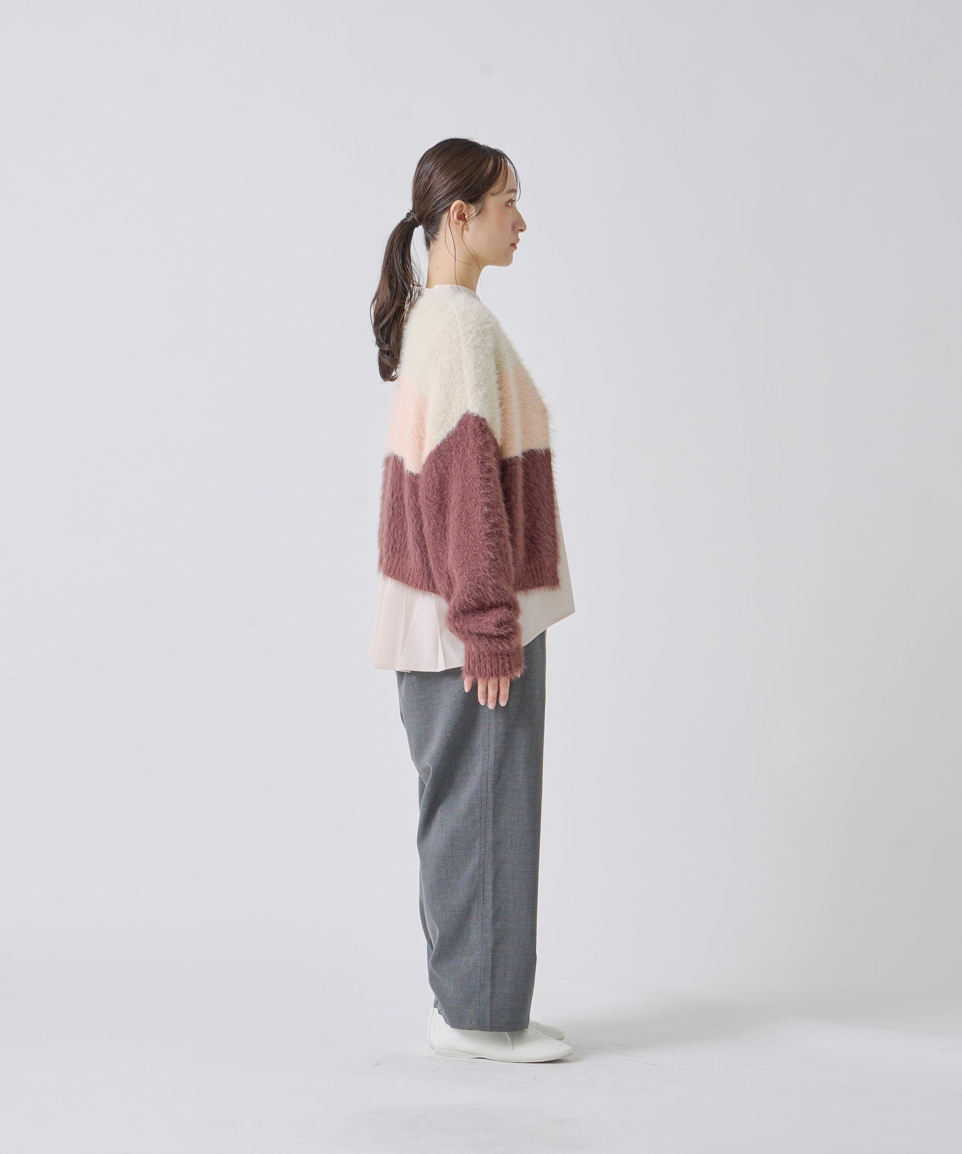 他に見ないカラーブロックは個性的でいながらスタイリングに取り入れやすいようシャギーでカラーの境界を馴染ませグラデーションのようにしたのがポイント。