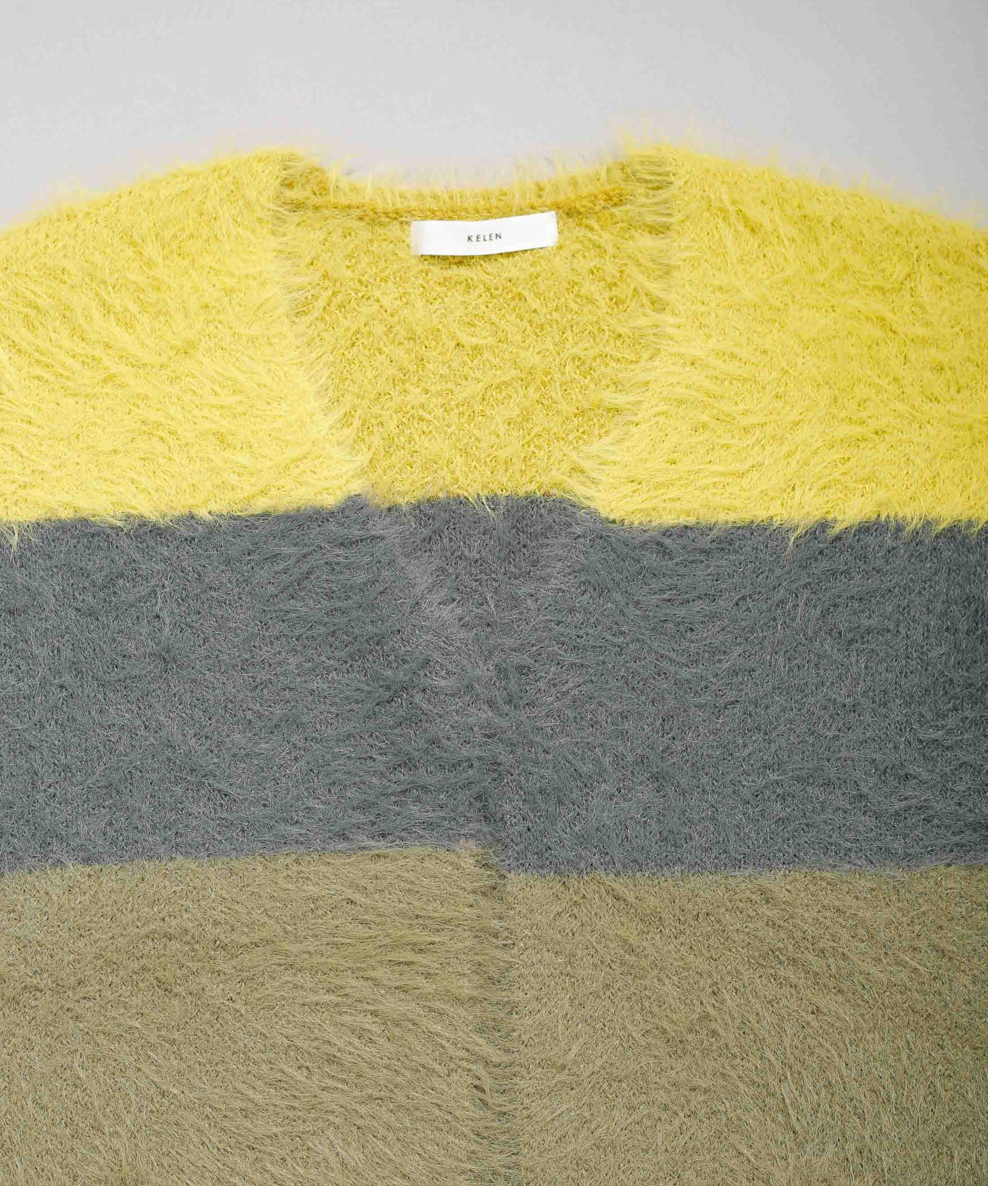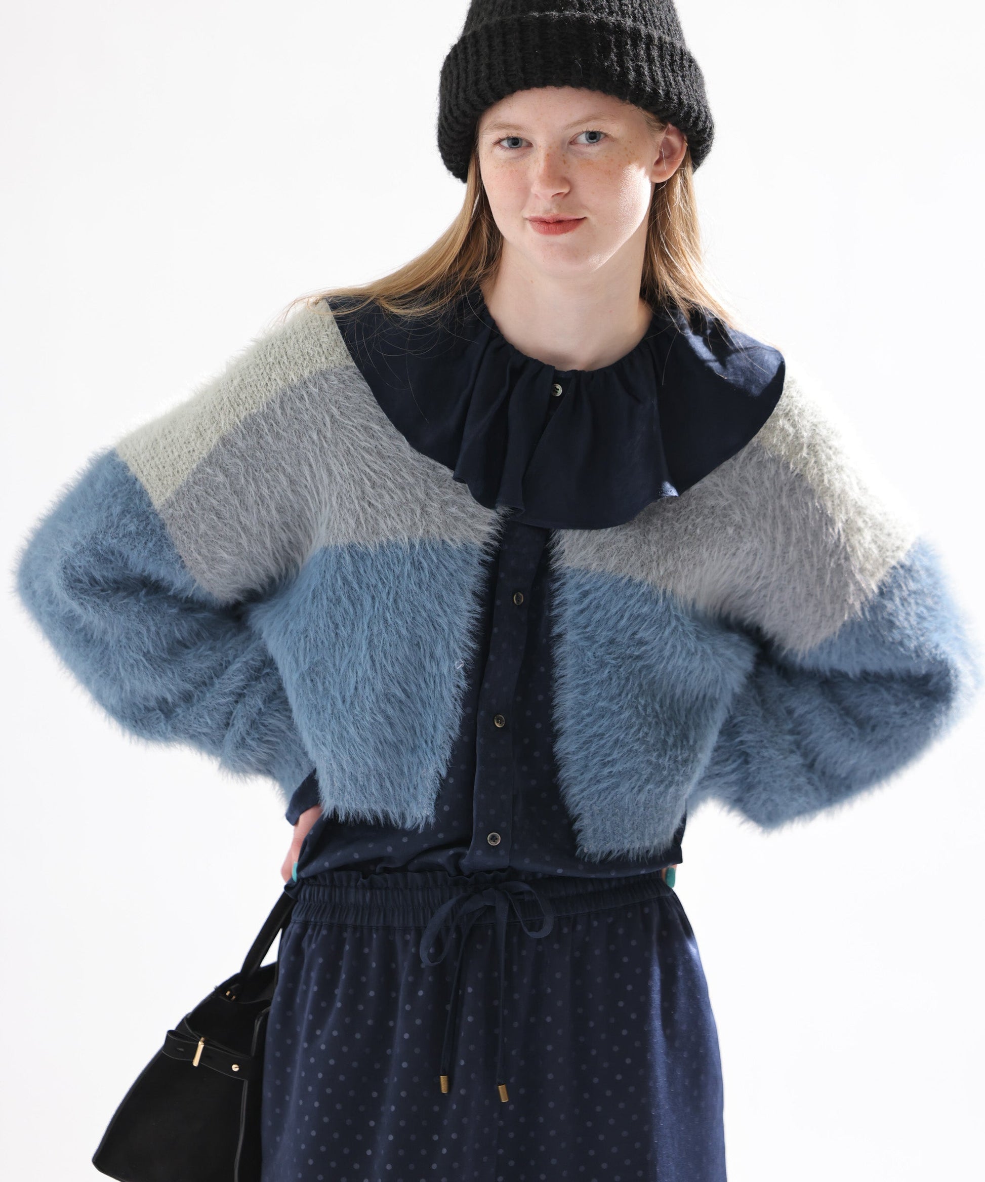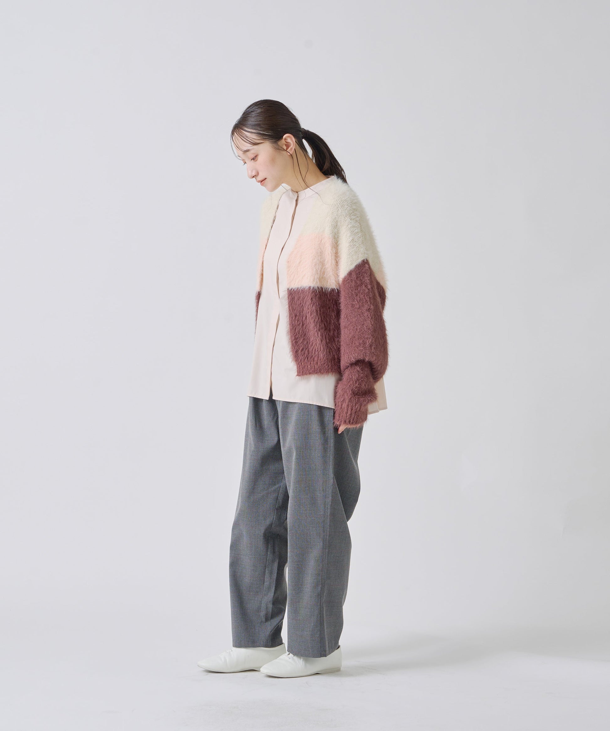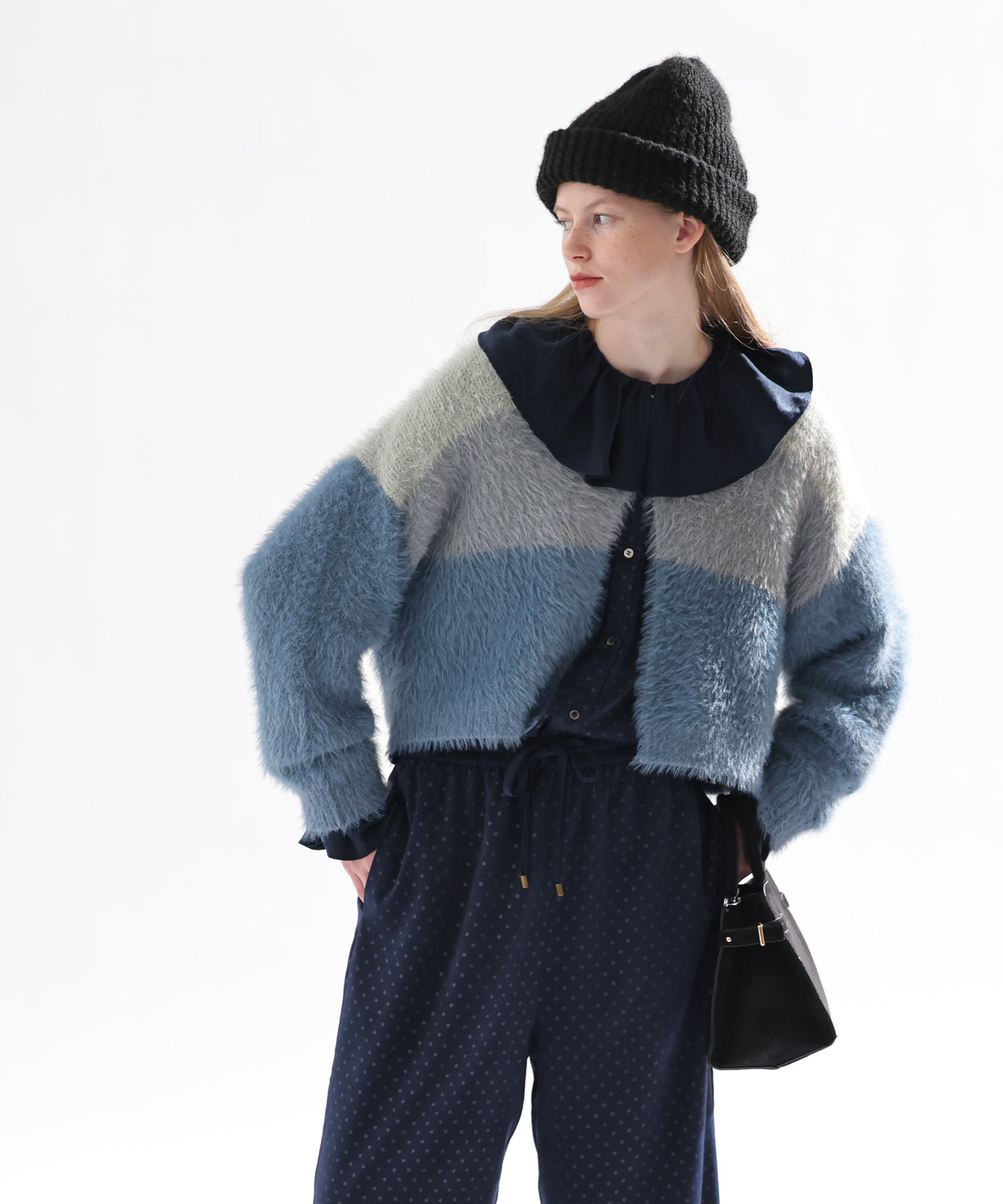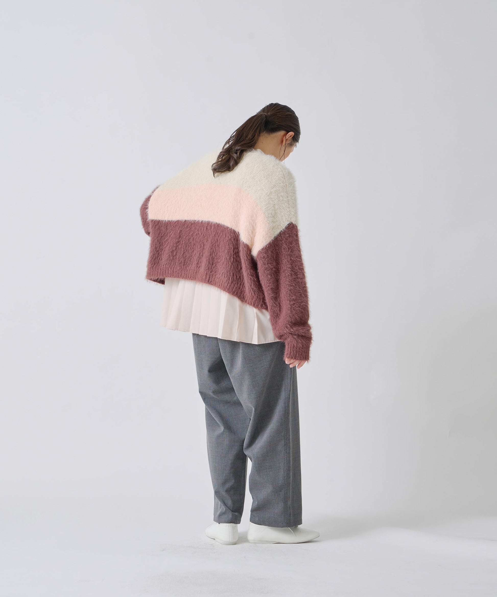 他に見ないカラーブロックは個性的でいながらスタイリングに取り入れやすいようシャギーでカラーの境界を馴染ませグラデーションのようにしたのがポイント。
