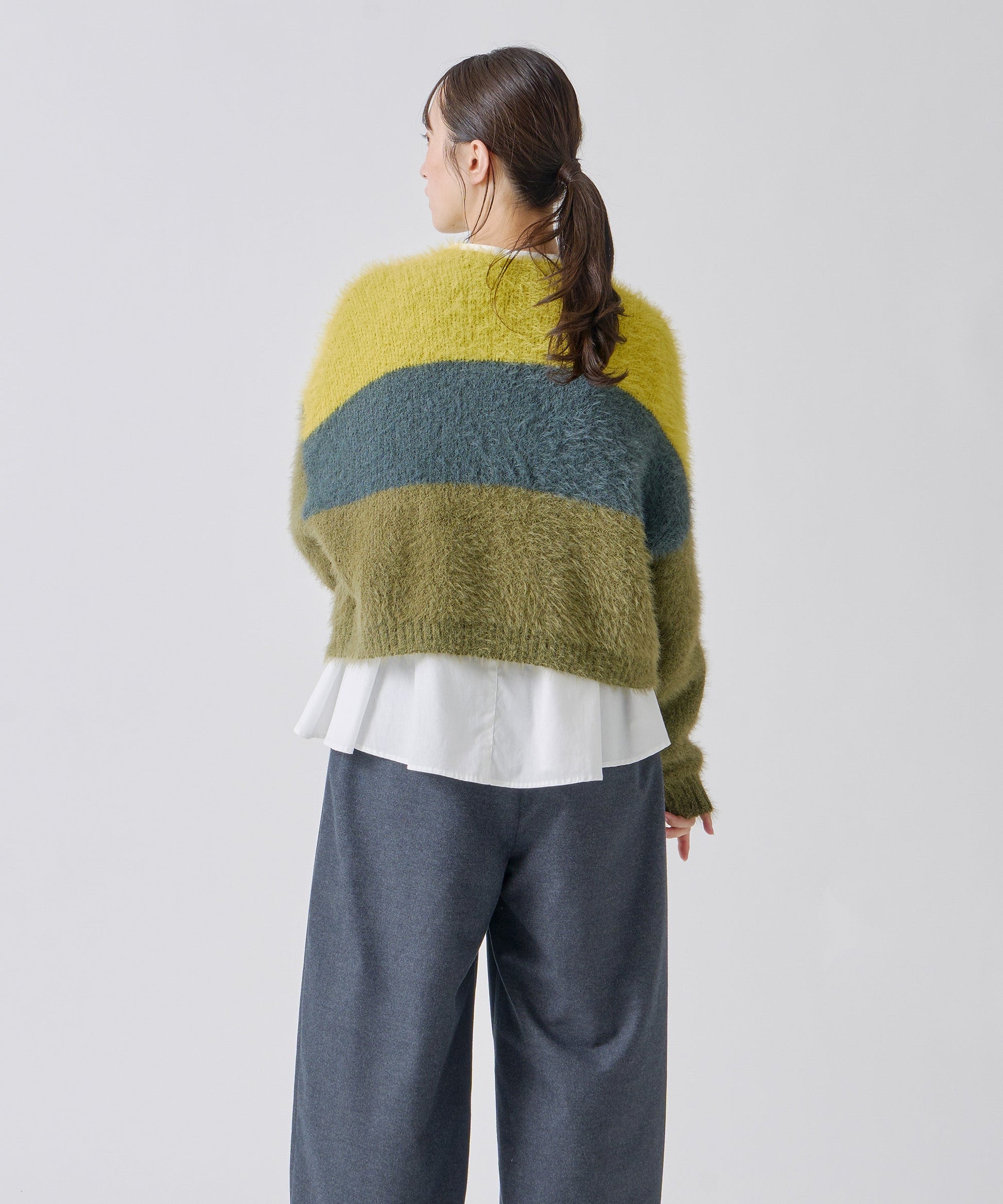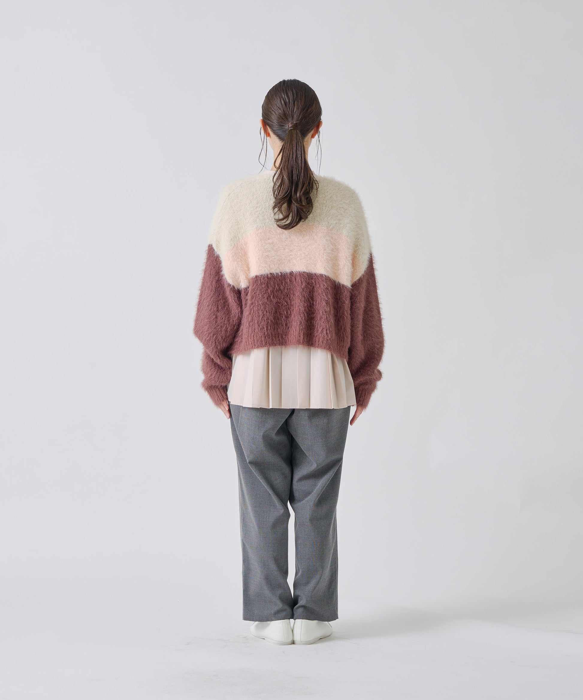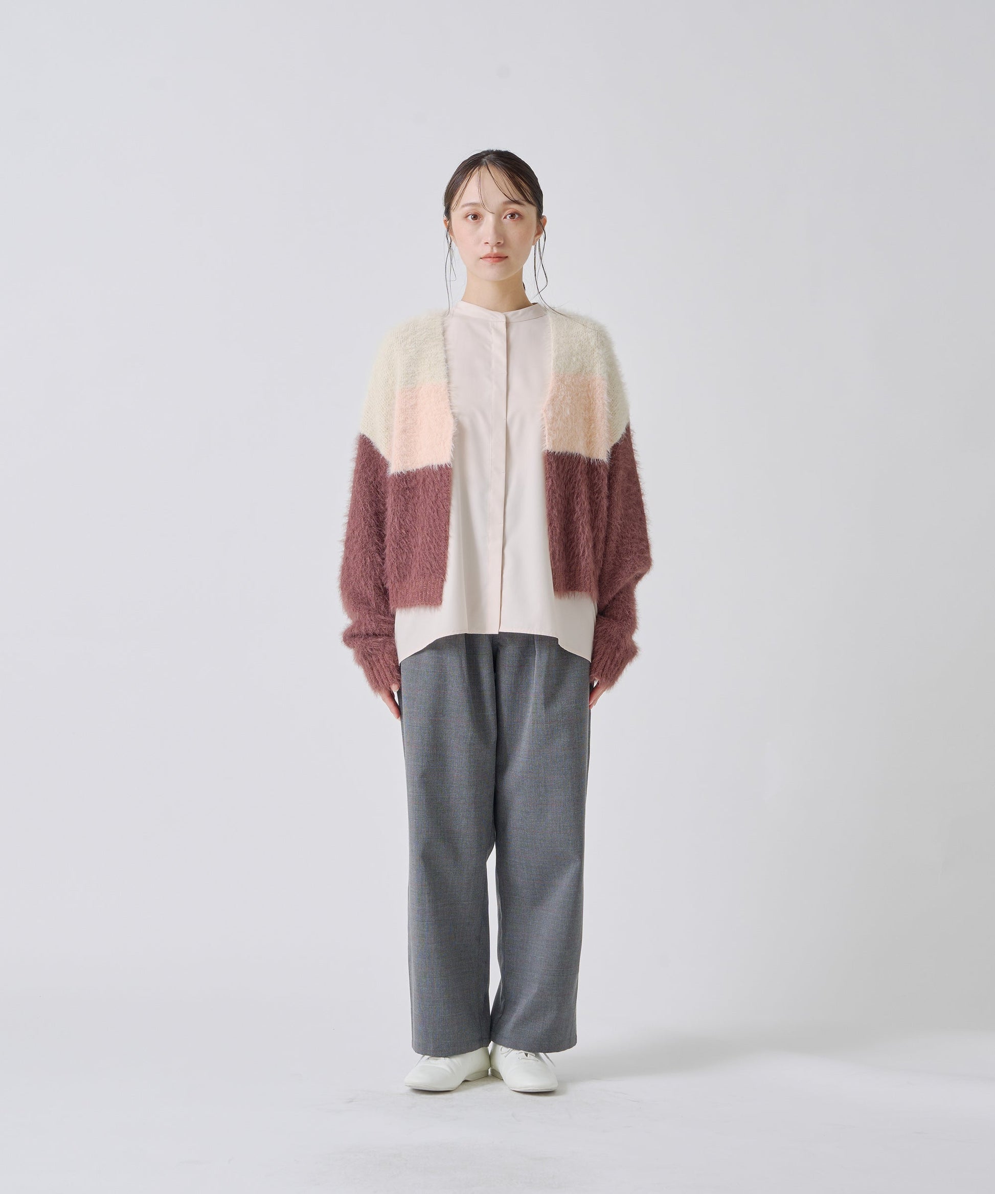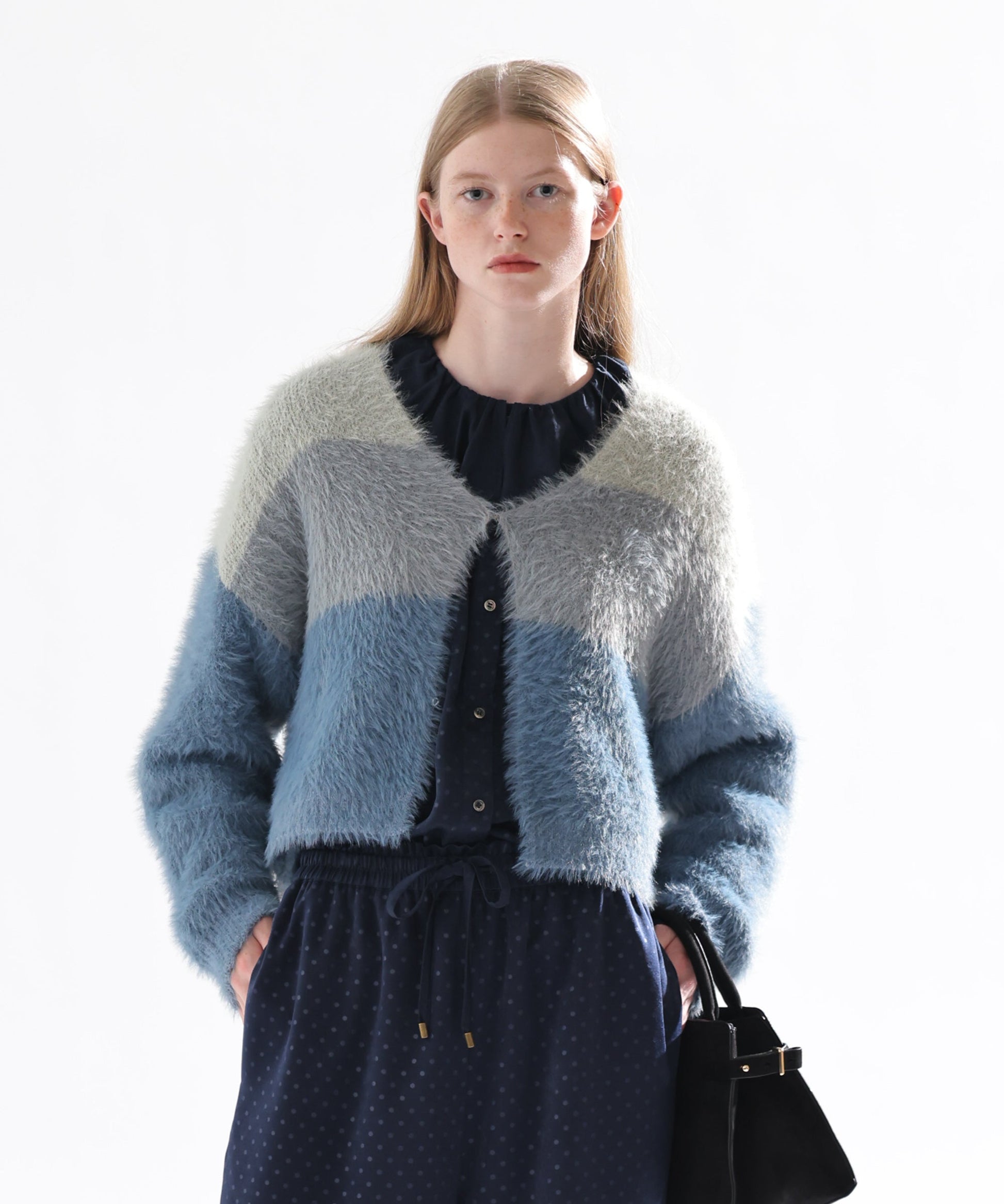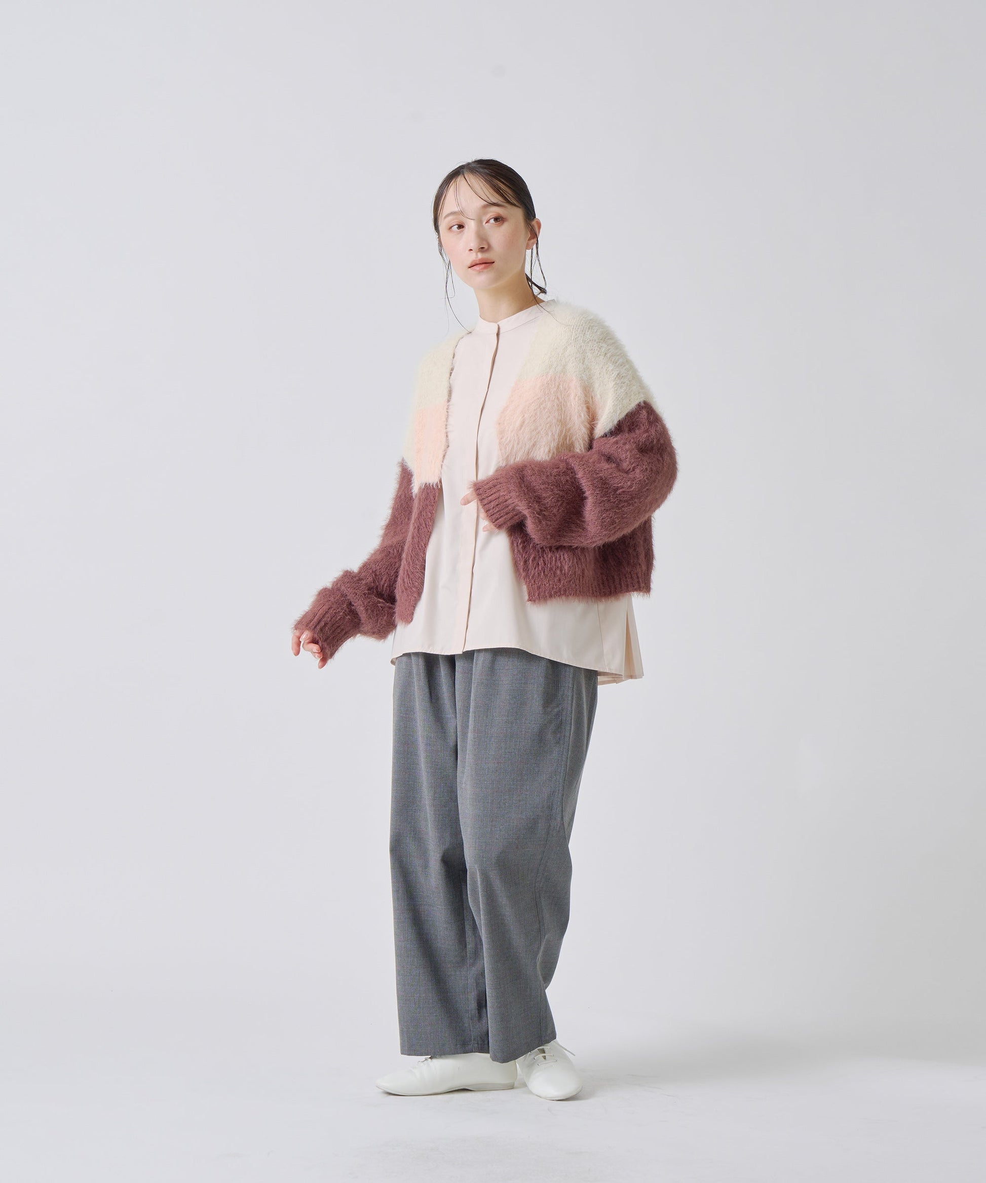 他に見ないカラーブロックは個性的でいながらスタイリングに取り入れやすいようシャギーでカラーの境界を馴染ませグラデーションのようにしたのがポイント。