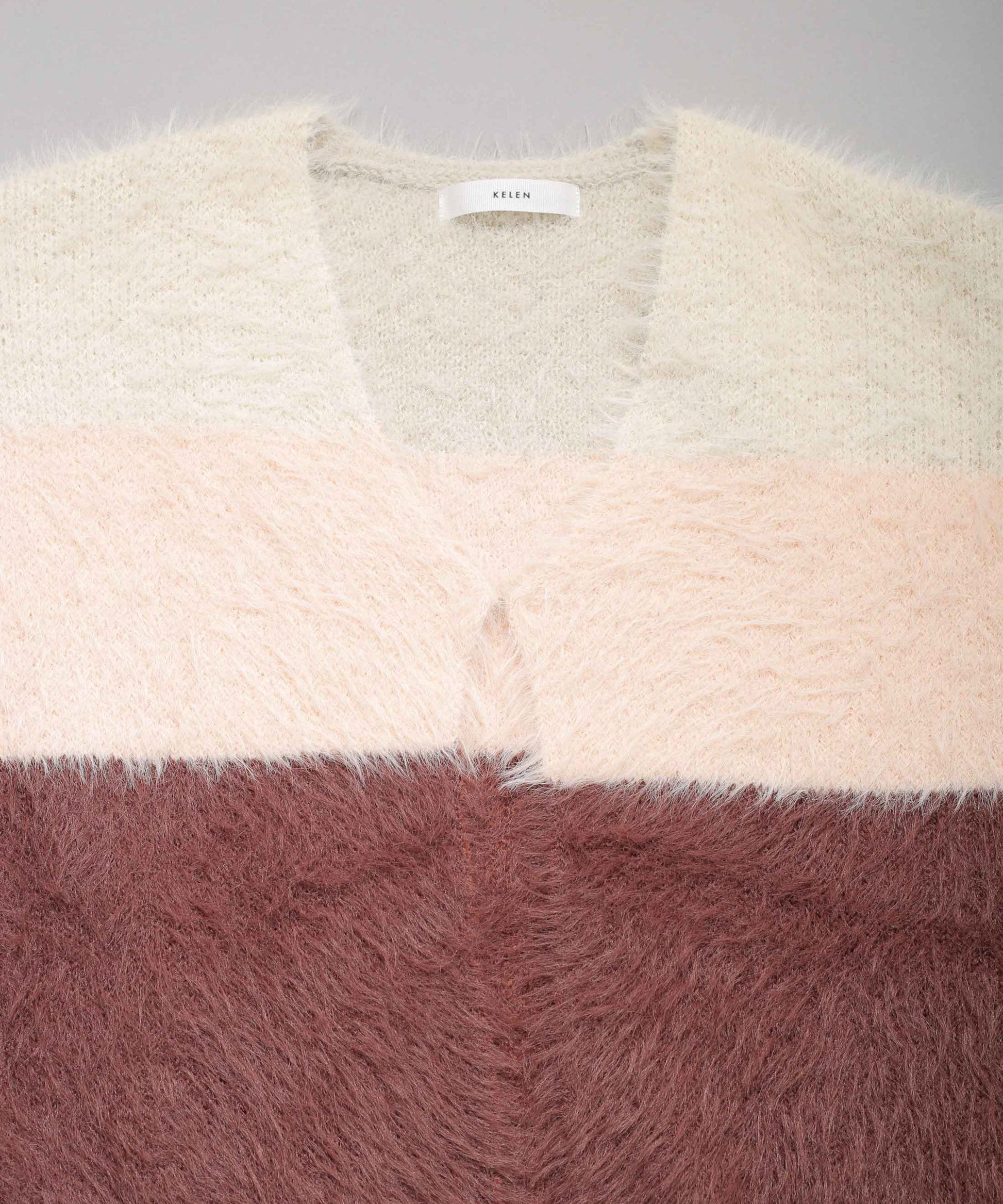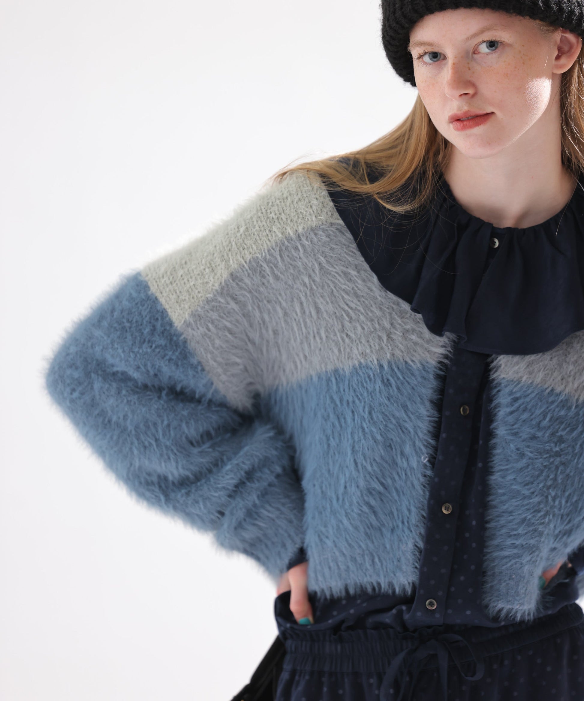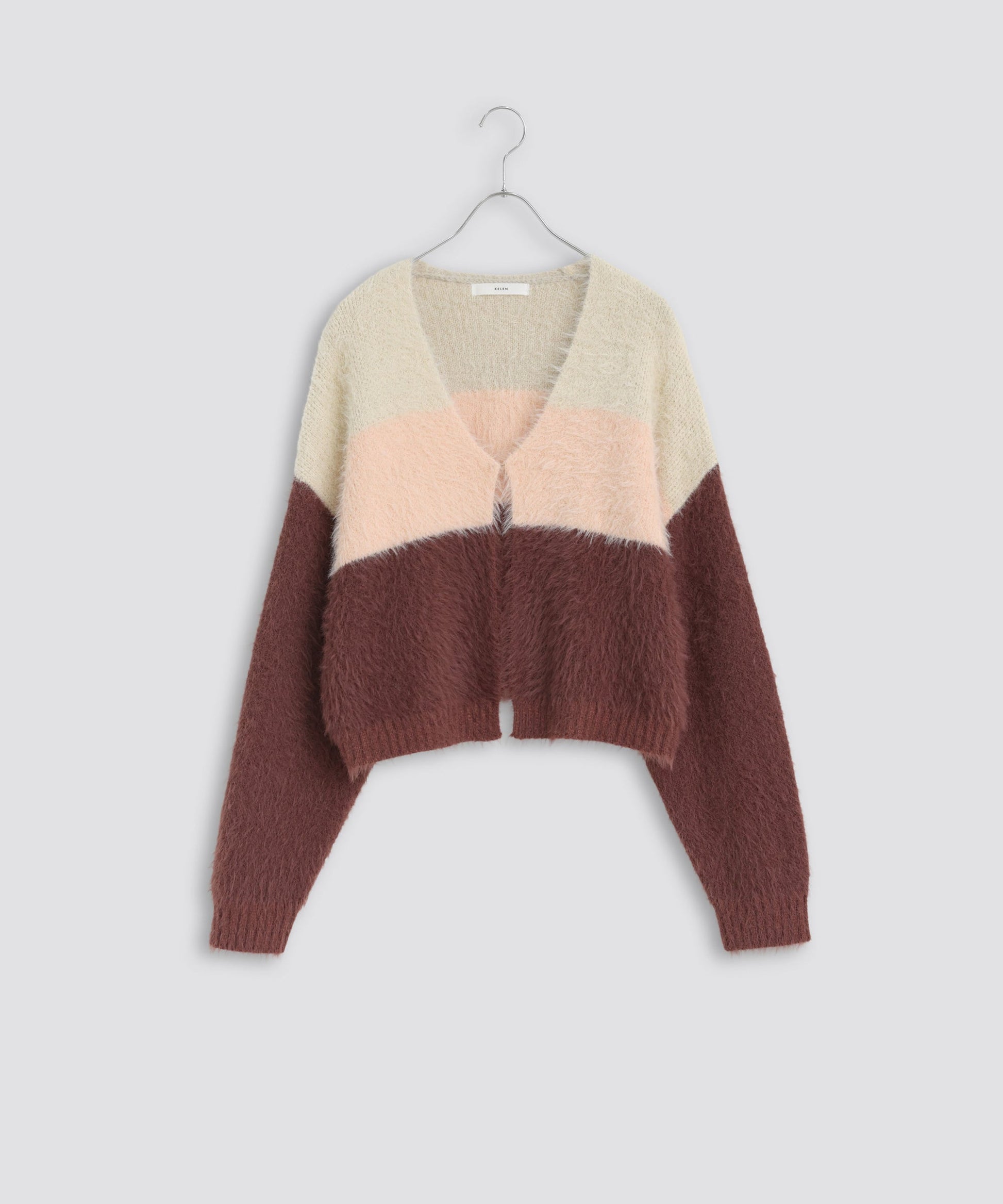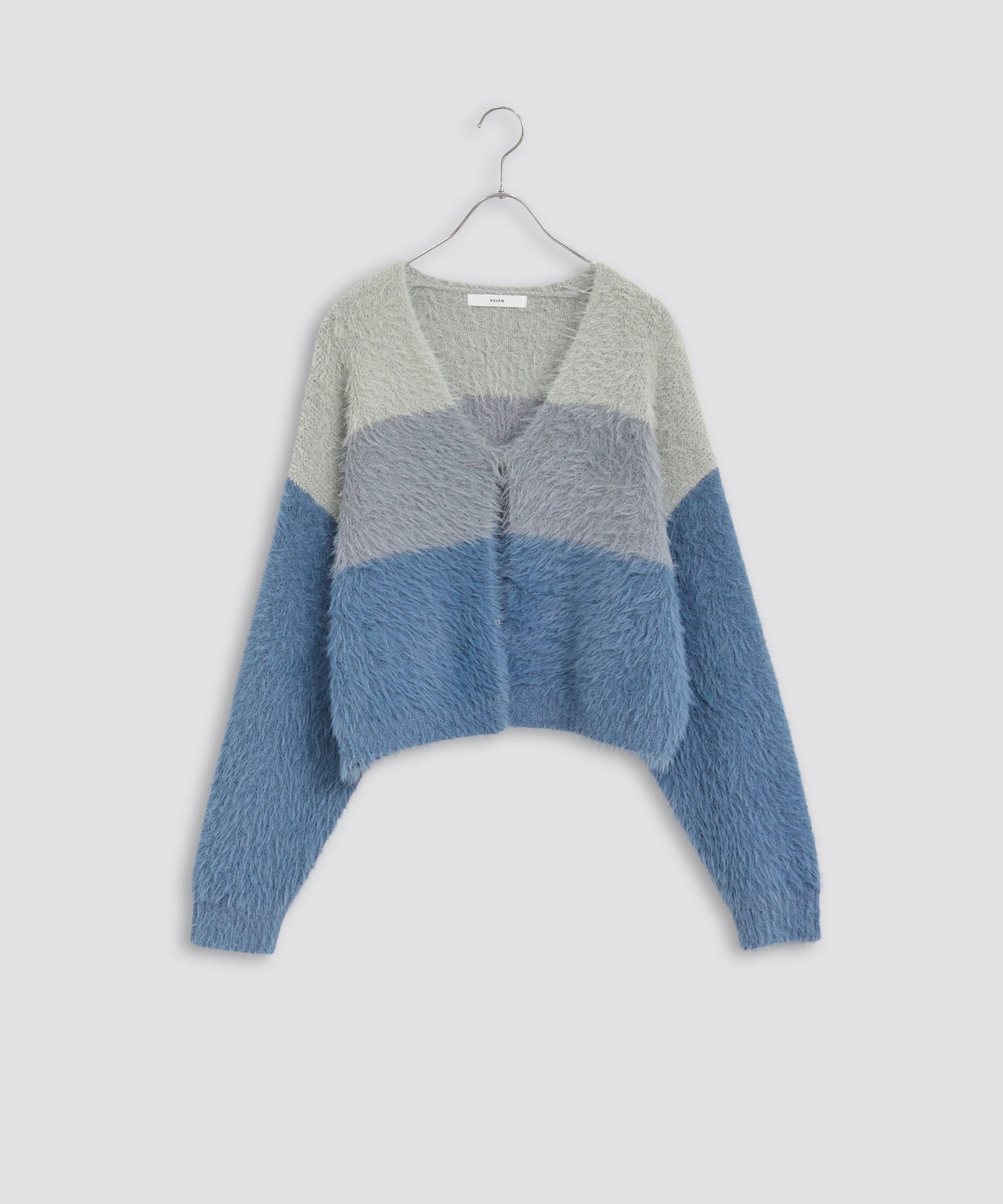 他に見ないカラーブロックは個性的でいながらスタイリングに取り入れやすいようシャギーでカラーの境界を馴染ませグラデーションのようにしたのがポイント。