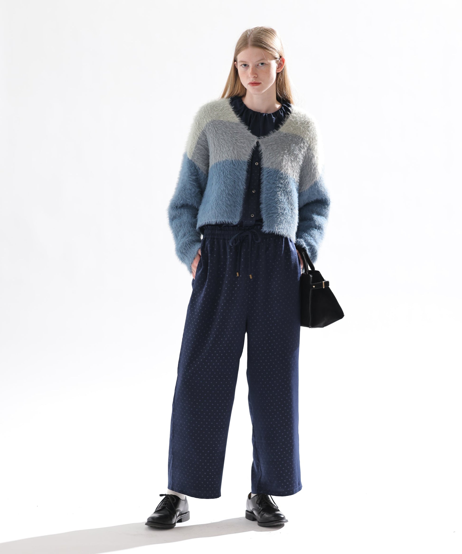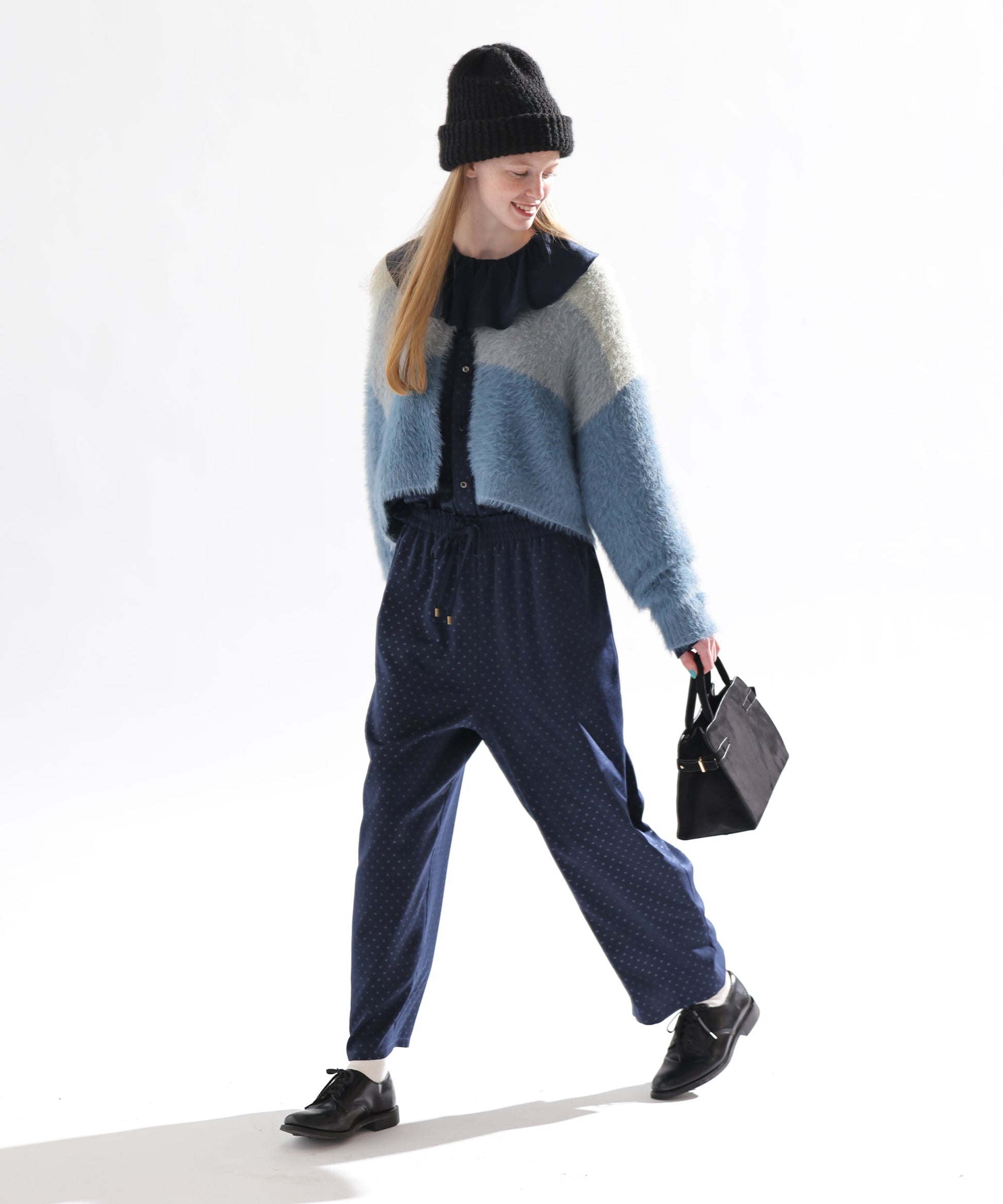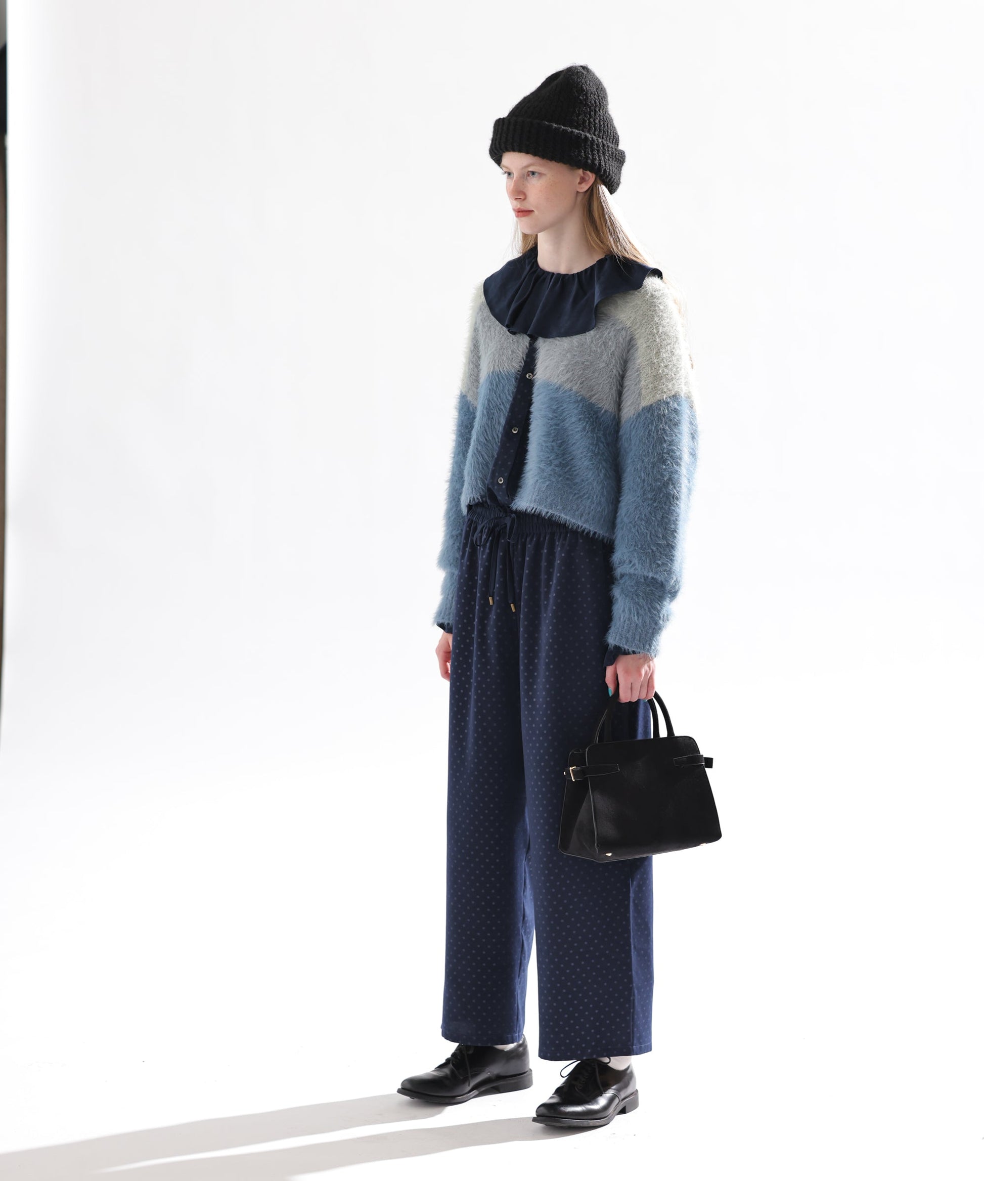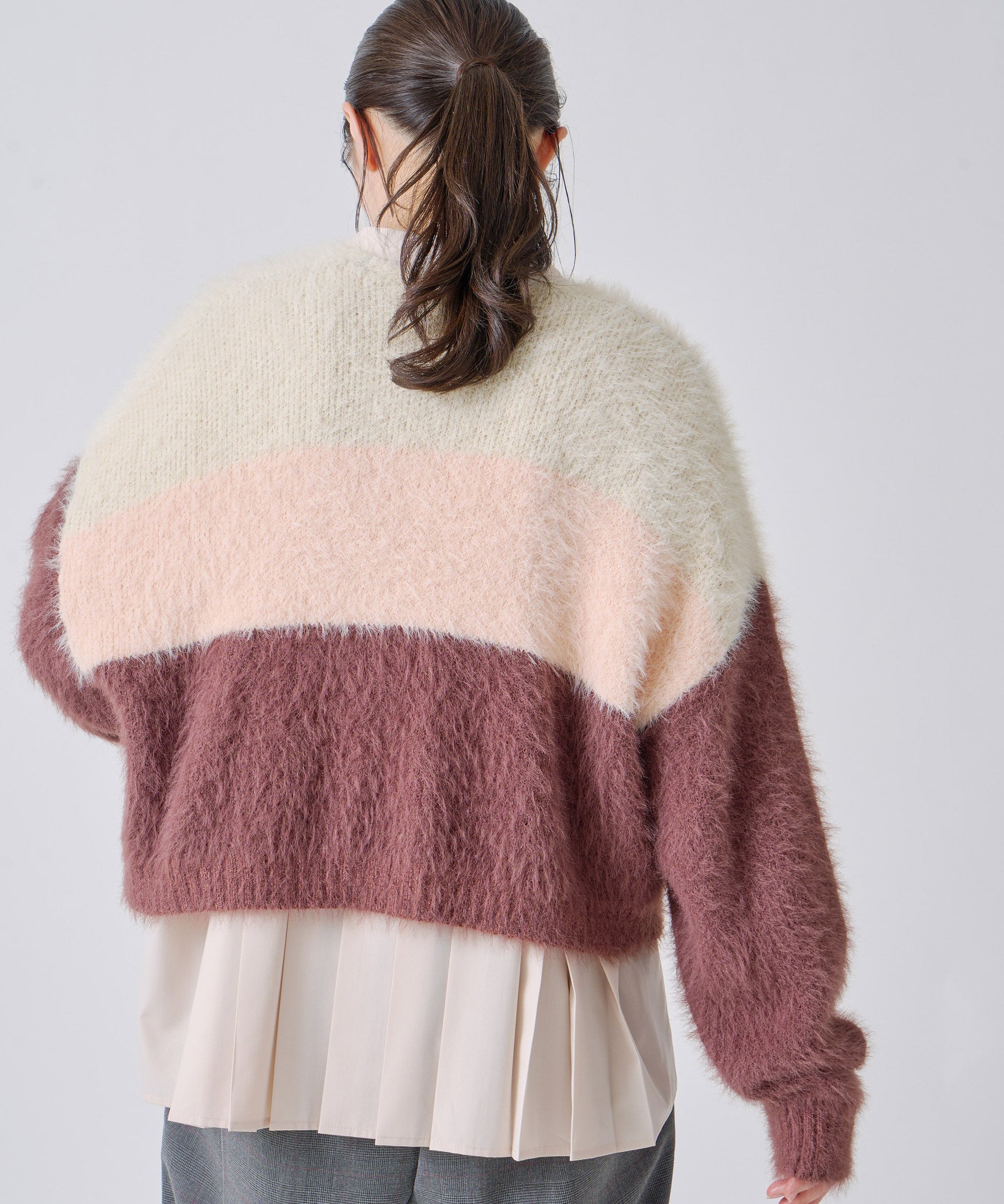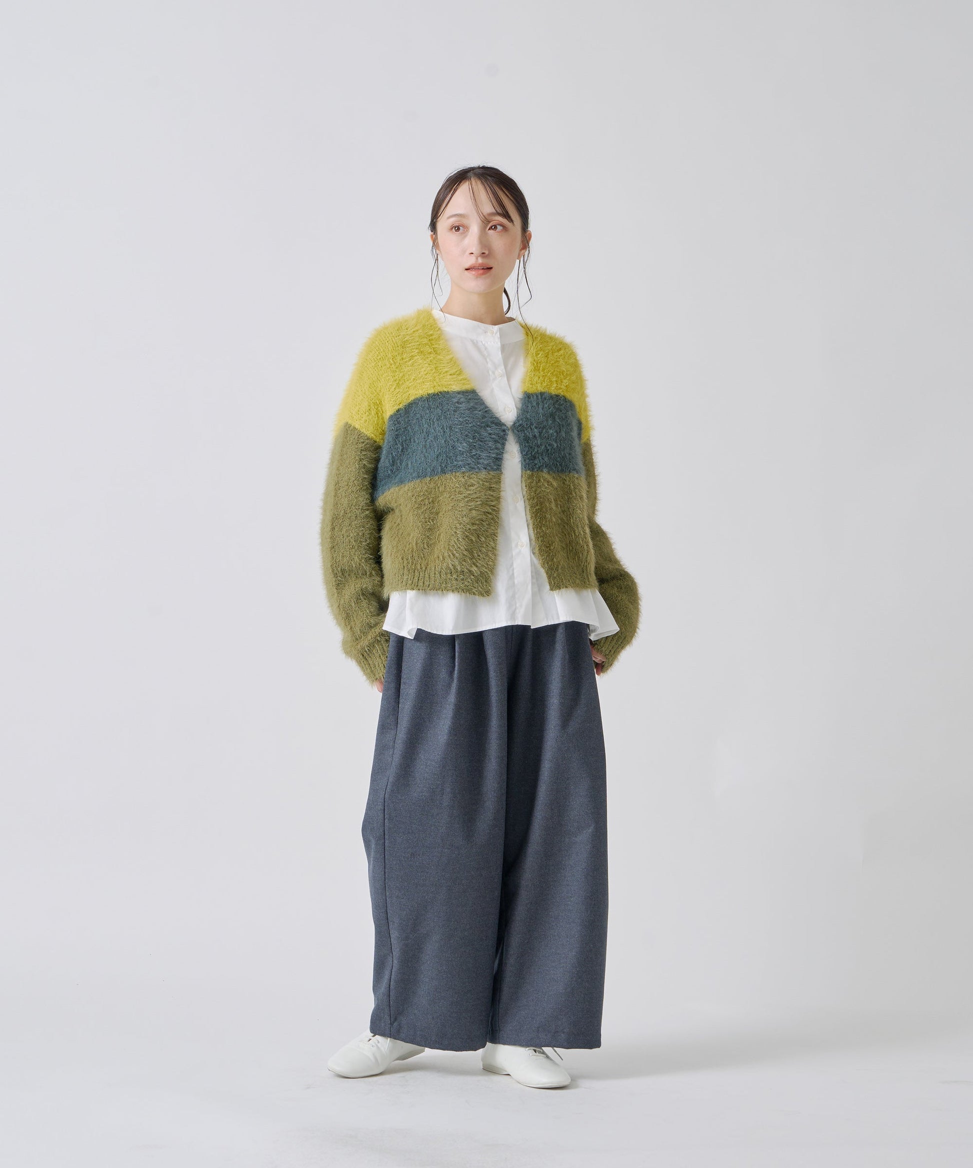 他に見ないカラーブロックは個性的でいながらスタイリングに取り入れやすいようシャギーでカラーの境界を馴染ませグラデーションのようにしたのがポイント。