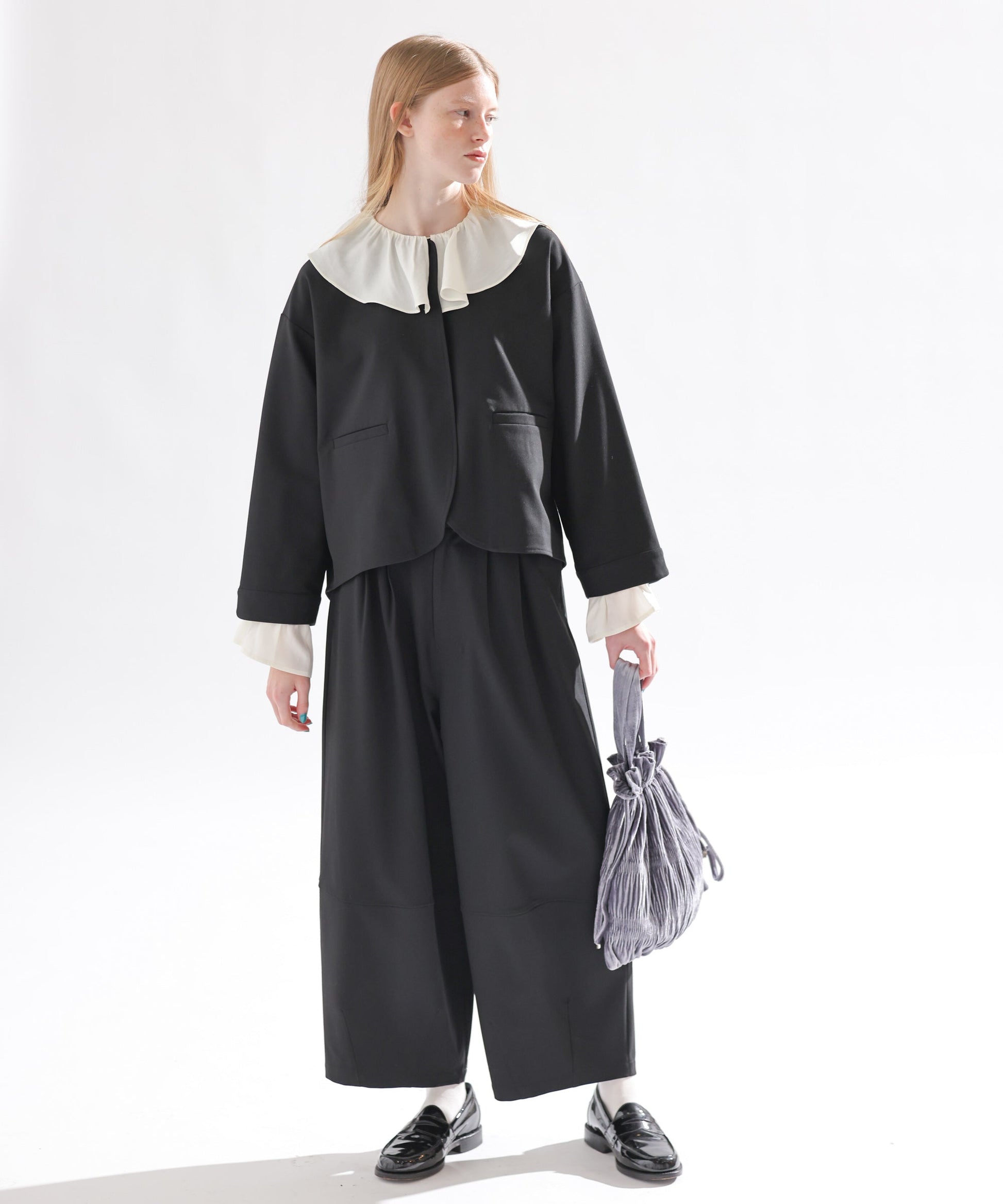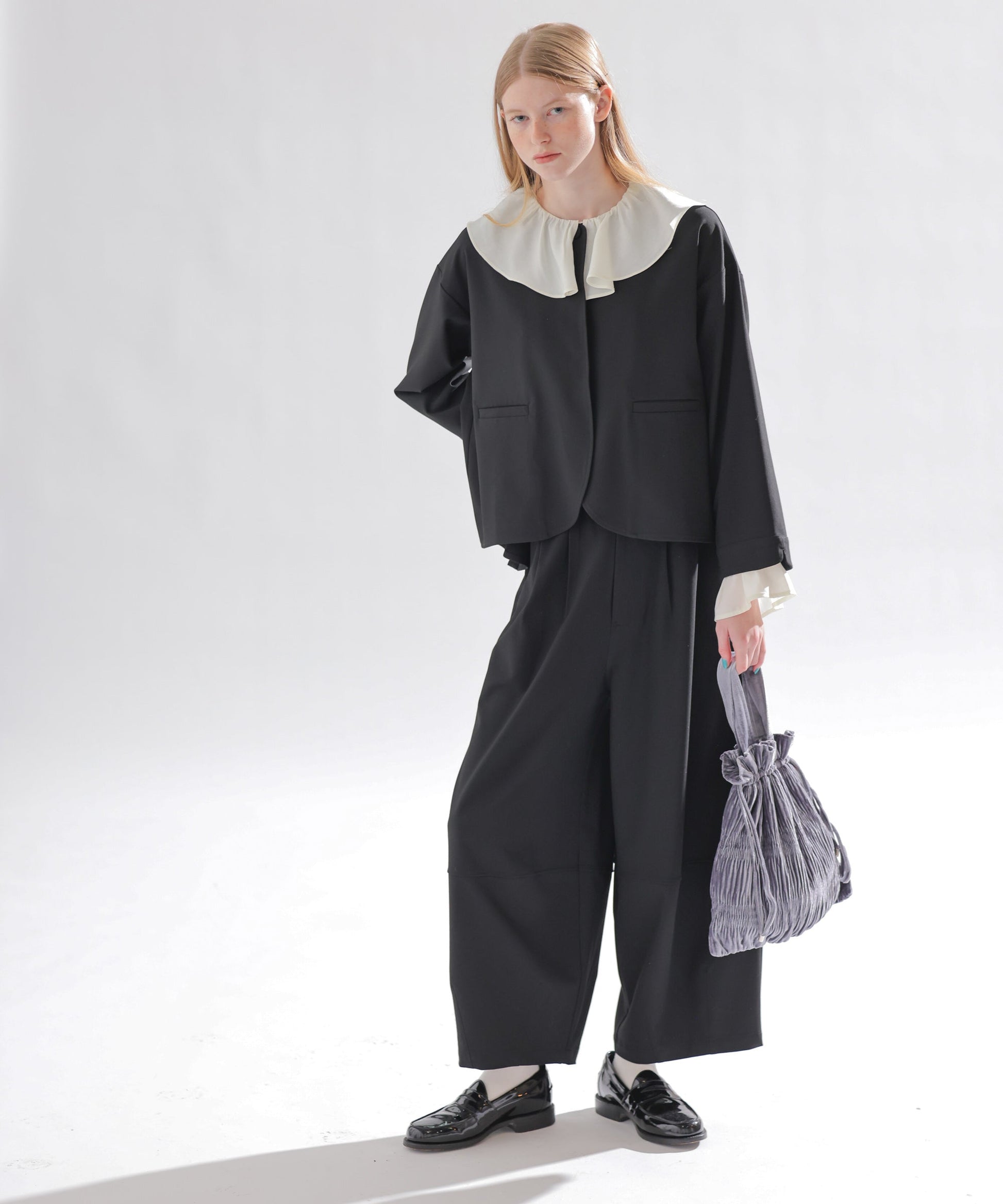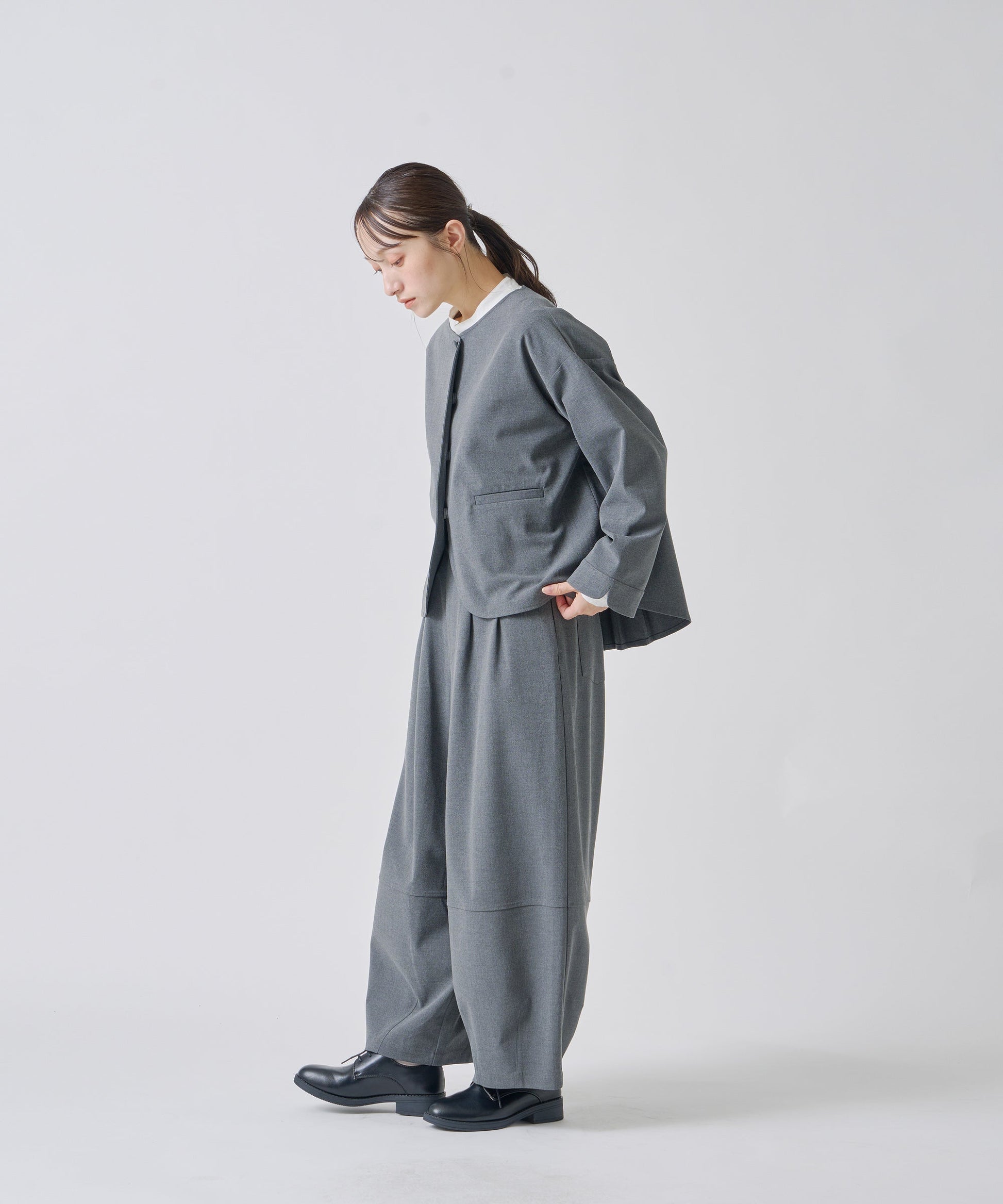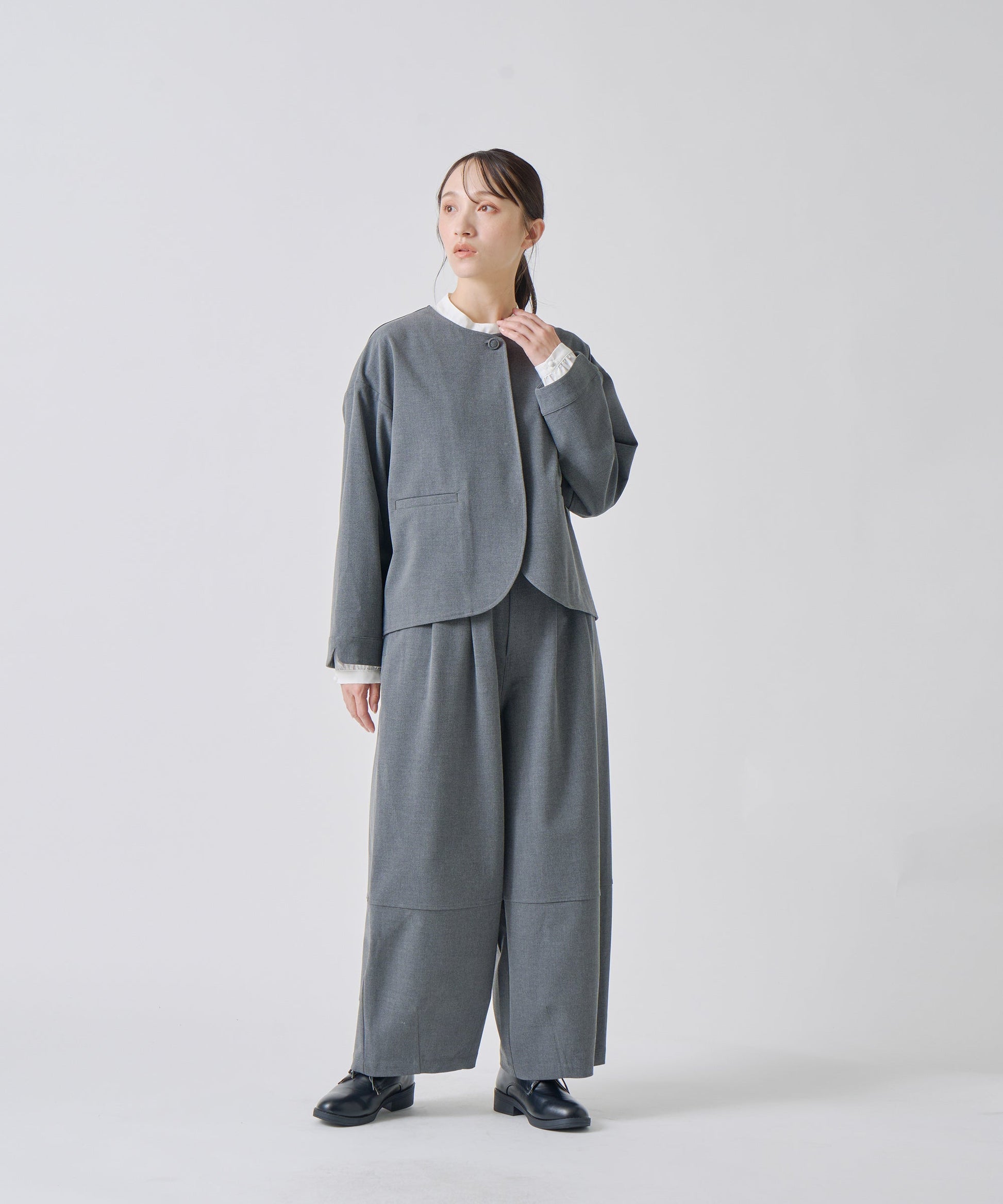 同素材のジャケットとセットアップでオお出かけシーンから、カジュアルなスタイリングまで、さまざまな使い方で重宝する1枚です。
