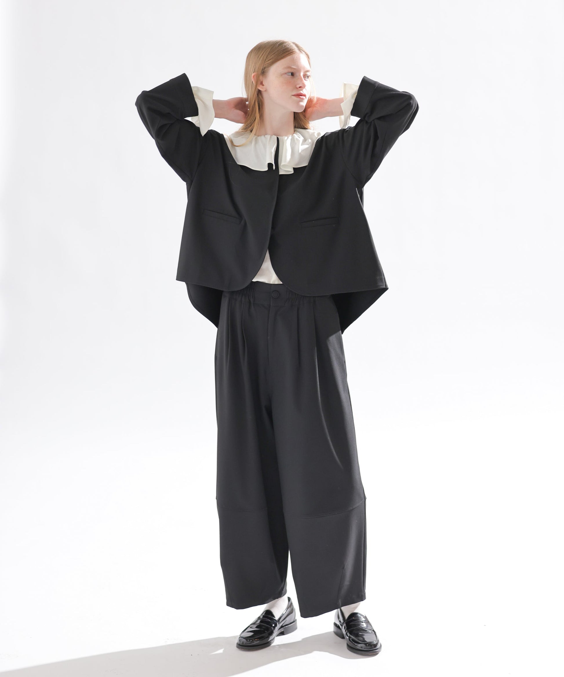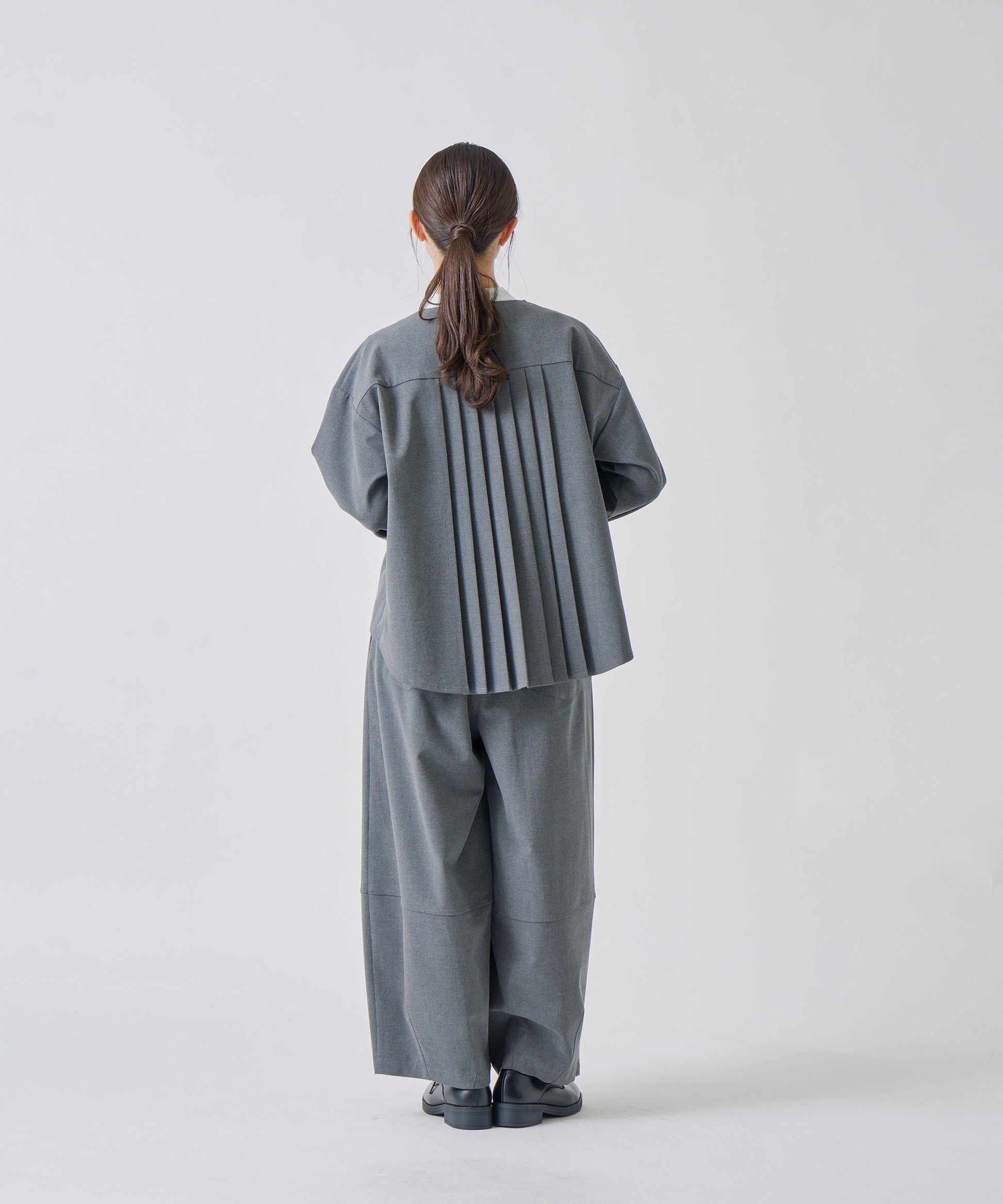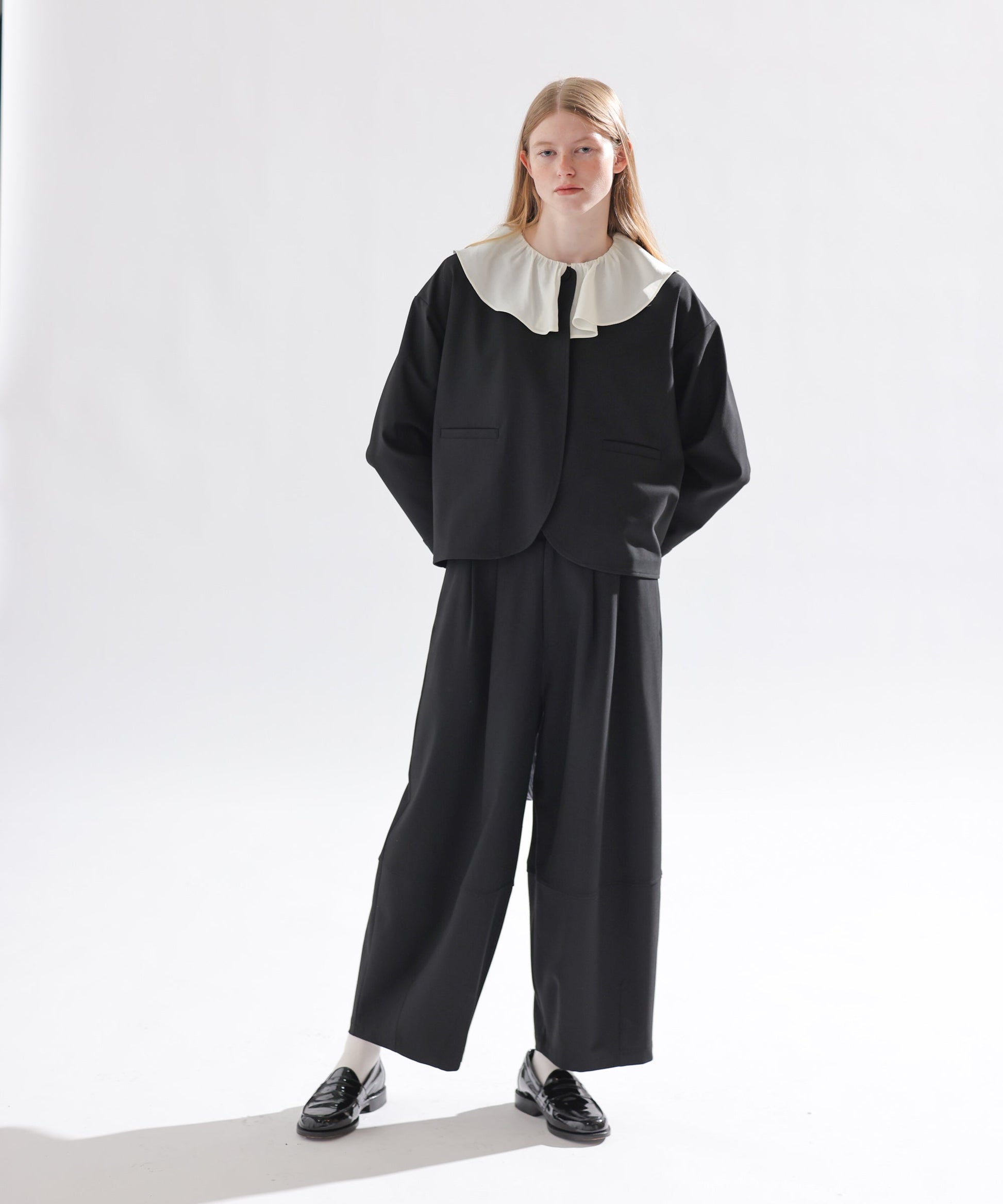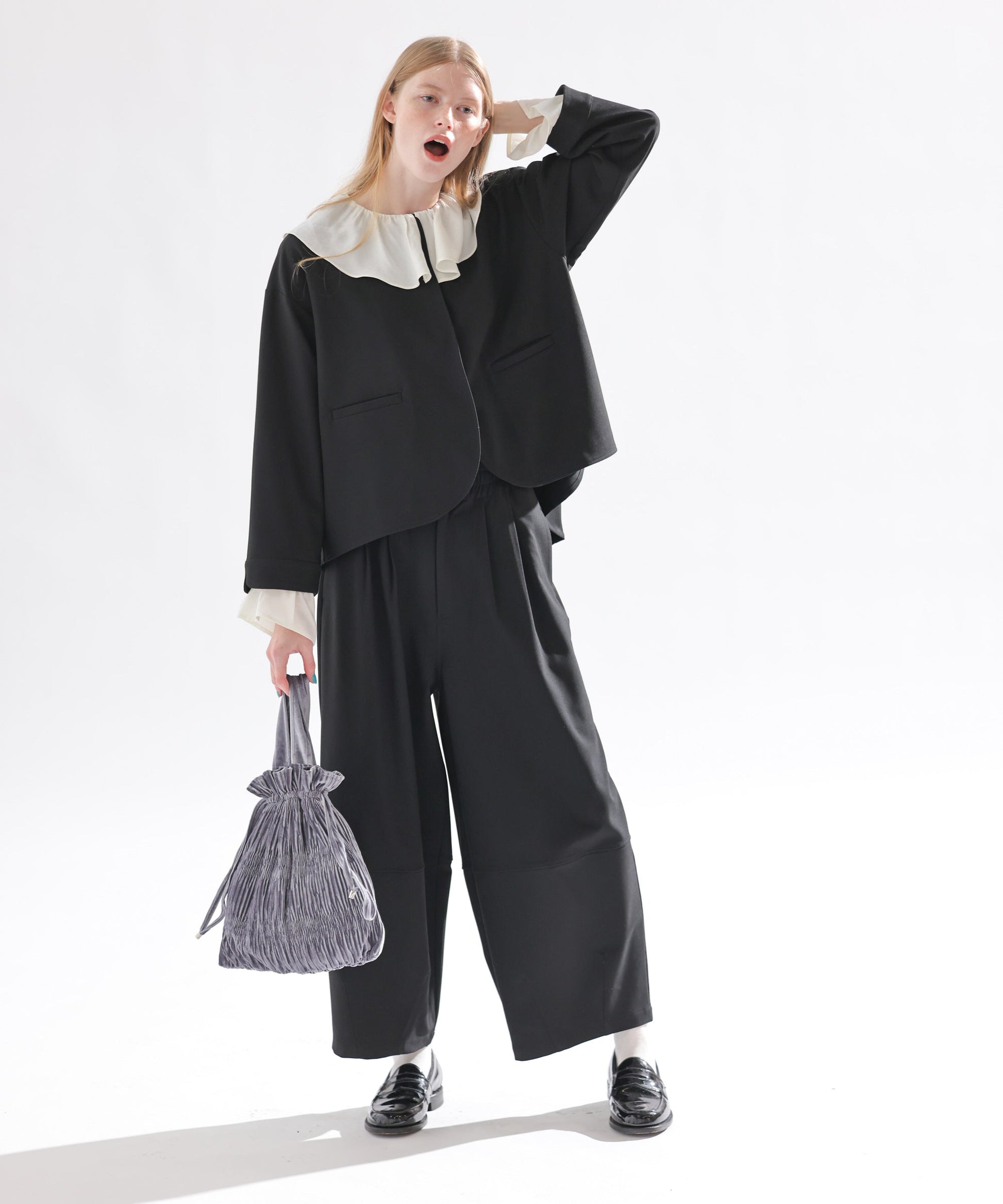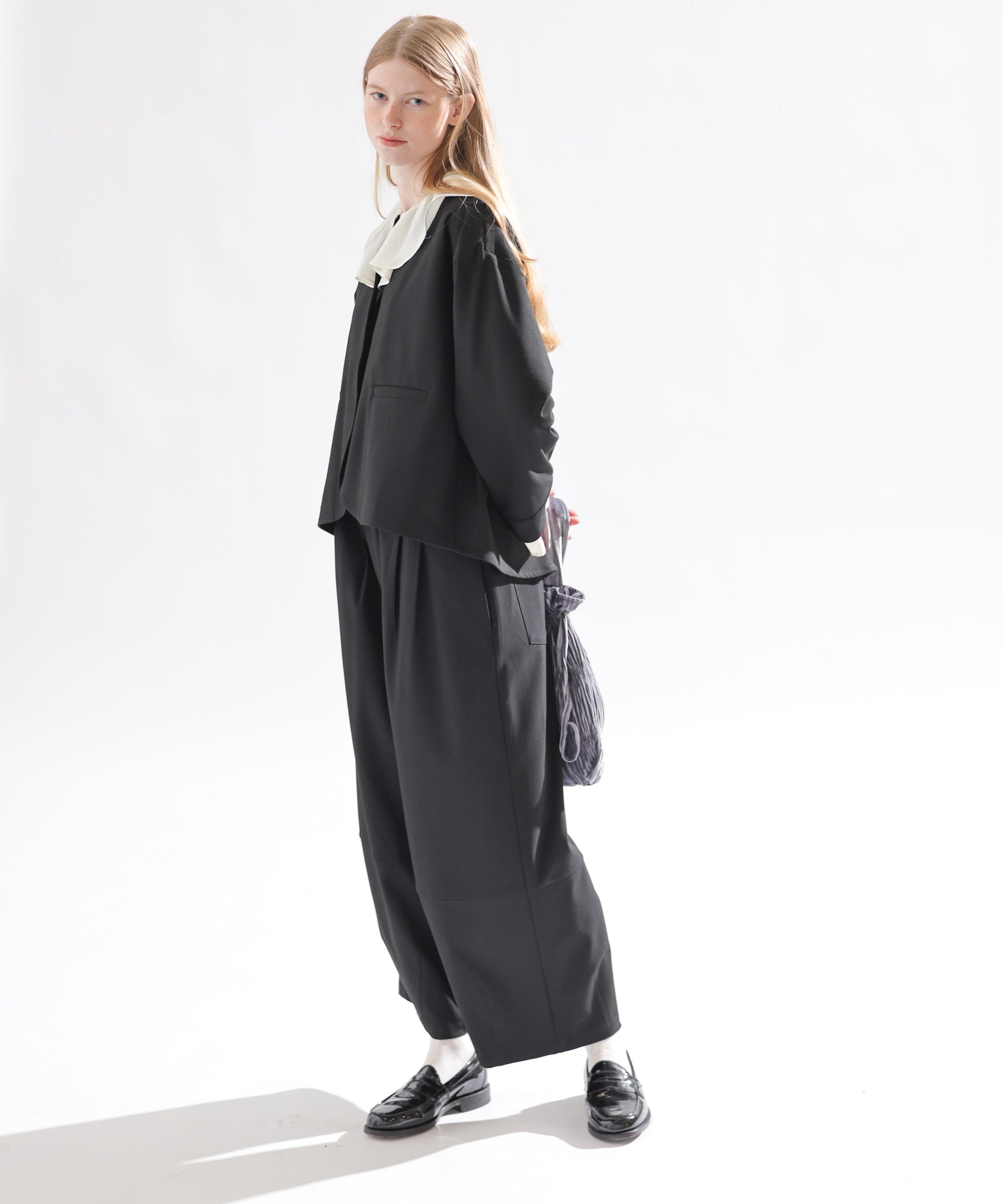 同素材のジャケットとセットアップでオお出かけシーンから、カジュアルなスタイリングまで、さまざまな使い方で重宝する1枚です。