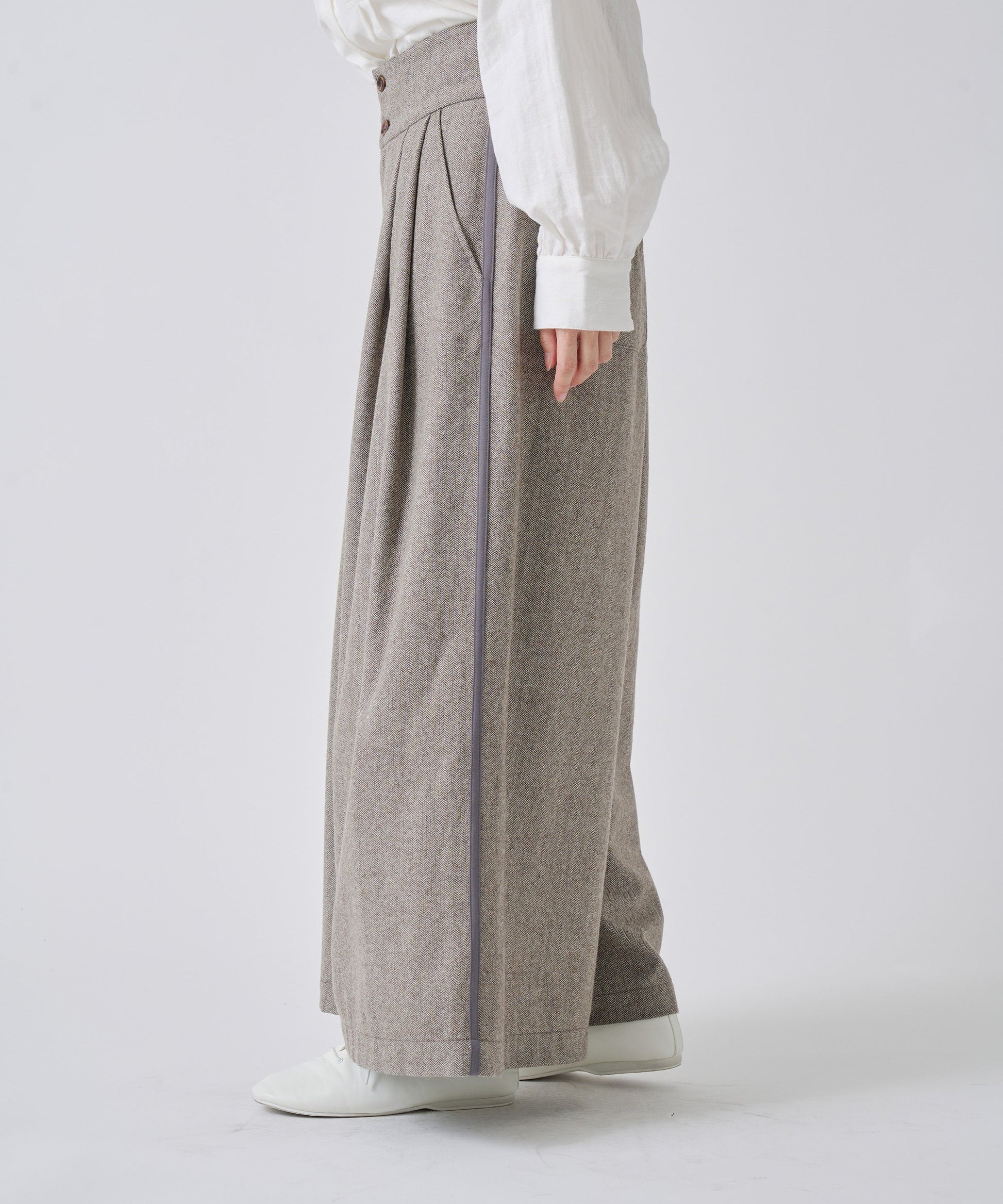 太帯のハイウエストとサイドに微配色のパイピングで脚長効果のあるデザイン。