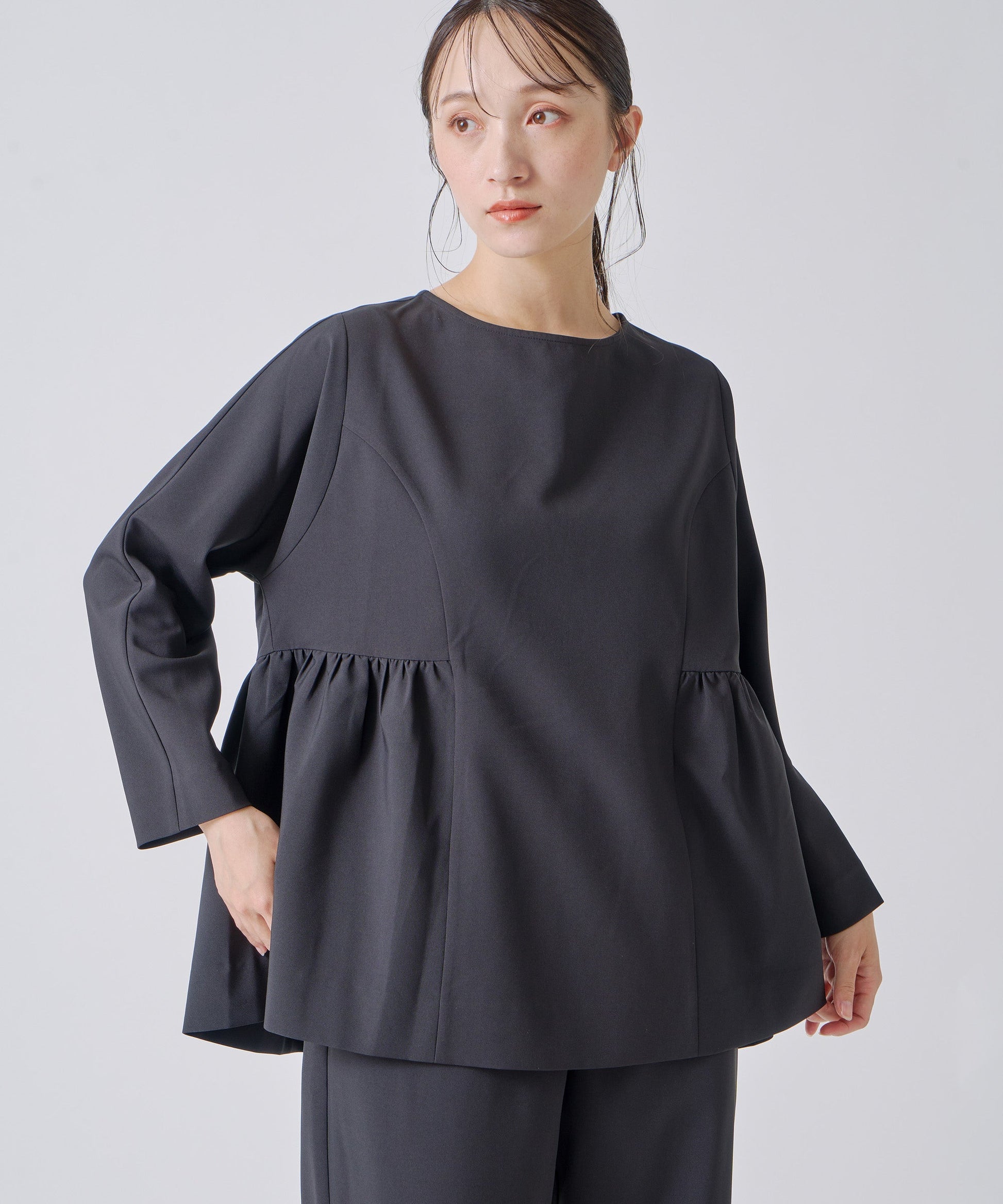 クルーネックでシンプルな上品さと、腰からギャザーを施すことで、女性らしさを兼ね備えた1枚。