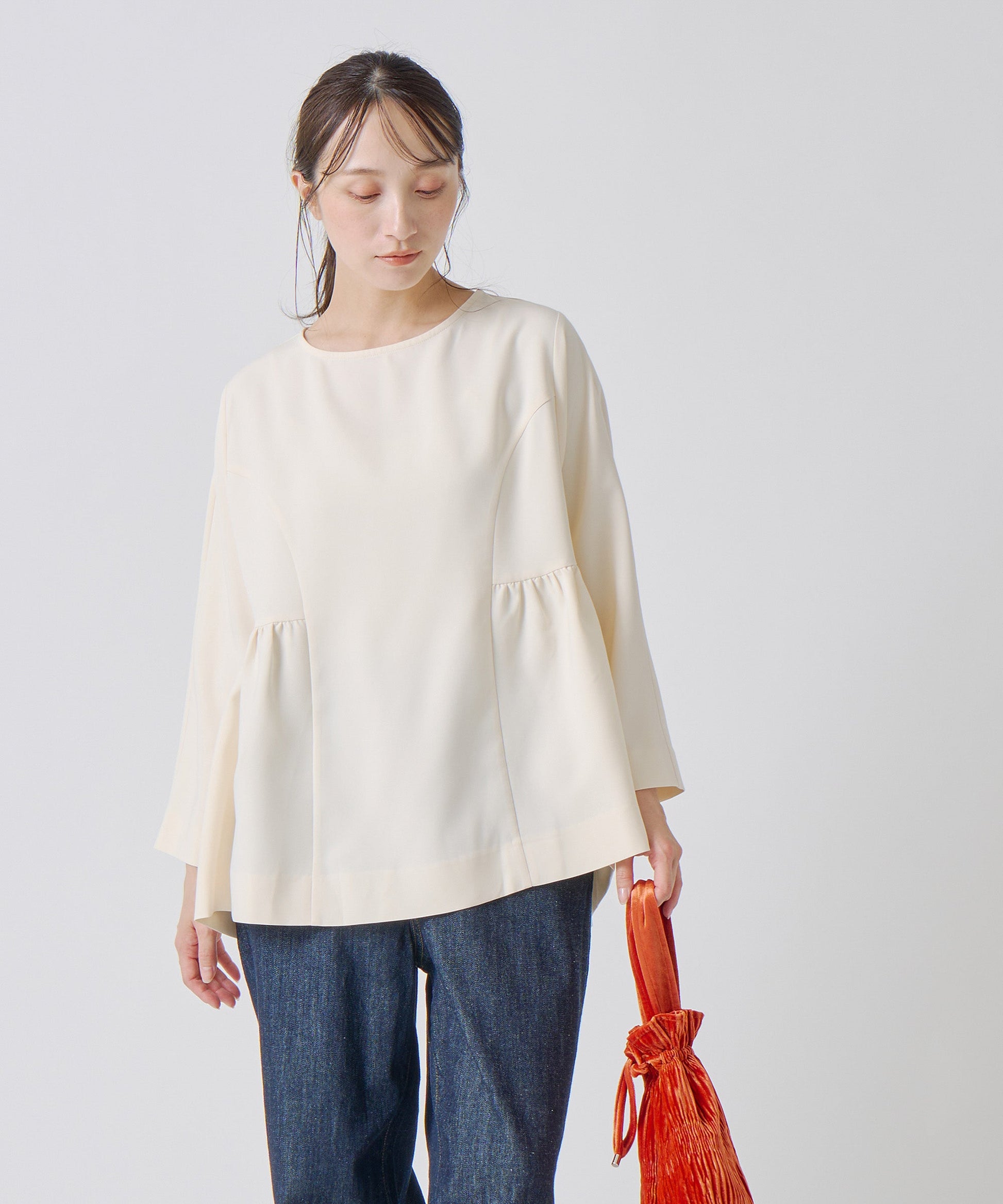 クルーネックでシンプルな上品さと、腰からギャザーを施すことで、女性らしさを兼ね備えた1枚。