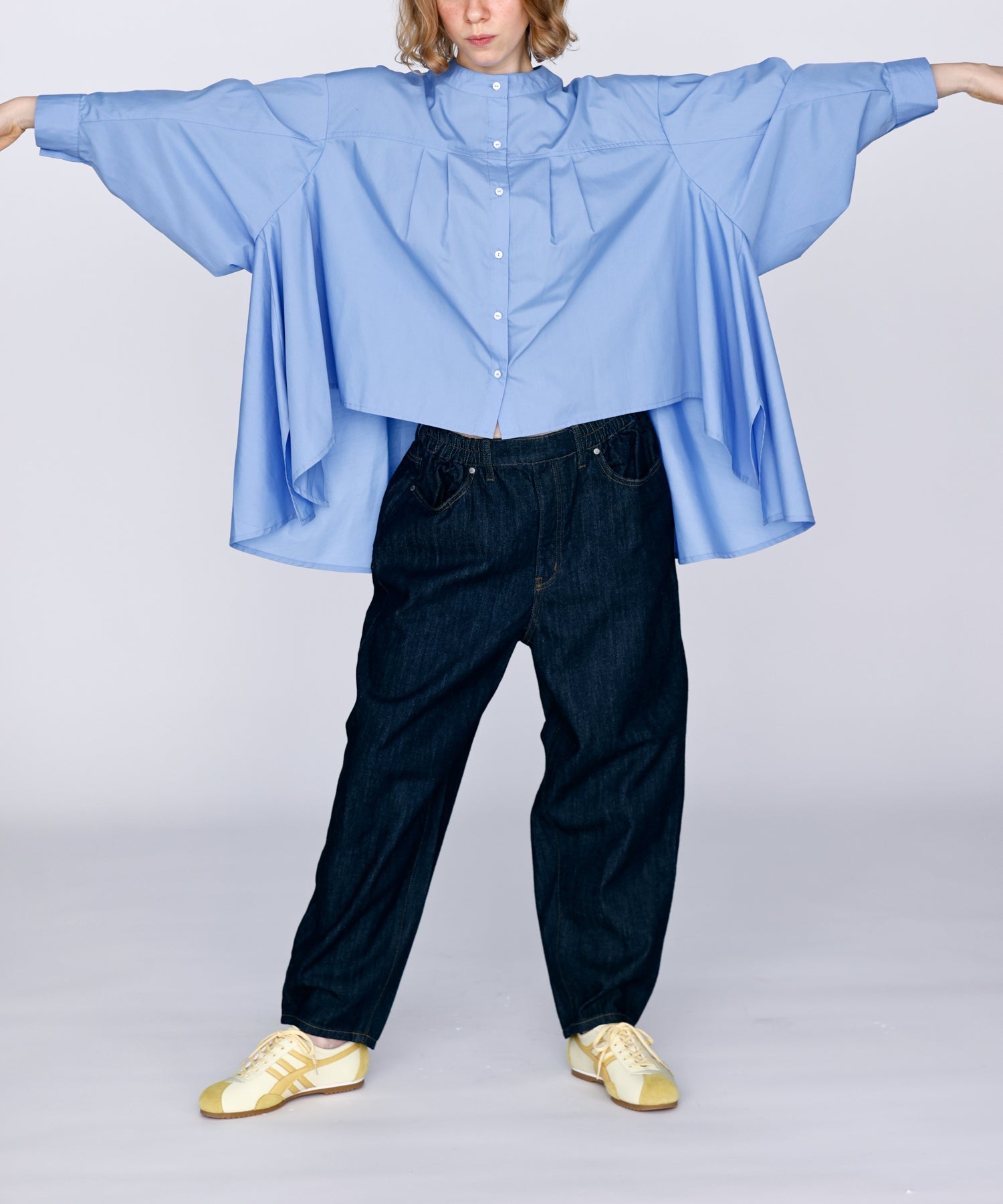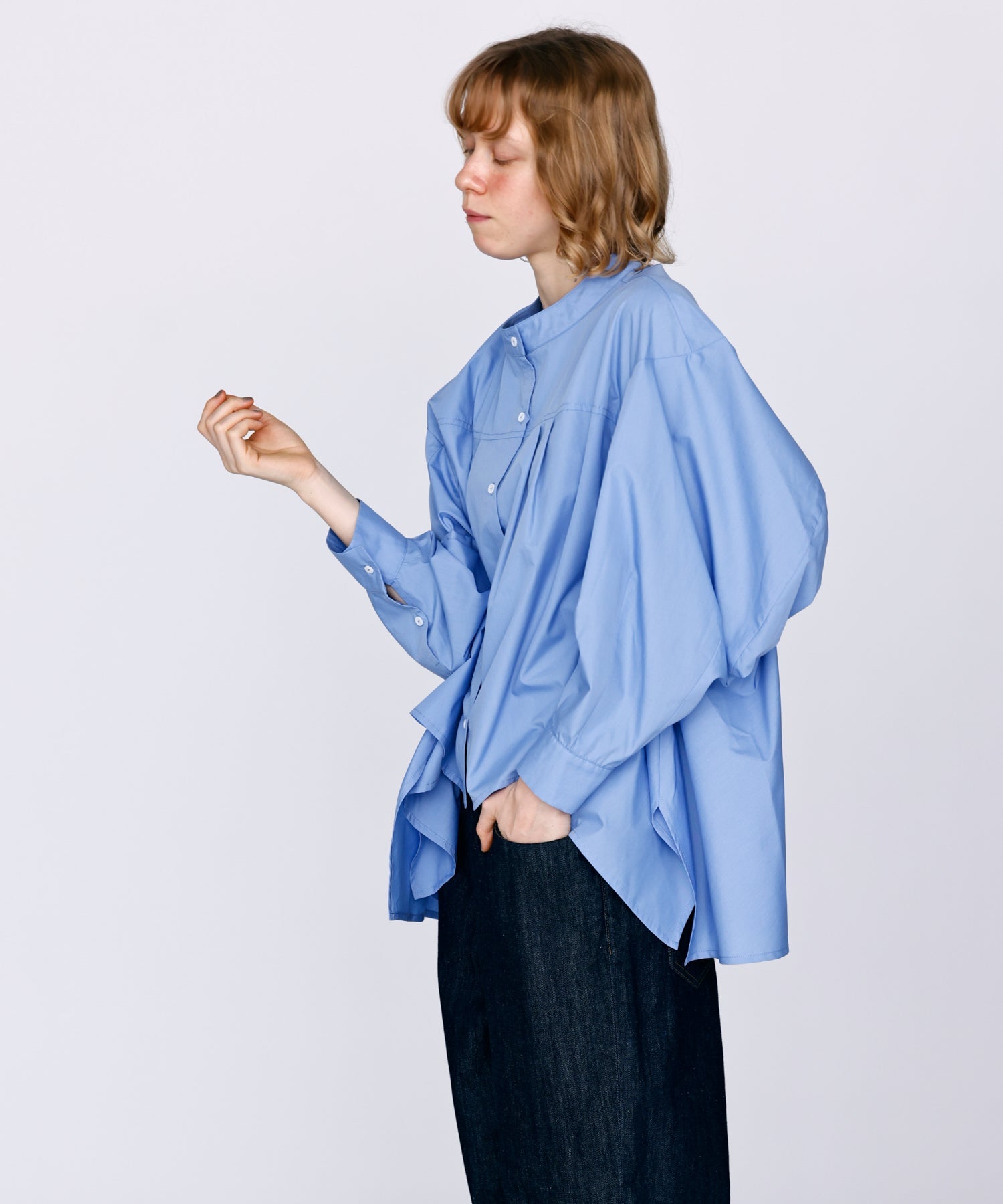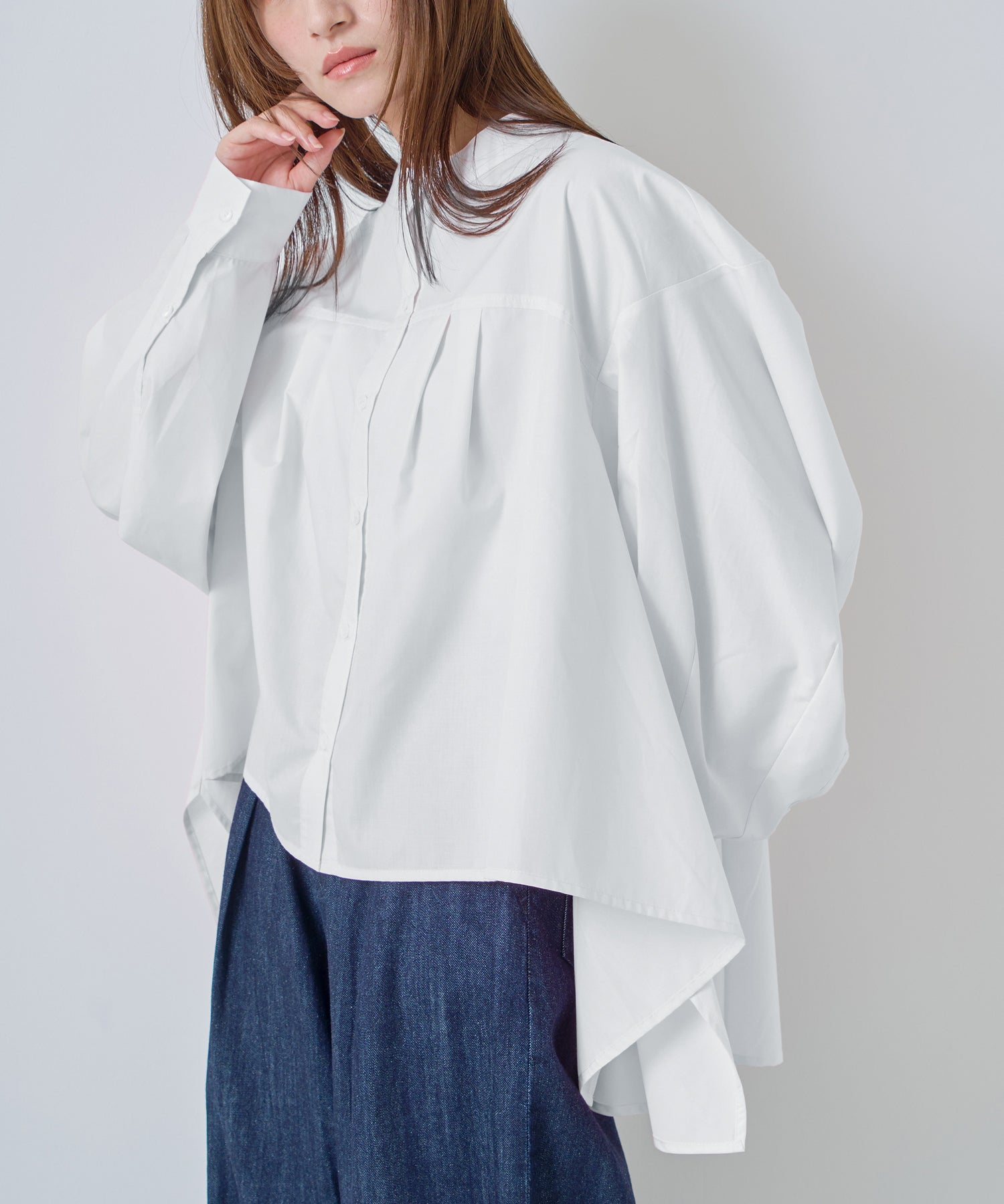 立体的な袖と前後丈感の違うデザインで、裾のドレープシルエットが魅力的な一枚です。