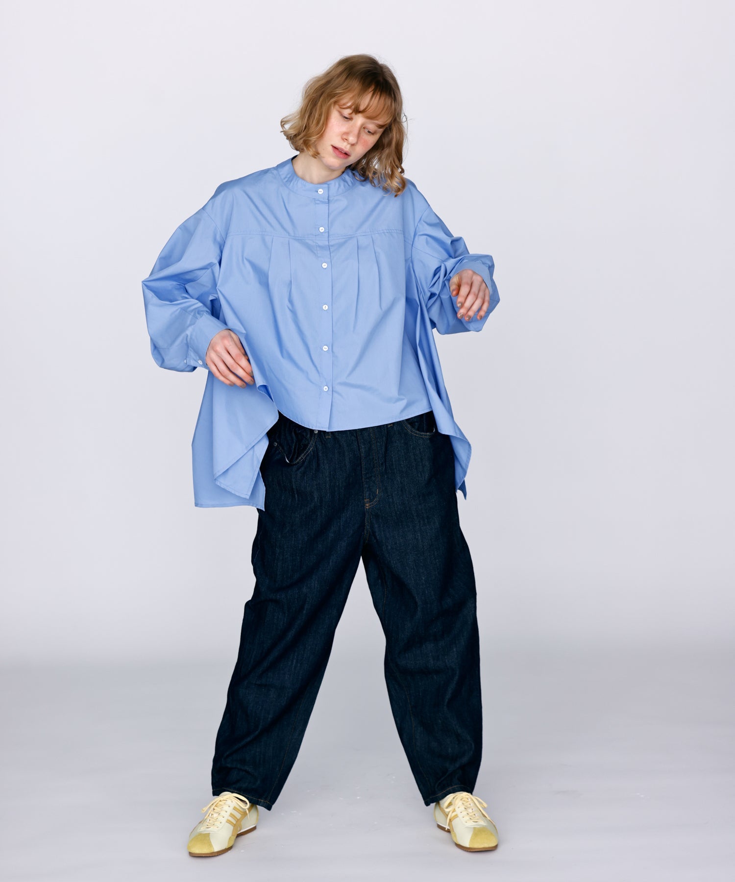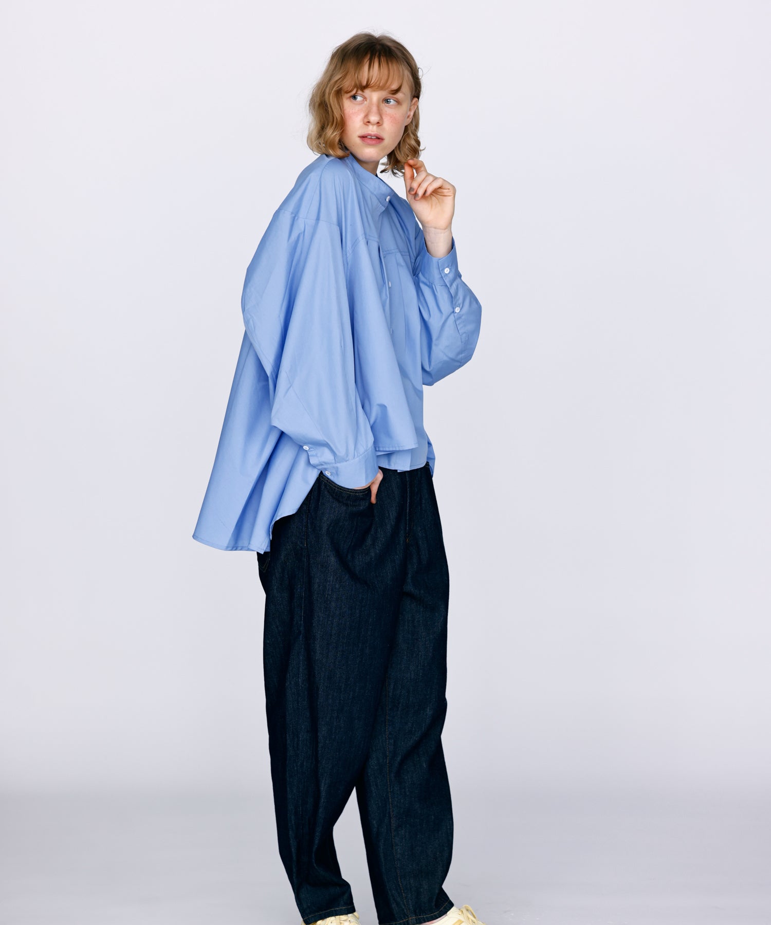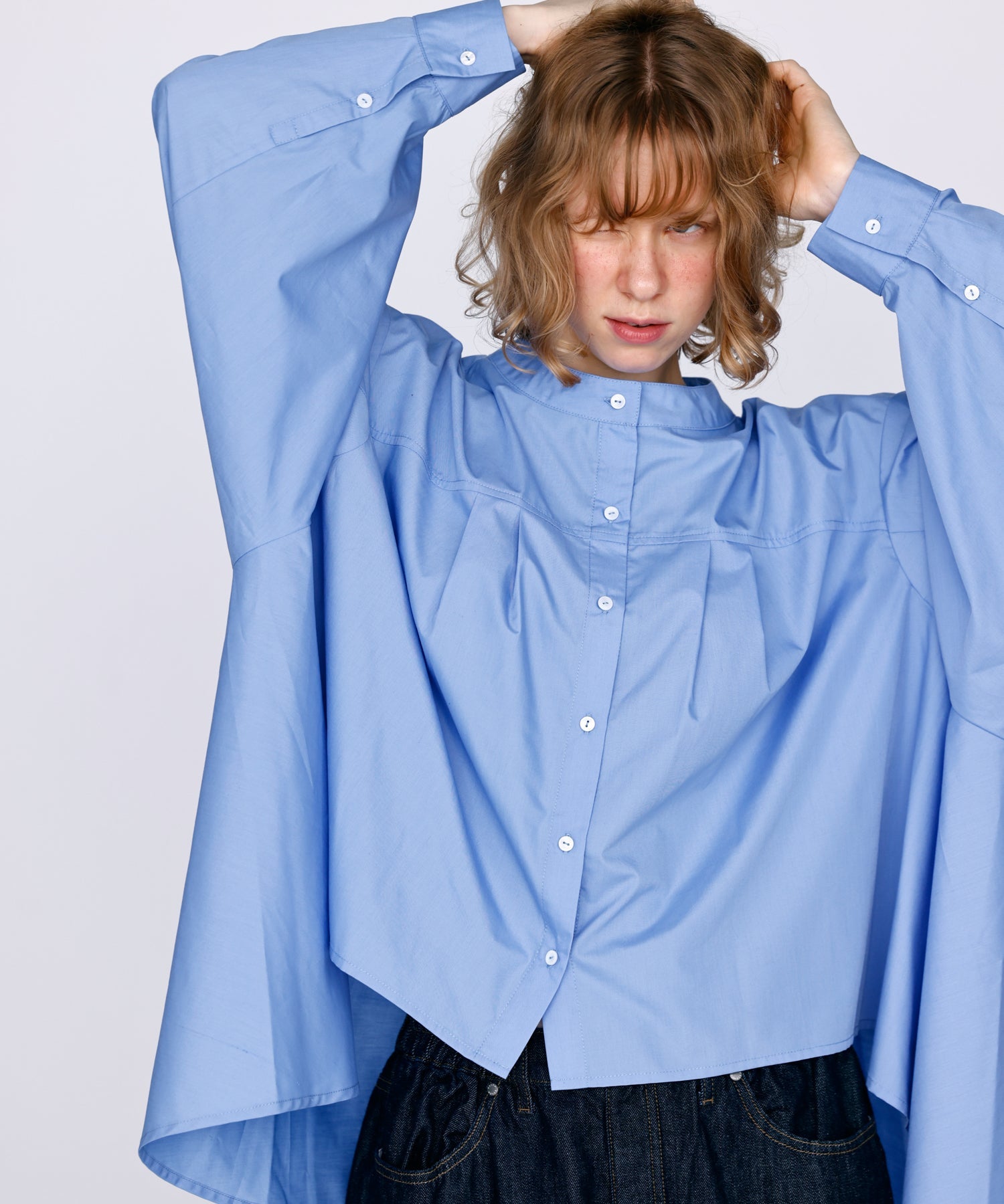 立体的な袖と前後丈感の違うデザインで、裾のドレープシルエットが魅力的な一枚です。