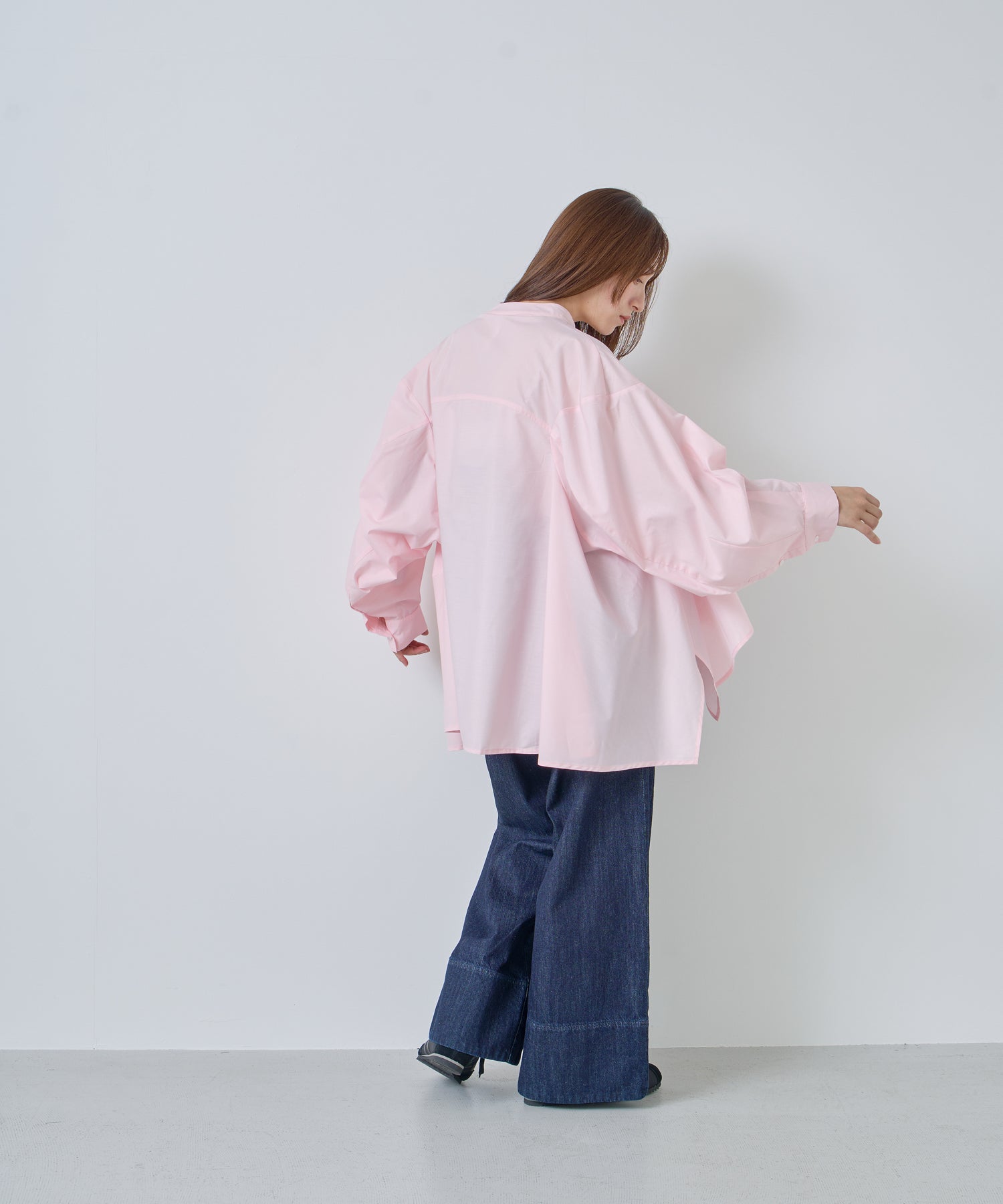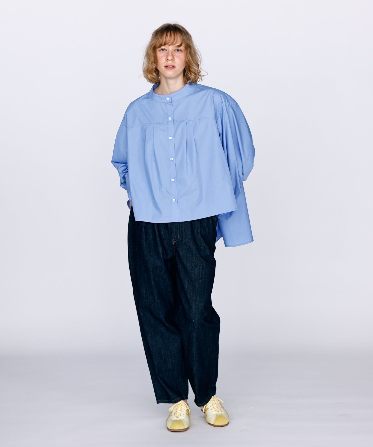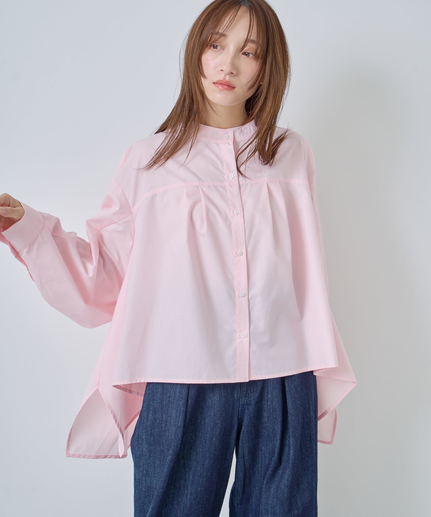衿は程よく高めのスタンドカラーで上品な印象。
