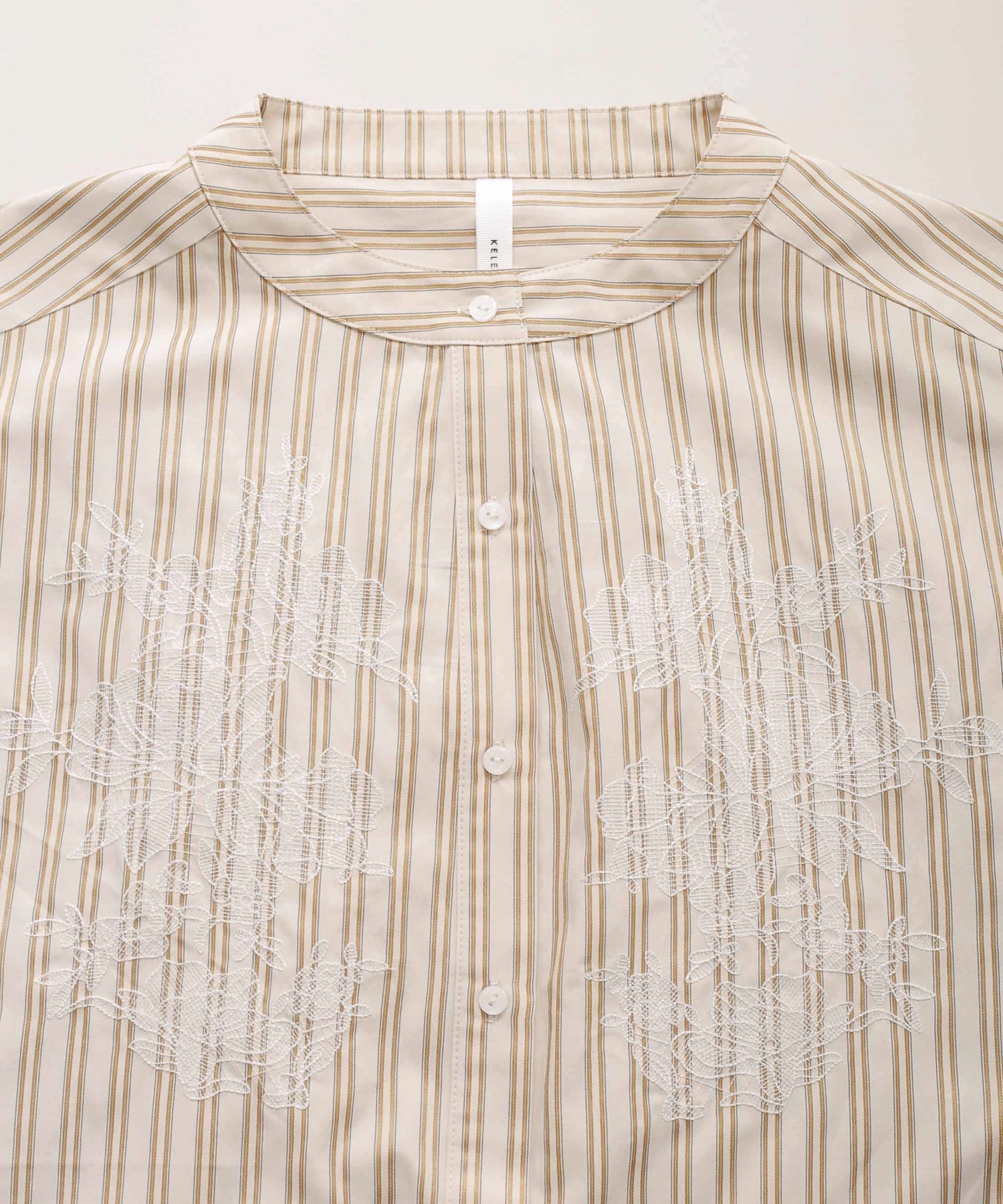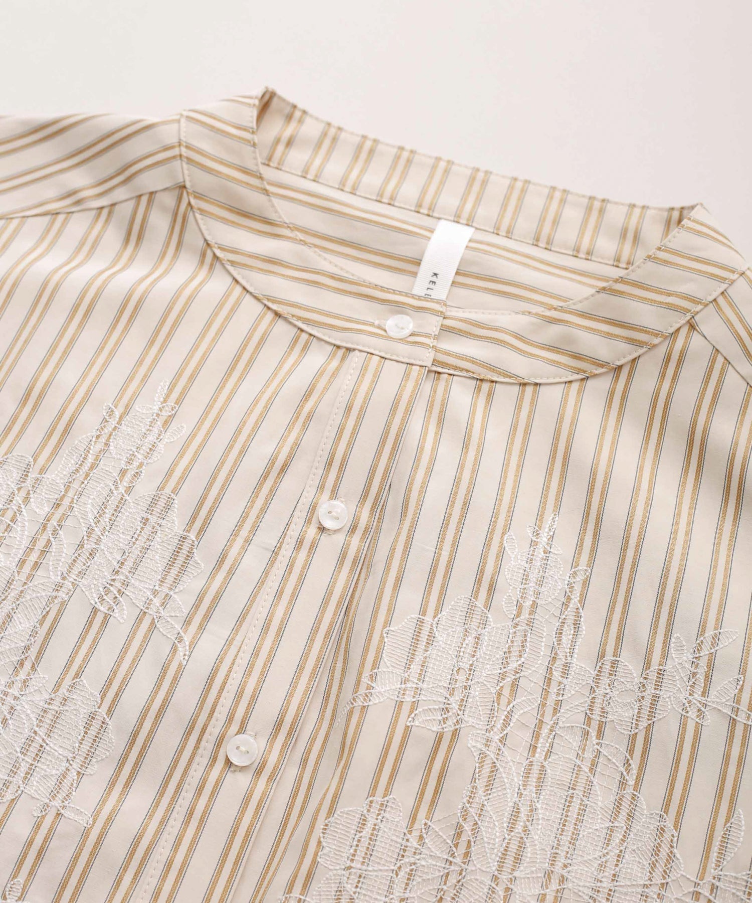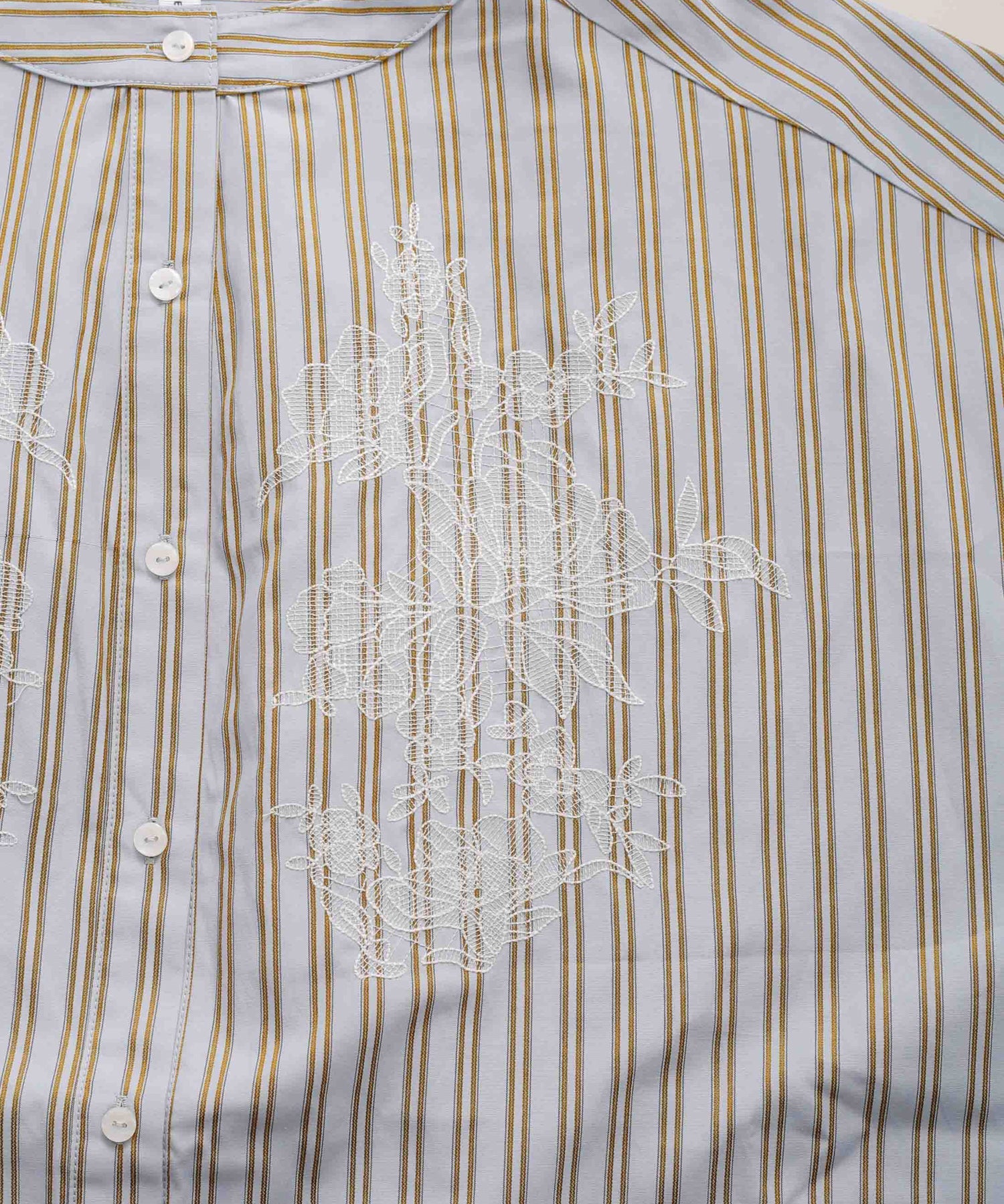 ストライプ素材をベースに、レースのように繊細なフラワーモチーフの刺繍がポイント。