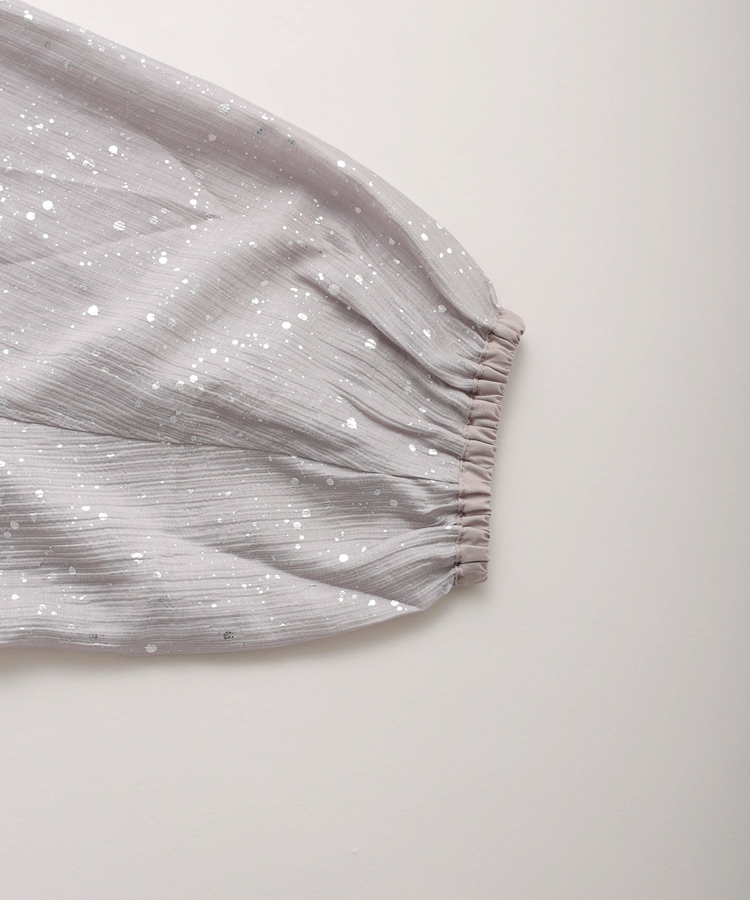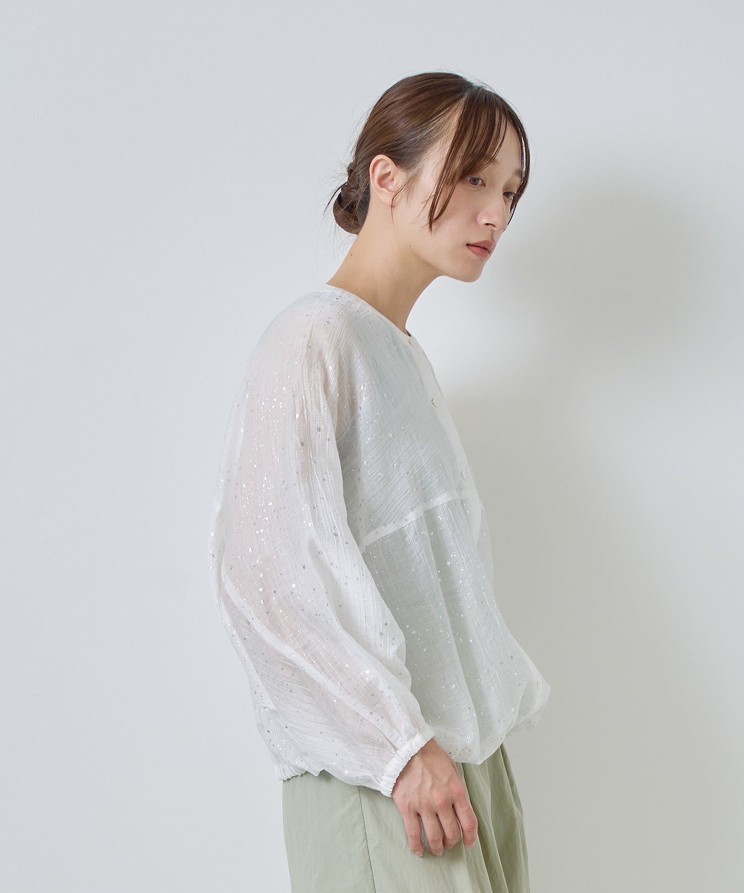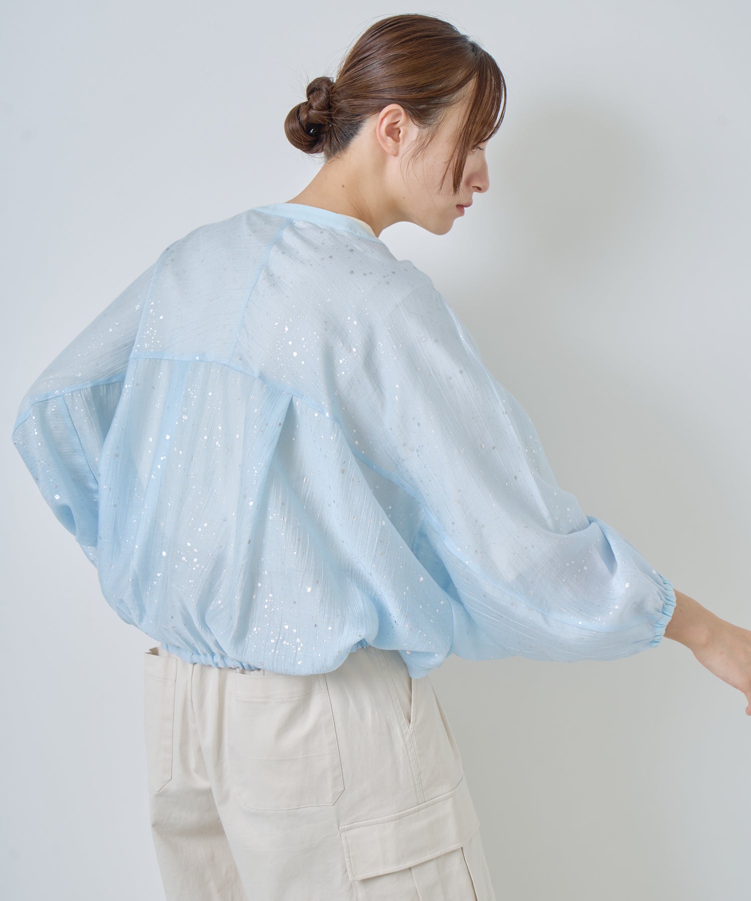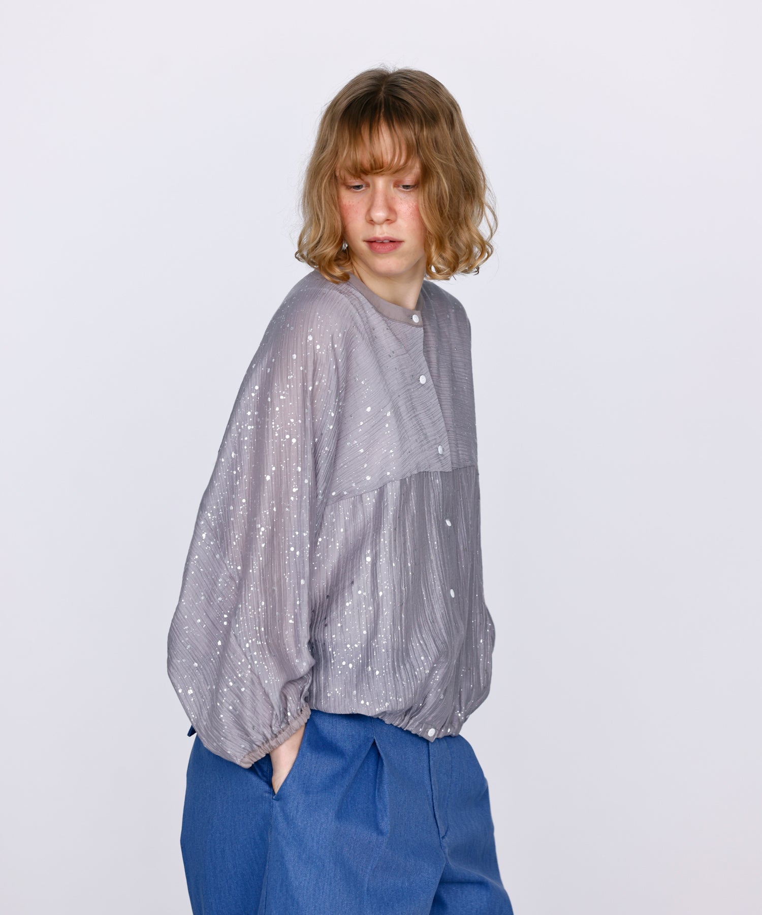 シアー素材をベースに、美しい箔プリントを施した印象的なデザイントップスです。