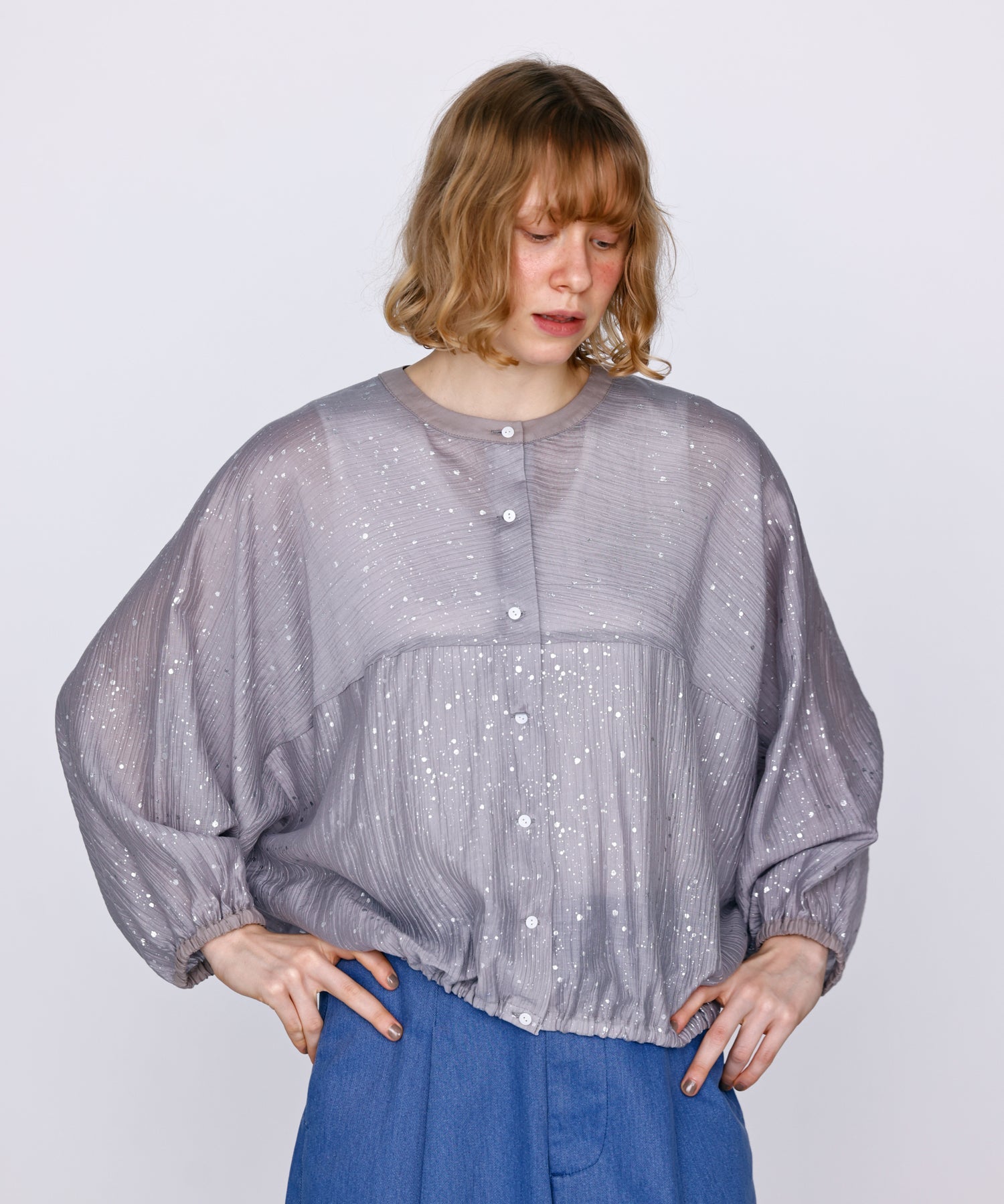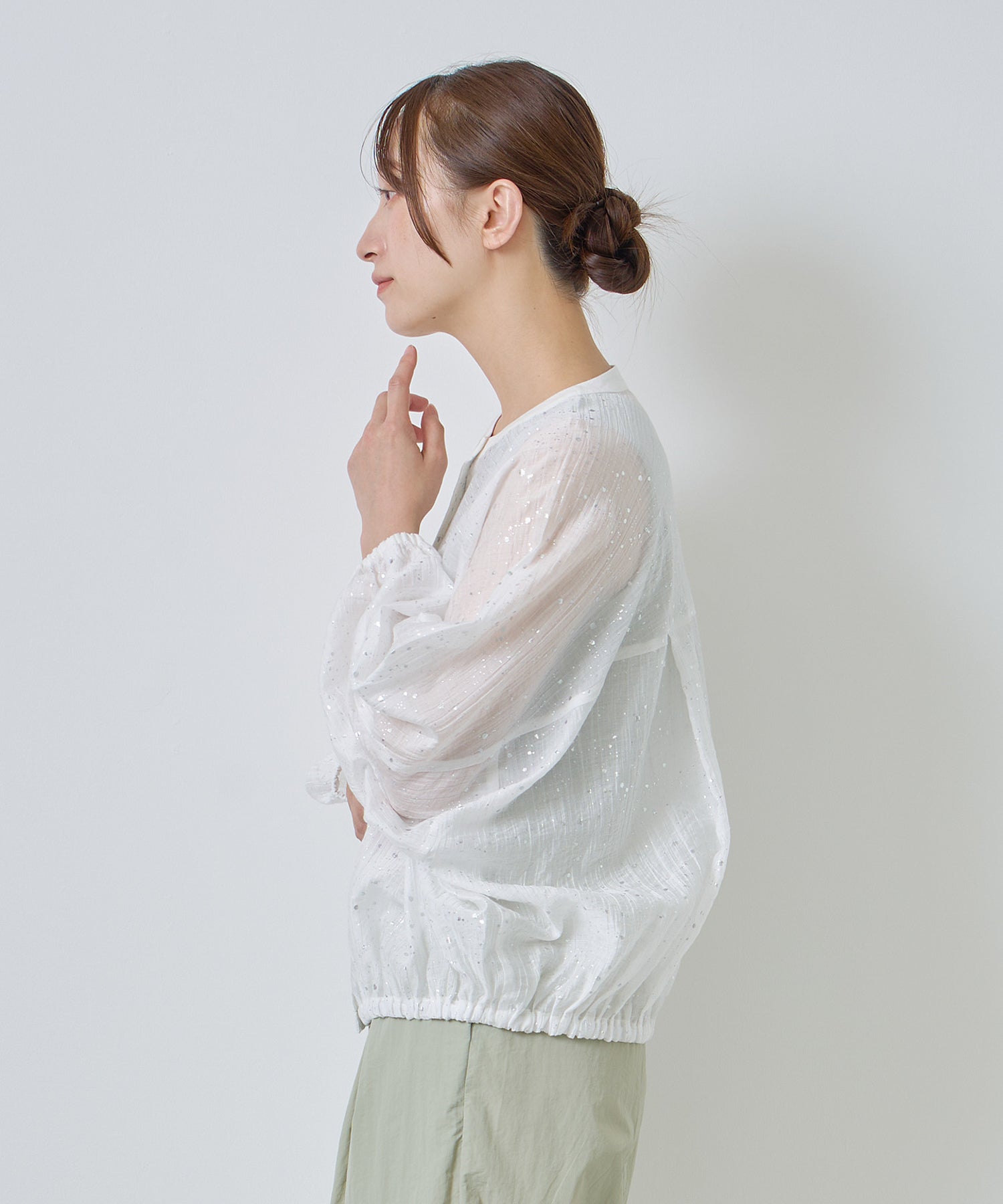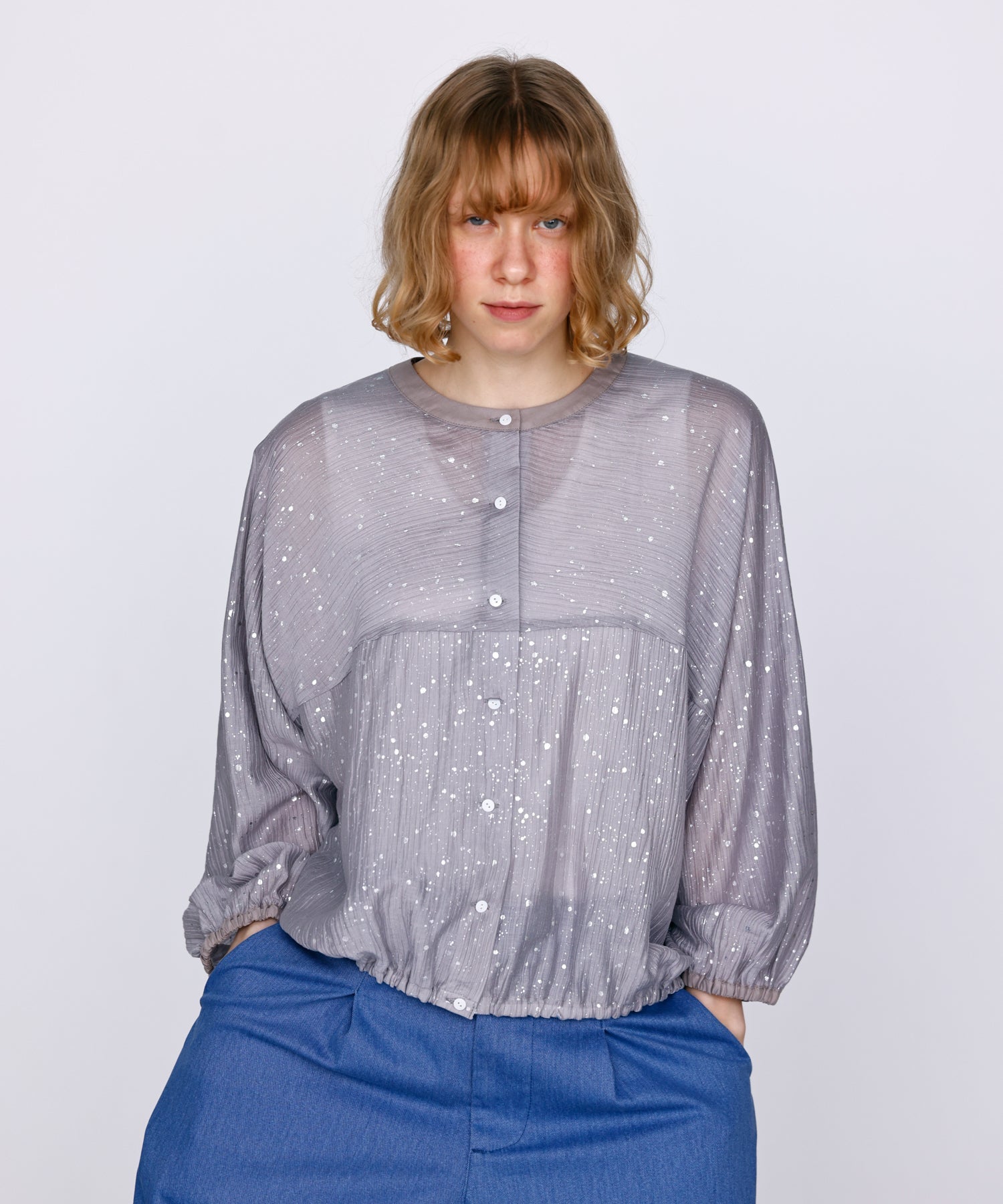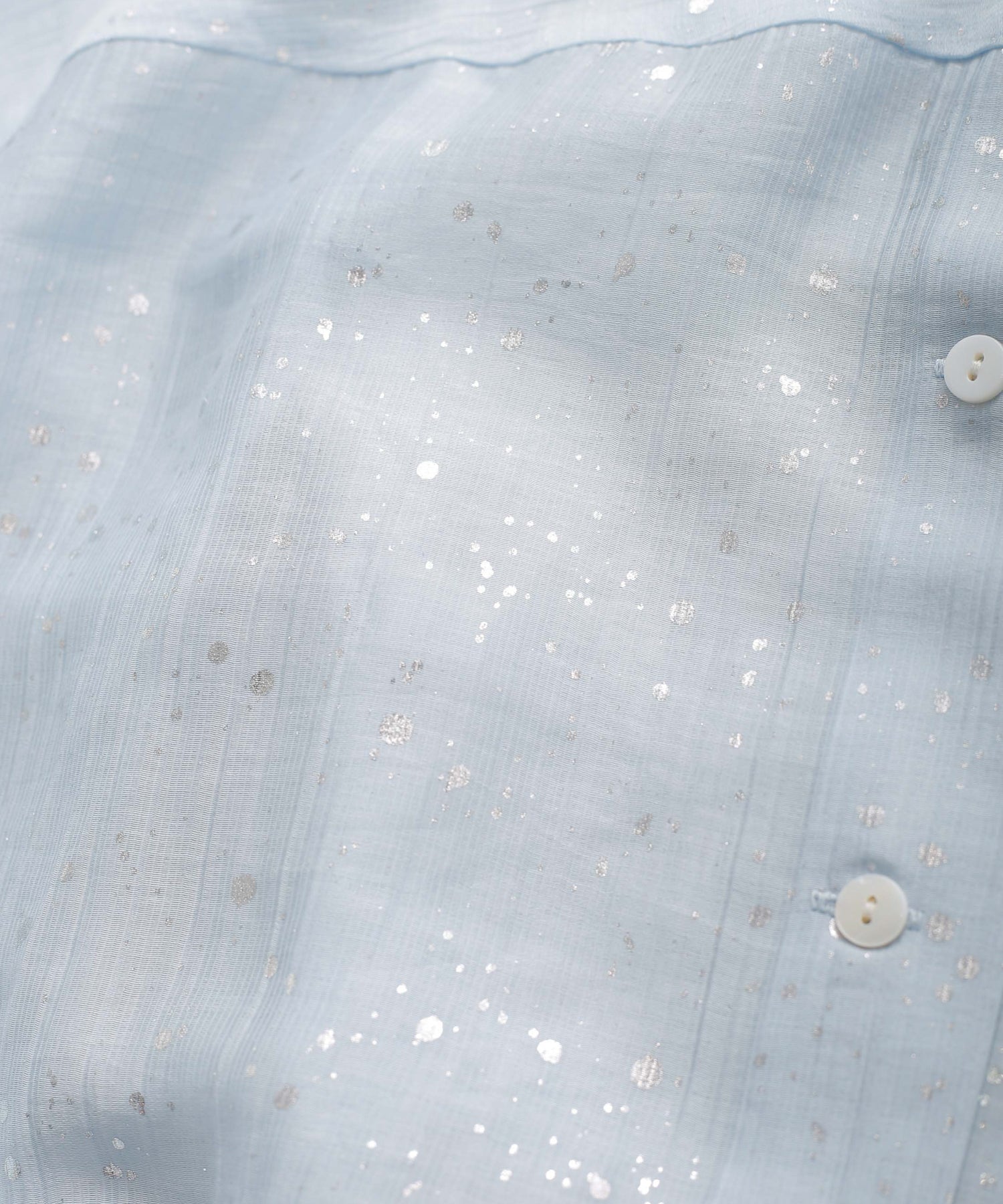 シアー素材をベースに、美しい箔プリントを施した印象的なデザイントップスです。