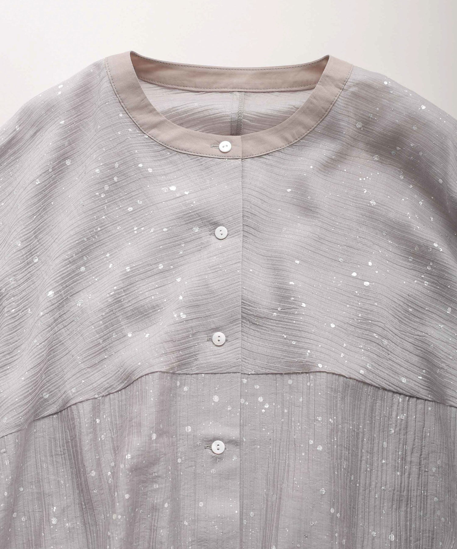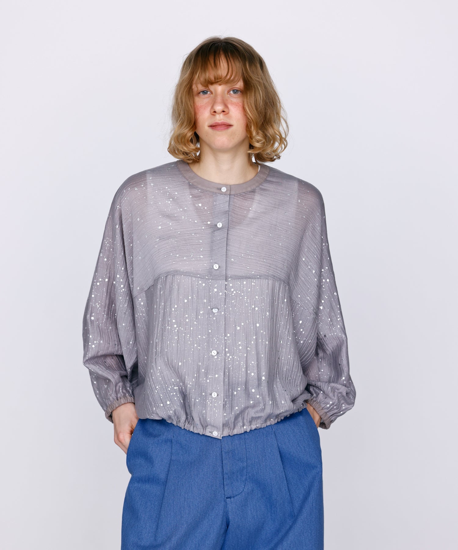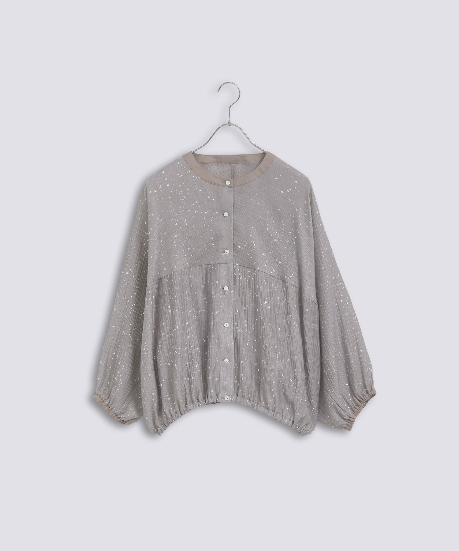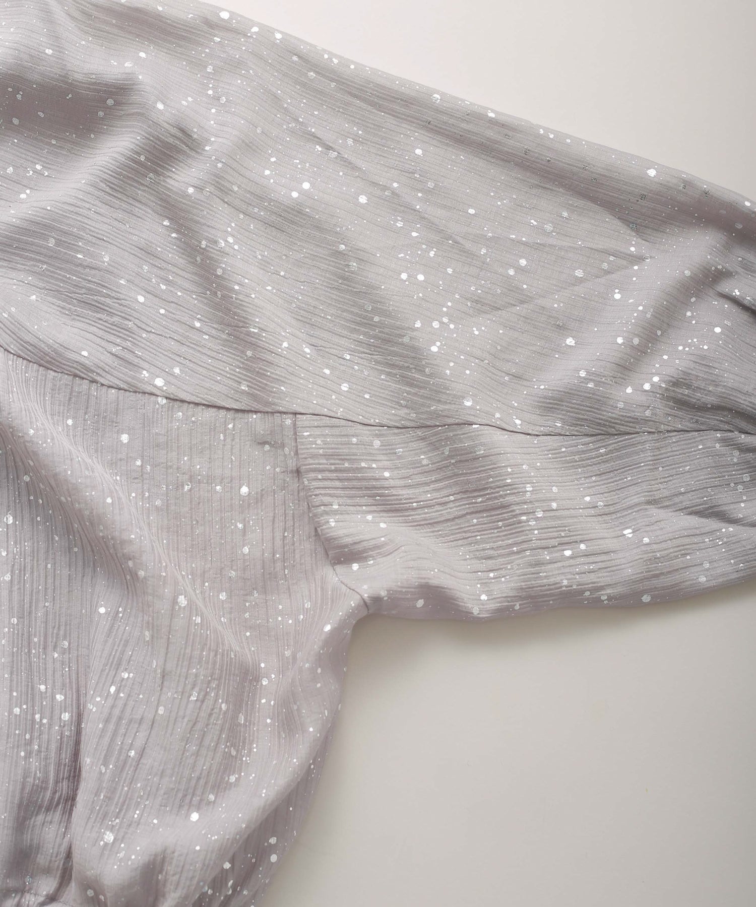 シアー素材をベースに、美しい箔プリントを施した印象的なデザイントップスです。
