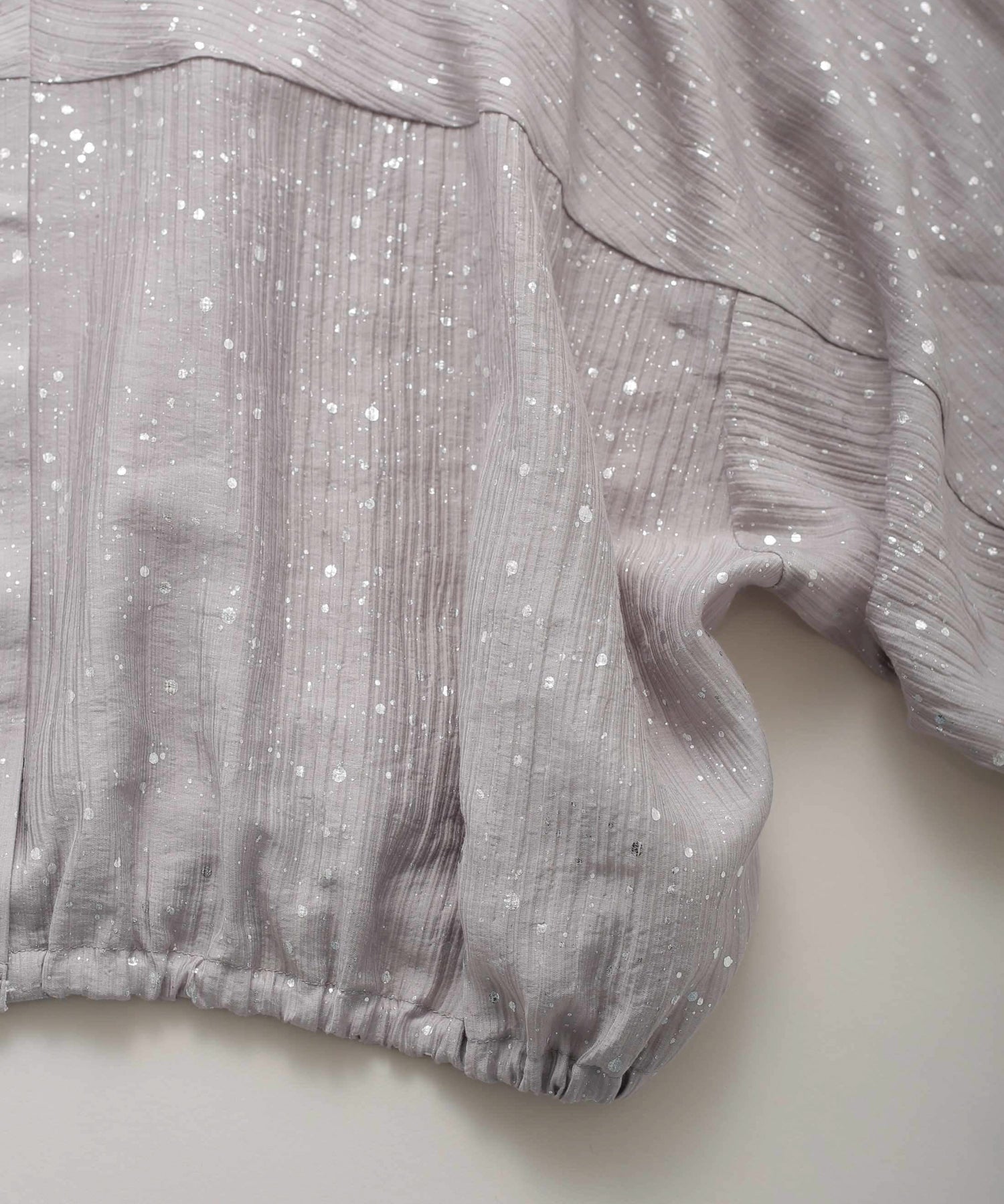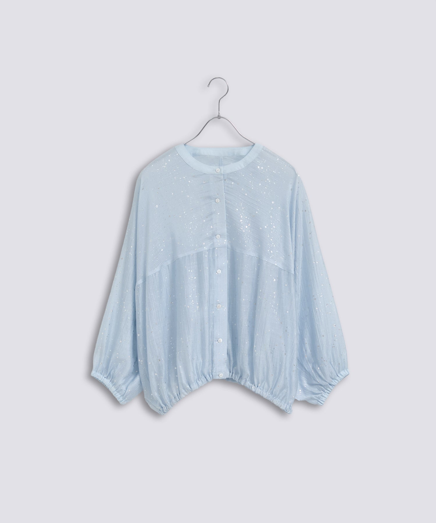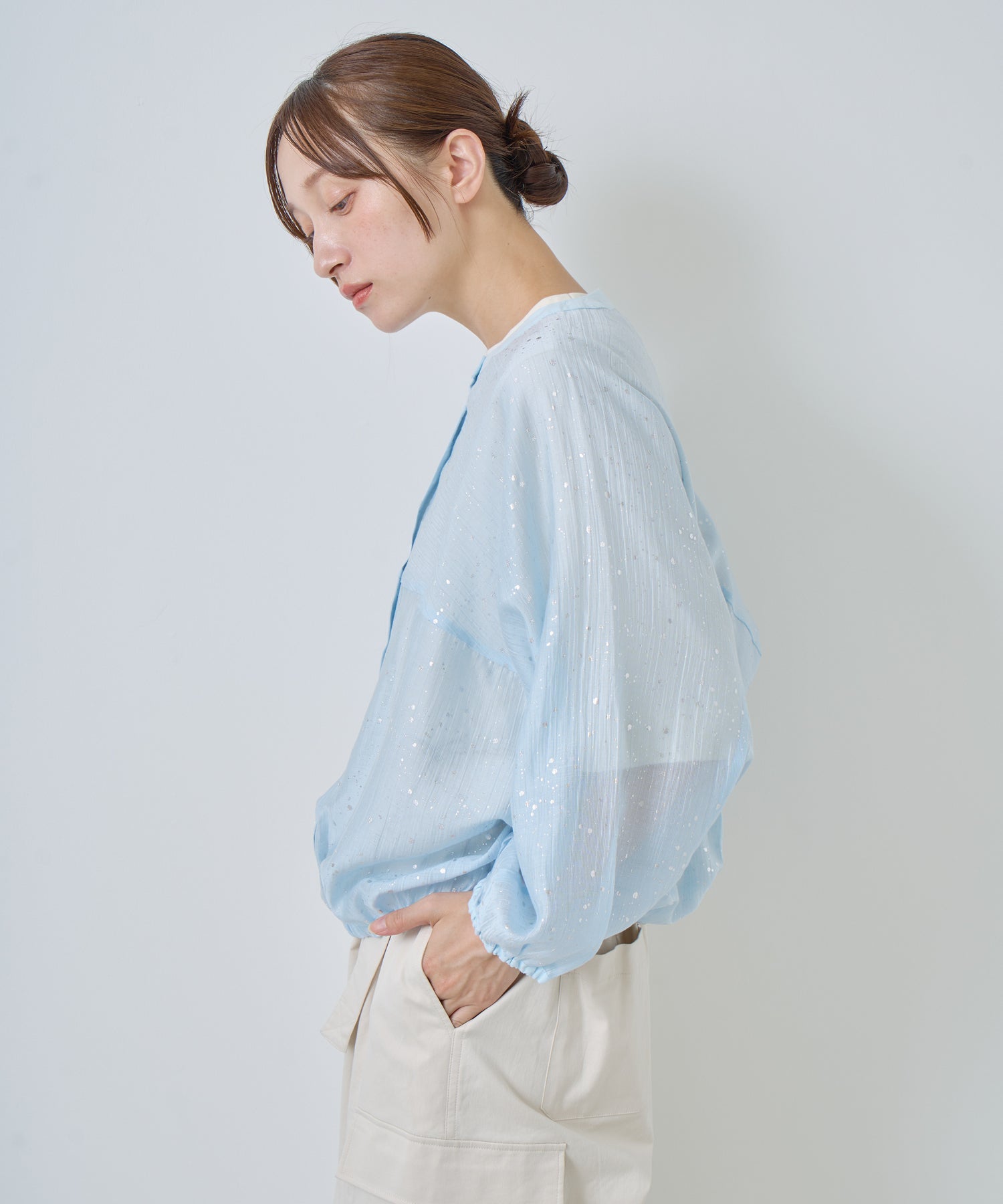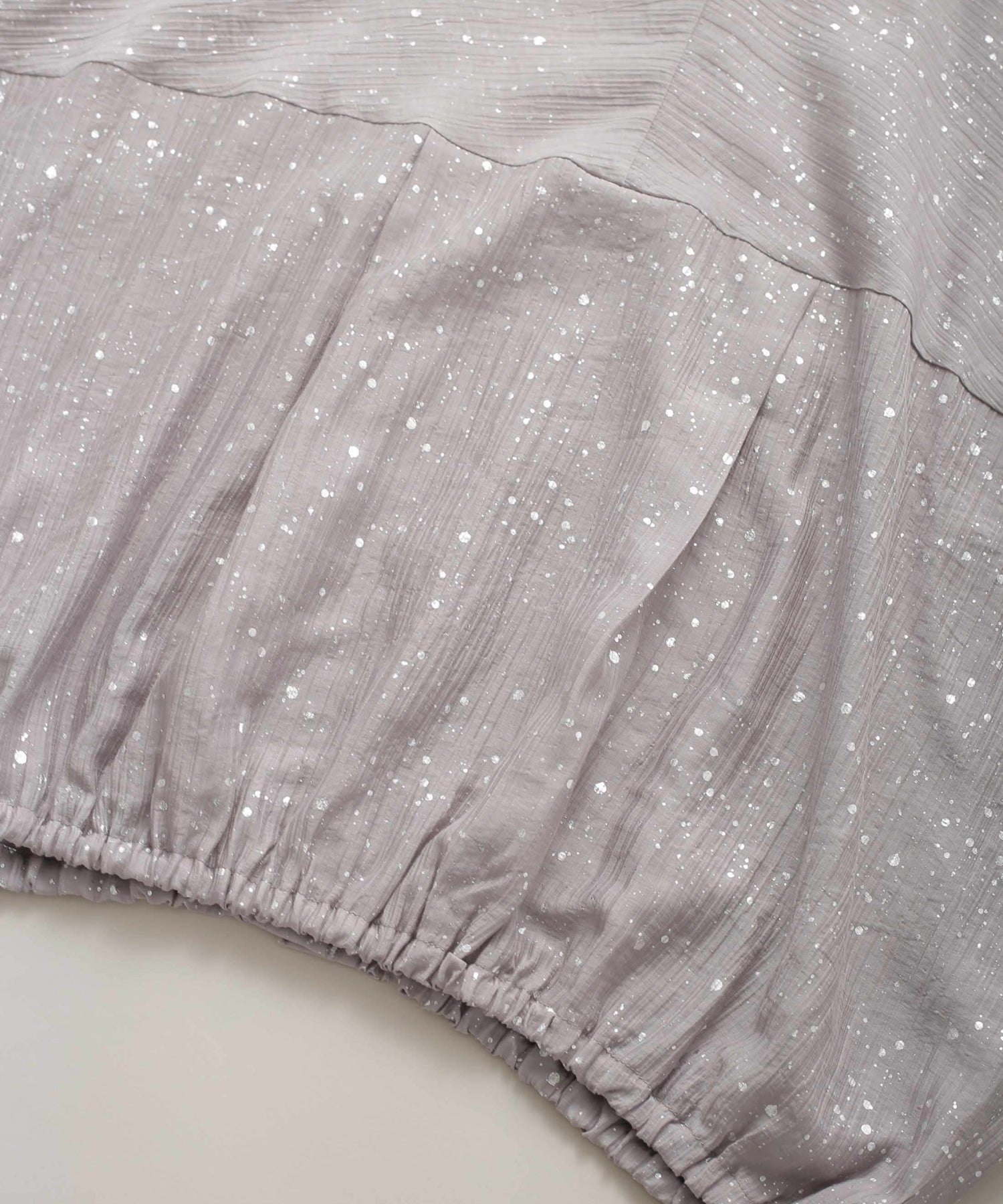シアー素材をベースに、美しい箔プリントを施した印象的なデザイントップスです。