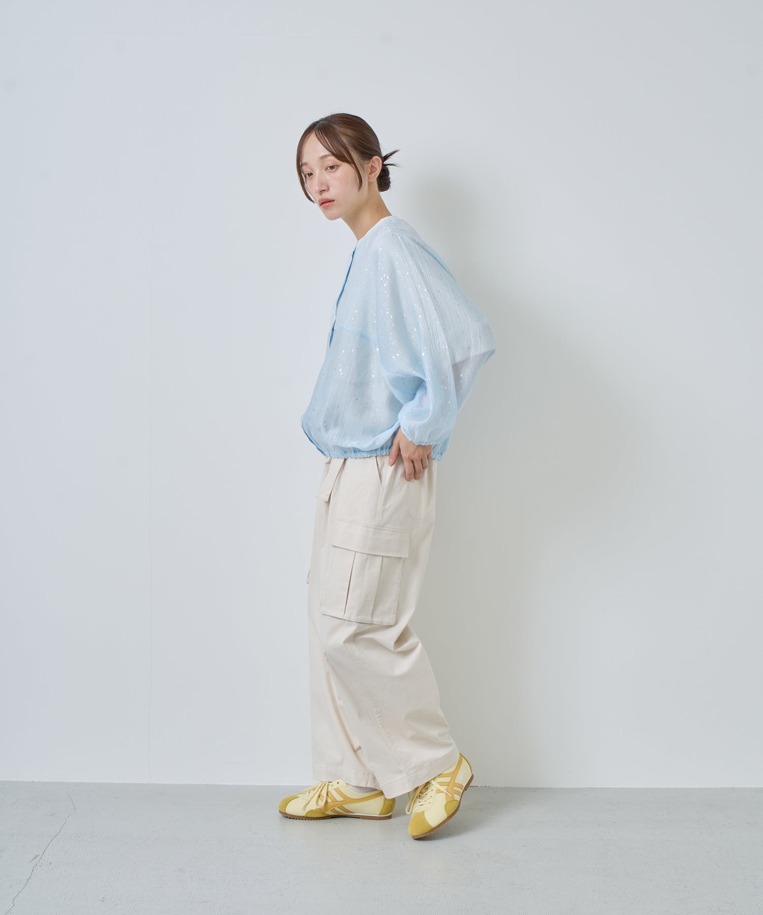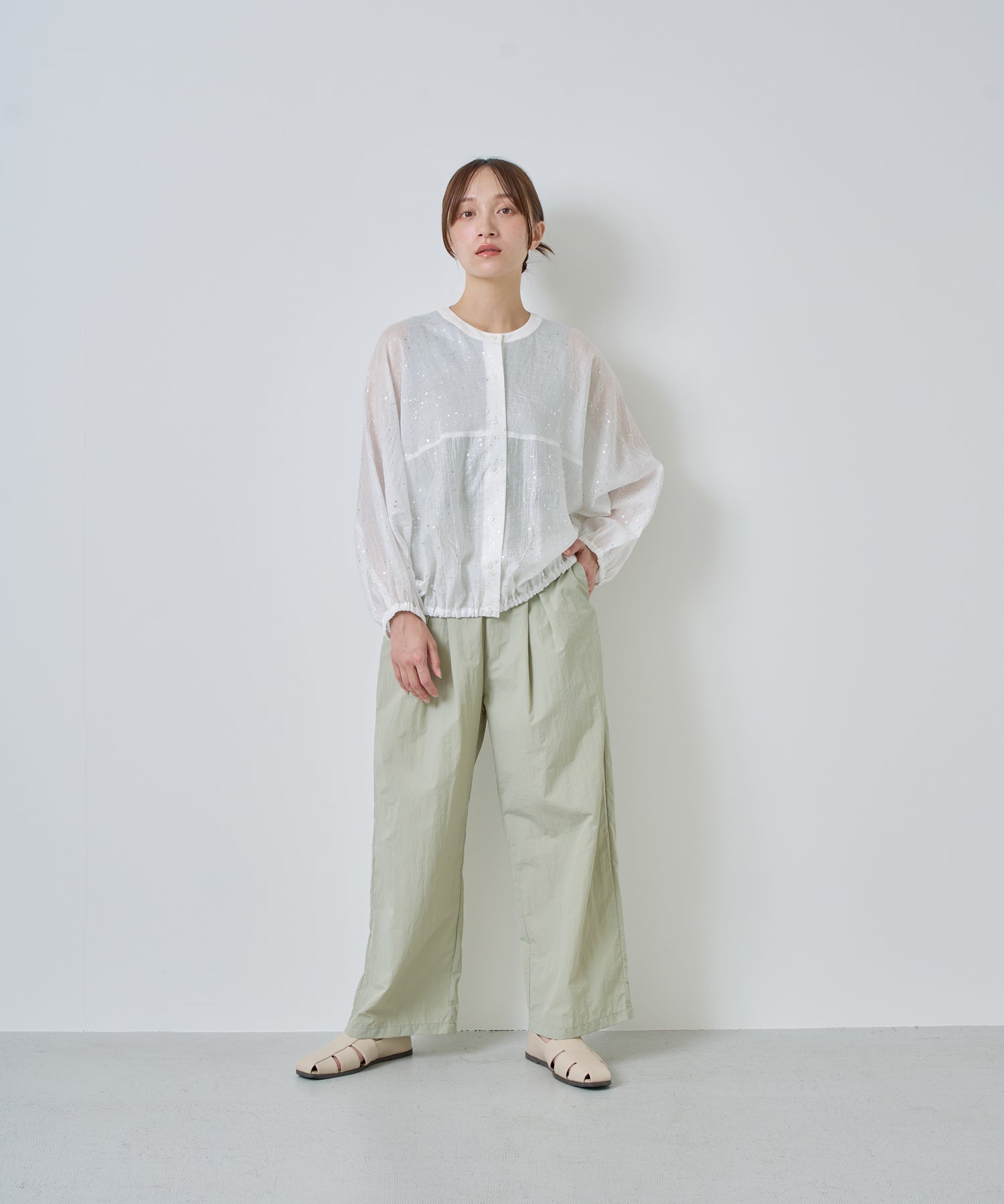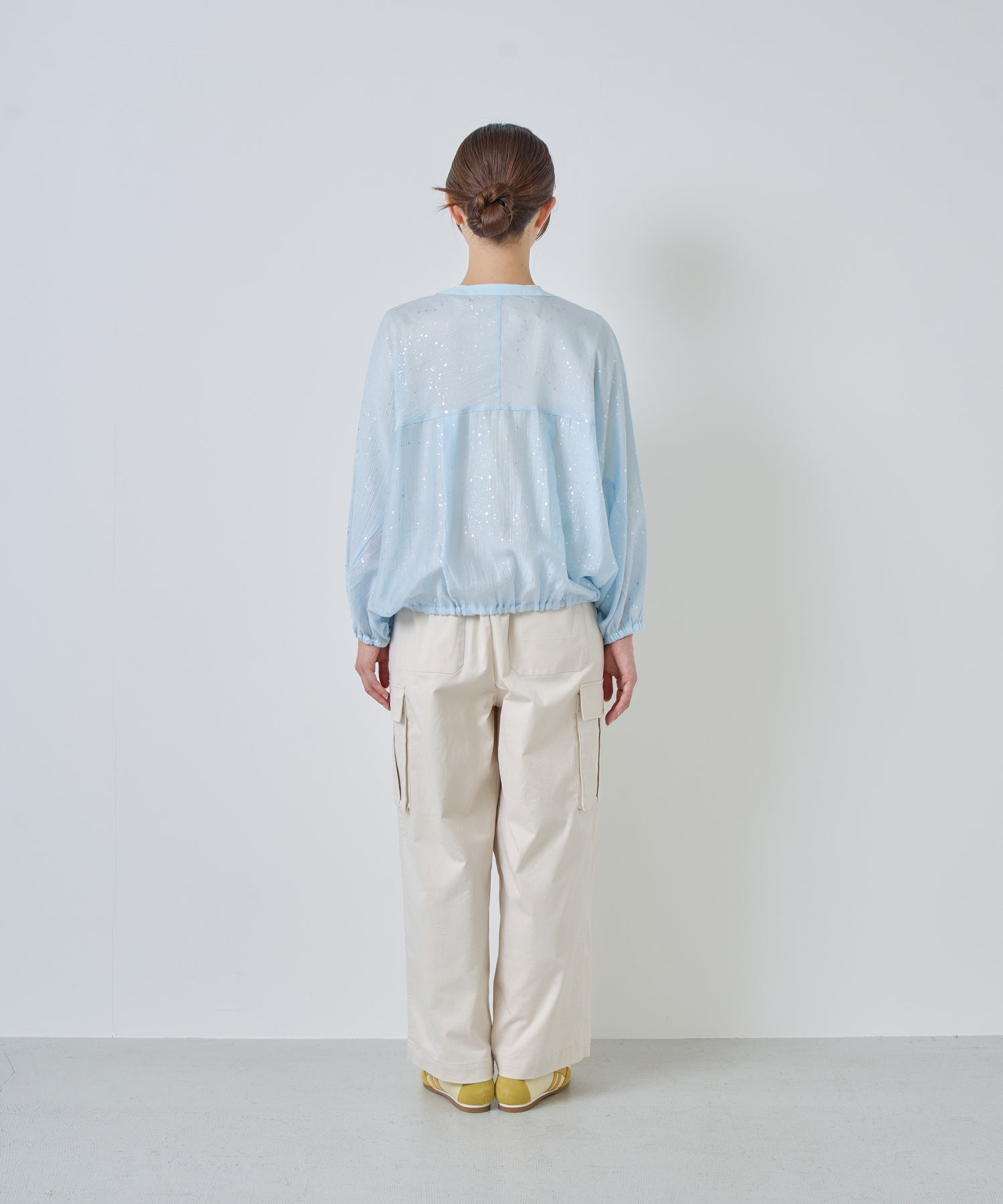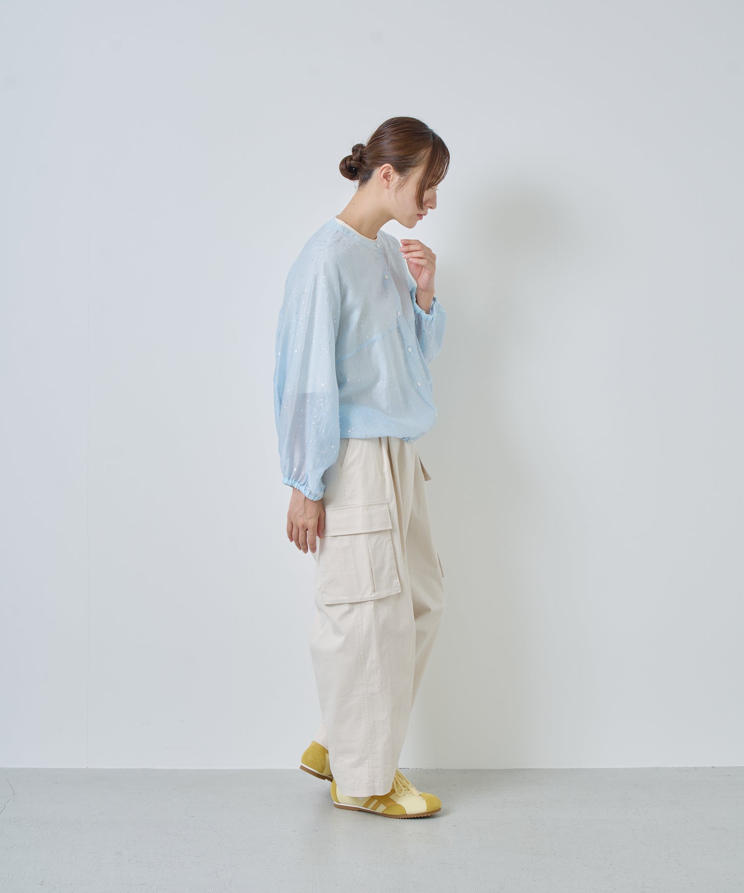たっぷりと取ったドルマンスリーブはリラックス感があり、袖口と裾にゴムを入れることで、ギャザーで膨らみを持たせたシルエットに。