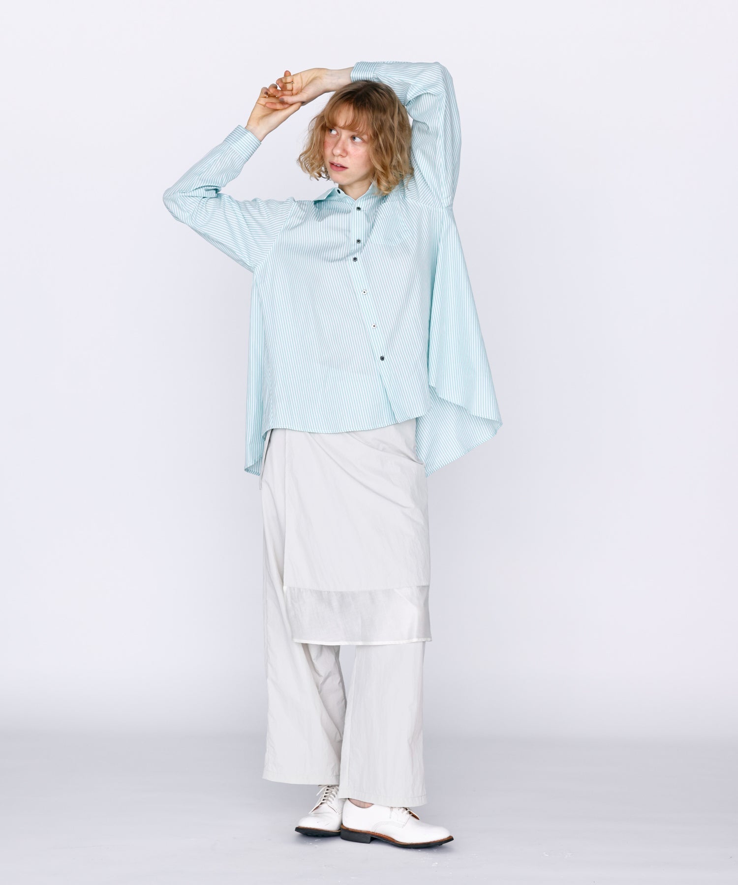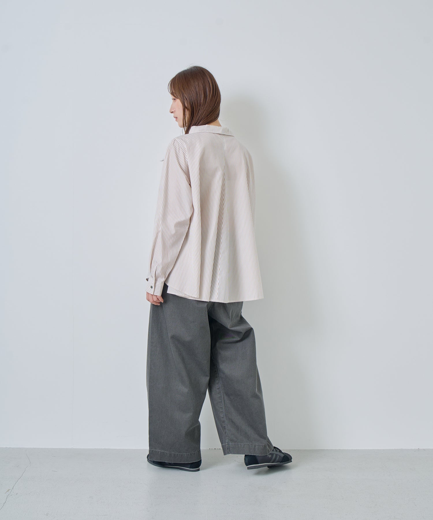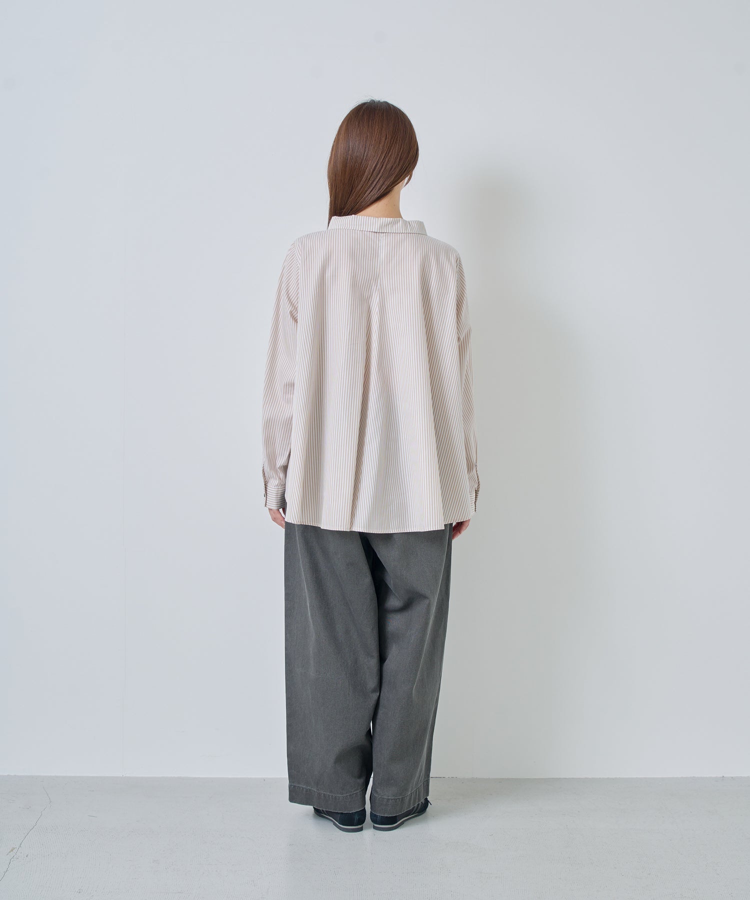 背中に大きくフレアーパターンでドレープを入れたブラウス。