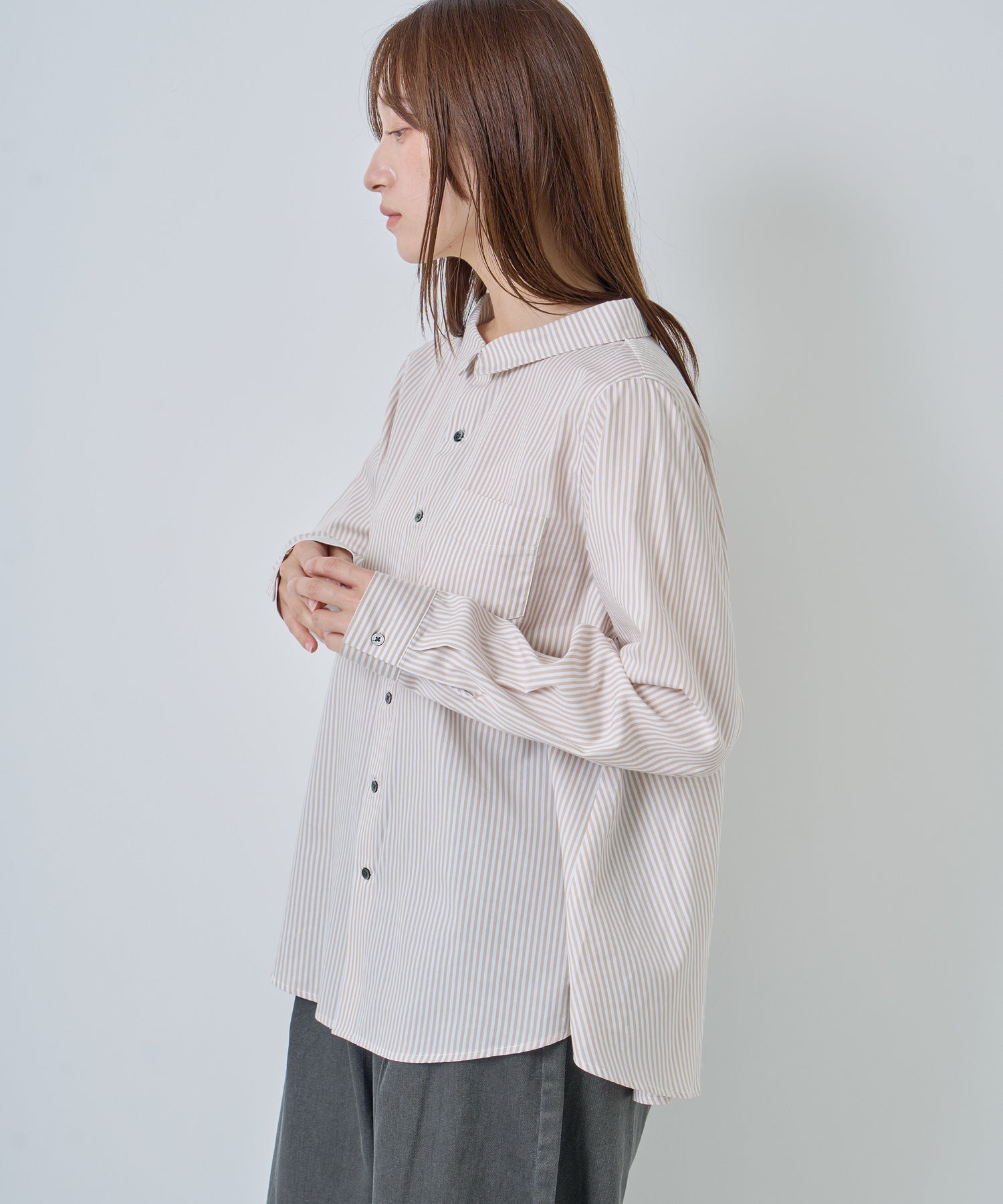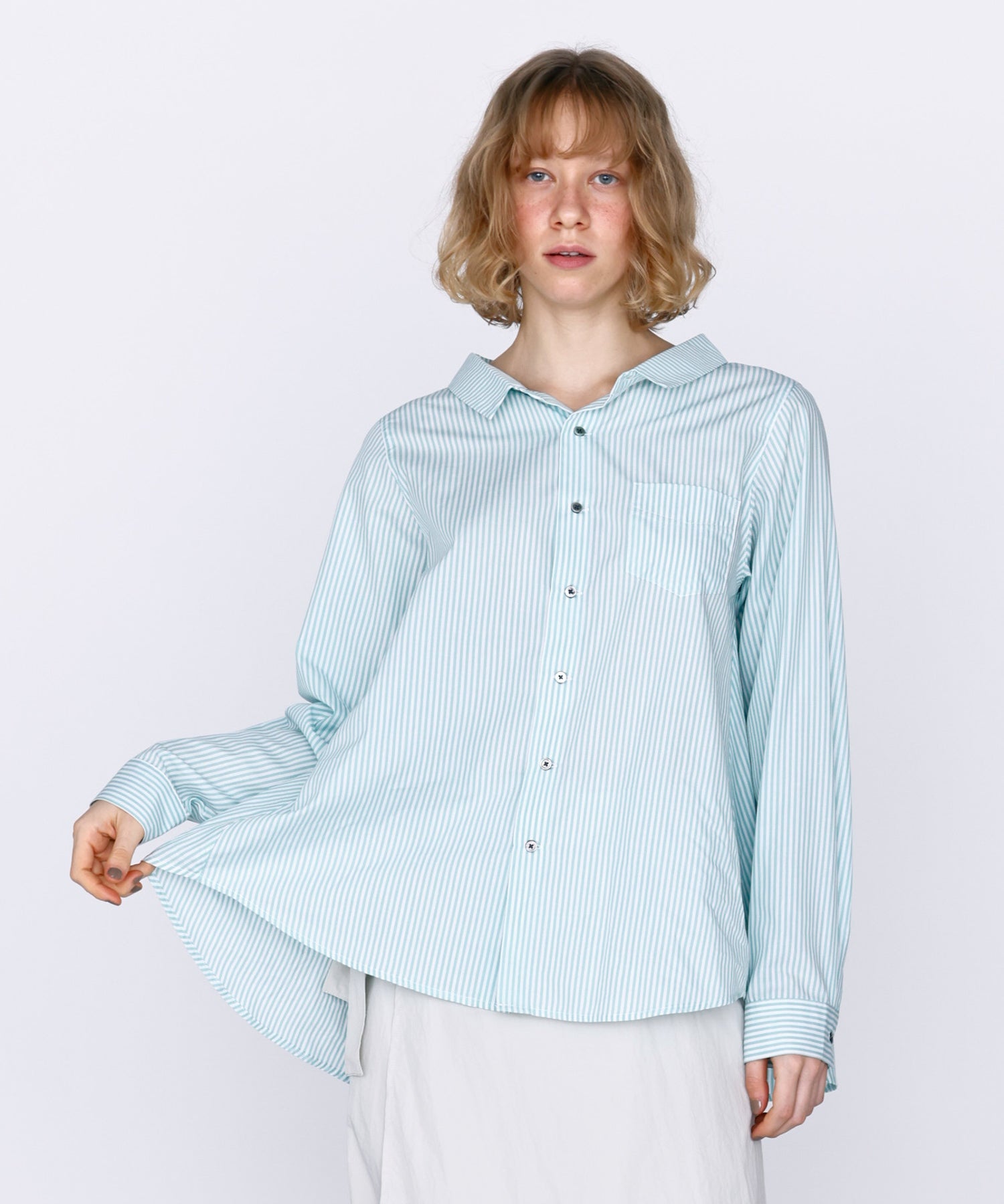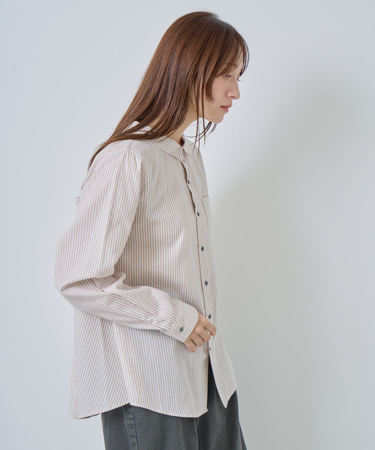 胸元の小ぶりなポケットや、華奢なサイズのカフスで女性らしい気こなしが可能な1枚。