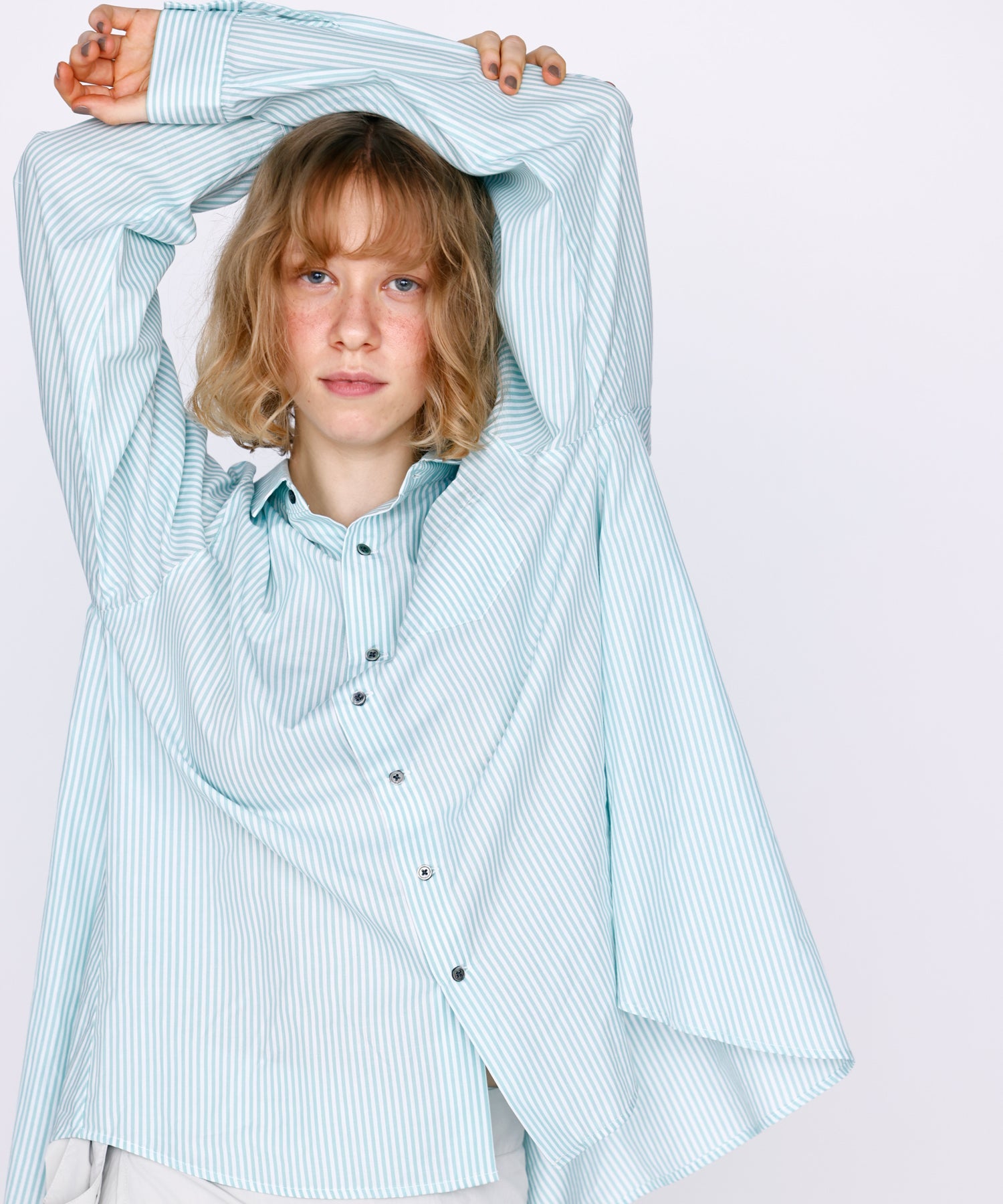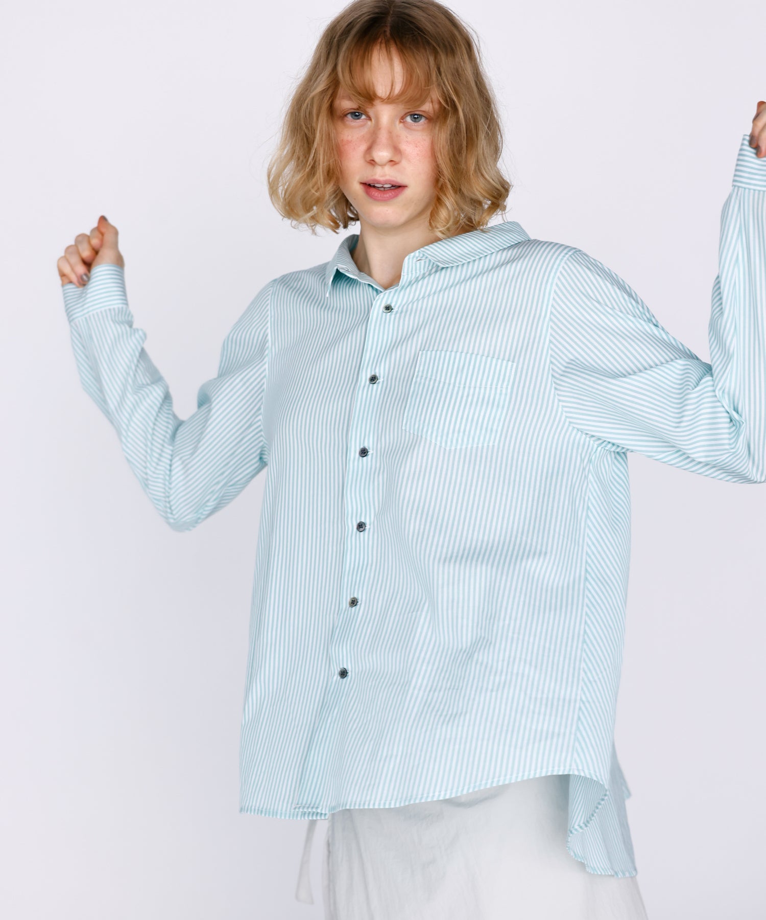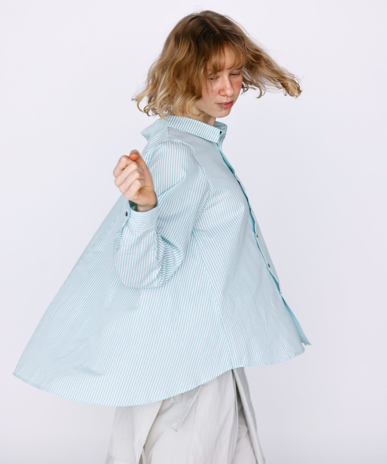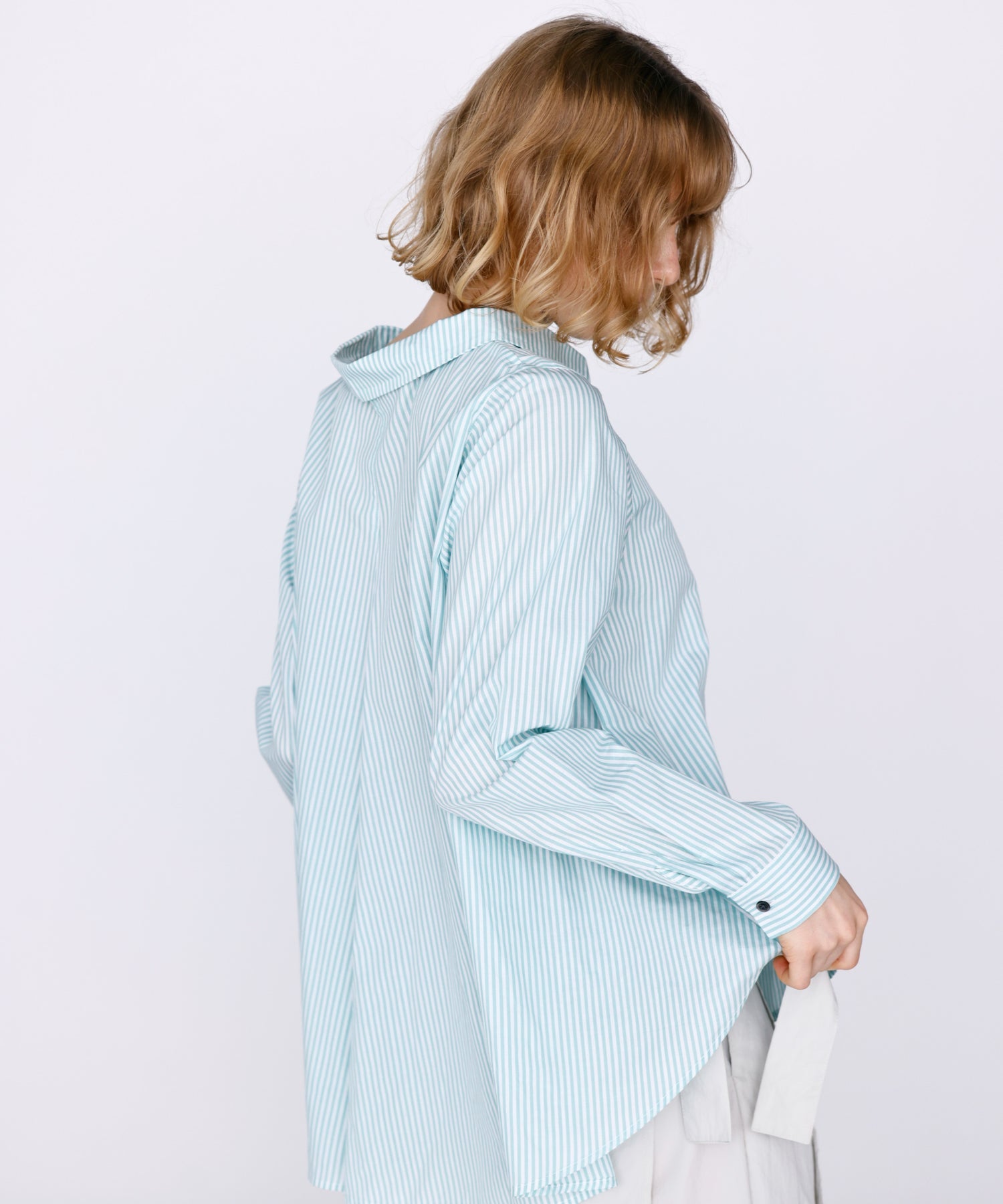 胸元の小ぶりなポケットや、華奢なサイズのカフスで女性らしい気こなしが可能な1枚。