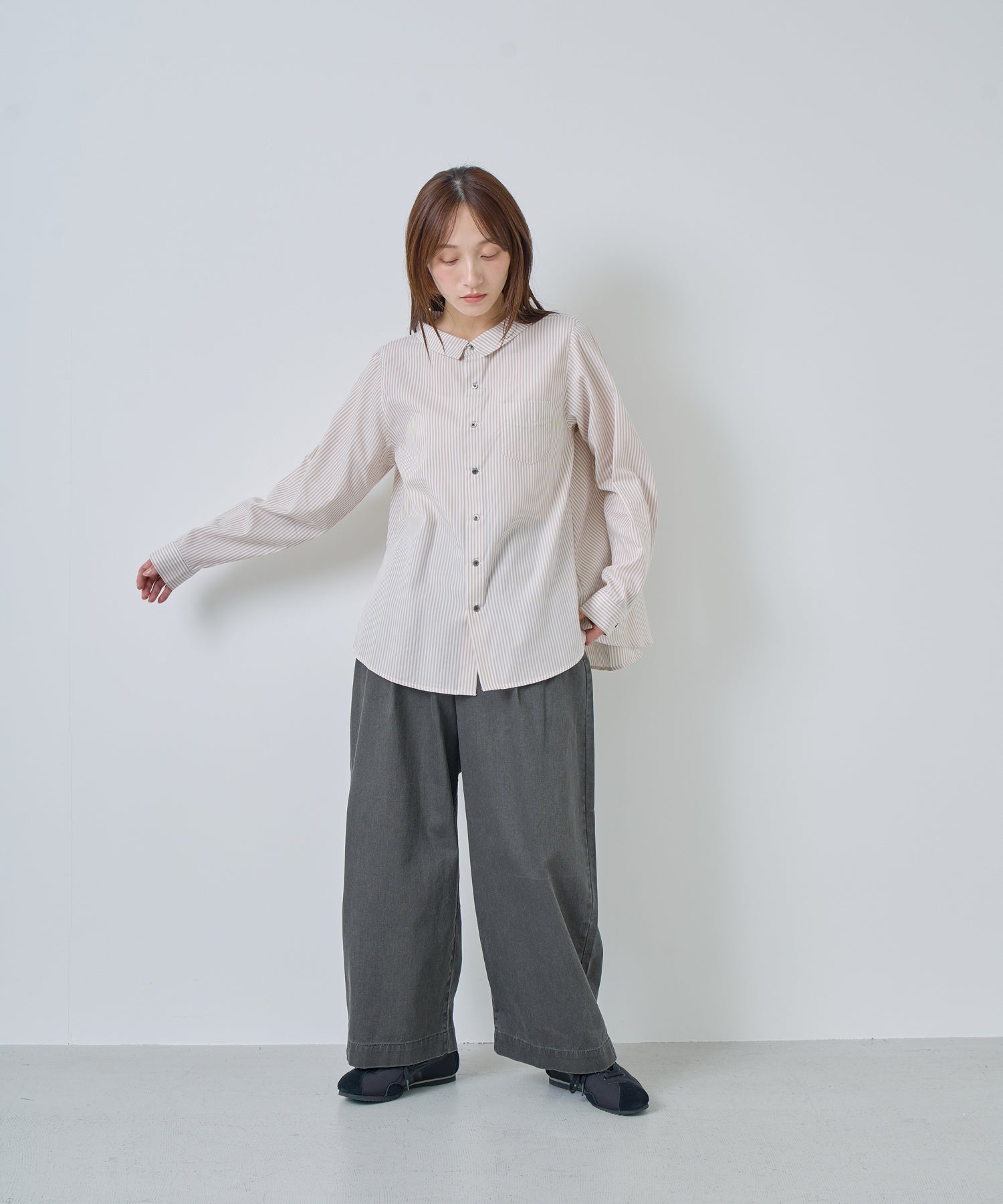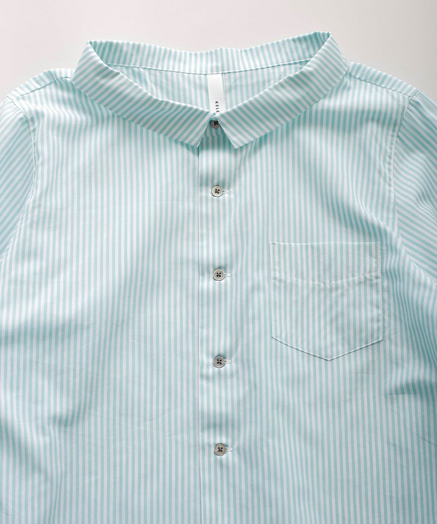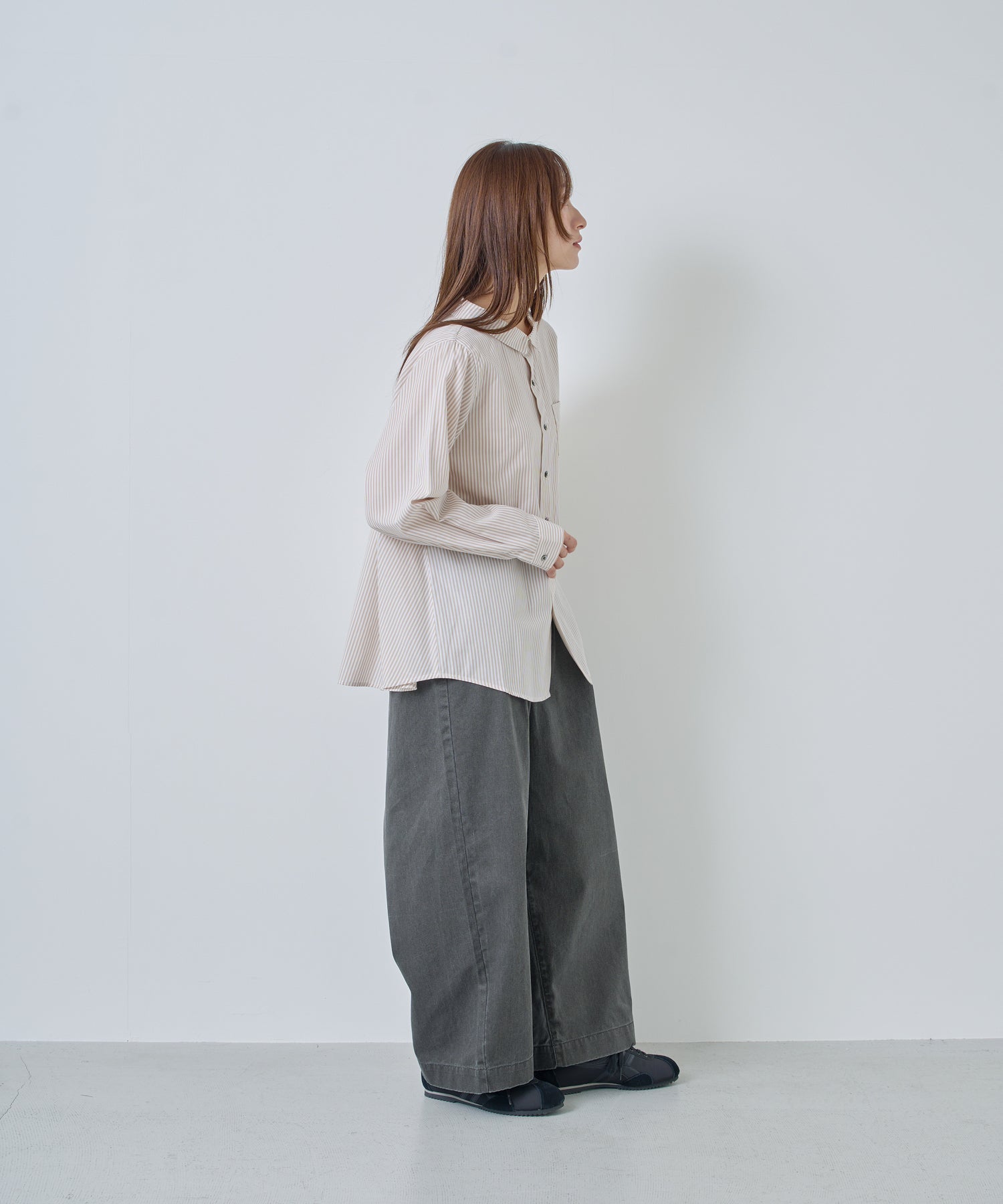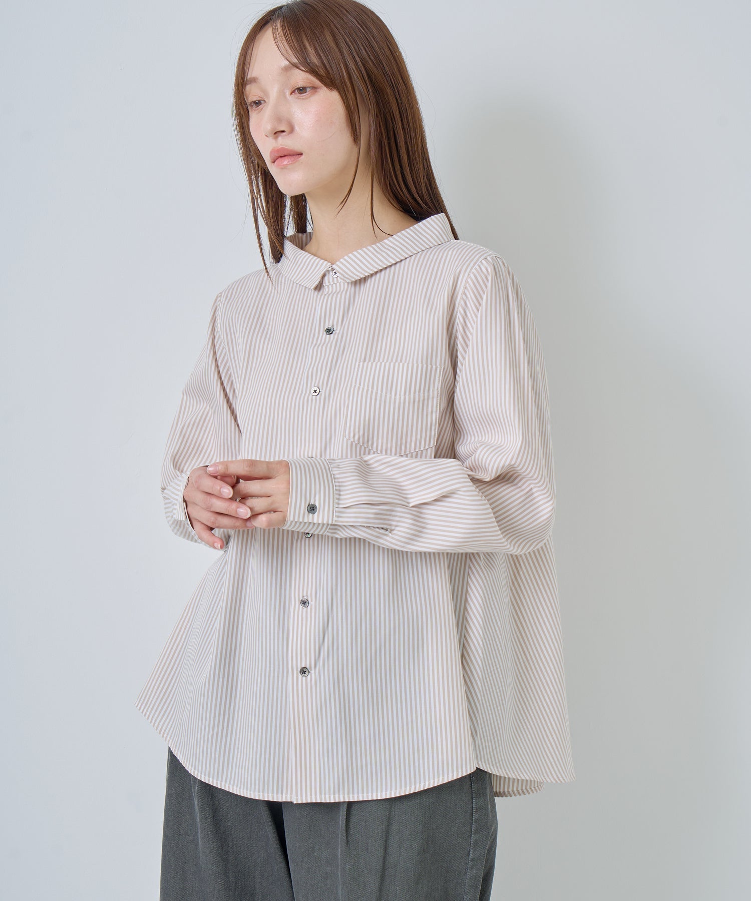 やや広めに設定している襟はパターンで立ち上がるように設定し、シンプルすぎないブラウスのポイントにしています。