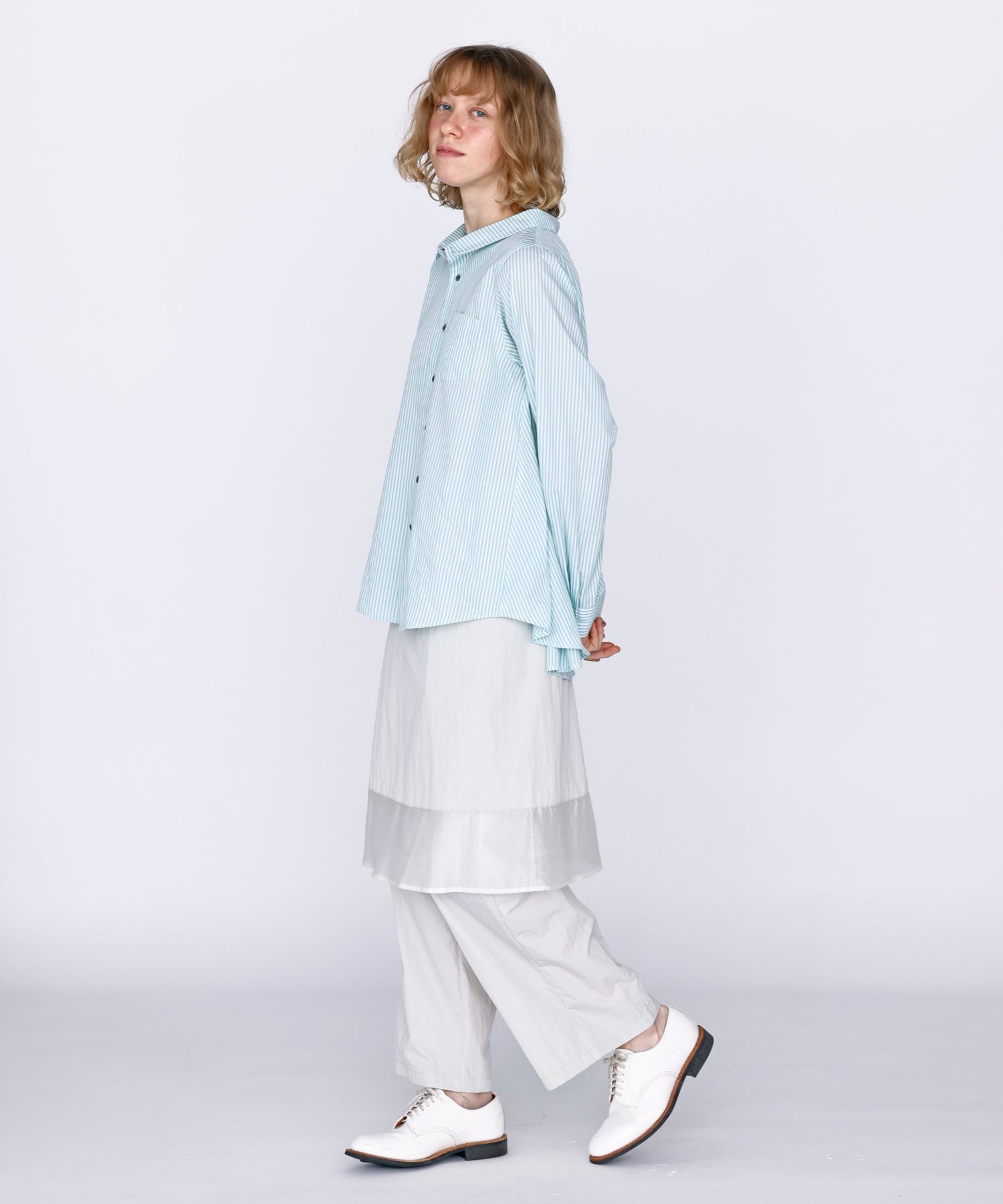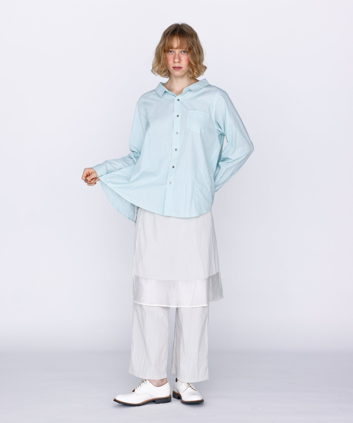 FRONTはすっきりした印象のブラウスで仕立てたコントラストが面白い1枚。