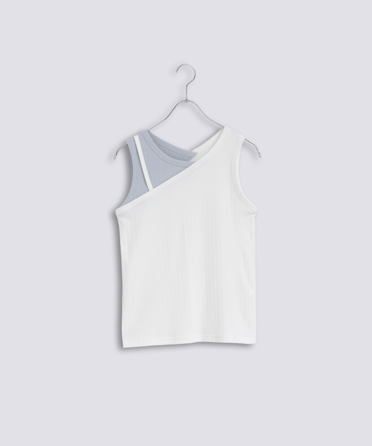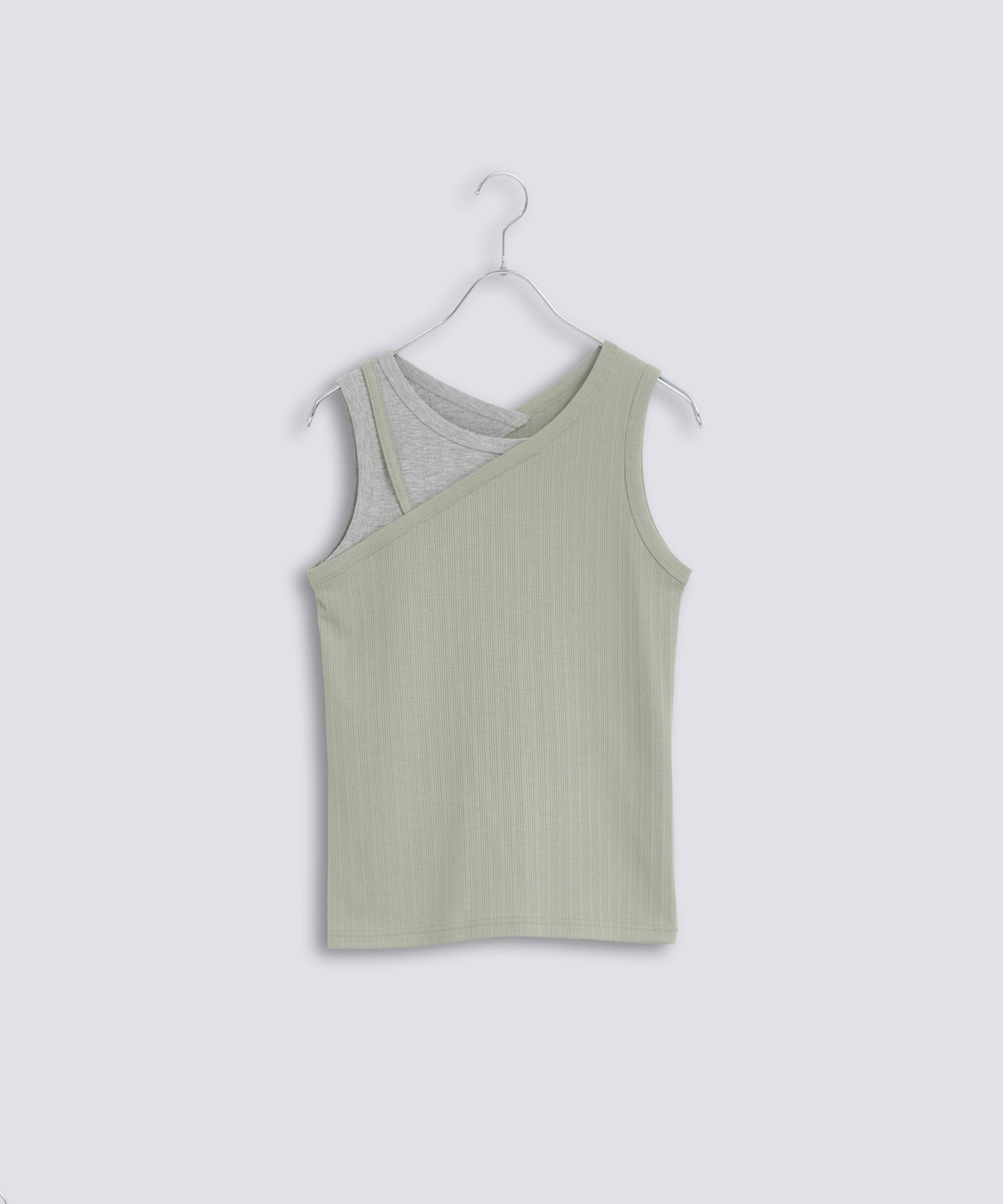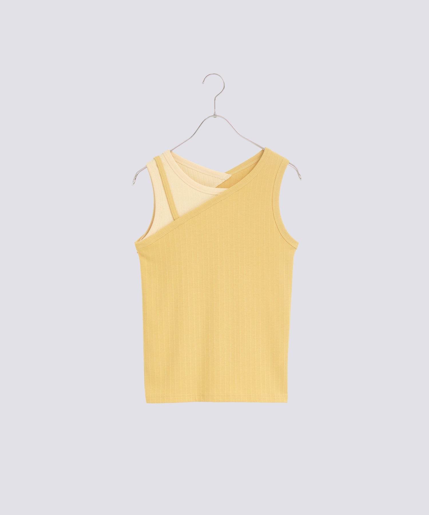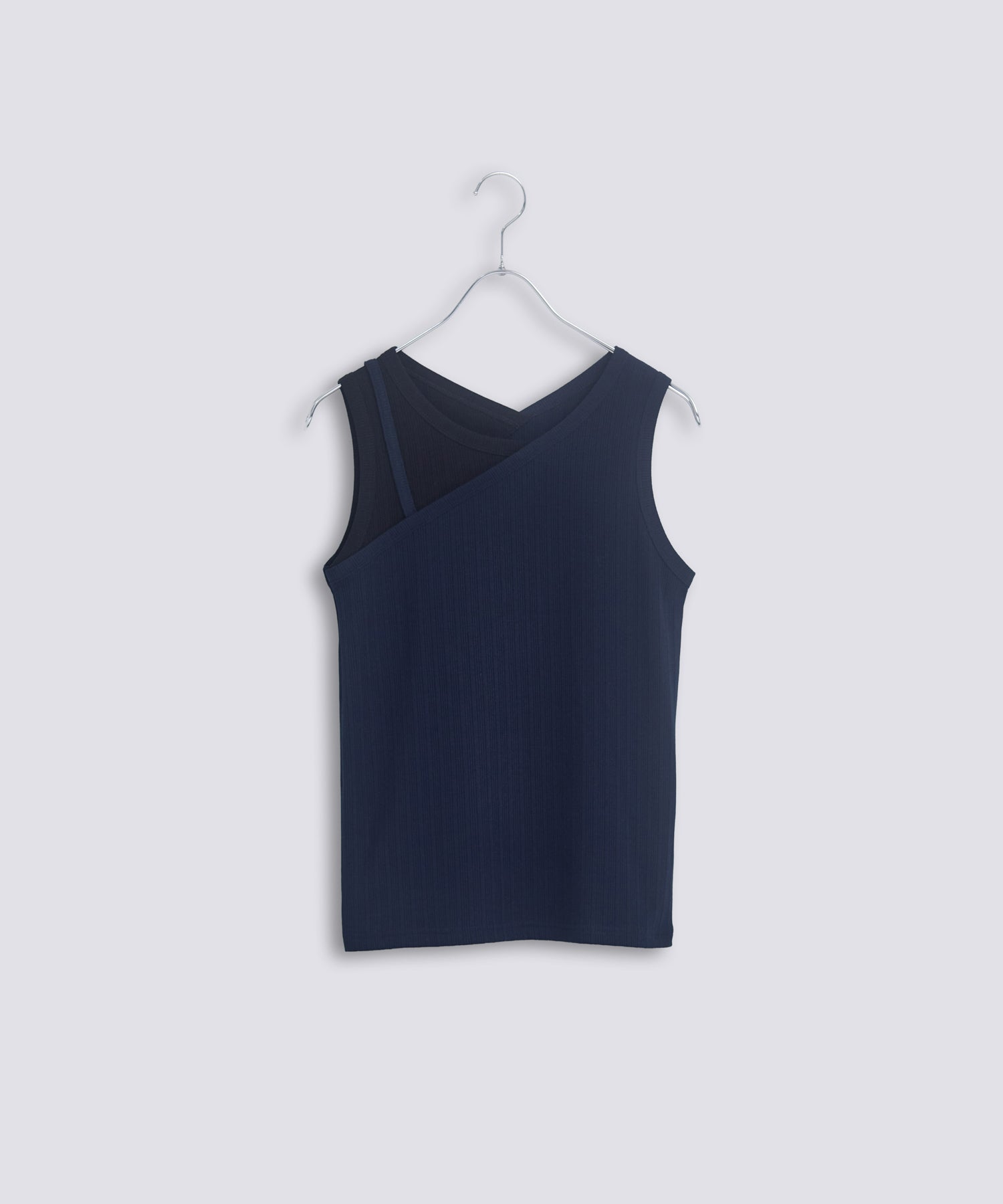 アシンメトリーなワンショルダーデザインで、重ね着風に切り替えたデザインタンクトップ。