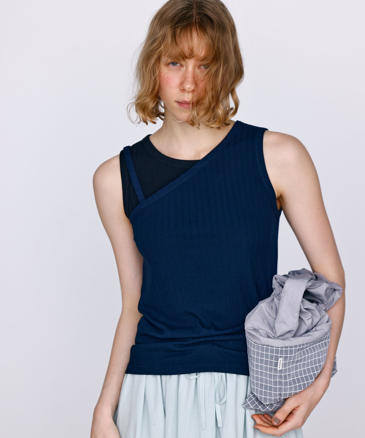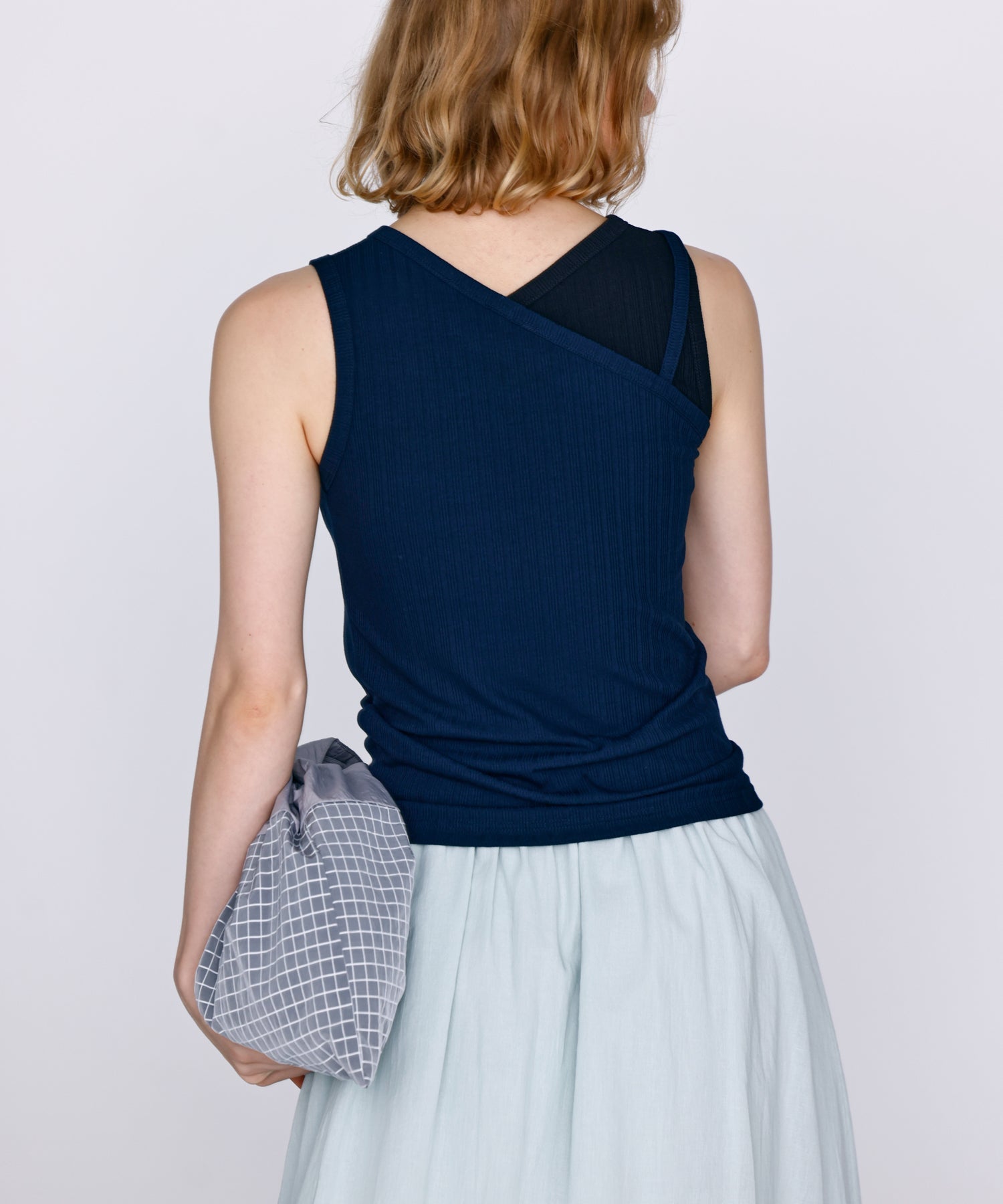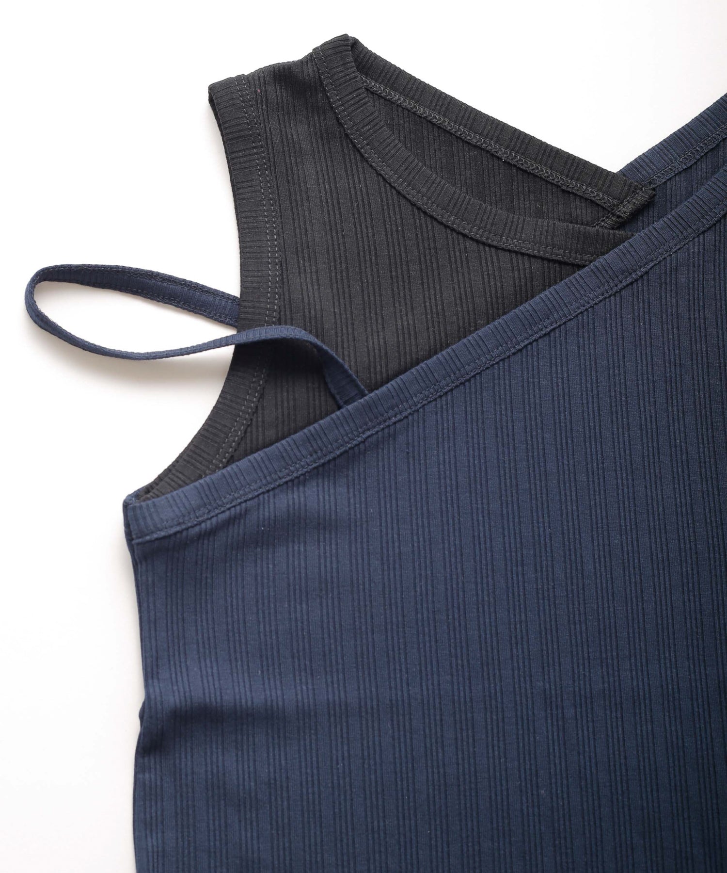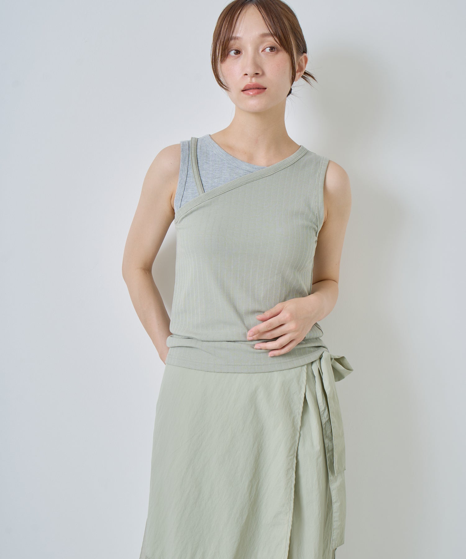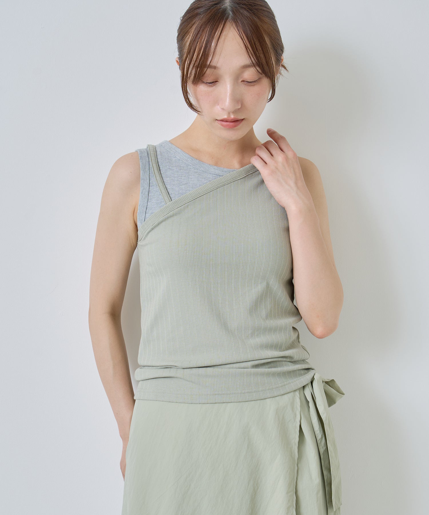 アシンメトリーなワンショルダーデザインで、重ね着風に切り替えたデザインタンクトップ。