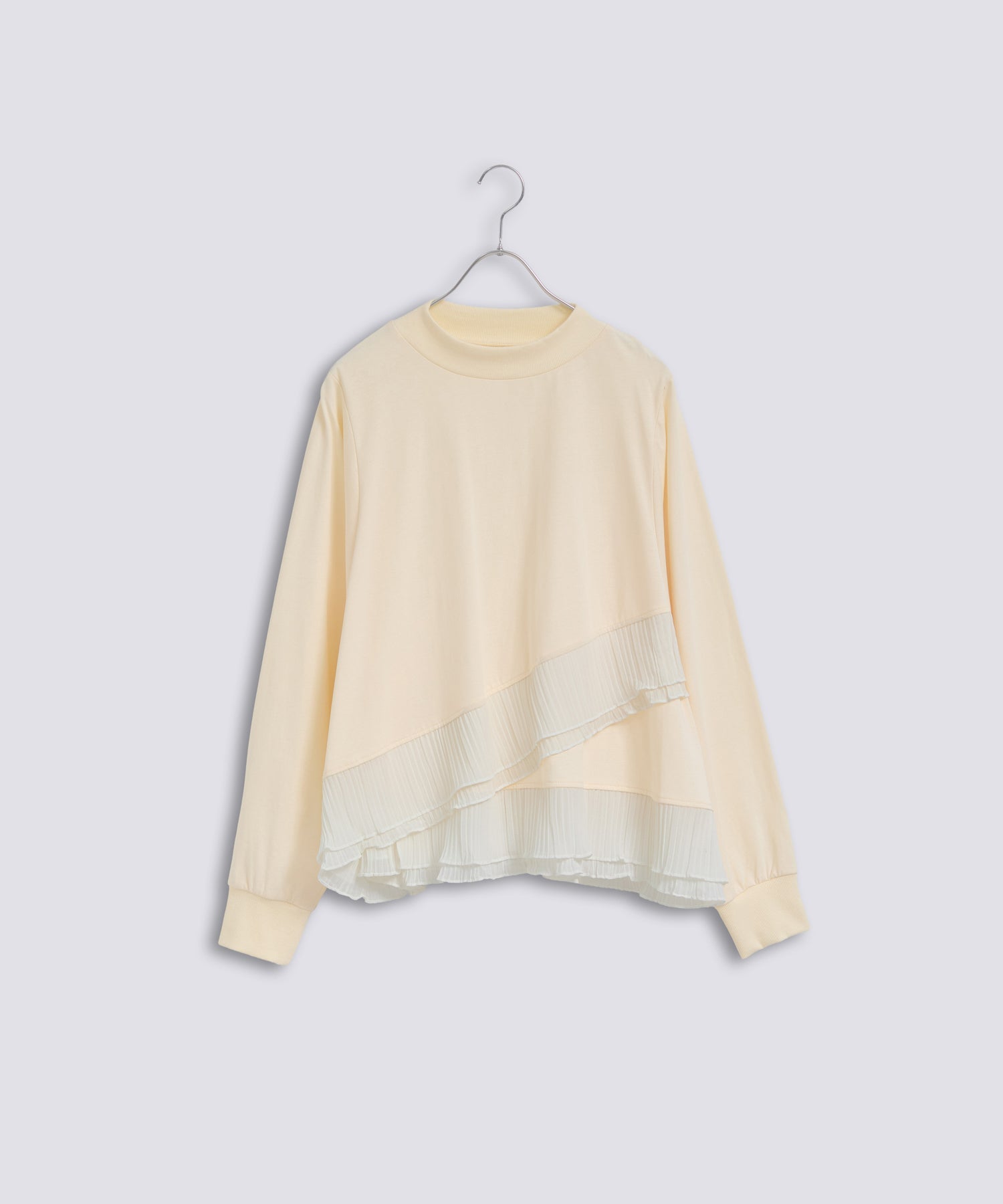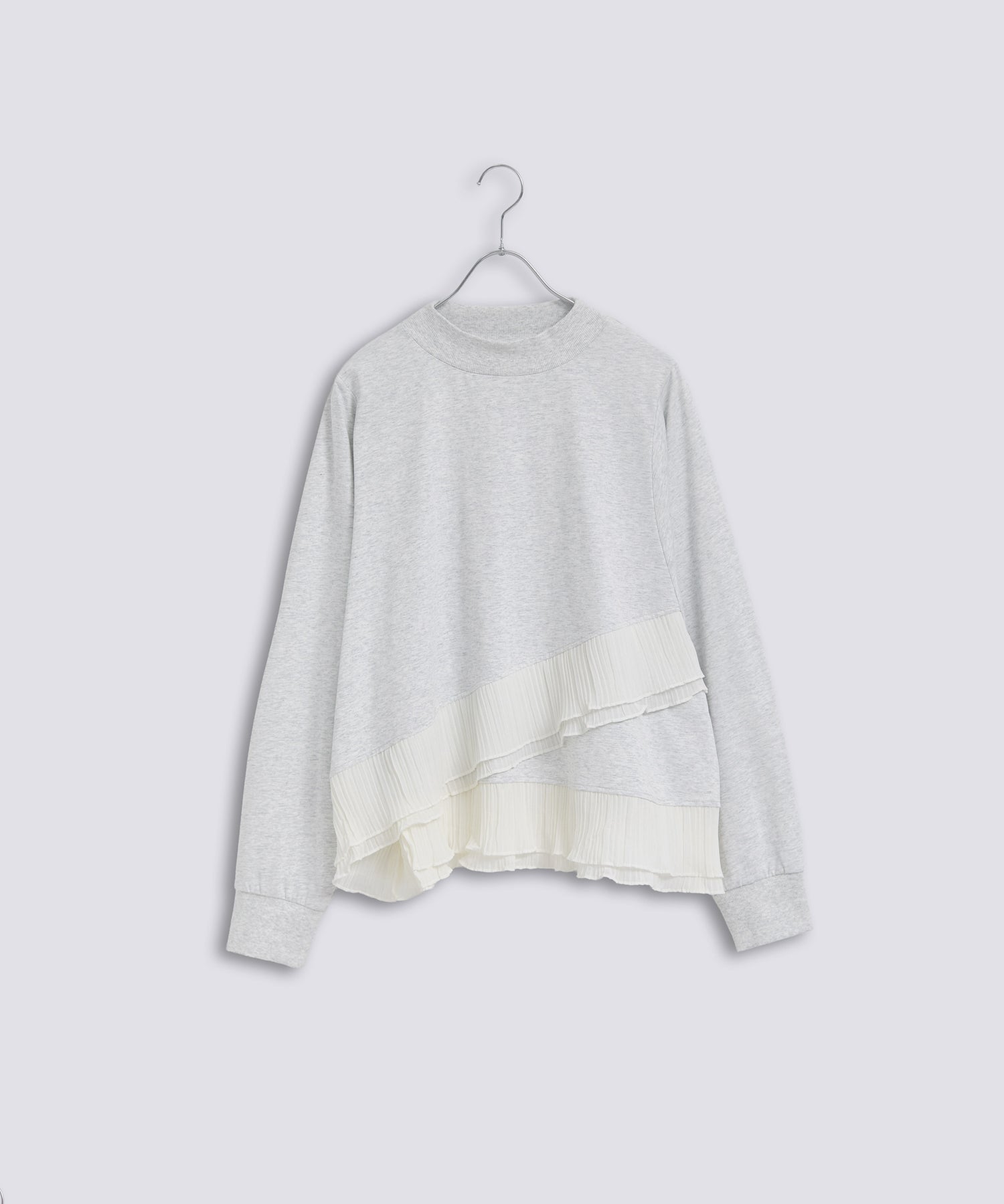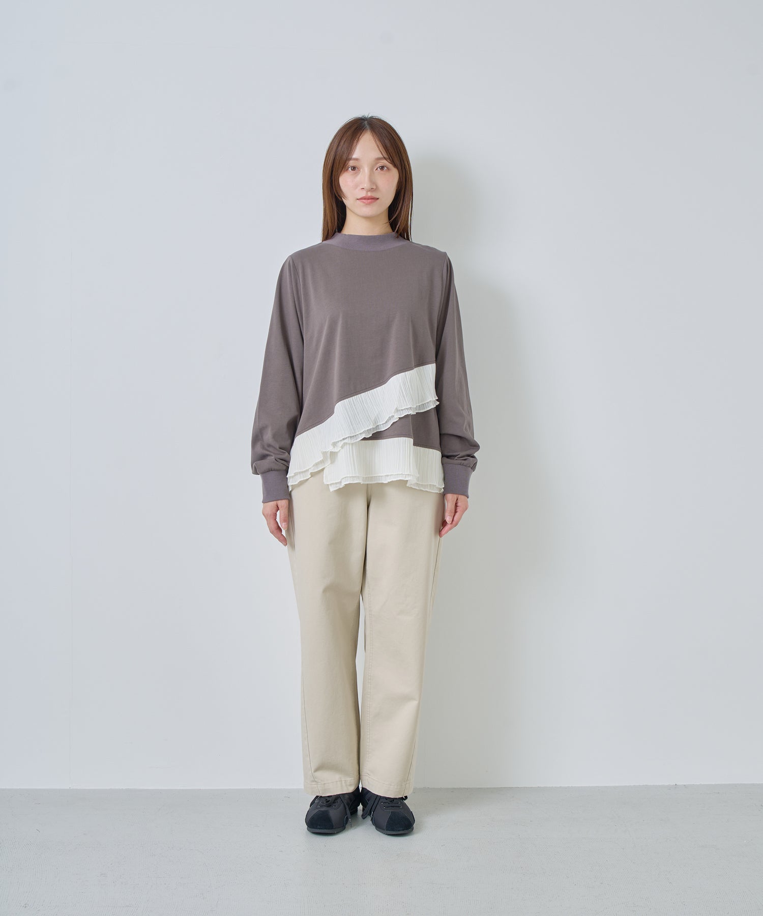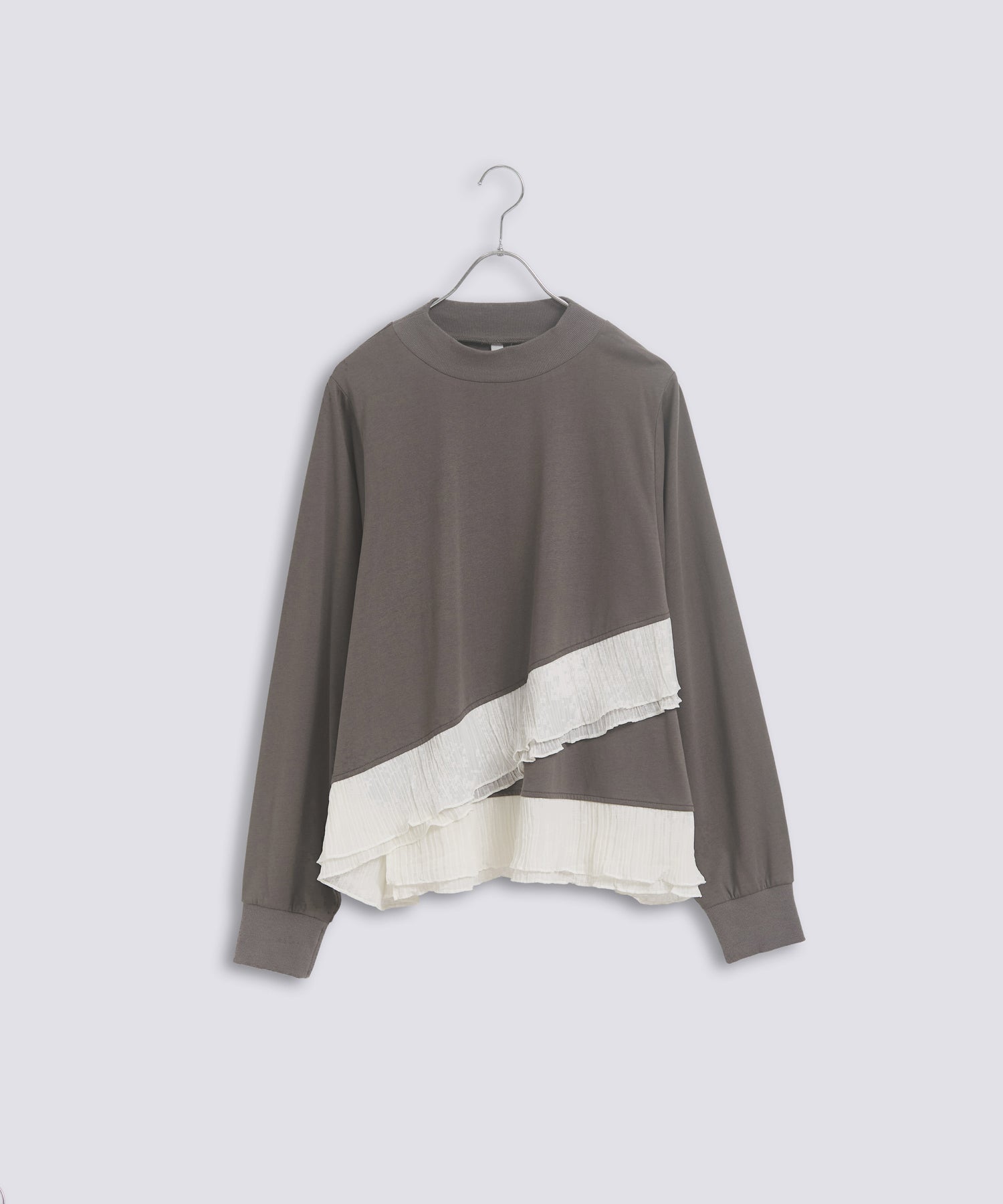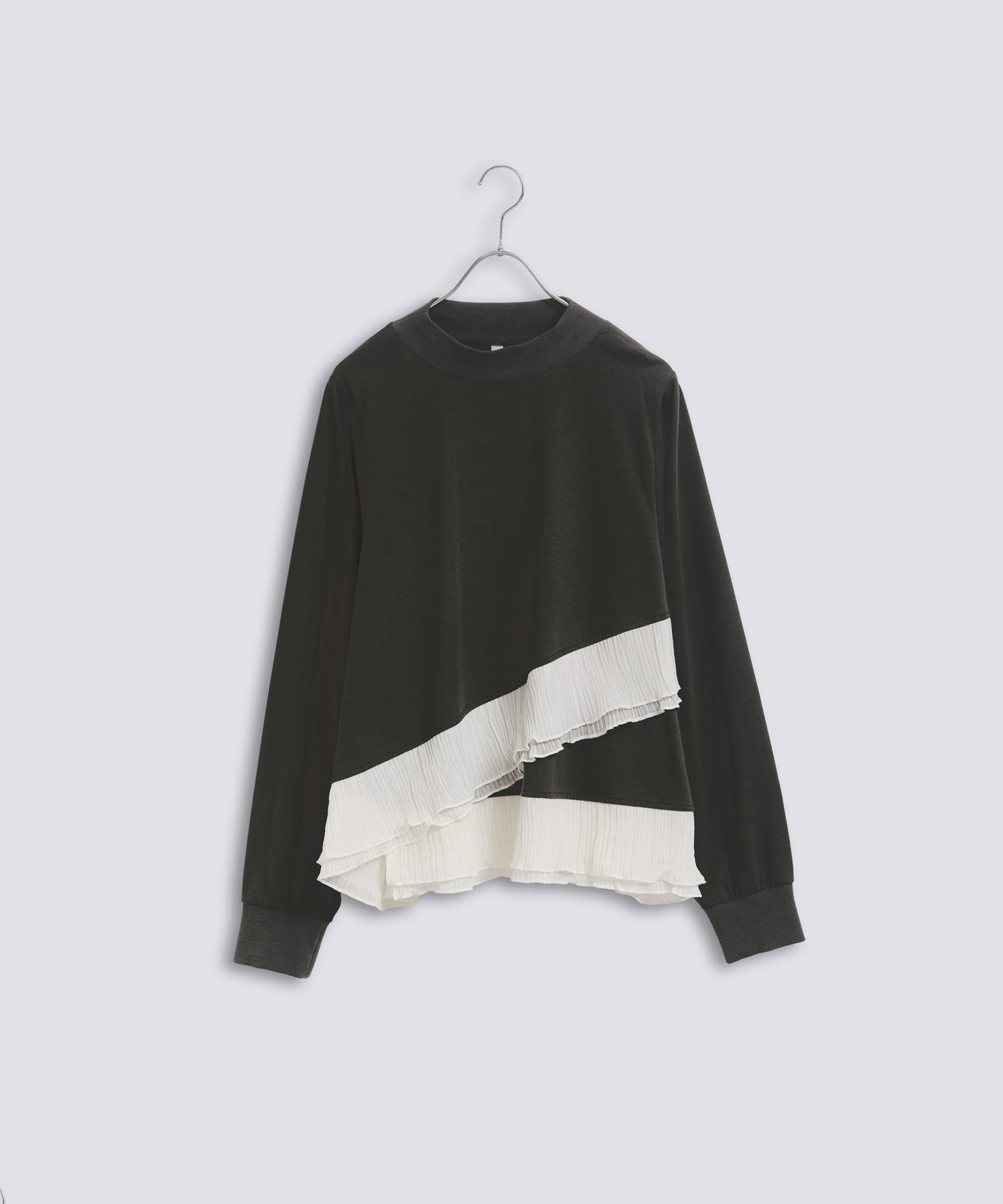 程よいモックネックで上品な印象を加え、裾には異素材のフリルを大胆に切り替えメリハリのあるデザインに仕上げました。