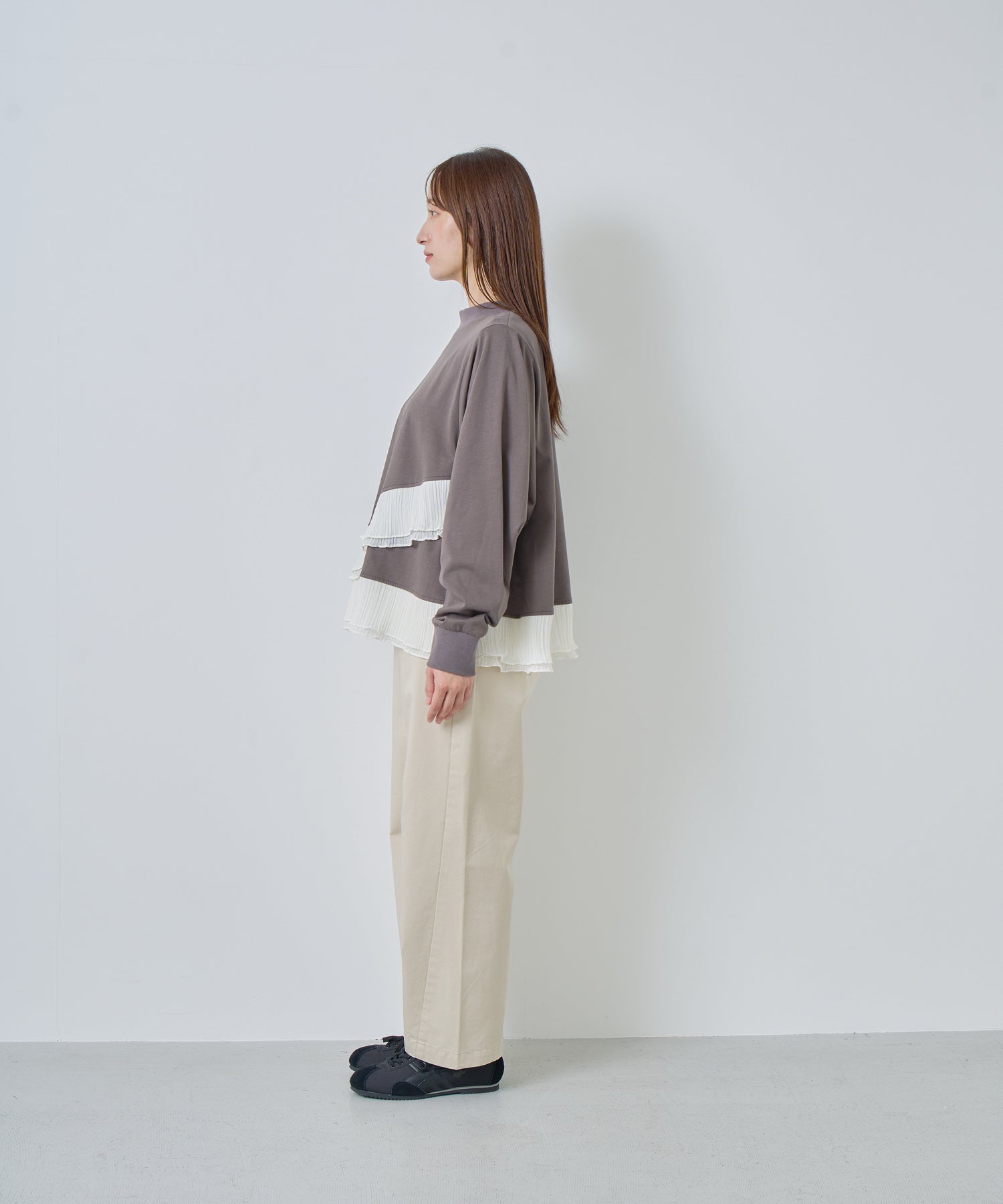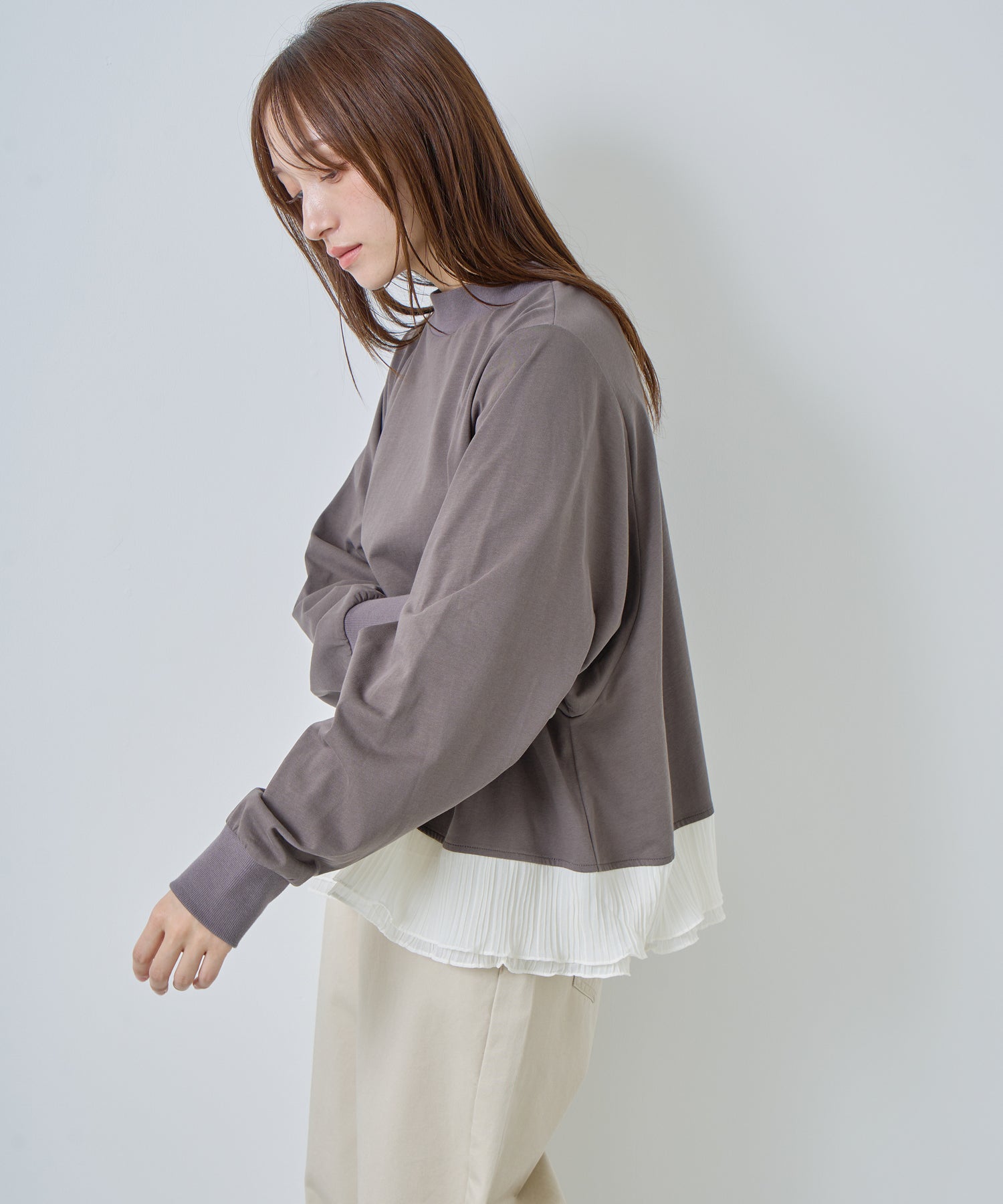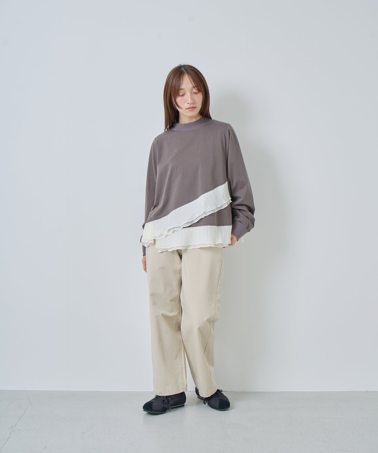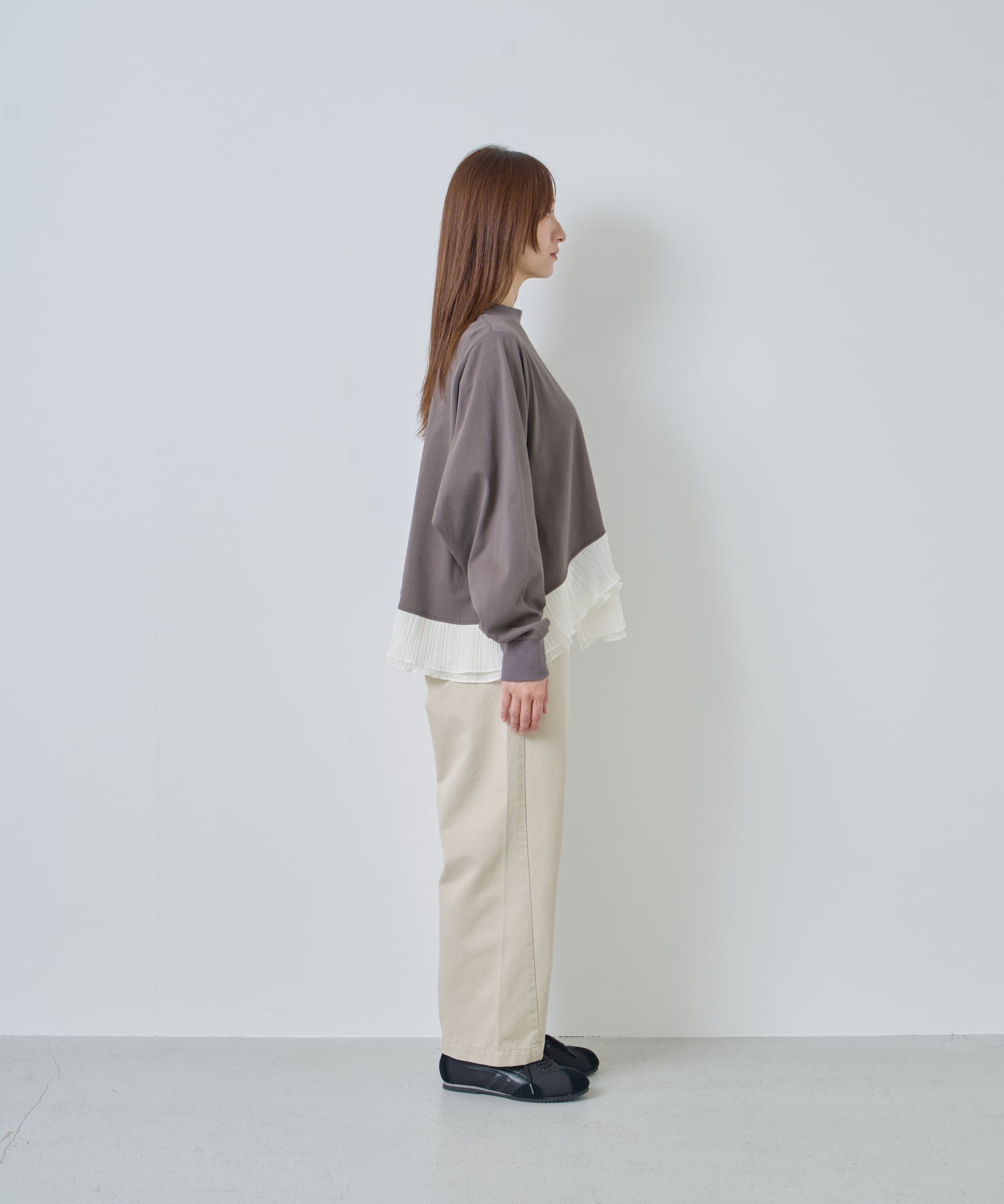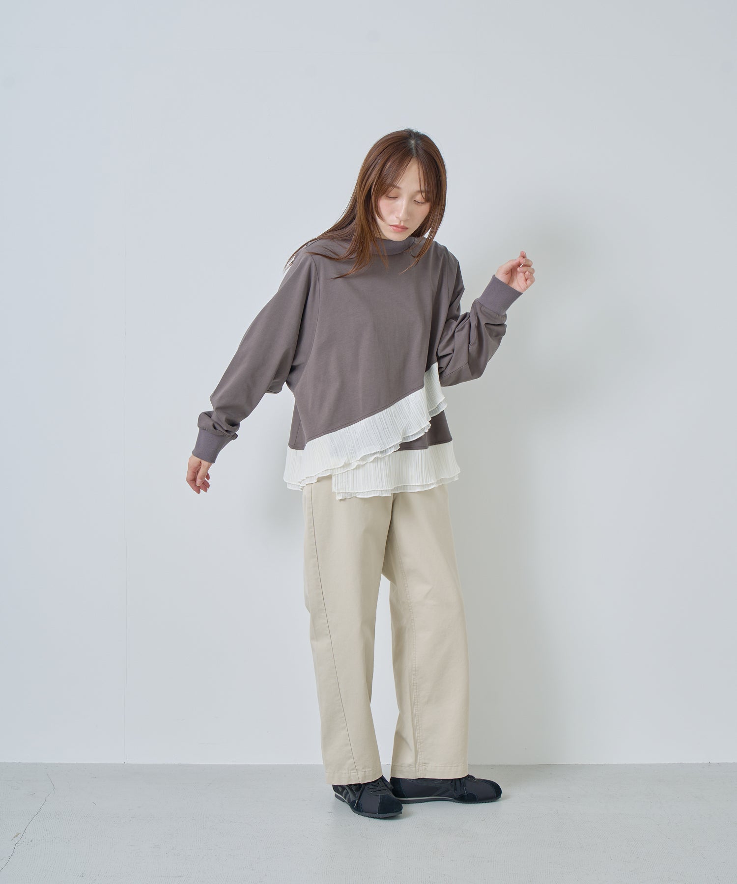 程よいモックネックで上品な印象を加え、裾には異素材のフリルを大胆に切り替えメリハリのあるデザインに仕上げました。