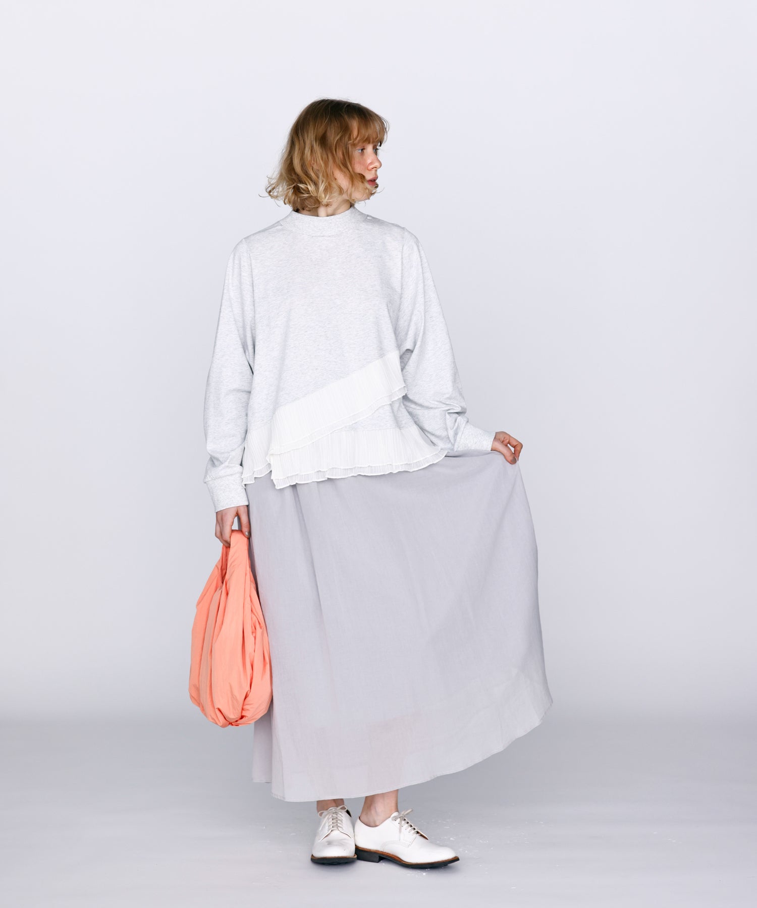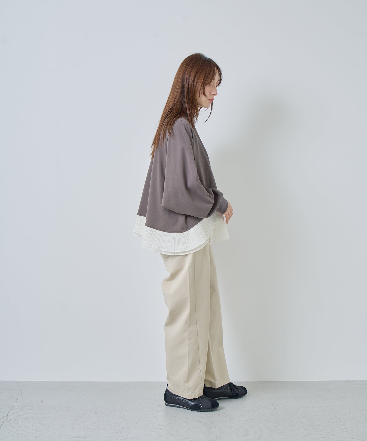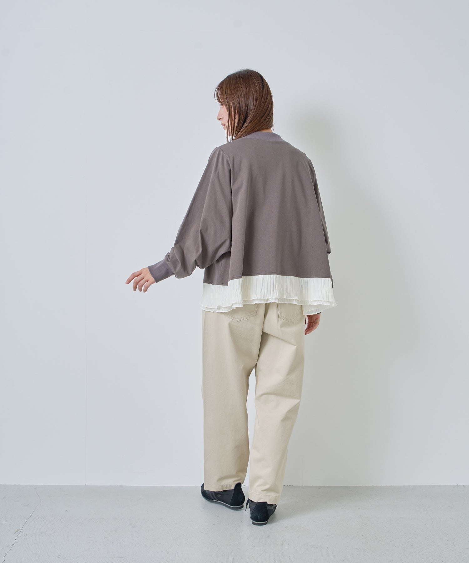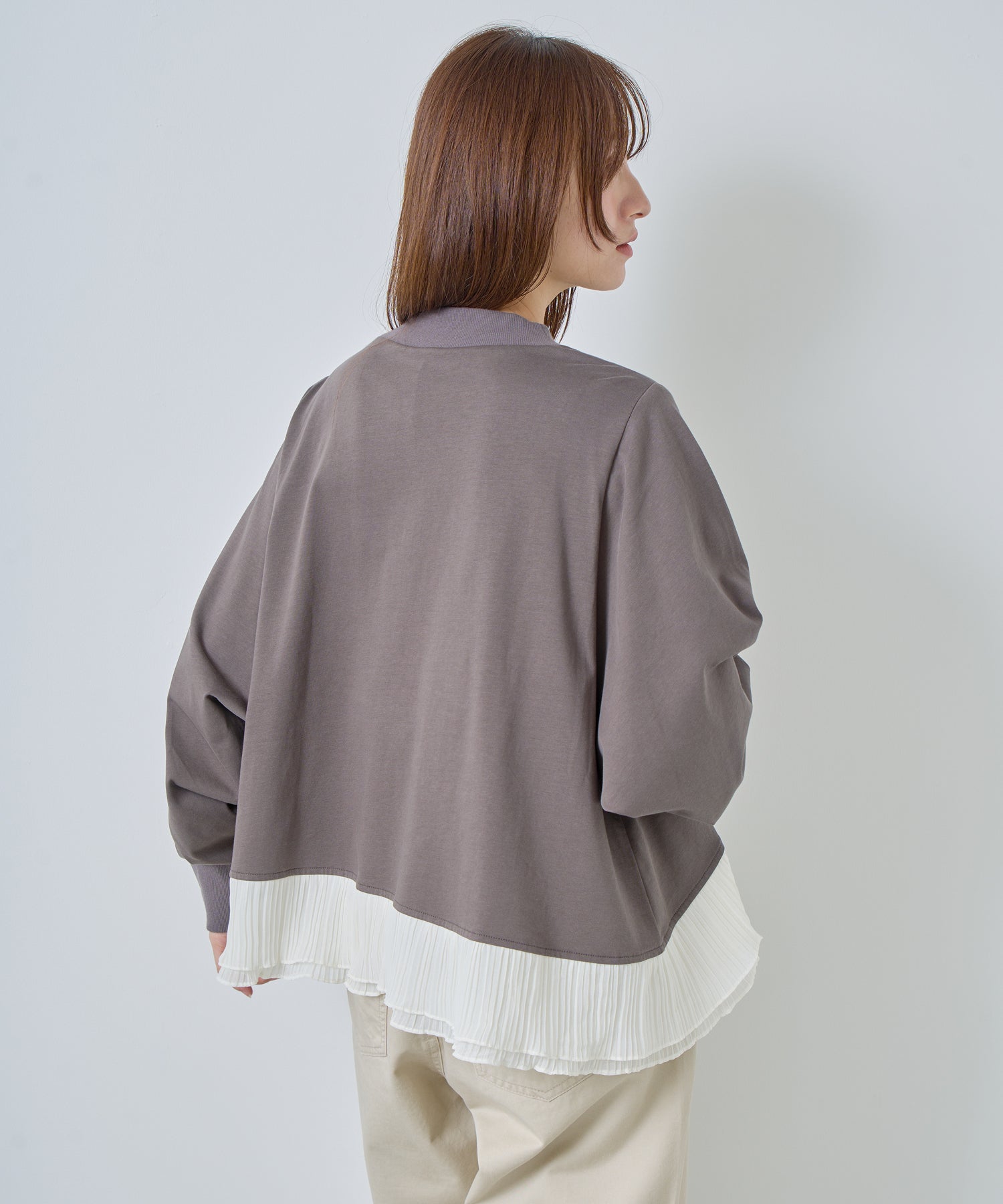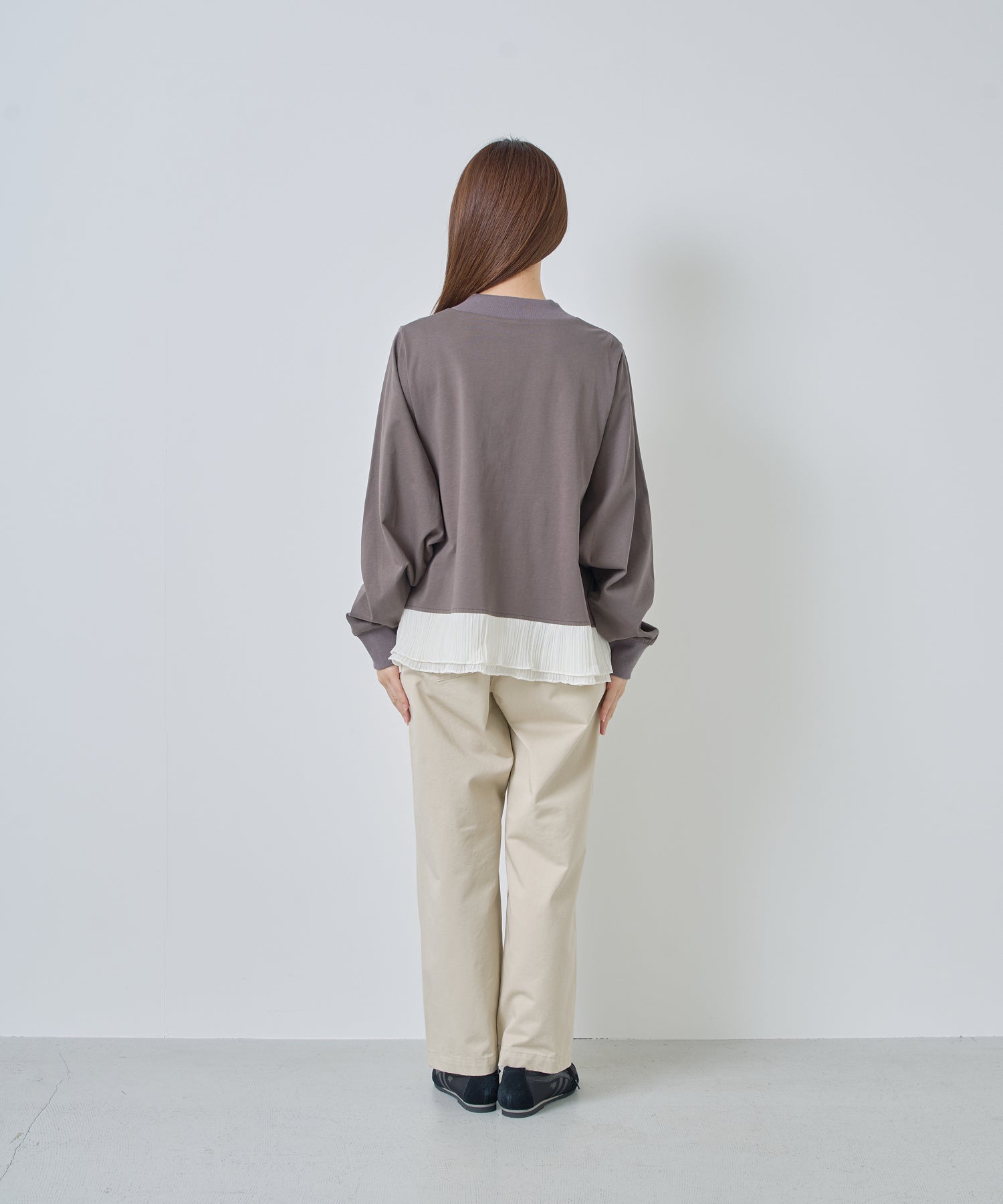 程よいモックネックで上品な印象を加え、裾には異素材のフリルを大胆に切り替えメリハリのあるデザインに仕上げました。