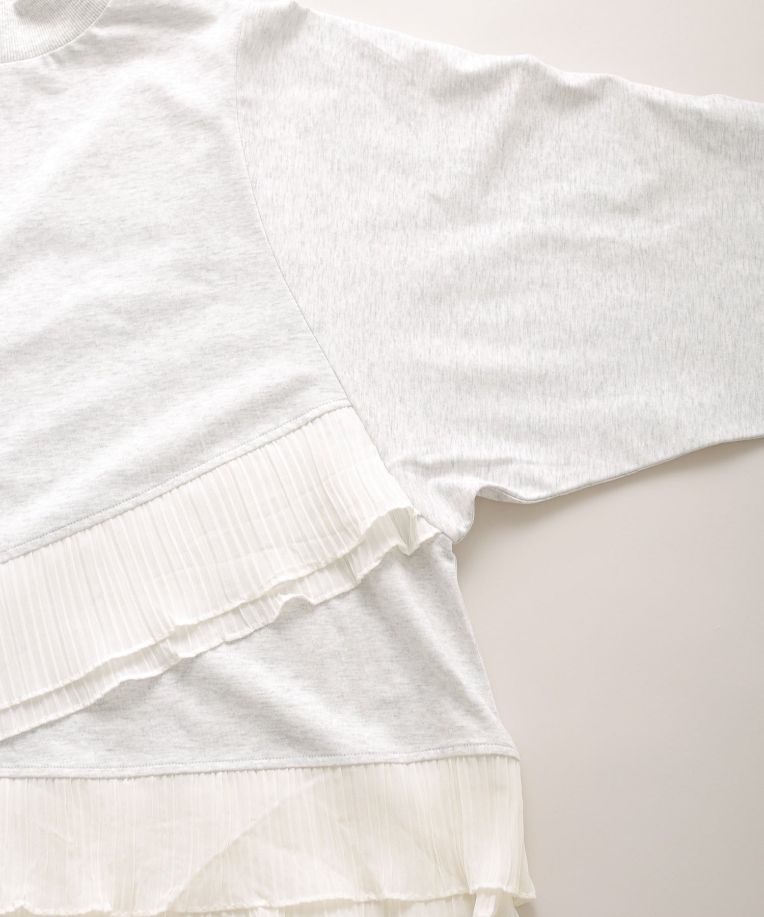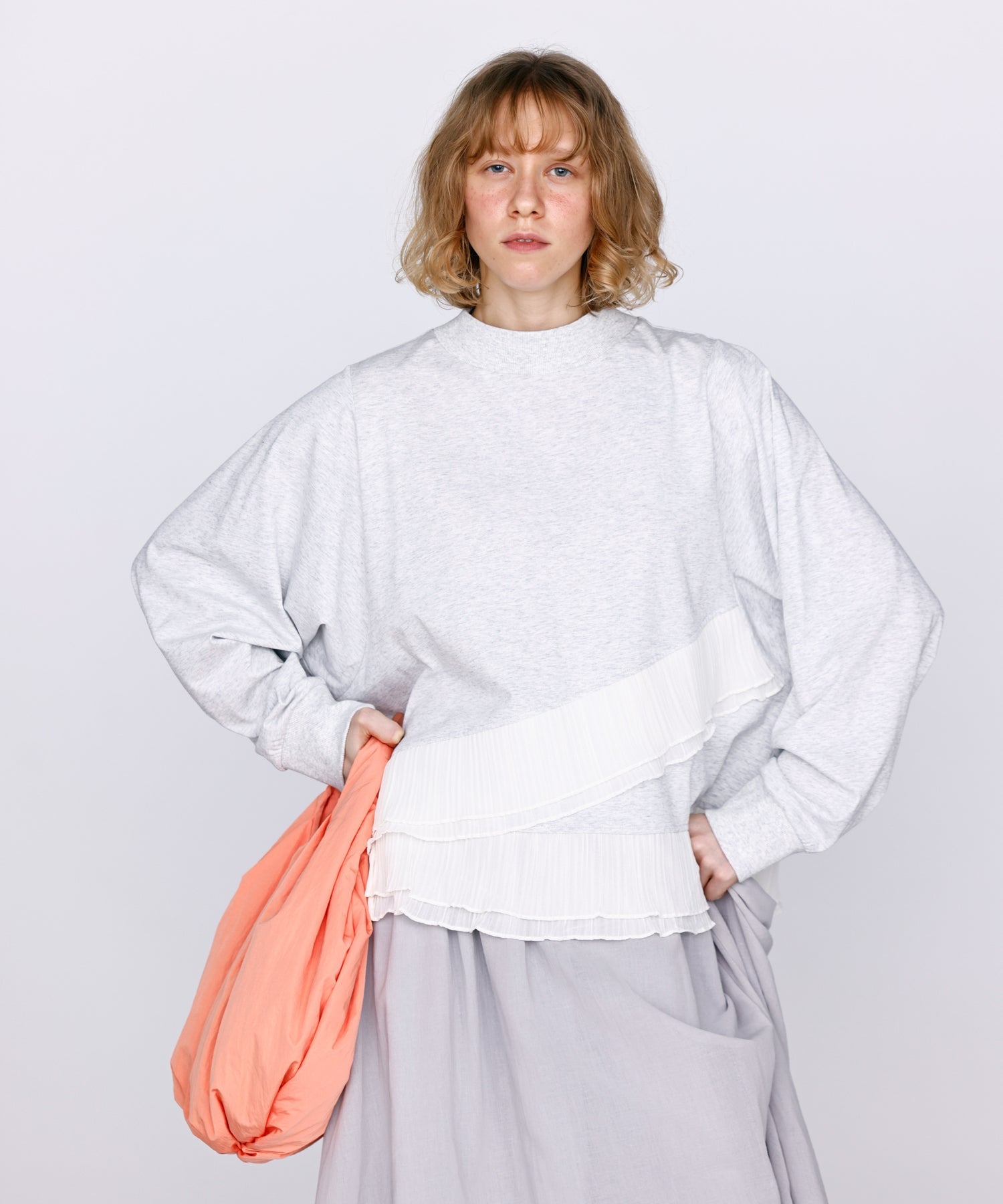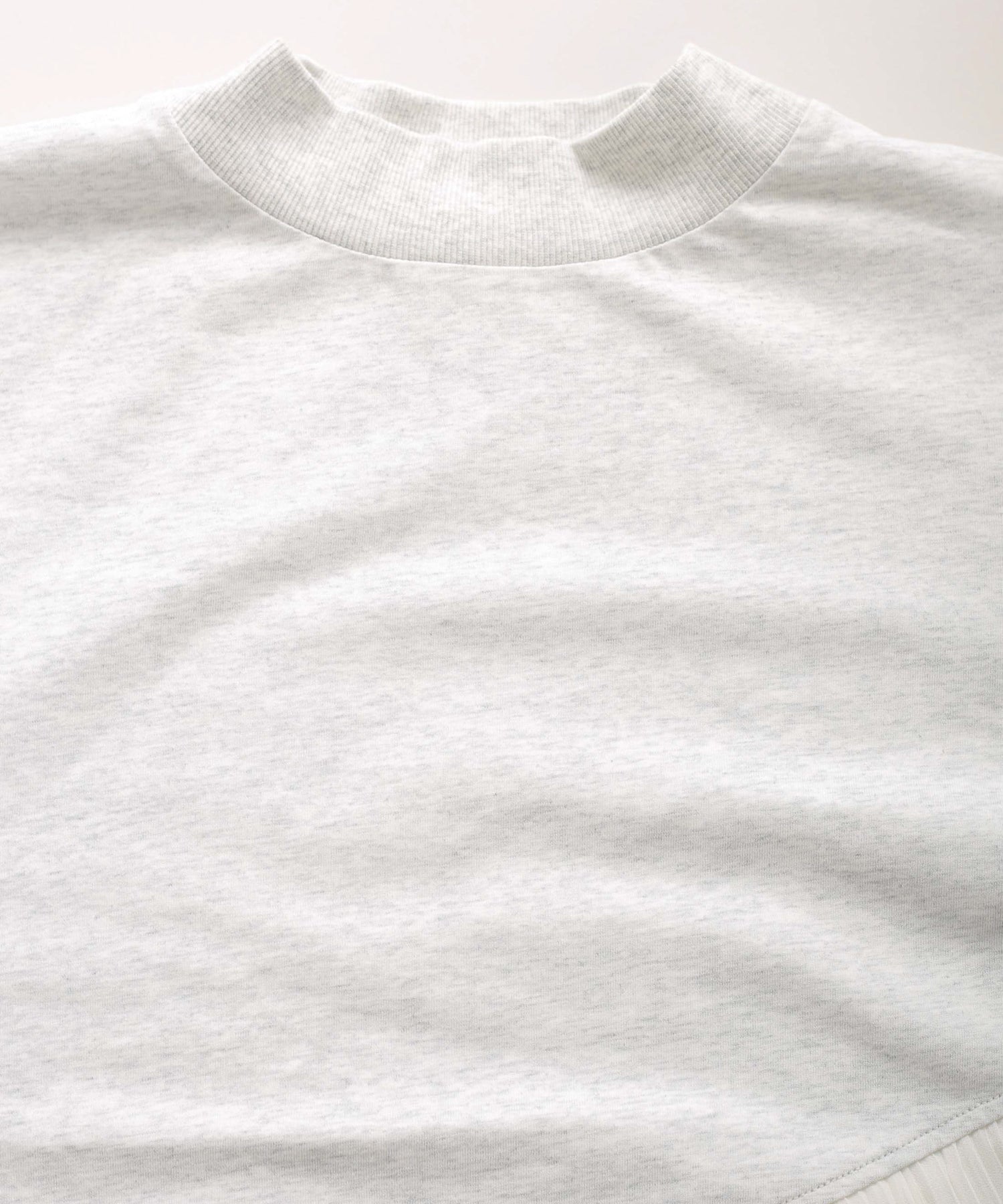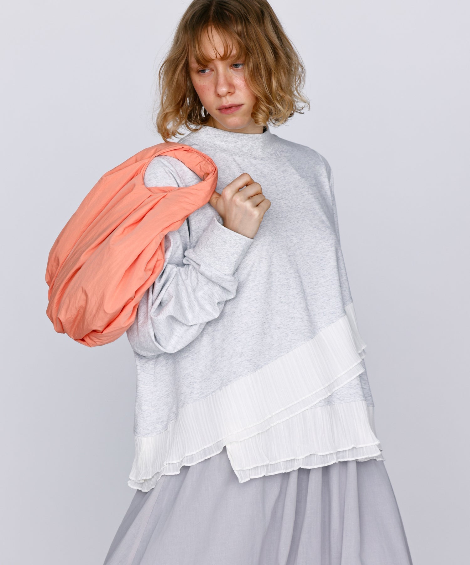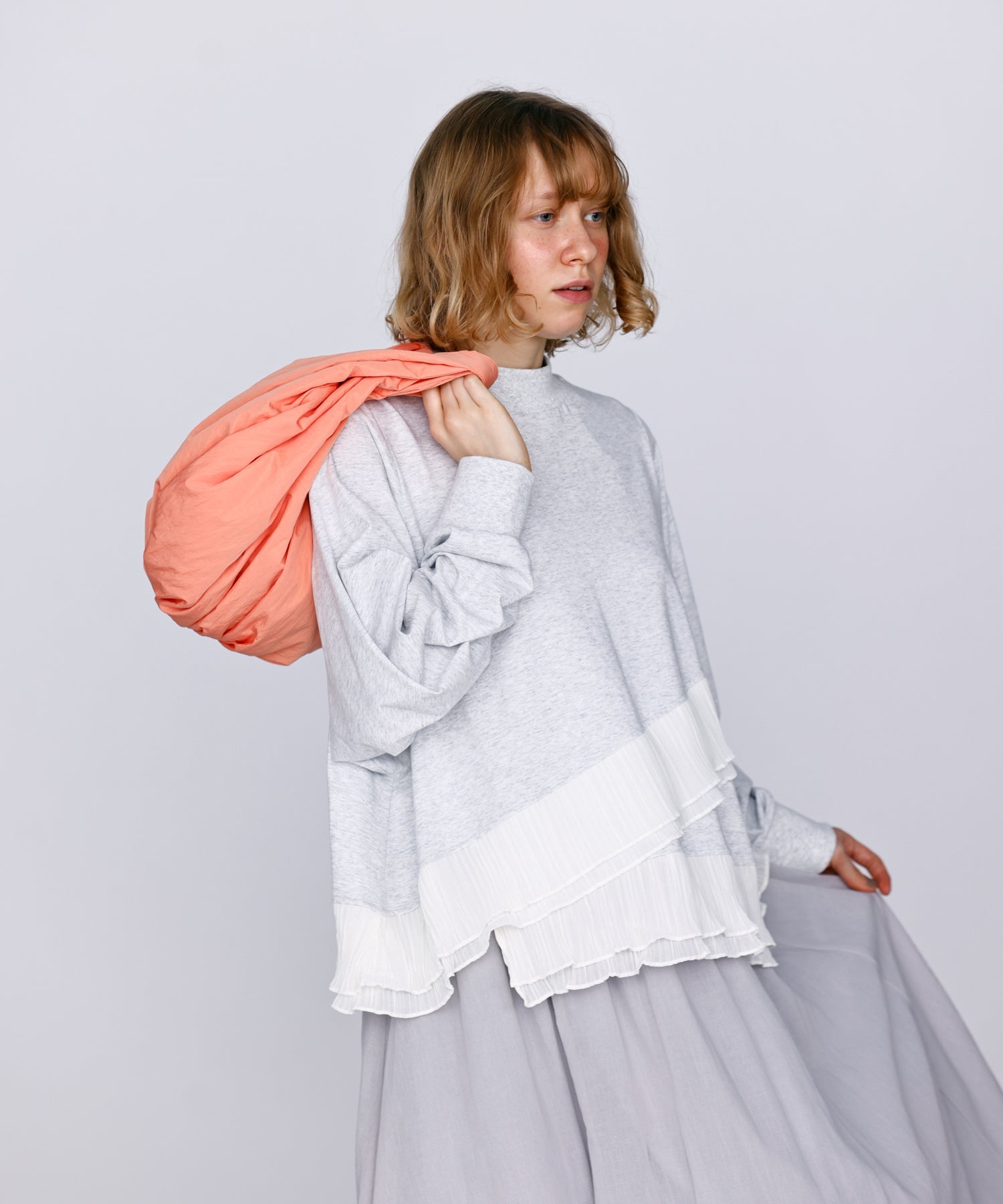 程よいモックネックで上品な印象を加え、裾には異素材のフリルを大胆に切り替えメリハリのあるデザインに仕上げました。