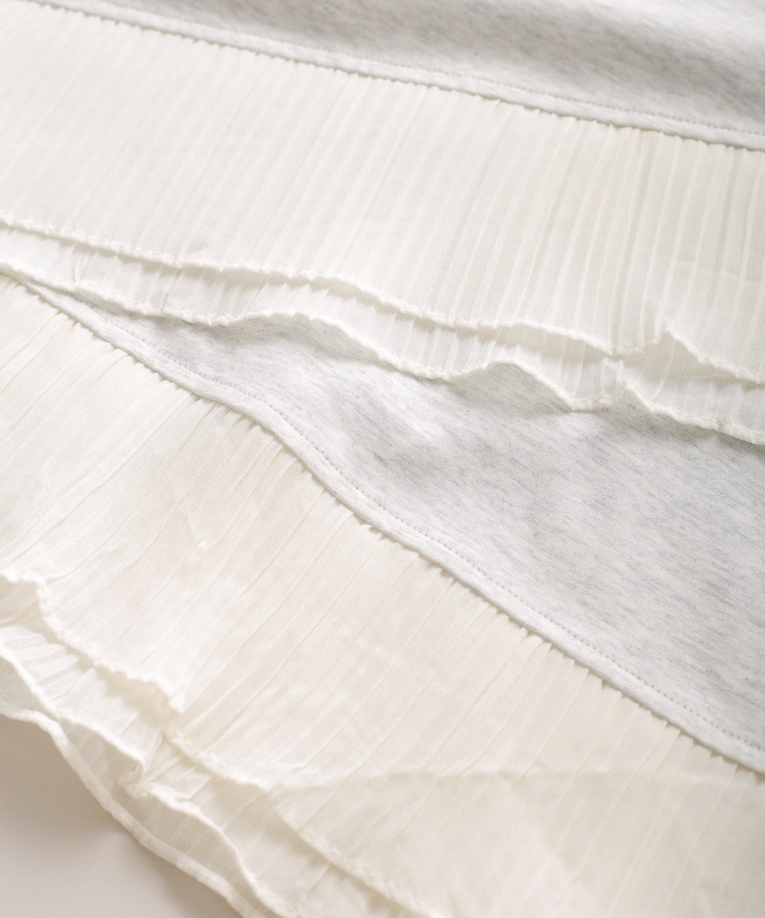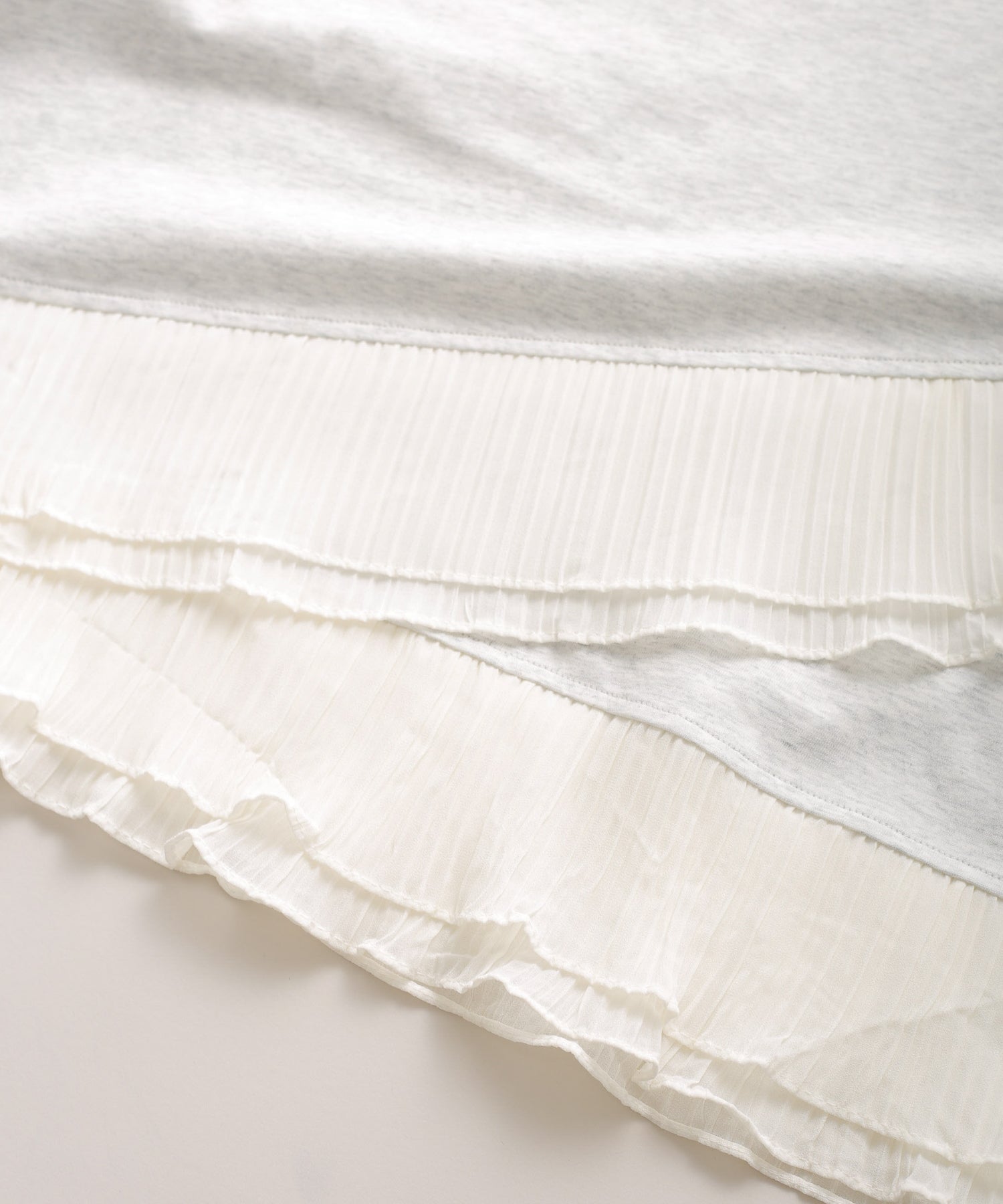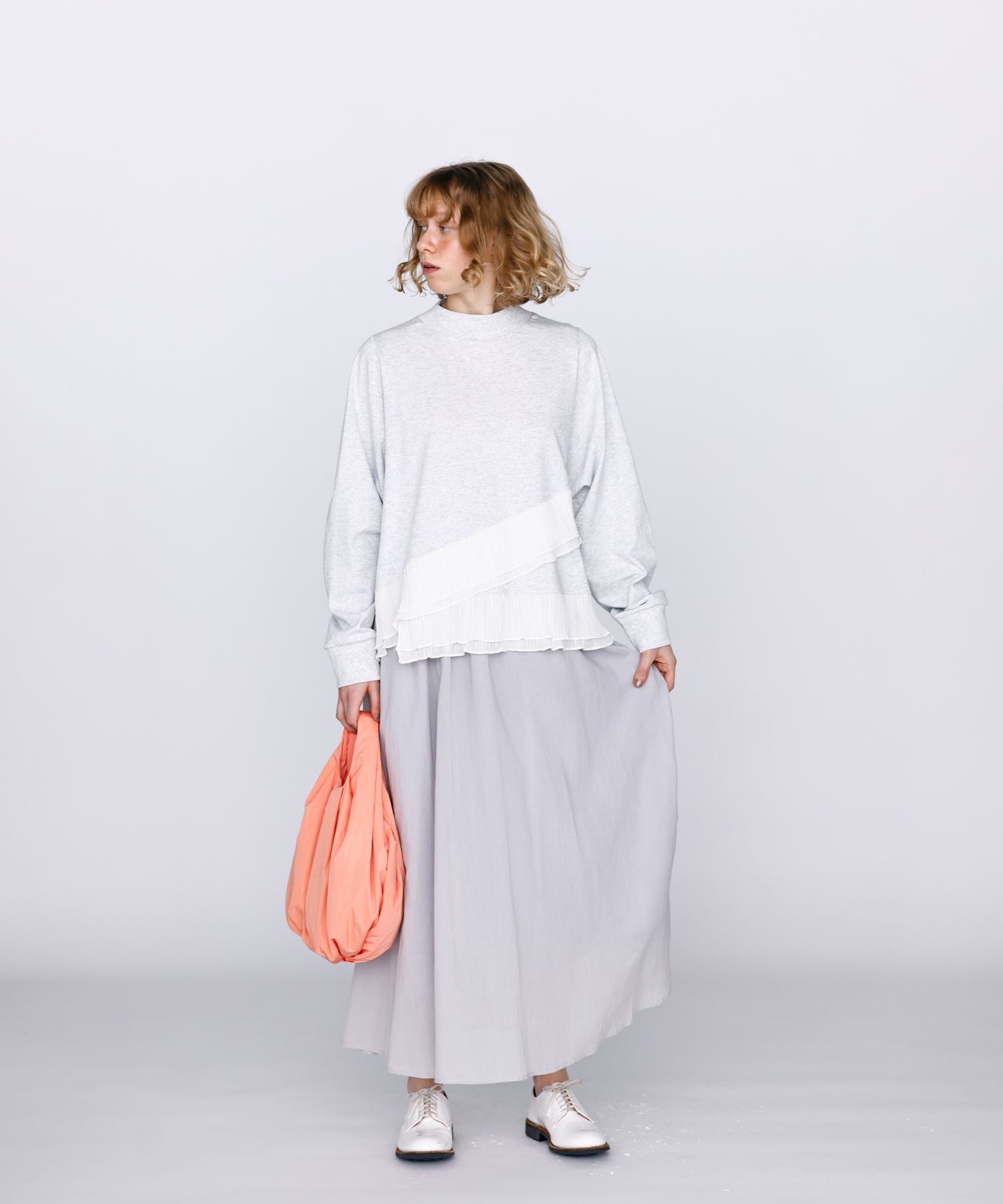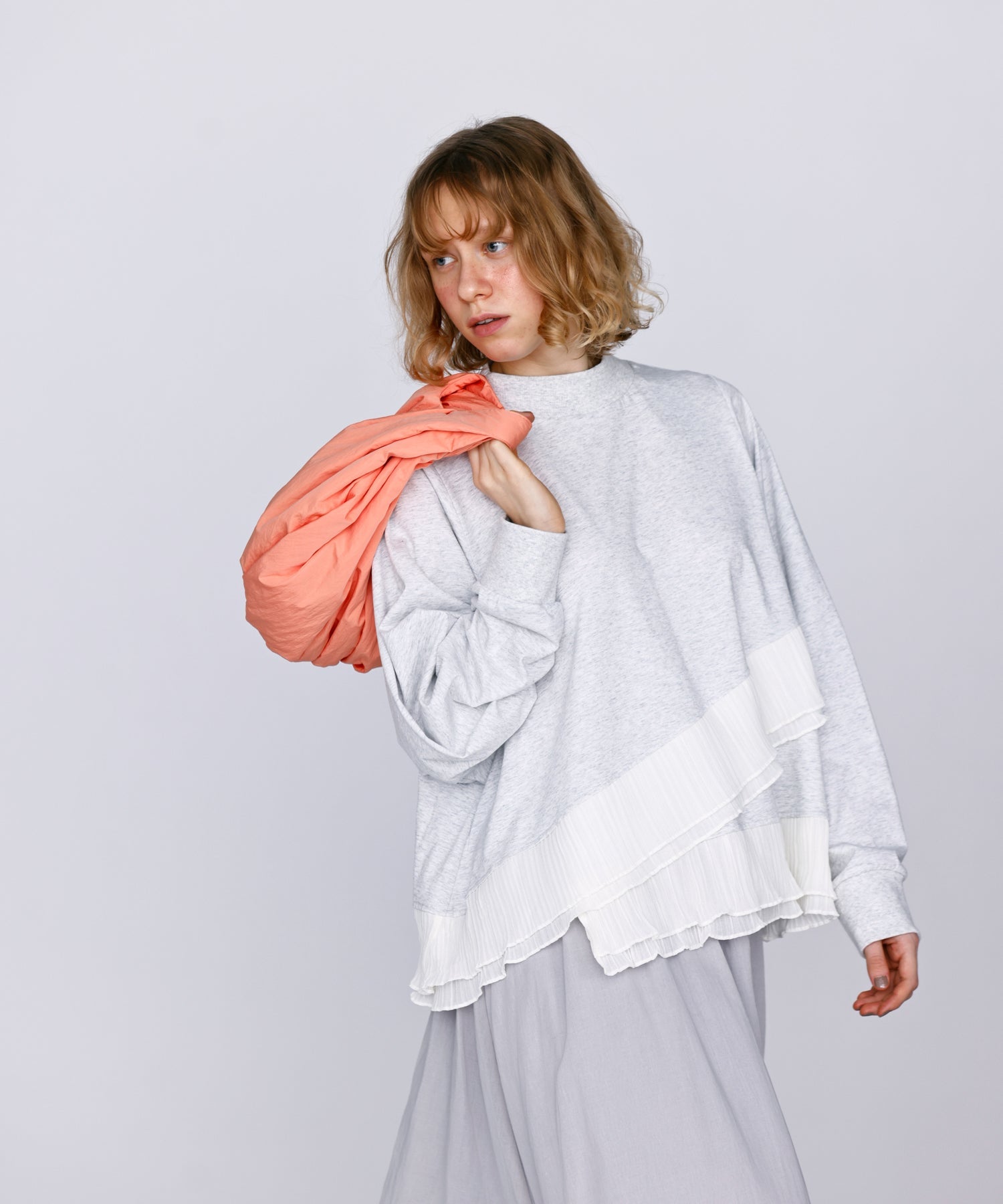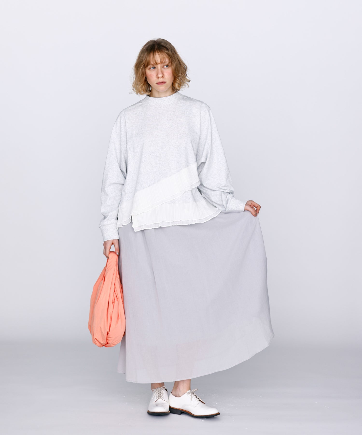 程よいモックネックで上品な印象を加え、裾には異素材のフリルを大胆に切り替えメリハリのあるデザインに仕上げました。