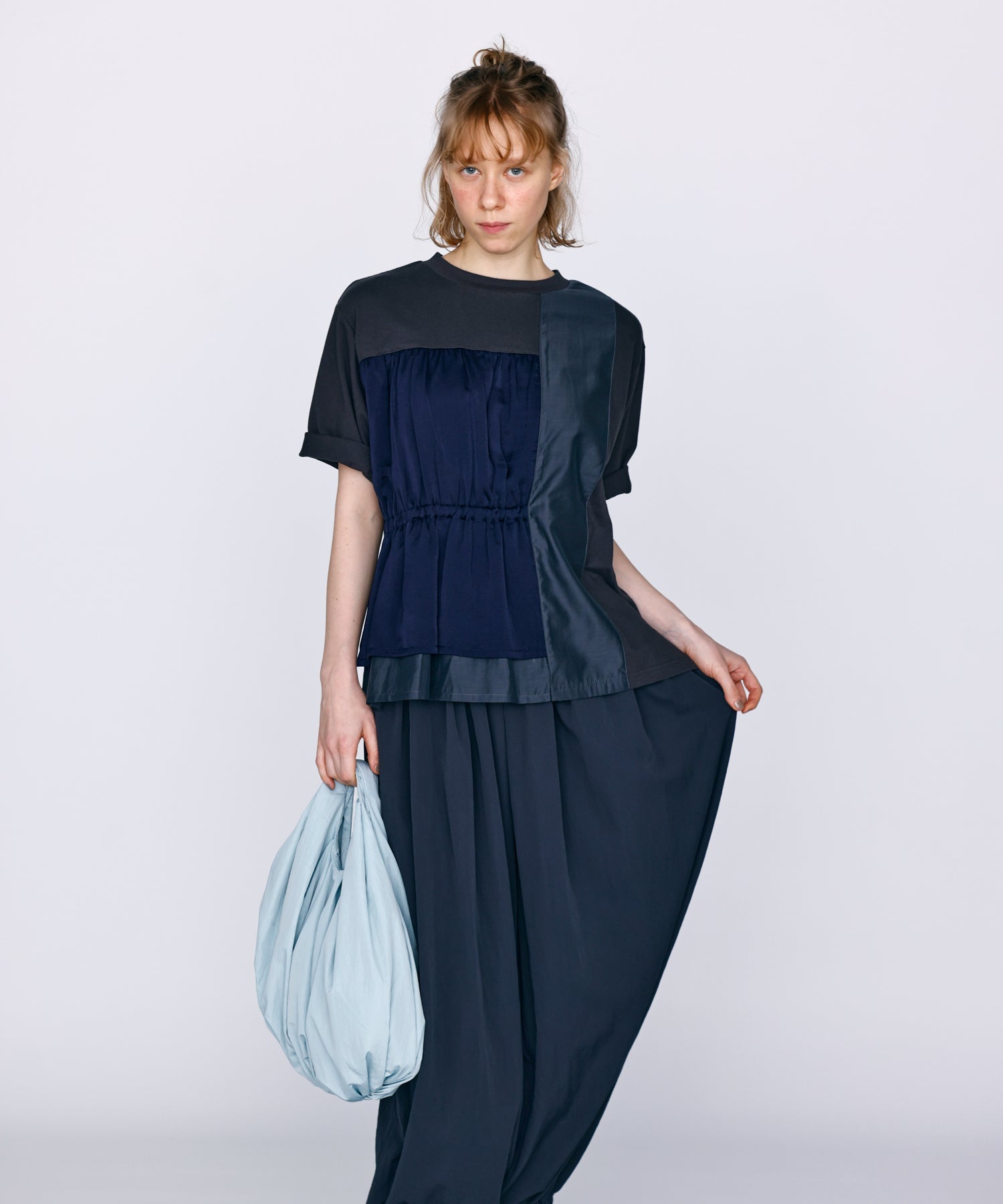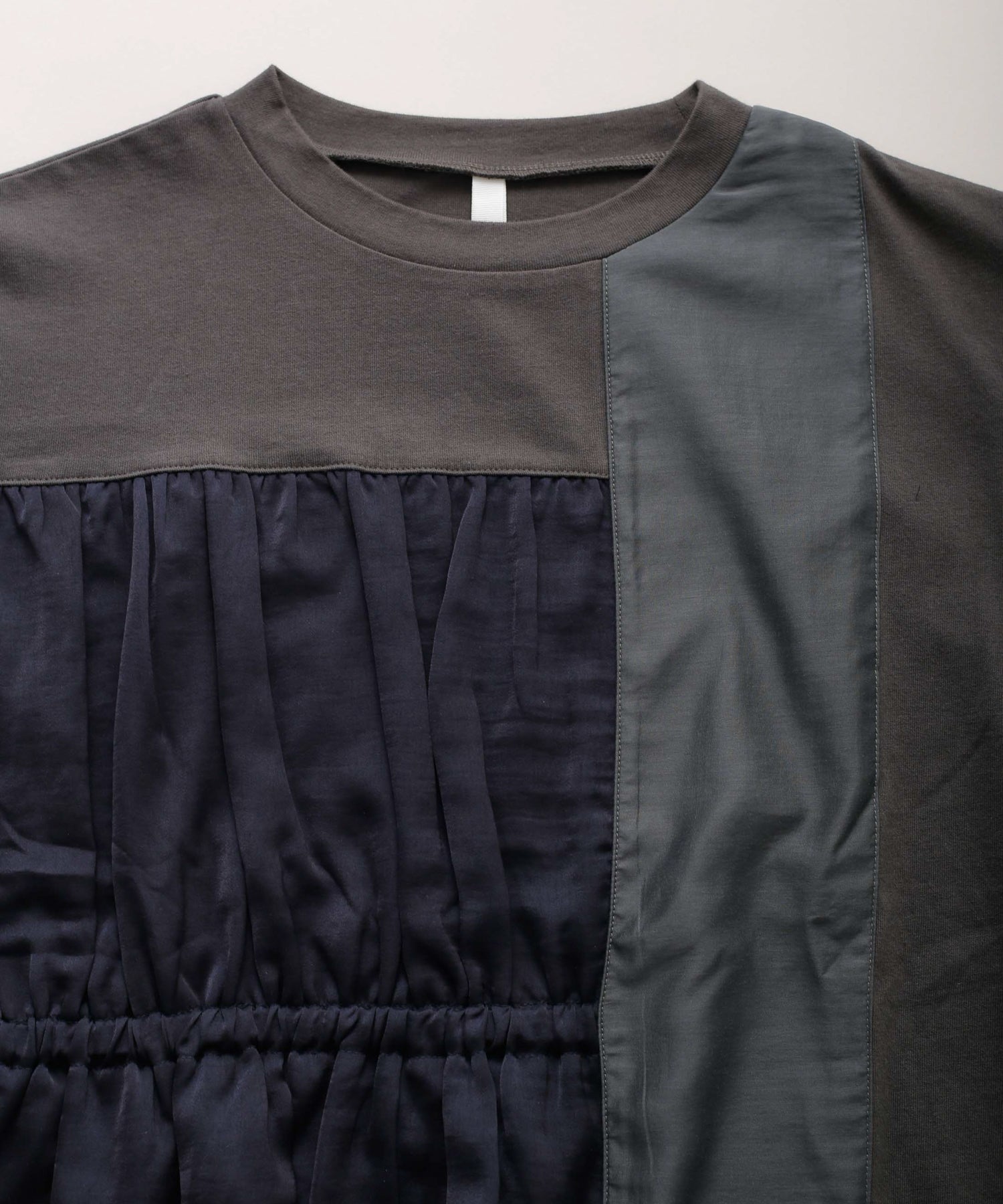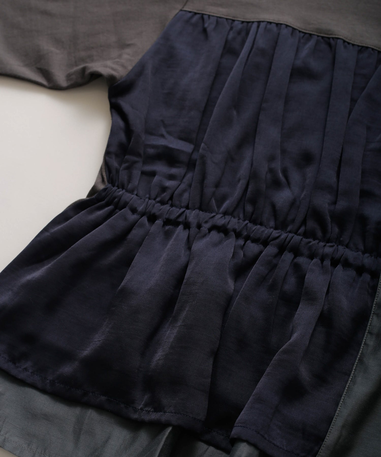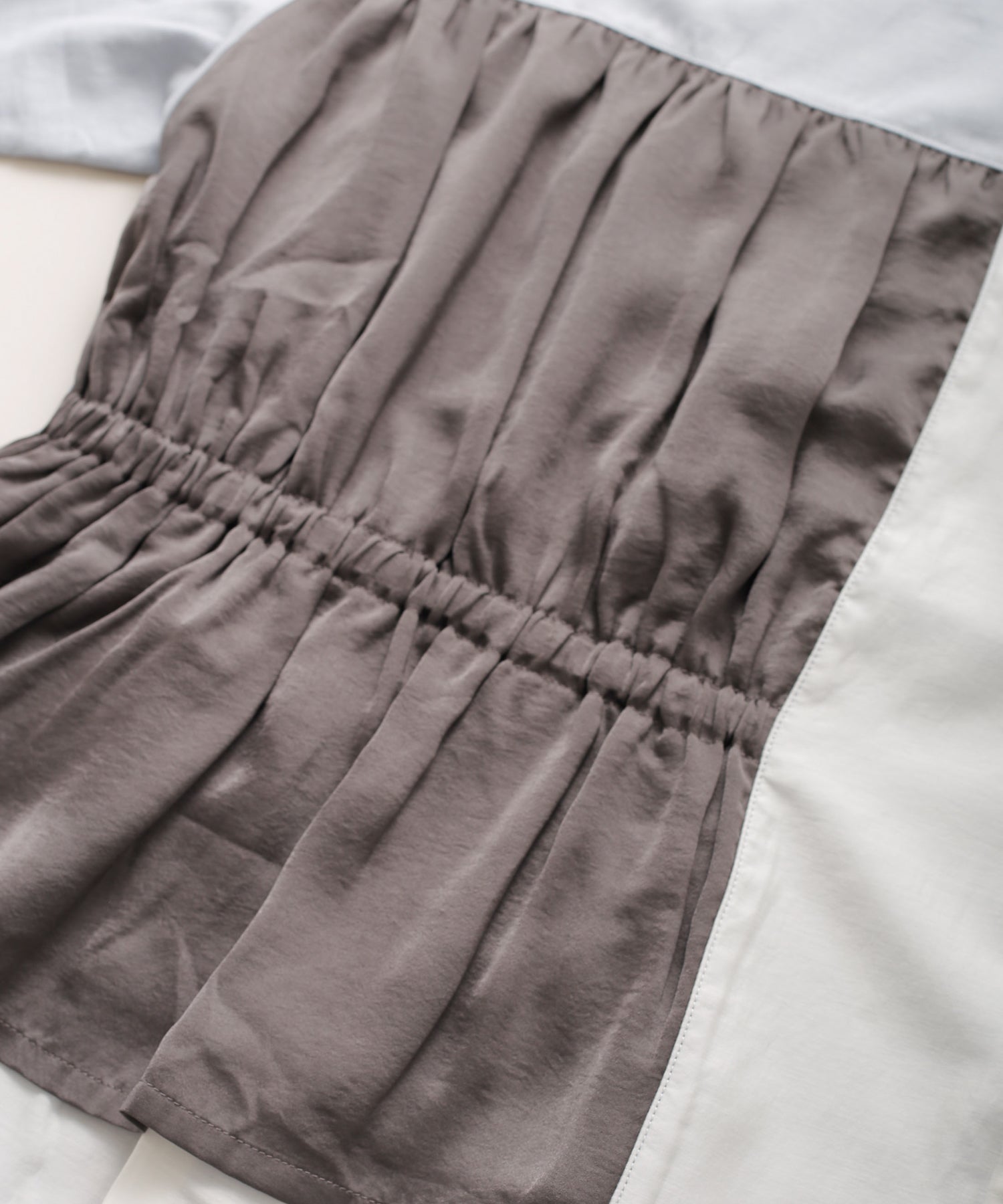 さらにサテン部分はギャザーを施すことでドレープが生まれ、女性らしい印象に。