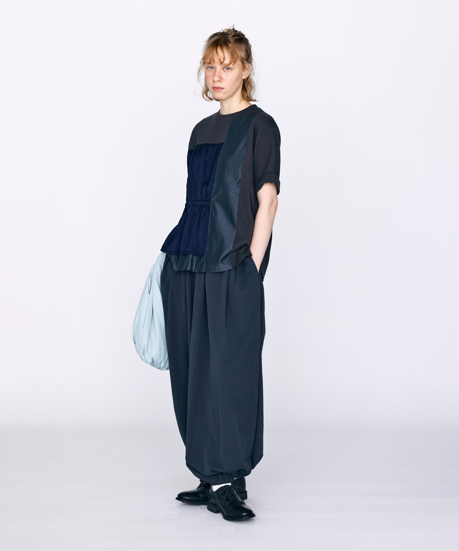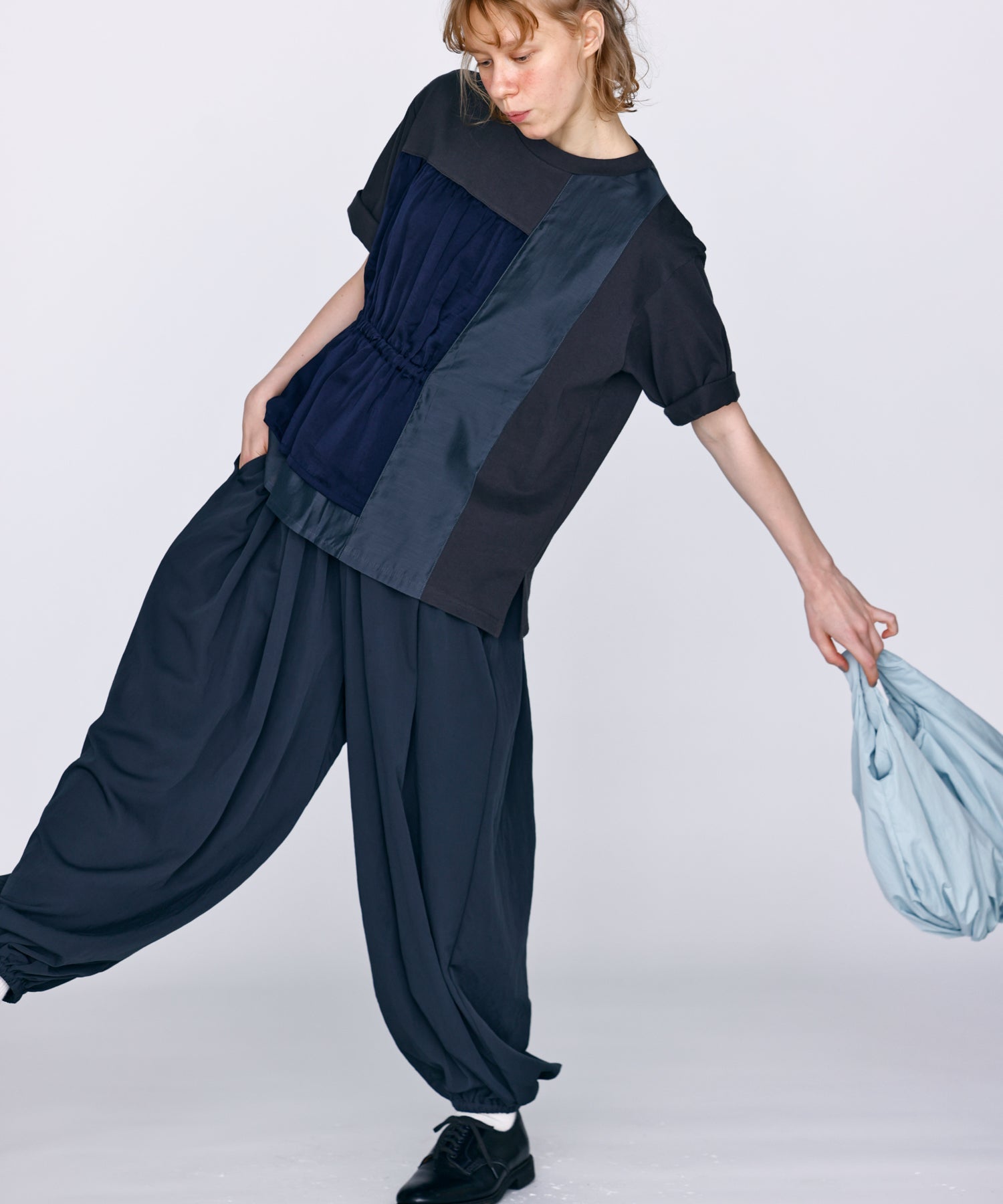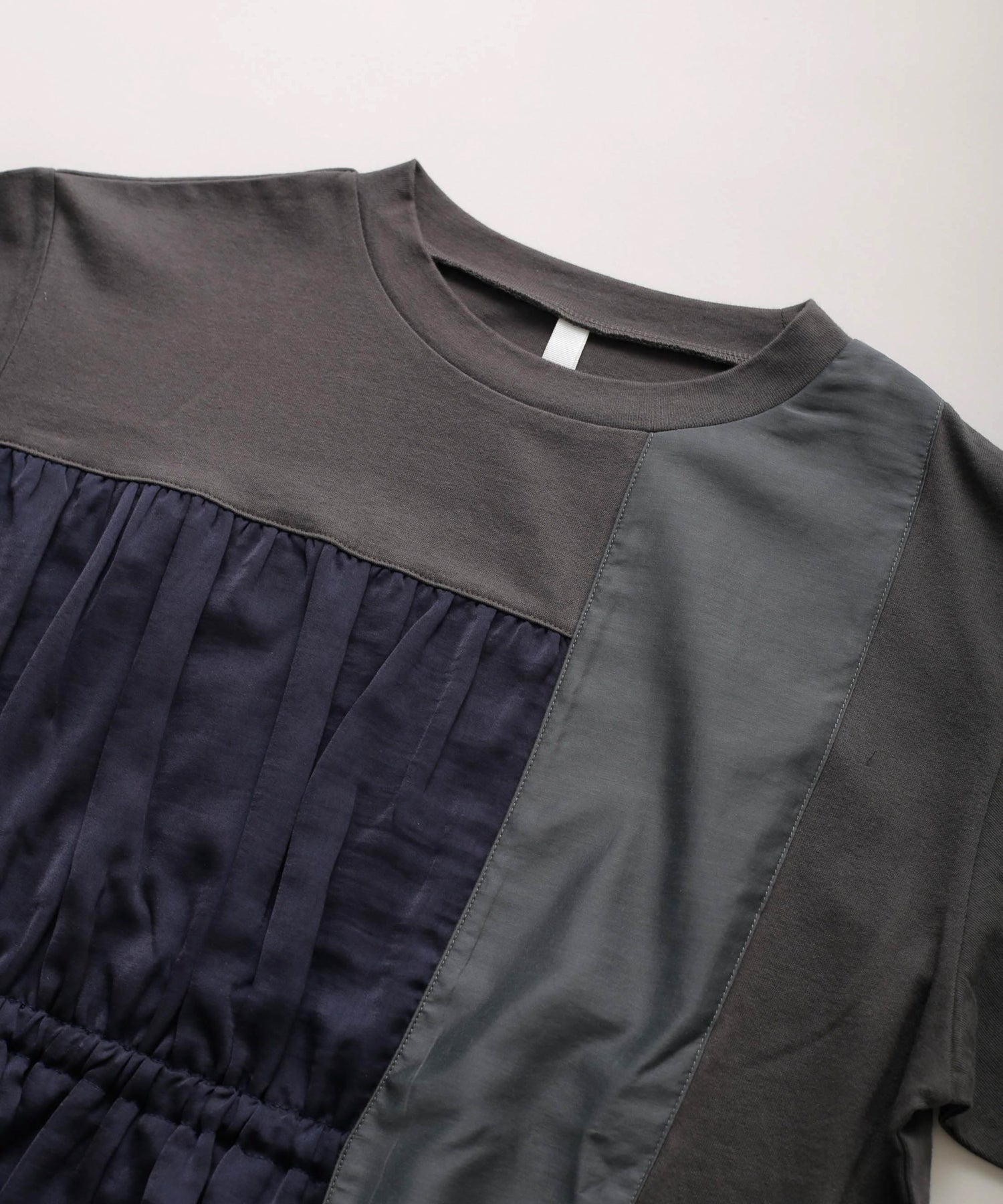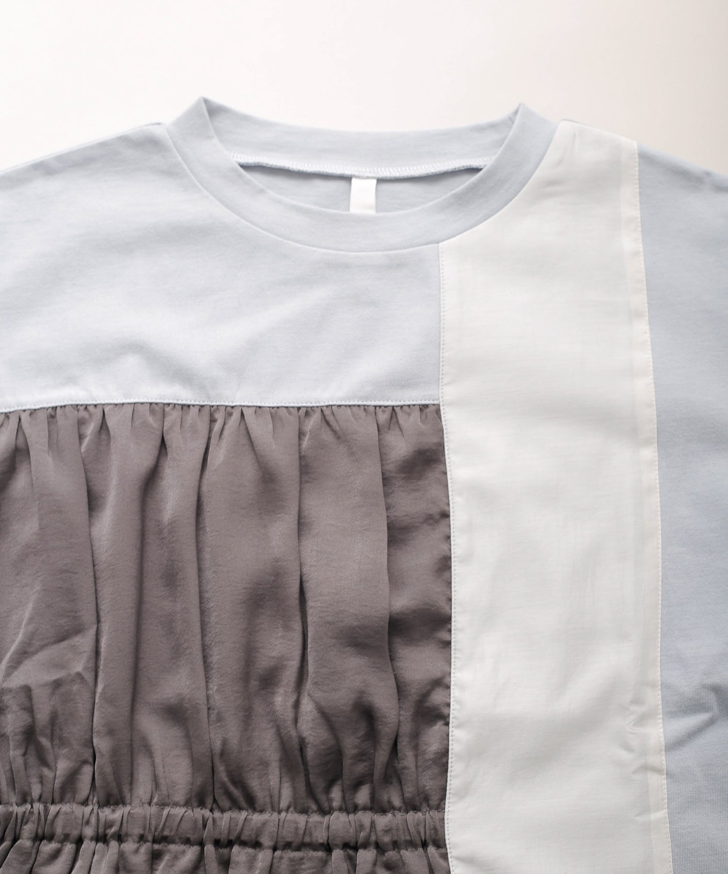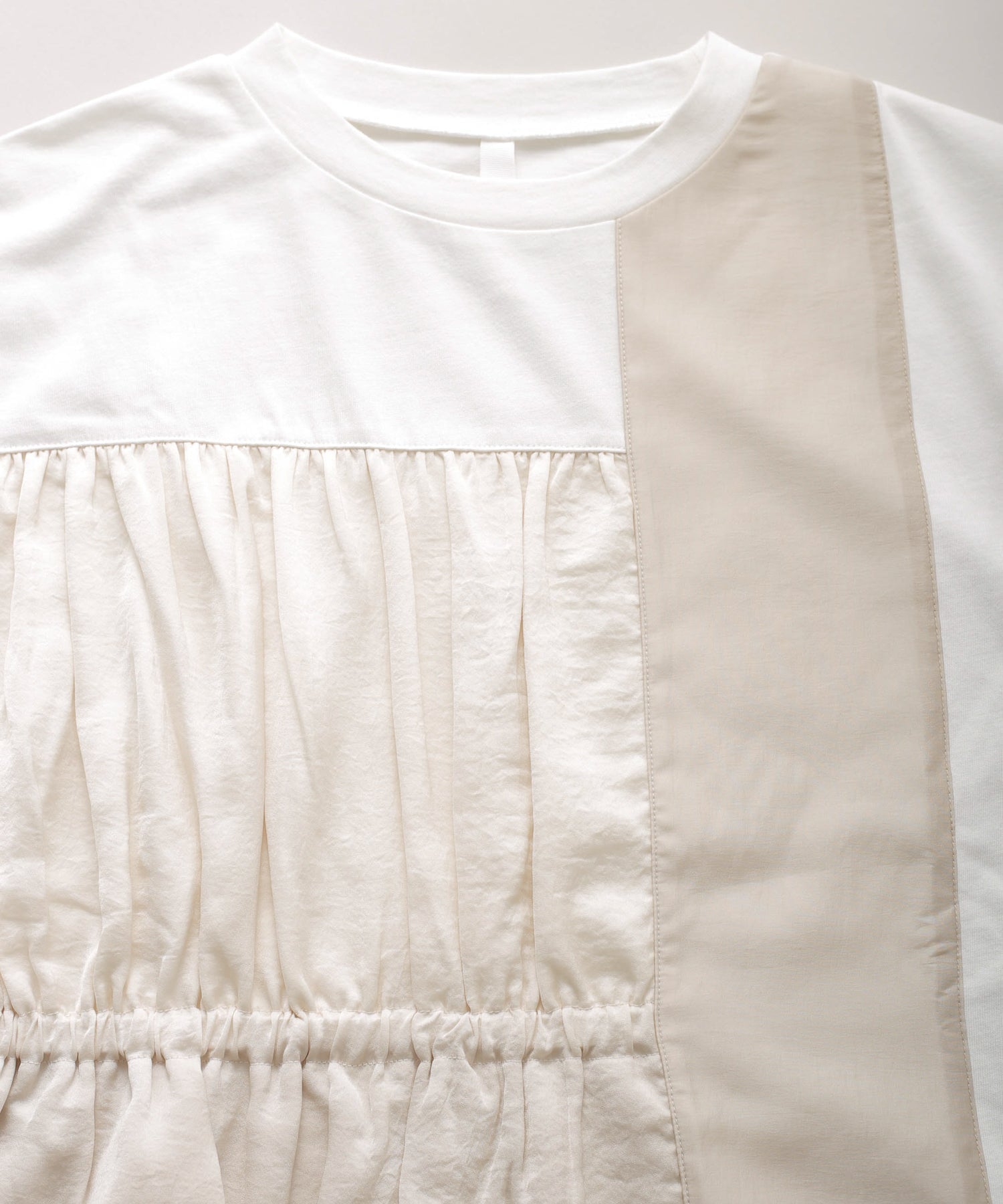 さらにサテン部分はギャザーを施すことでドレープが生まれ、女性らしい印象に。