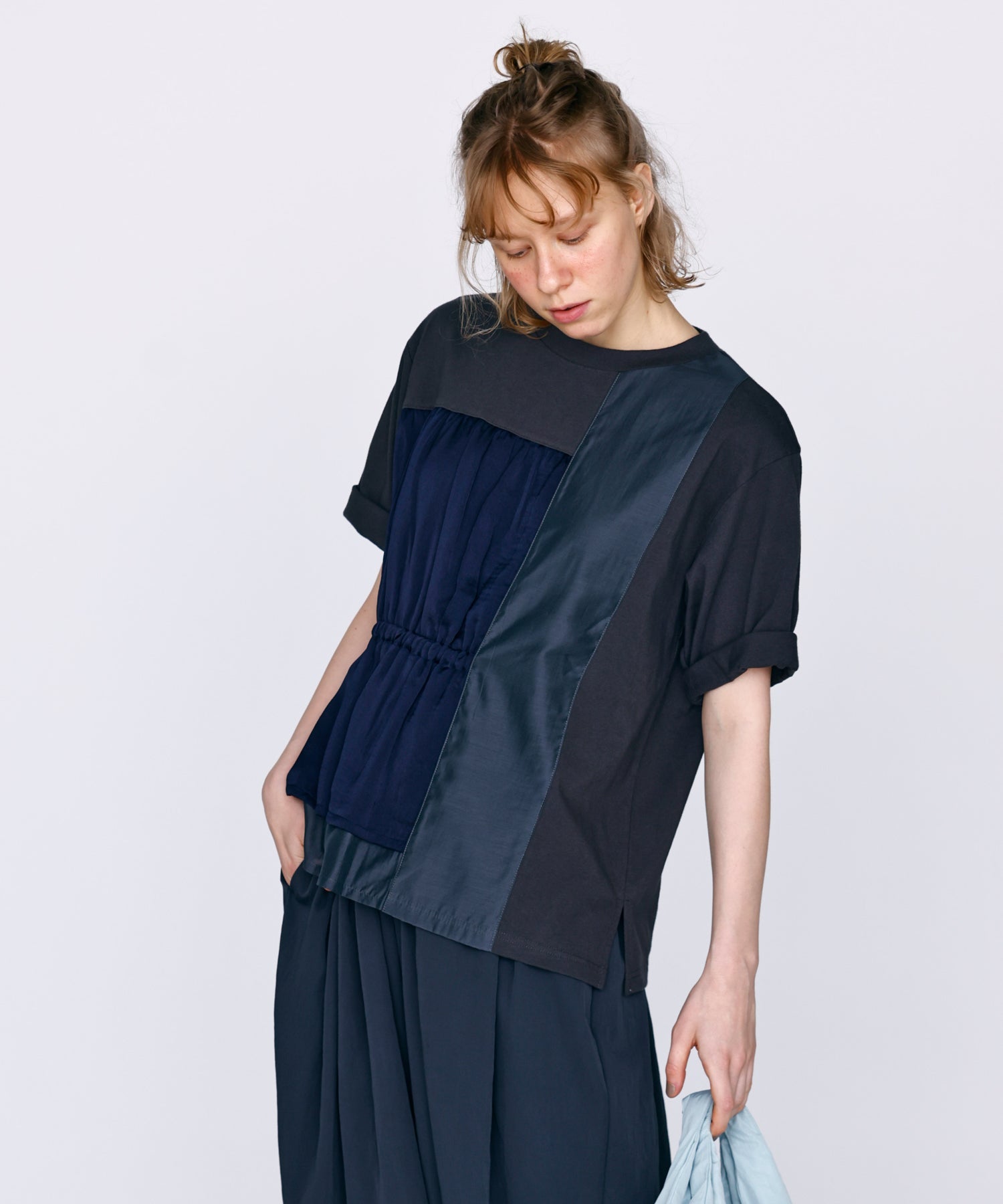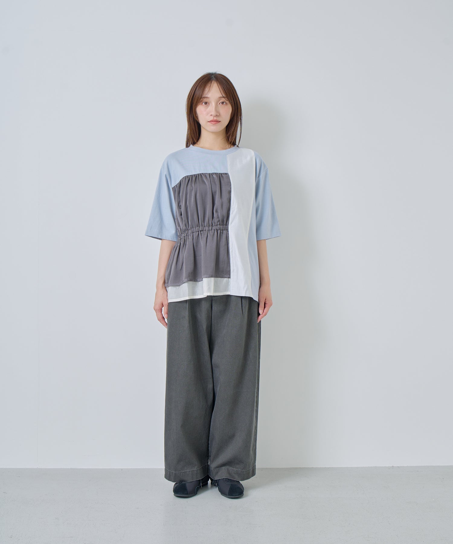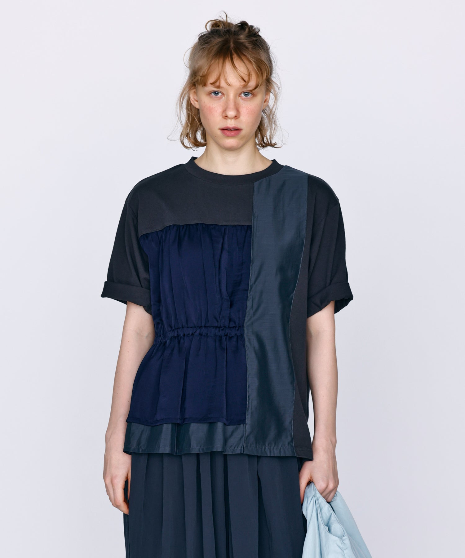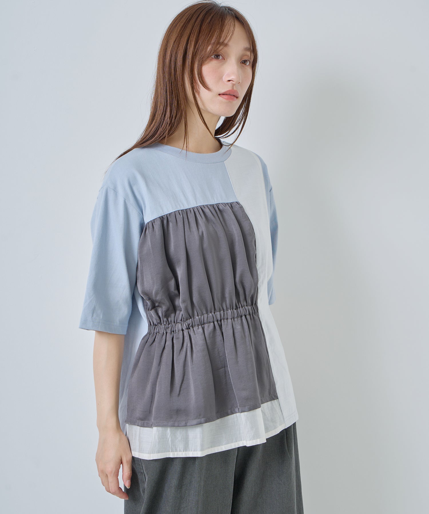 さらにサテン部分はギャザーを施すことでドレープが生まれ、女性らしい印象に。