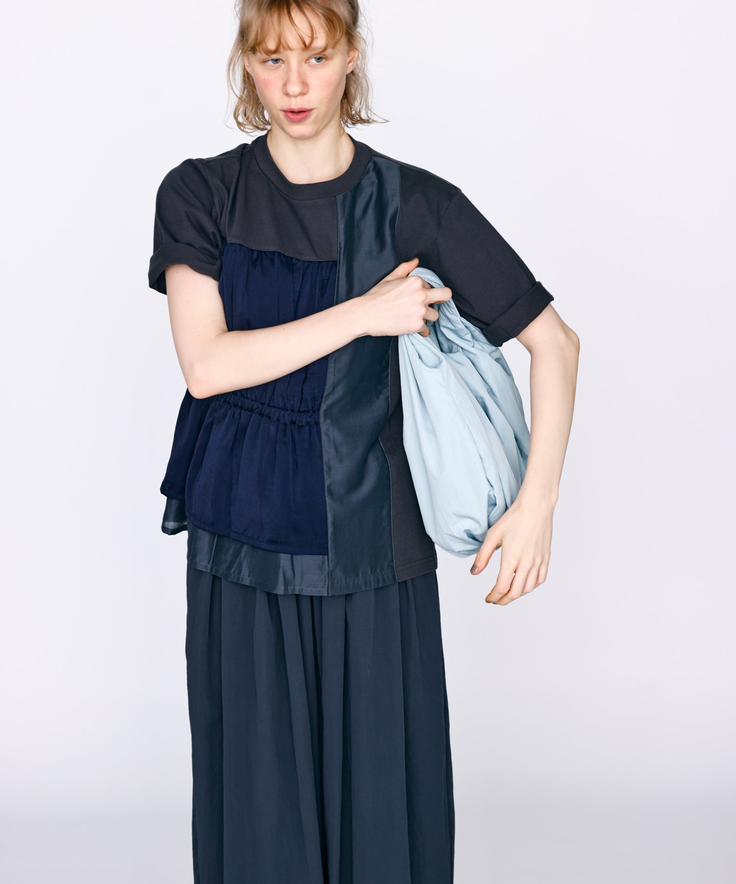派手すぎないカラーブロックでまとめ、サテンの艶やかさとシアー素材で清涼感を加えました。