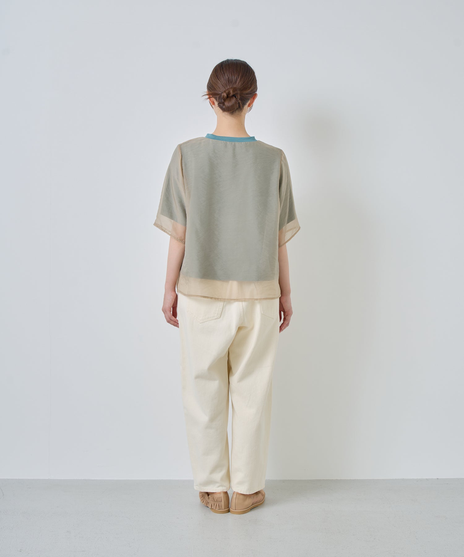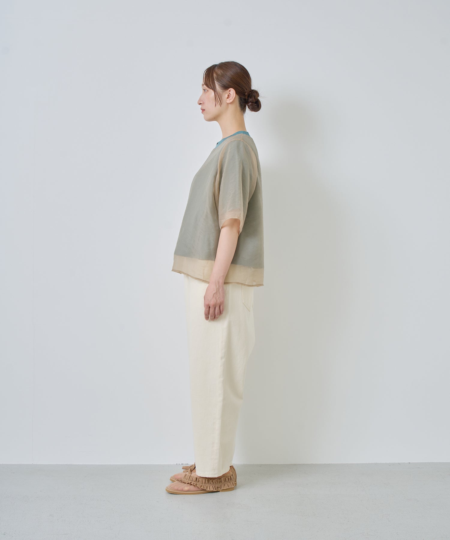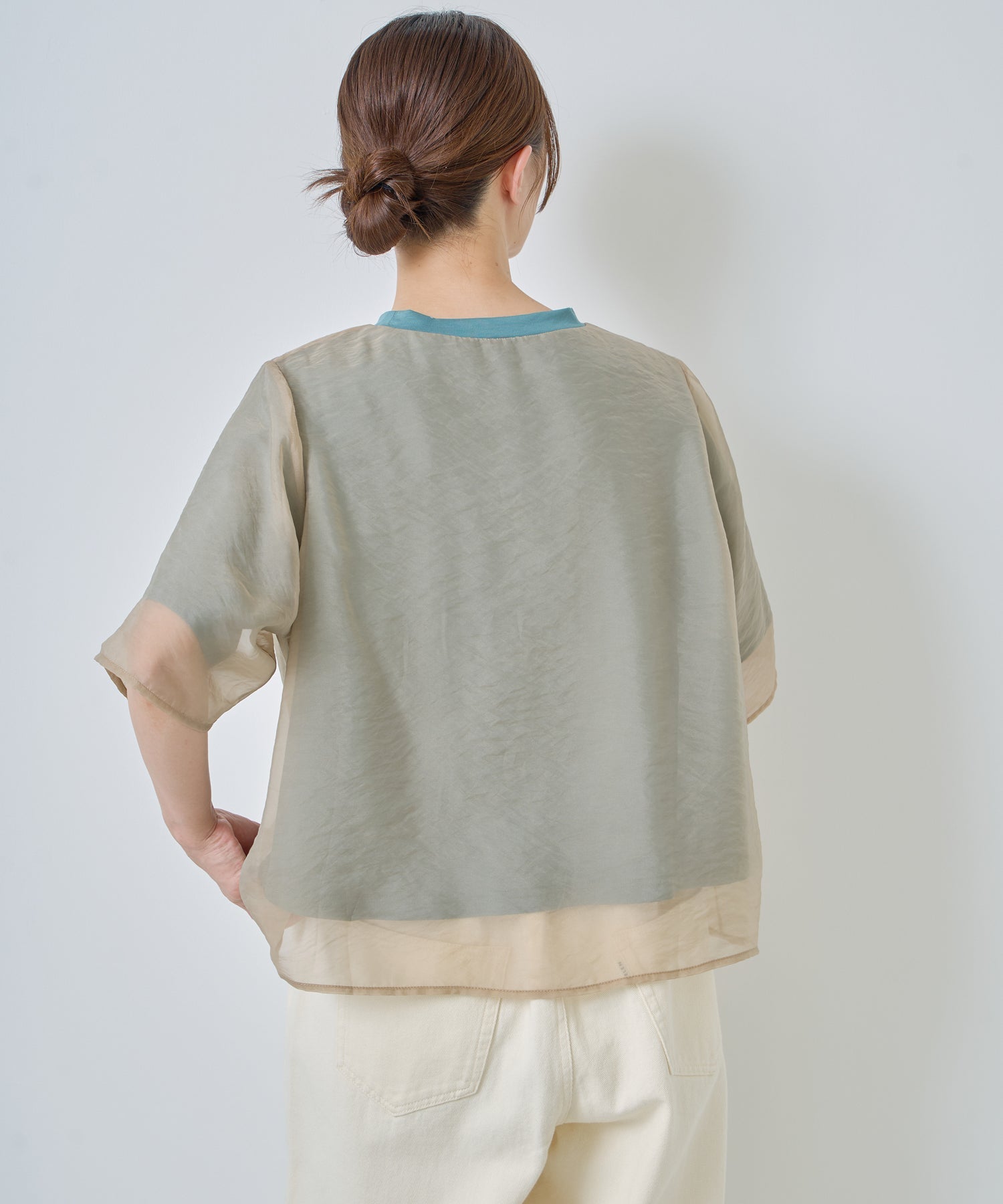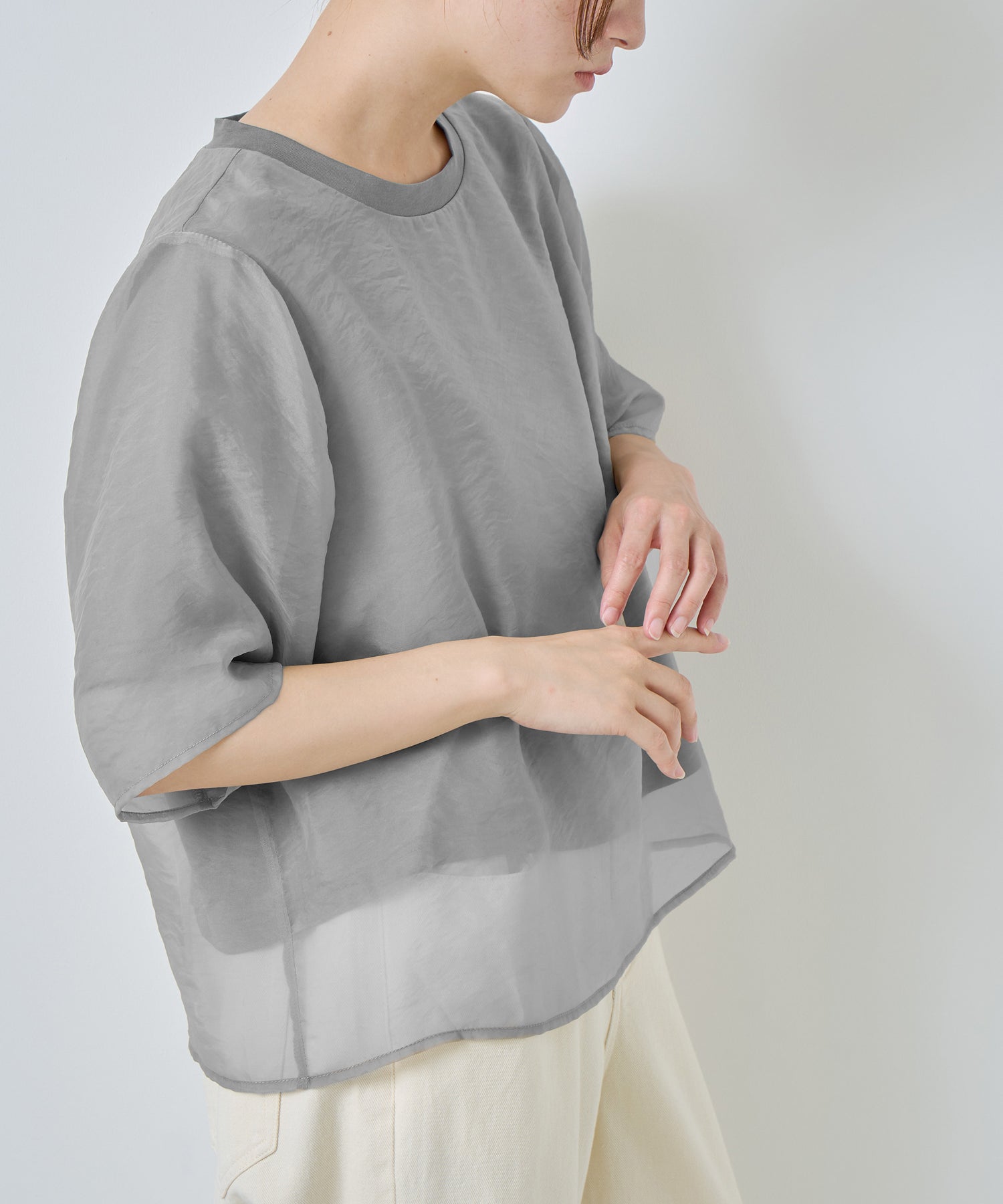 さらっとした肌あたりのカットソー素材と、程よい透け感のオーガンジー素材を使用し、デイリーに着用しやすいように仕上げました。